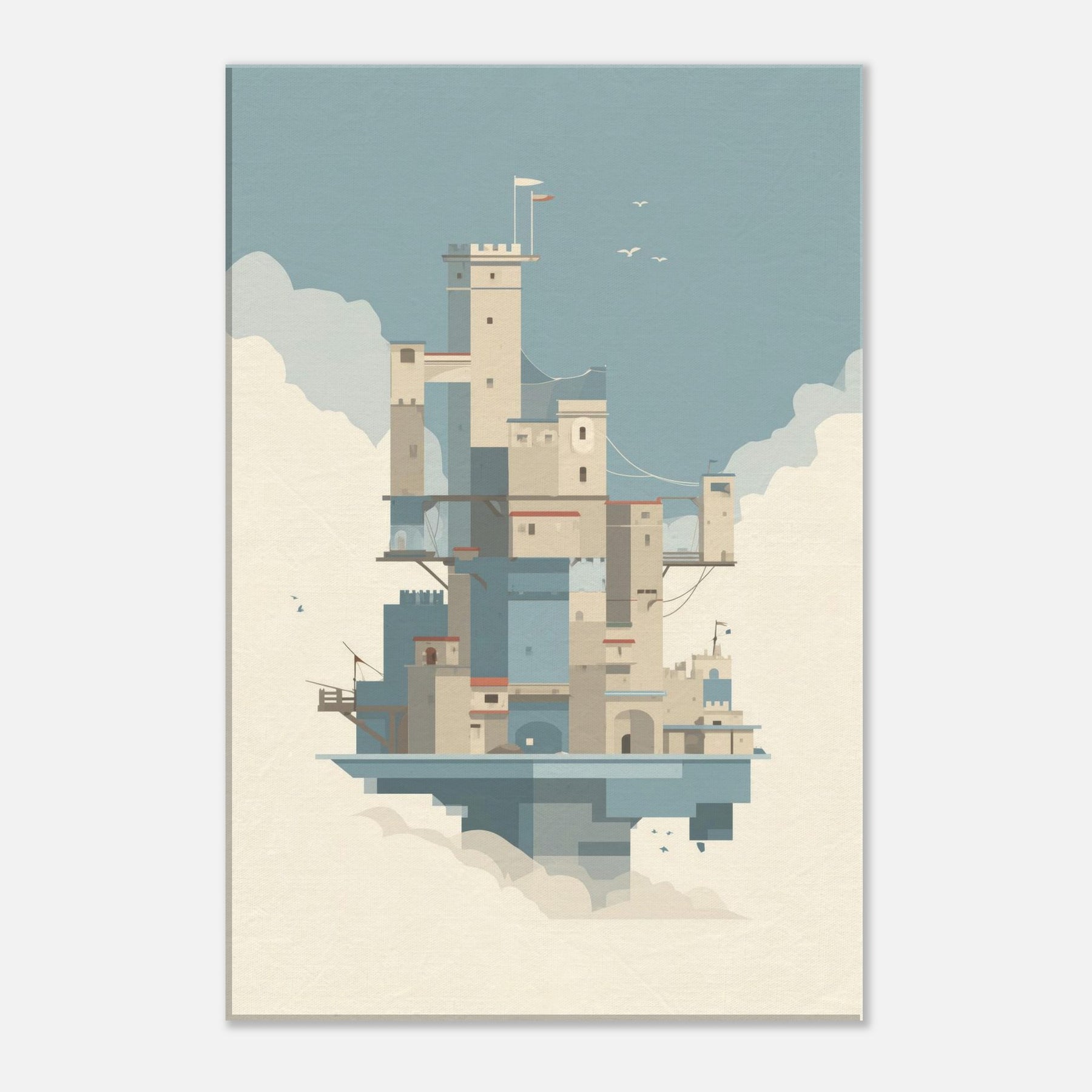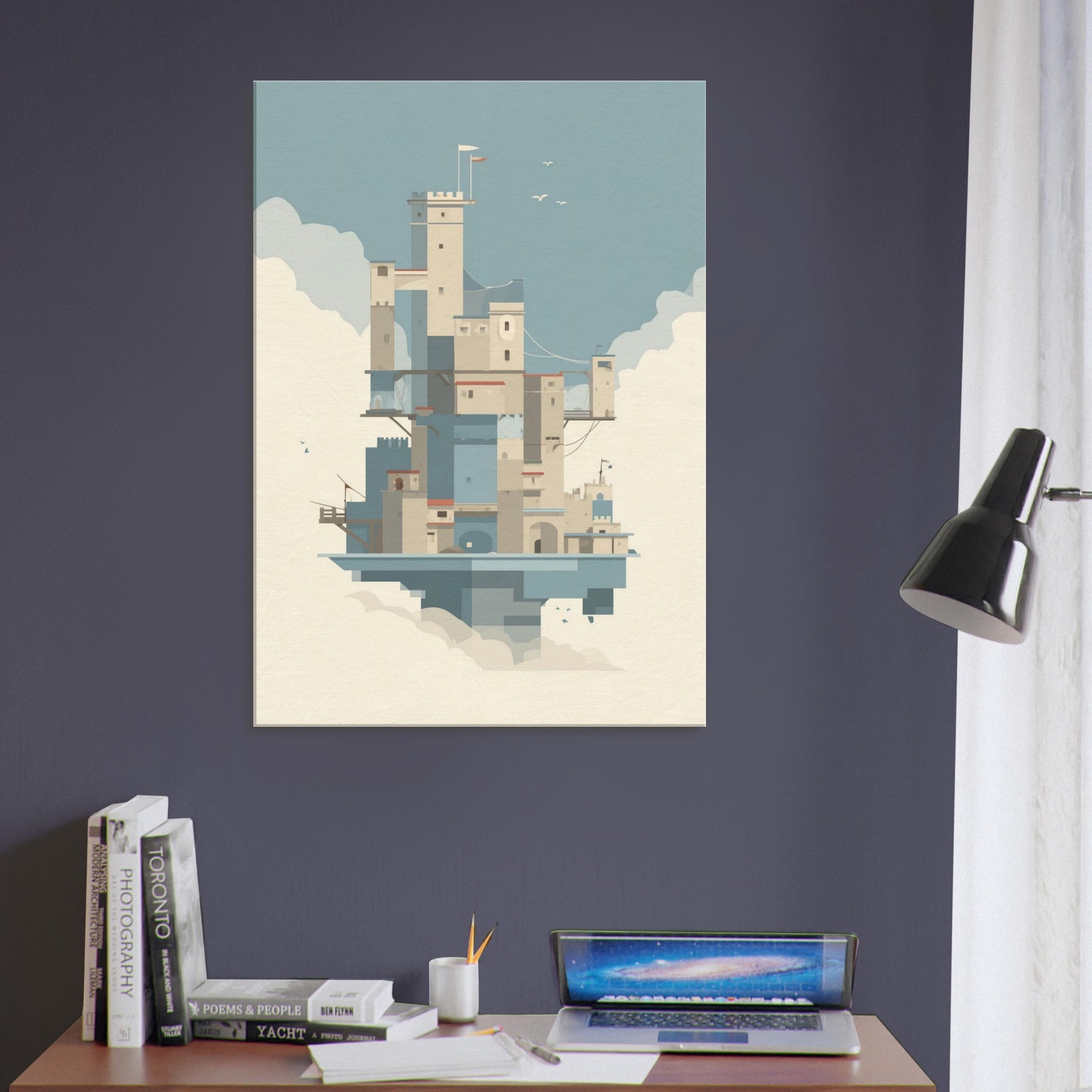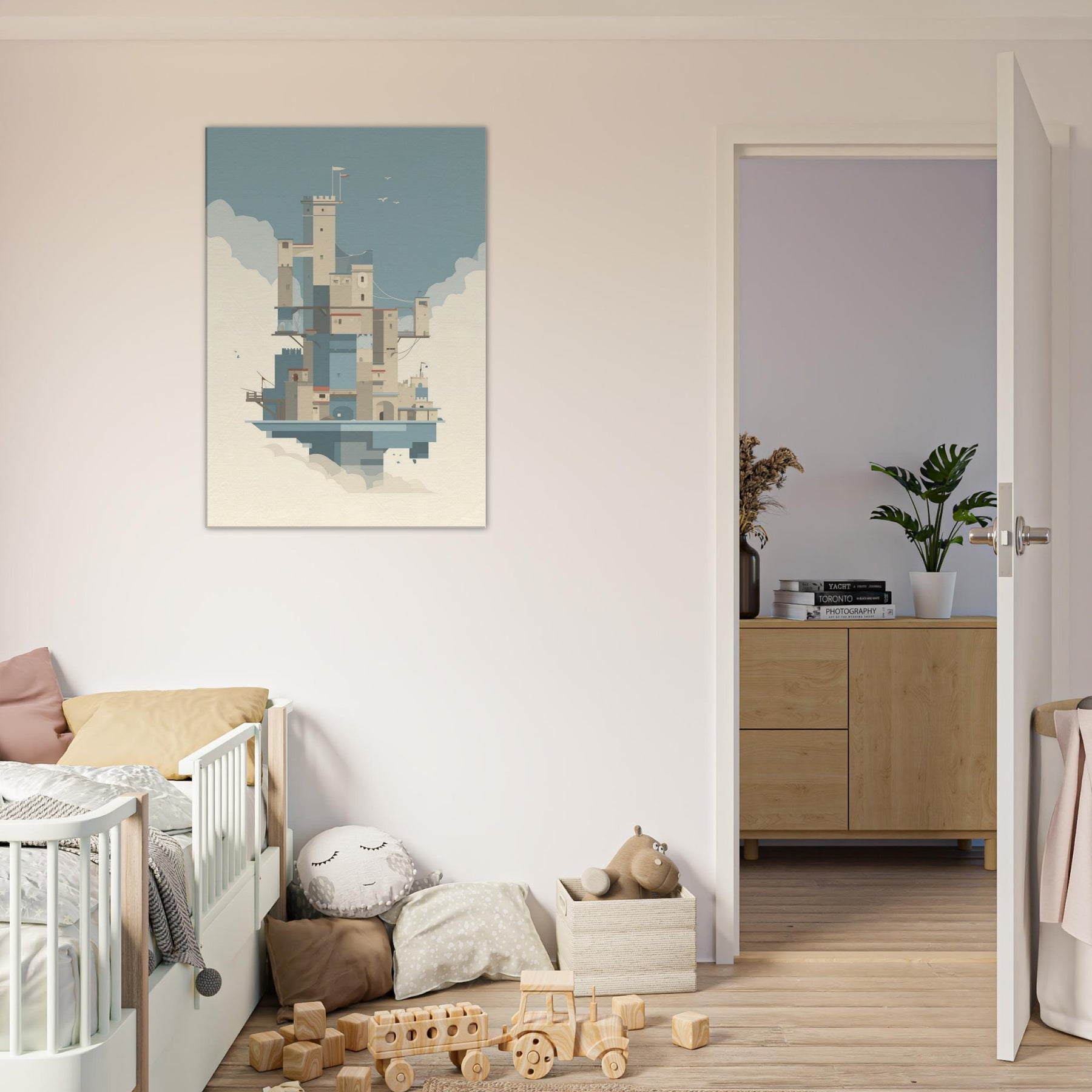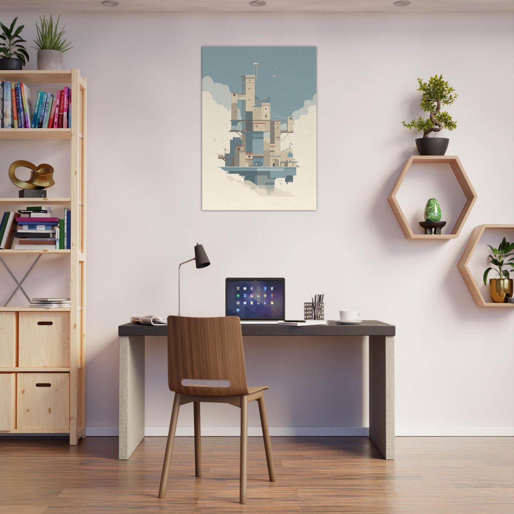 Let your walls breathe with a tranquil reverie as a Floating City rests among pale clouds, each blocky tower tied by pale bridges and whispered wind. This minimalist fantasy evokes quiet wonder rather than grandeur, inviting soft light and calm to your living space. The color palette cream, slate, oat, and sky textures the room with imagined sea breezes and distant bells. Perfect above a sofa or desk, it anchors conversations and offers a daily reminder that imagination can lift the room.