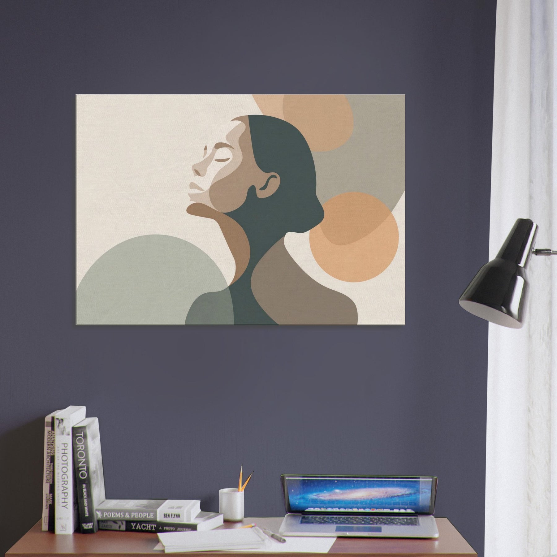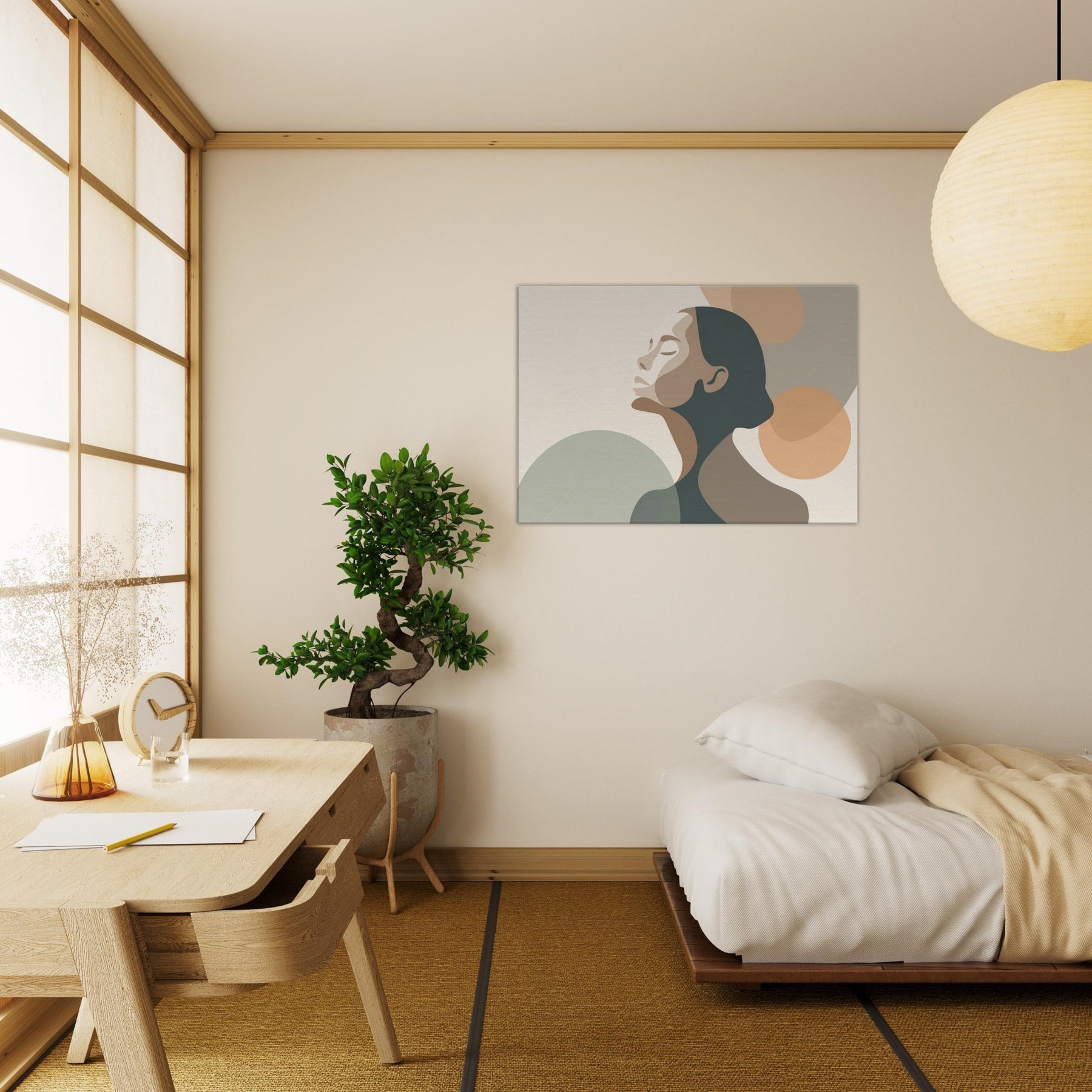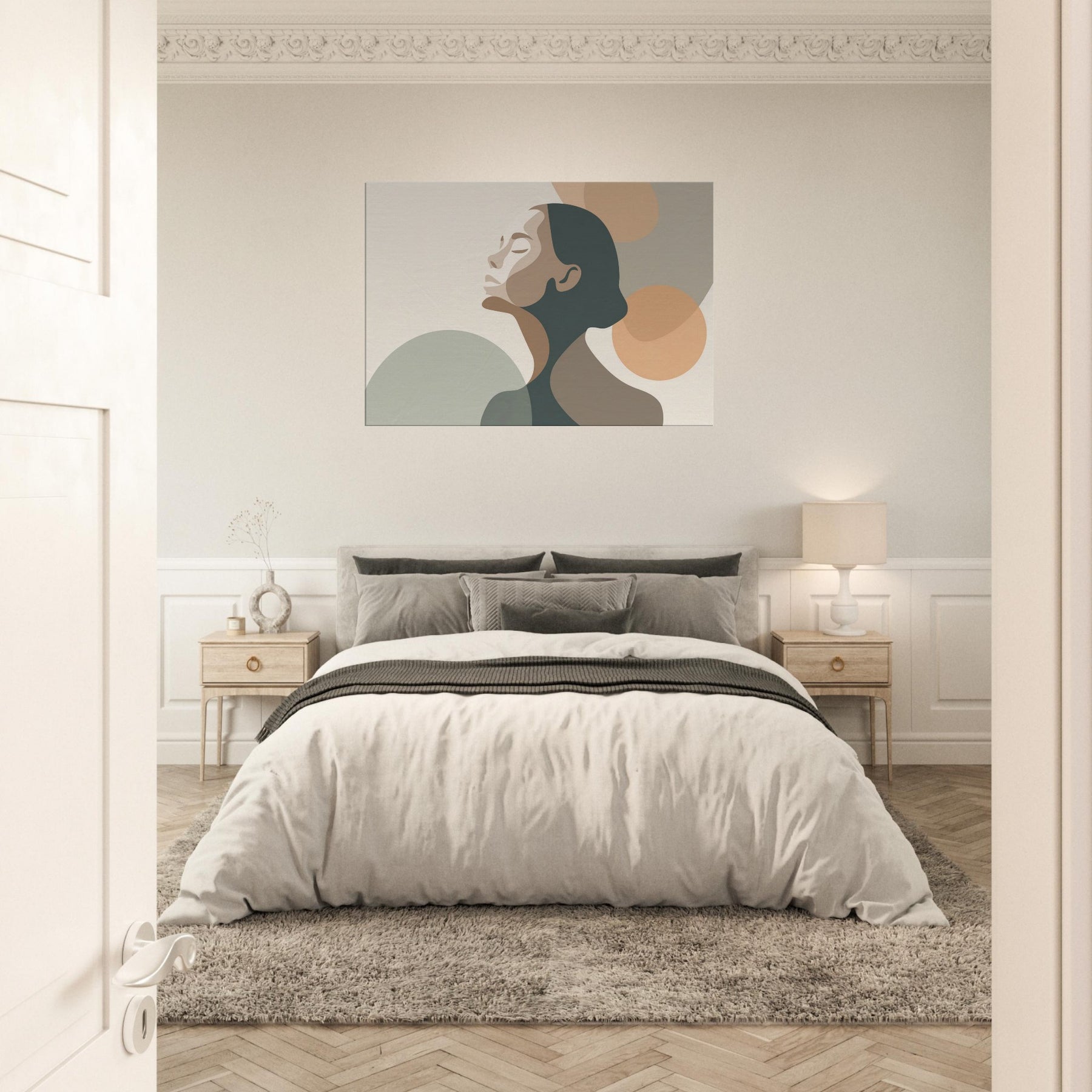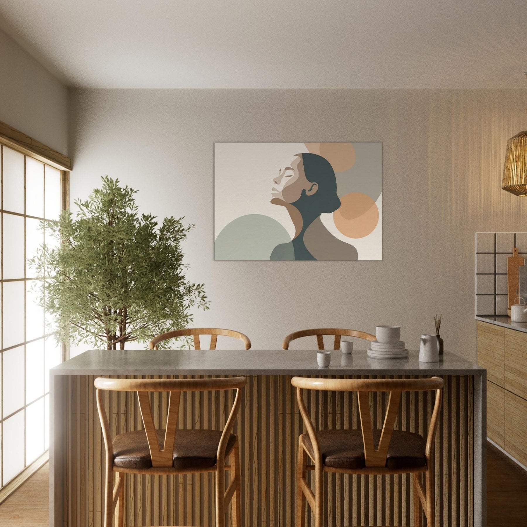 This minimalist study centers the Ballerina Silhouette in a hush of warm neutrals. The soft, interlocking shapes echo breath and balance, inviting the eye to glide along the curve of the neck and the arch of the back. The palette creams, taupes, and muted greens breathes calm into any living space, enhancing a living room, studio, or bedroom with quiet elegance. A sense of movement lingers, turning walls into a stage for everyday grace.