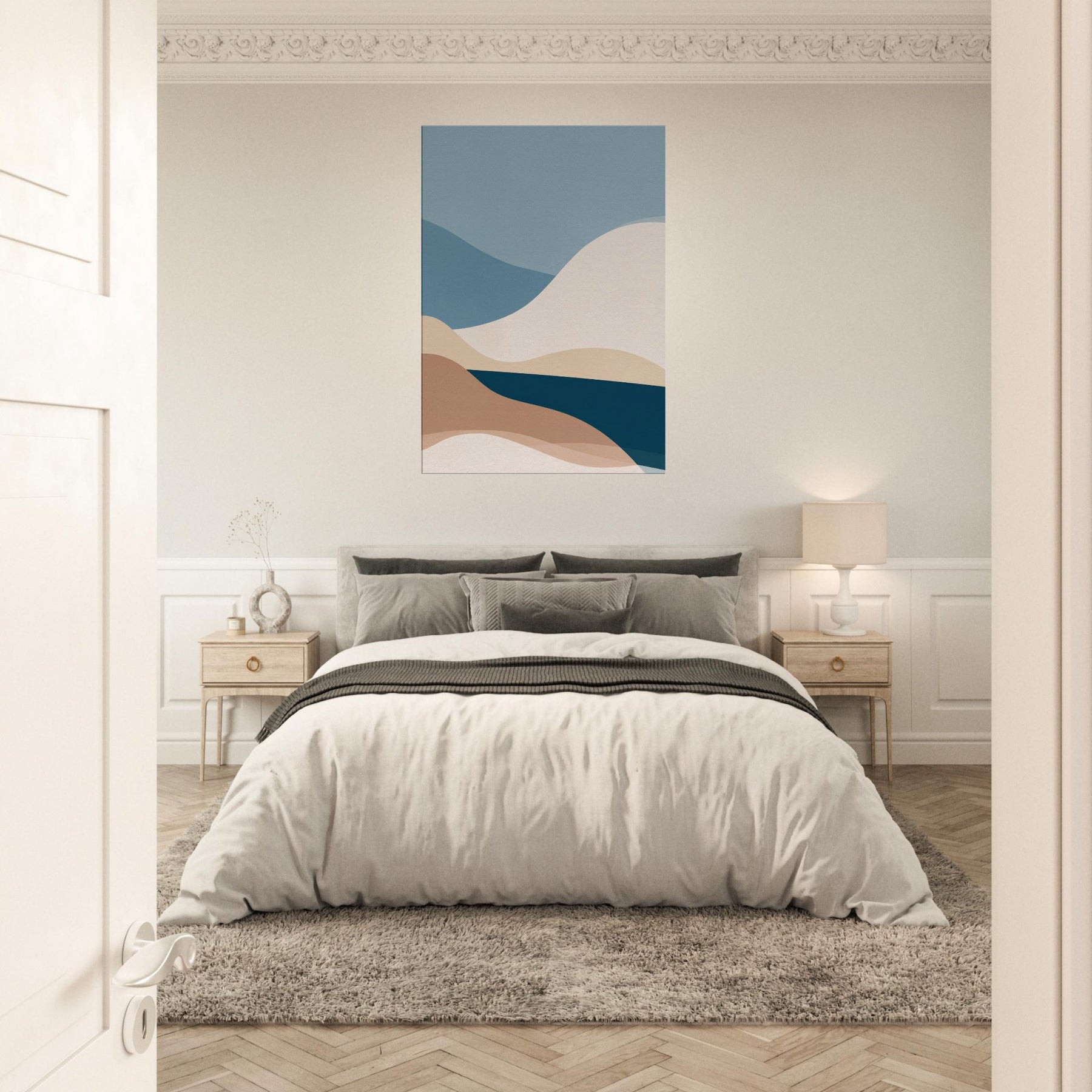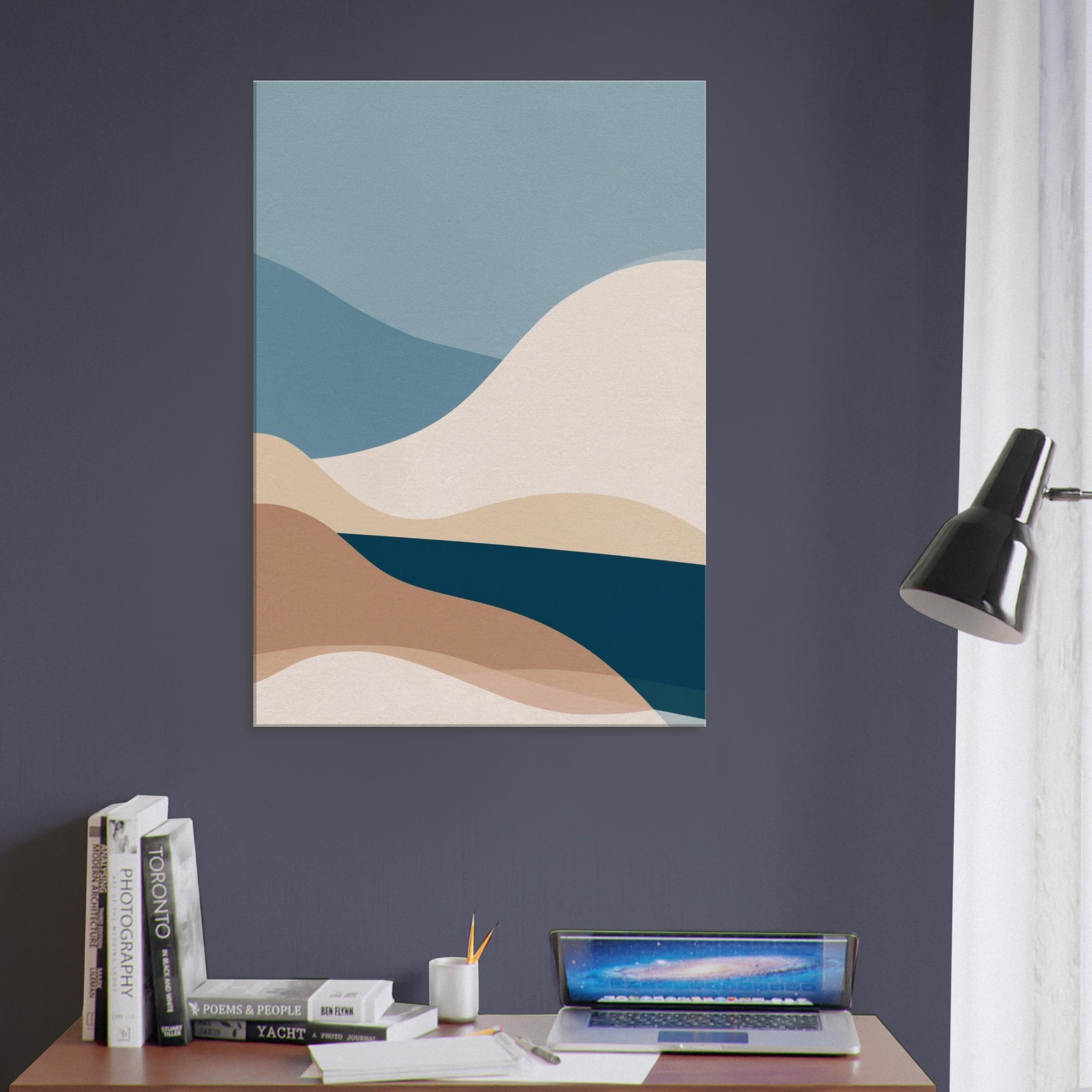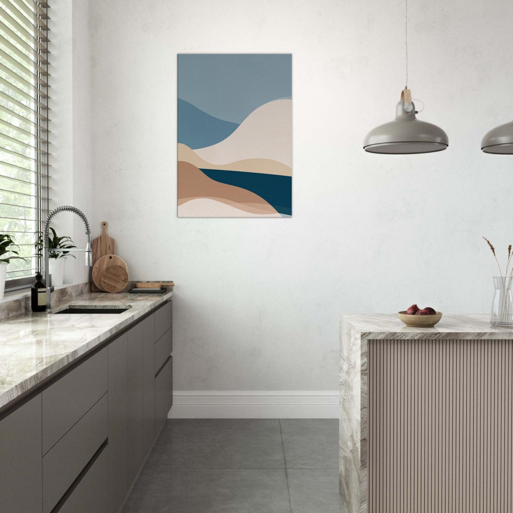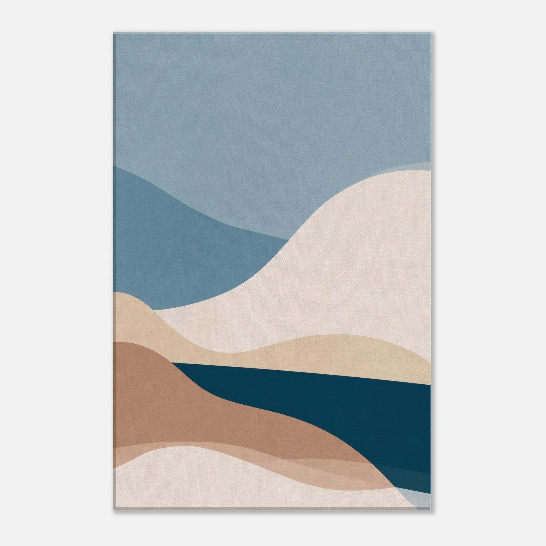 This Color Field composition invites calm into any room, a minimalist meditation on color and form. Layered curves roll across the canvas like distant hills, their soft earth and ocean tones blending into a quiet horizon. The atmosphere feels airy yet grounded, with a tactile warmth that warms bare walls and elevates everyday moments. In a living space, it becomes a serene backdrop for conversation or reflection, adding depth, balance, and a generous sense of calm to the space.