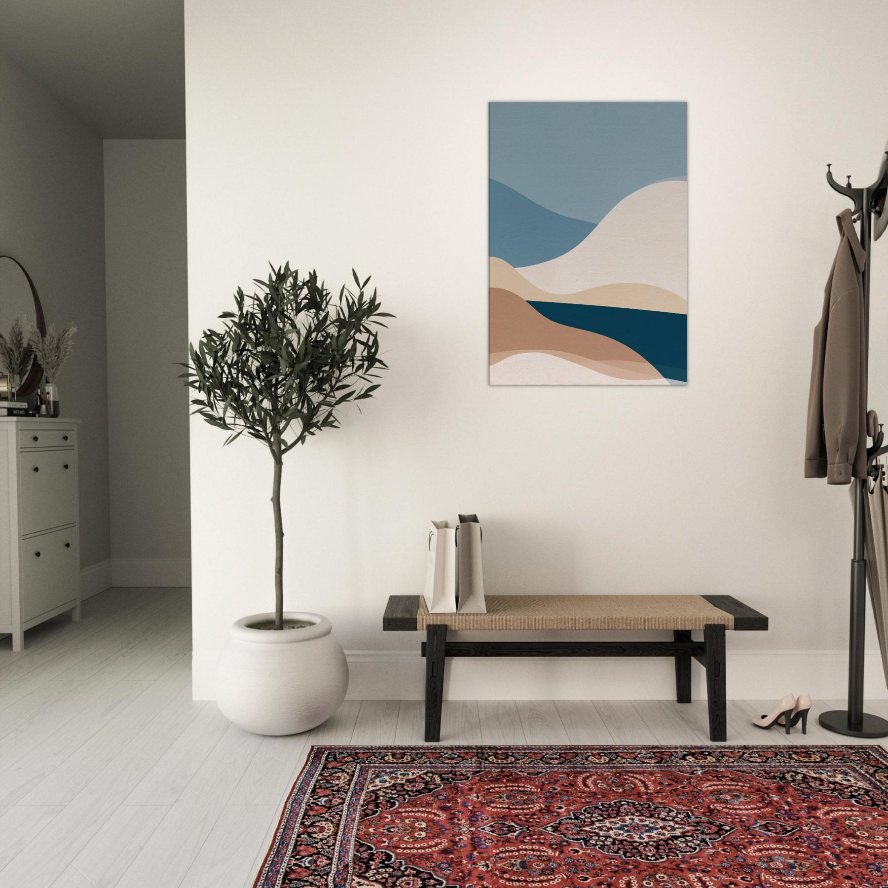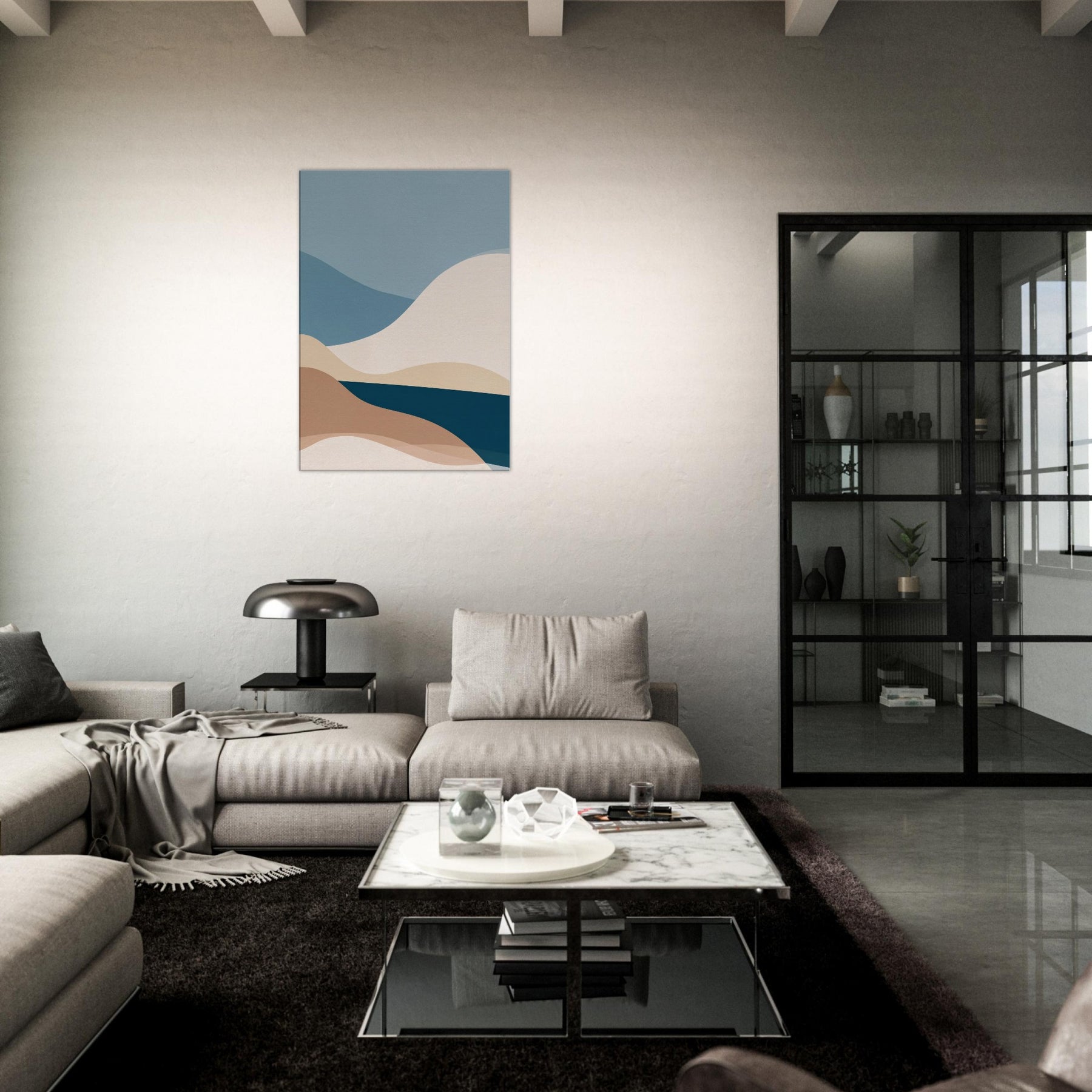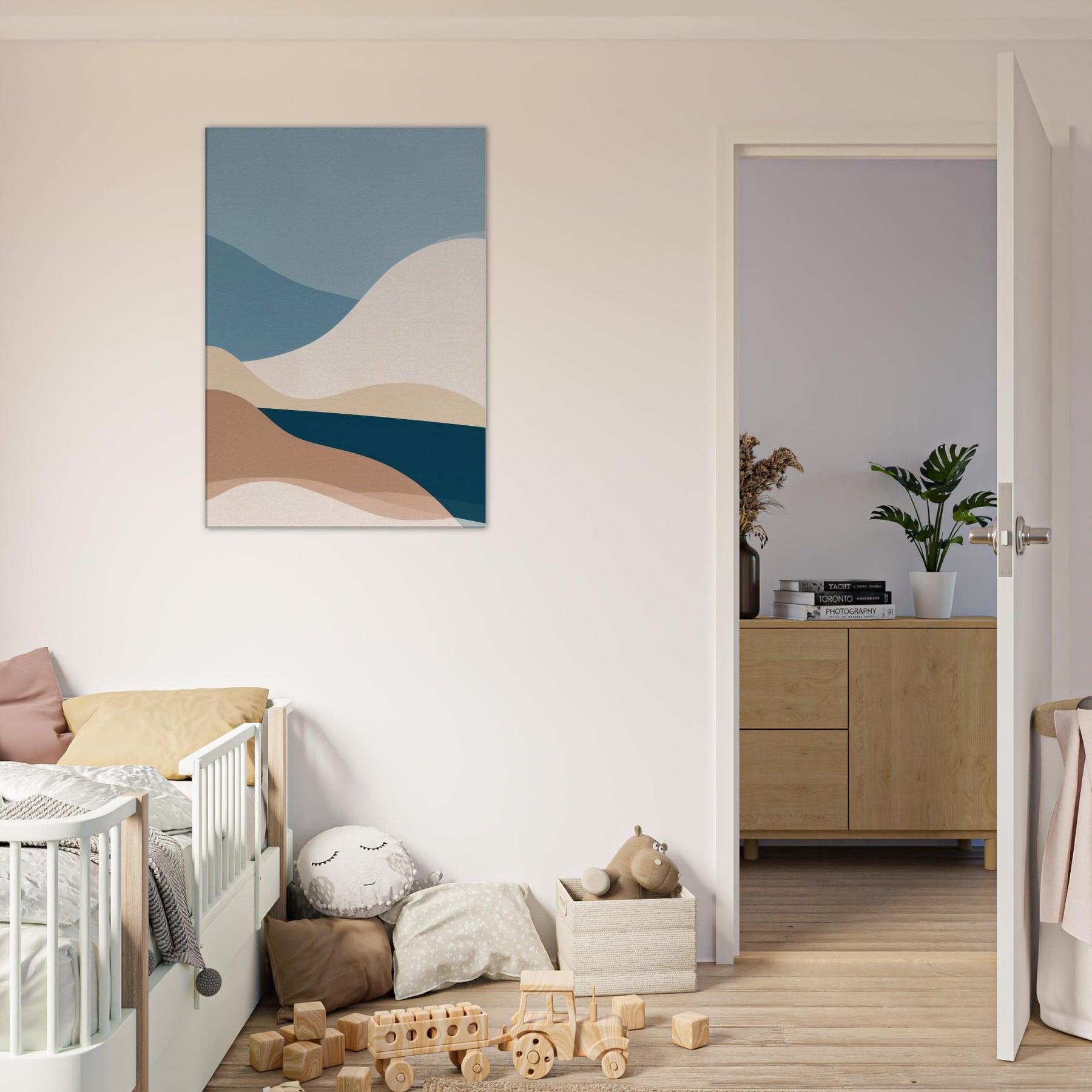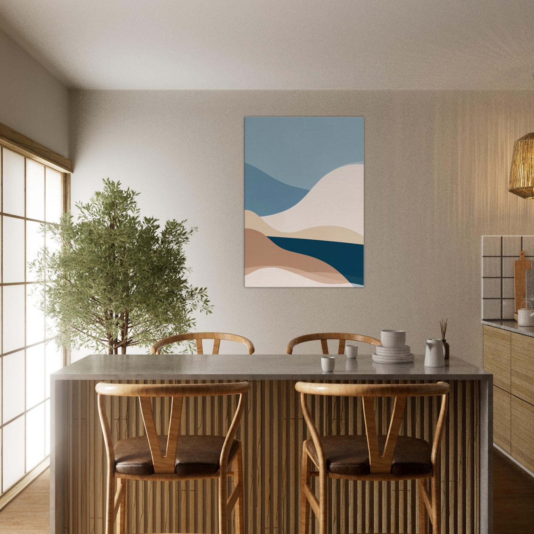 This Color Field composition invites calm into any room, a minimalist meditation on color and form. Layered curves roll across the canvas like distant hills, their soft earth and ocean tones blending into a quiet horizon. The atmosphere feels airy yet grounded, with a tactile warmth that warms bare walls and elevates everyday moments. In a living space, it becomes a serene backdrop for conversation or reflection, adding depth, balance, and a generous sense of calm to the space.