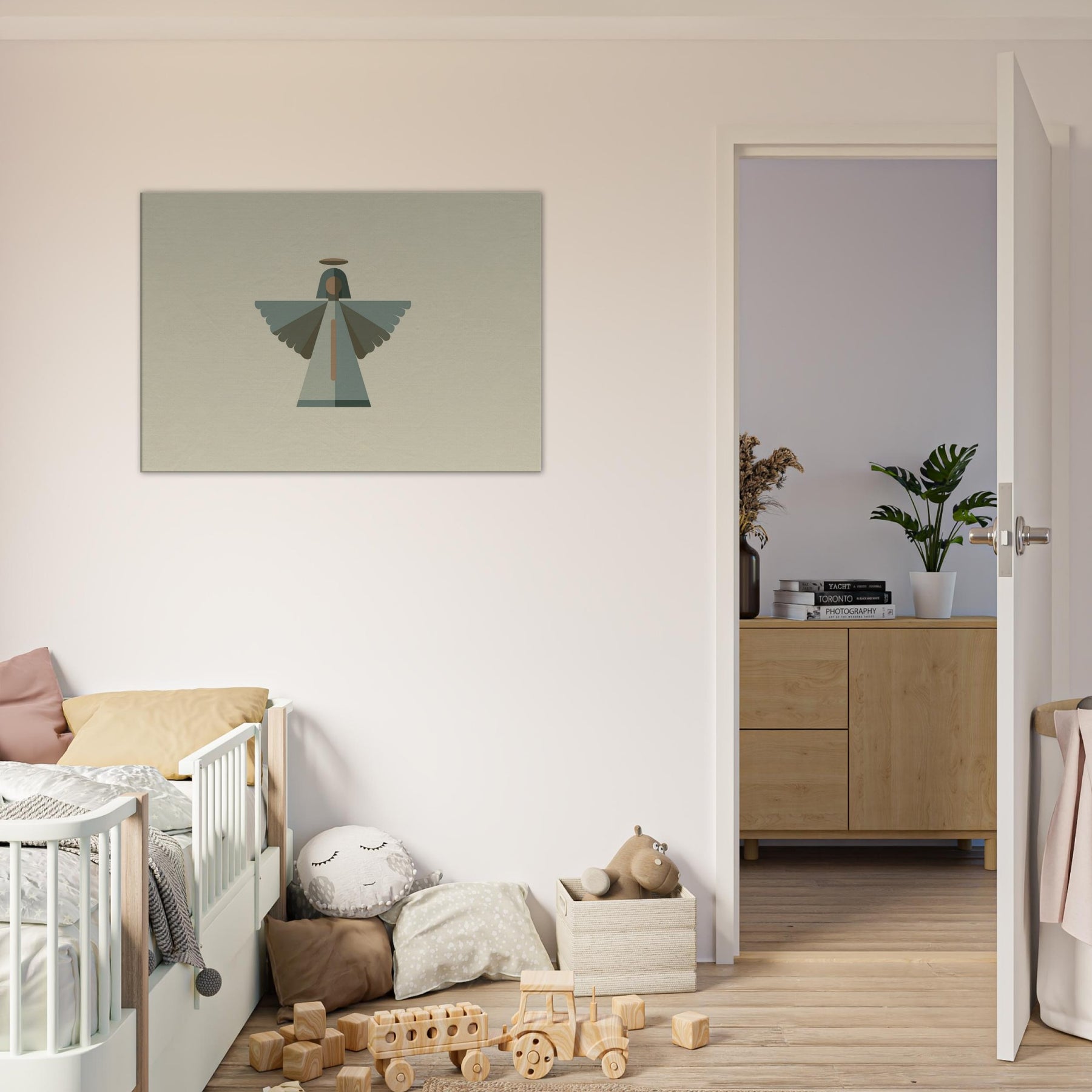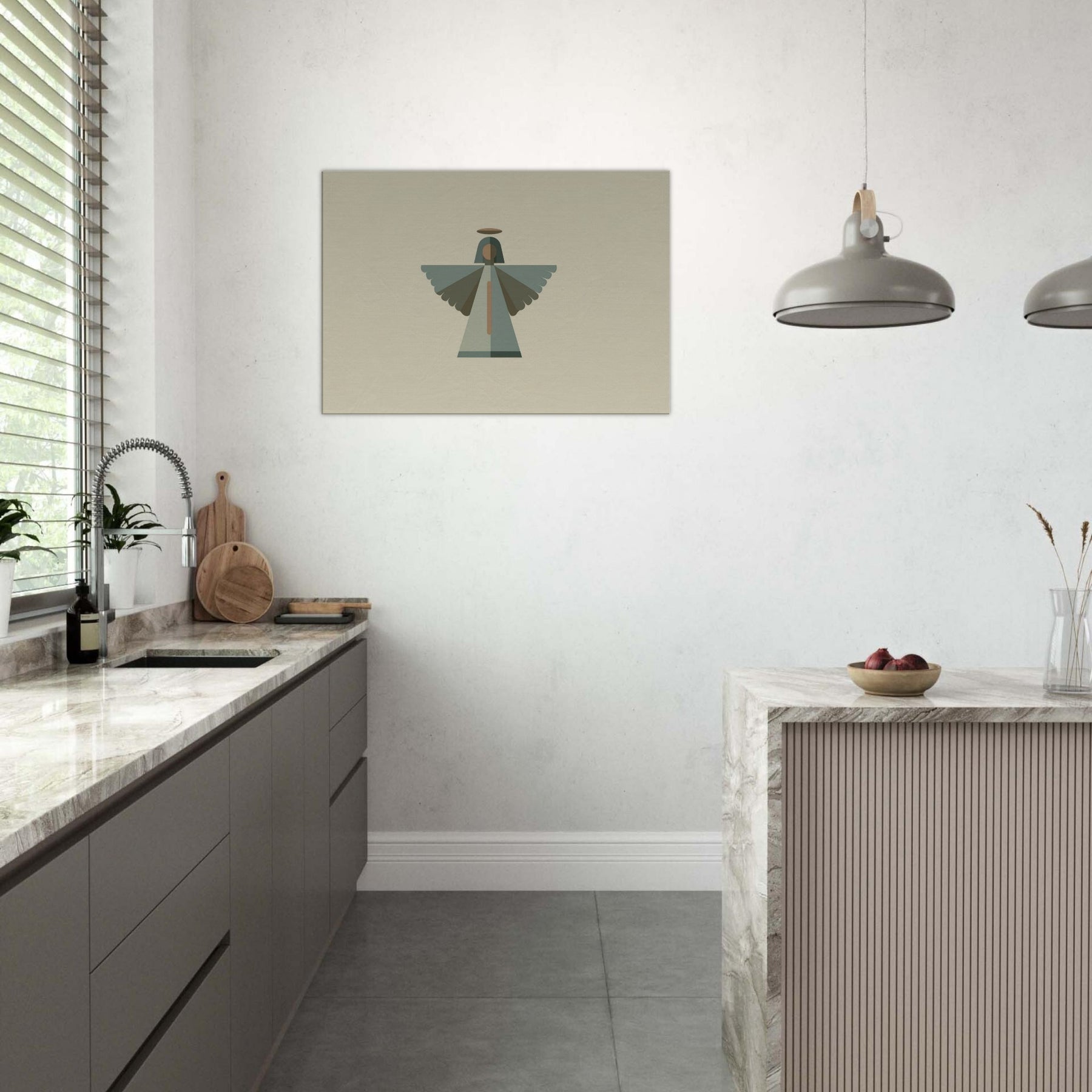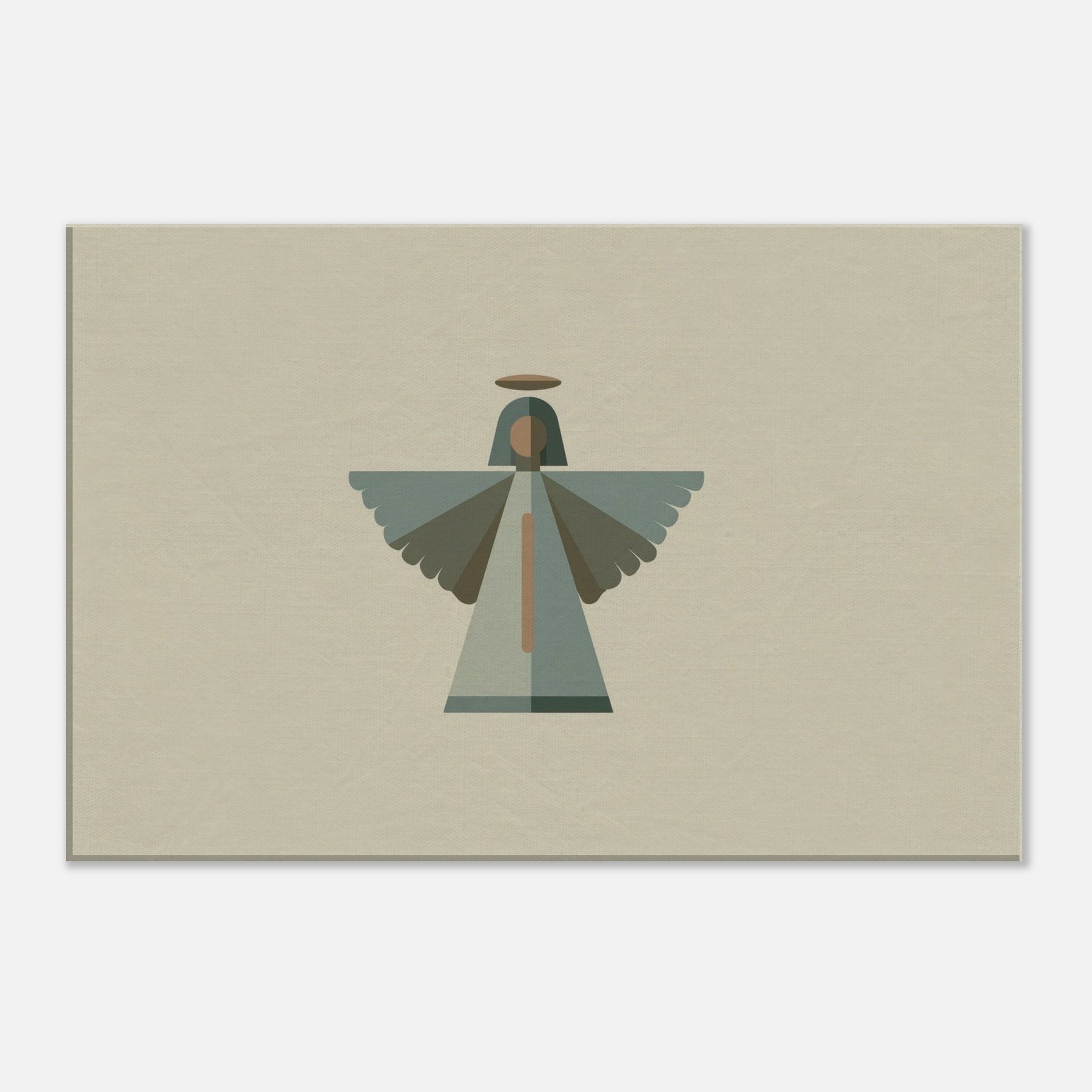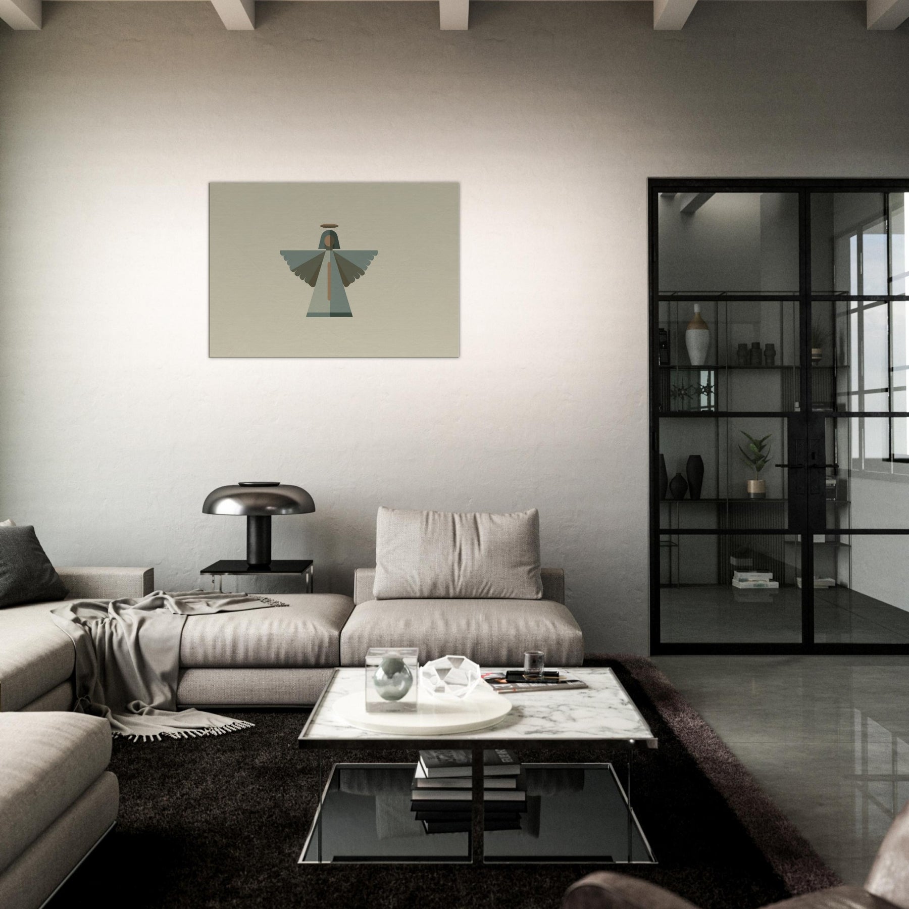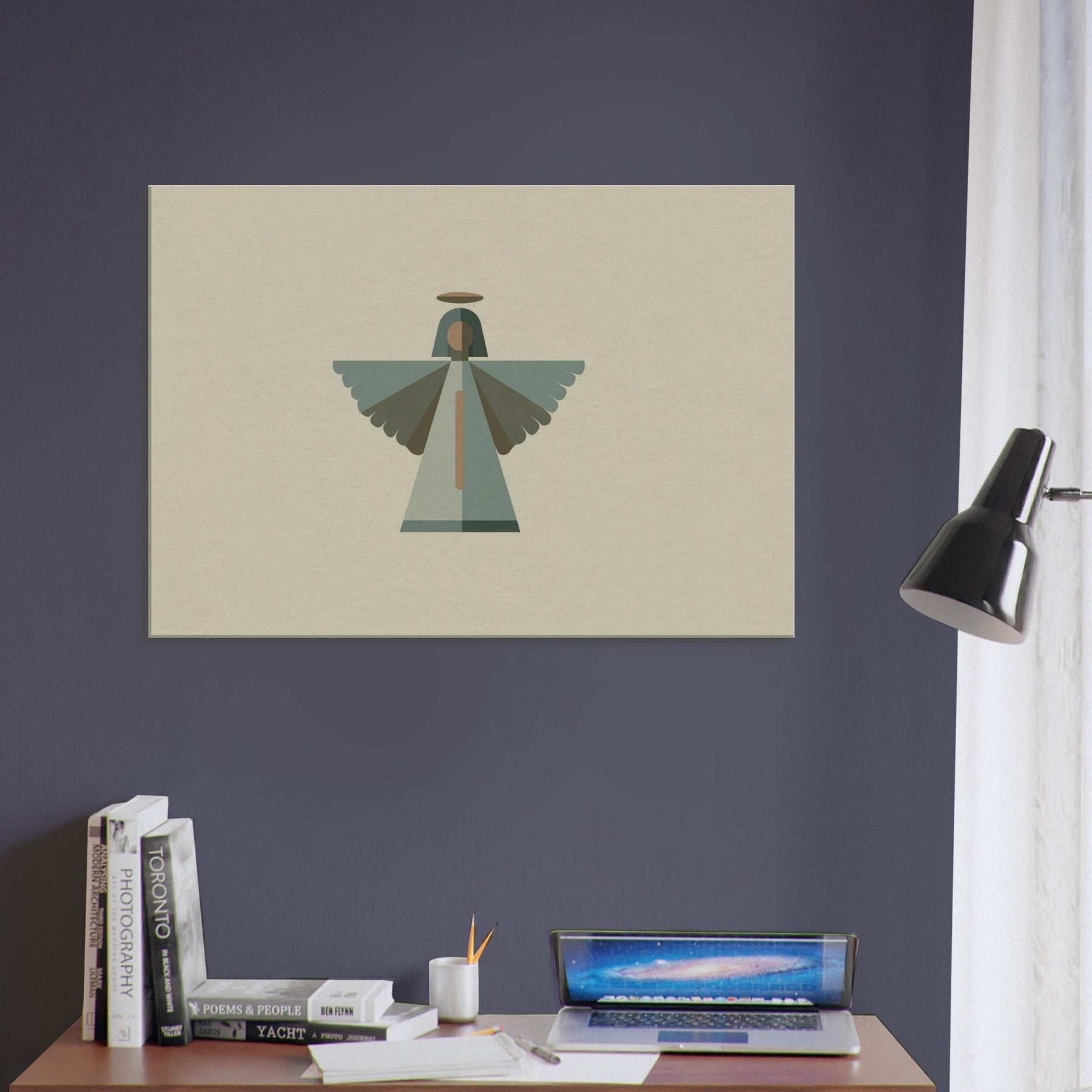 An ethereal Angel unfolds in restrained geometry, where wings become a folded contour of calm, and a halo rests in quiet balance. This minimalist portrayal invites stillness, turning any wall into a sanctuary of light and breath. The soft, earthy palette wraps the room in warmth, while the deliberate simplicity lets natural textures: wood, linen, and stone shine. Placed above a sofa or in a meditation corner, the Angel radiates reassurance, guiding the eye with gentle symmetry and timeless grace. The central subject is Angel/Archangel.