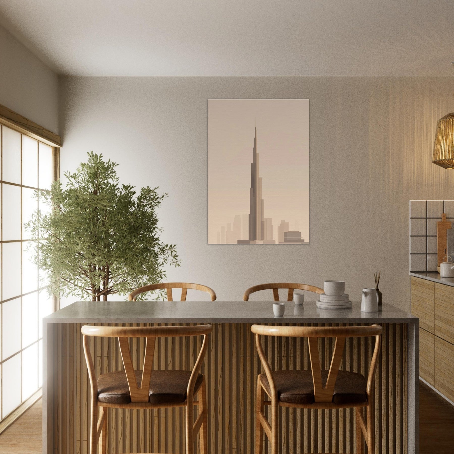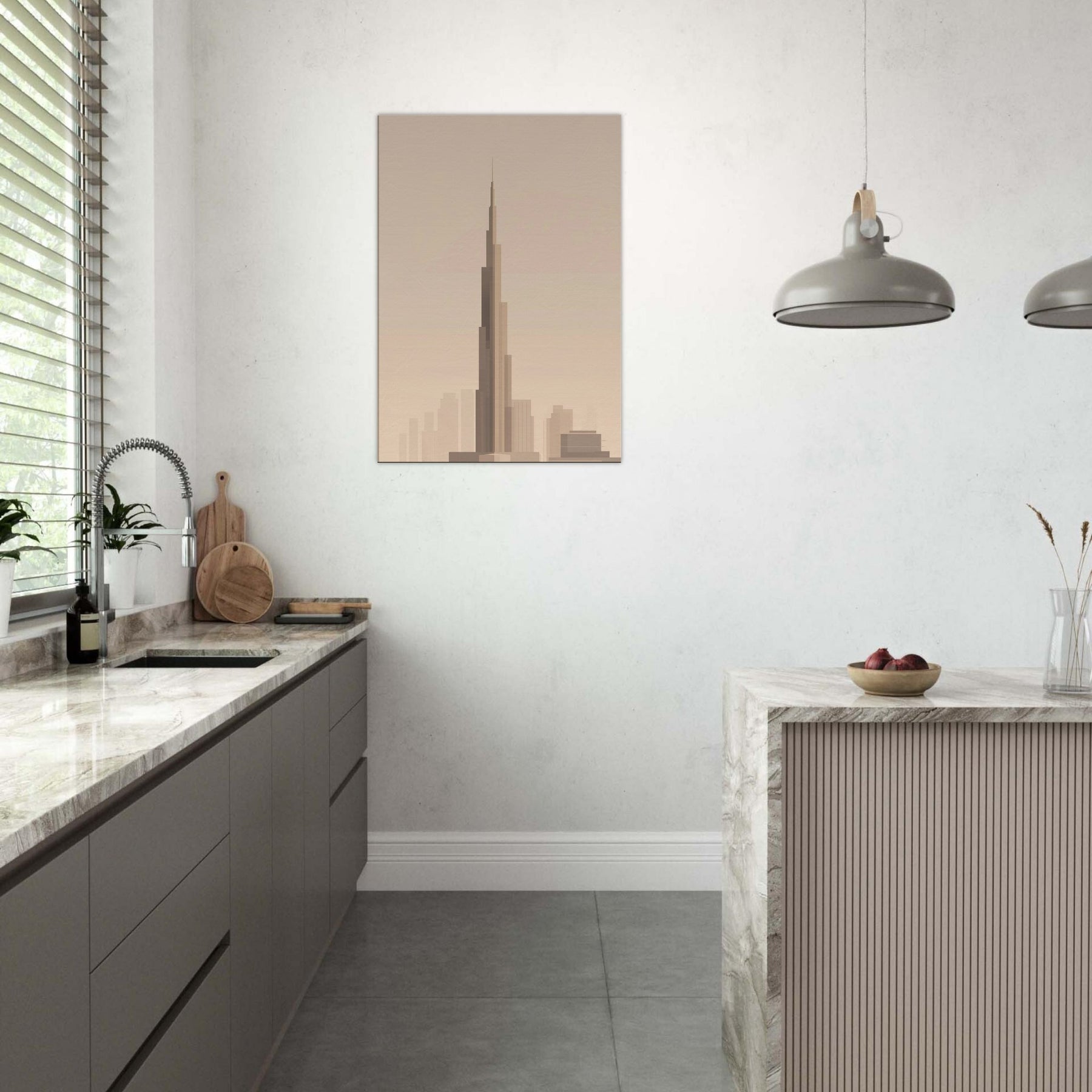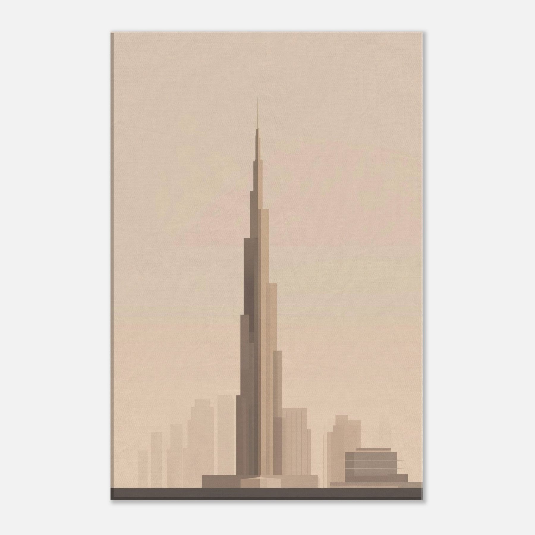Bathed in warm, pale light, this minimalist portrayal captures the Burj Khalifa as a quiet, soaring line against a soft horizon. The gentle gradations evoke a city waking, inviting calm into any room. Hang it in a living area or study to soften glass and metal with airy restraint, letting the silhouette guide your gaze upward. It's not just a print; it's a mood an invitation to pause, dream, and let Dubai's iconic tower lend grace to everyday moments.
