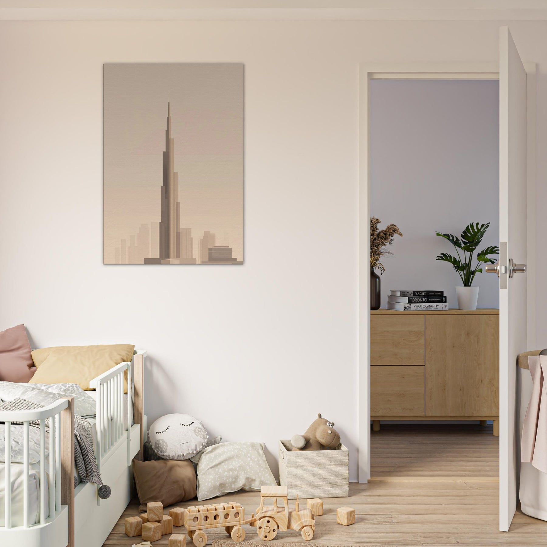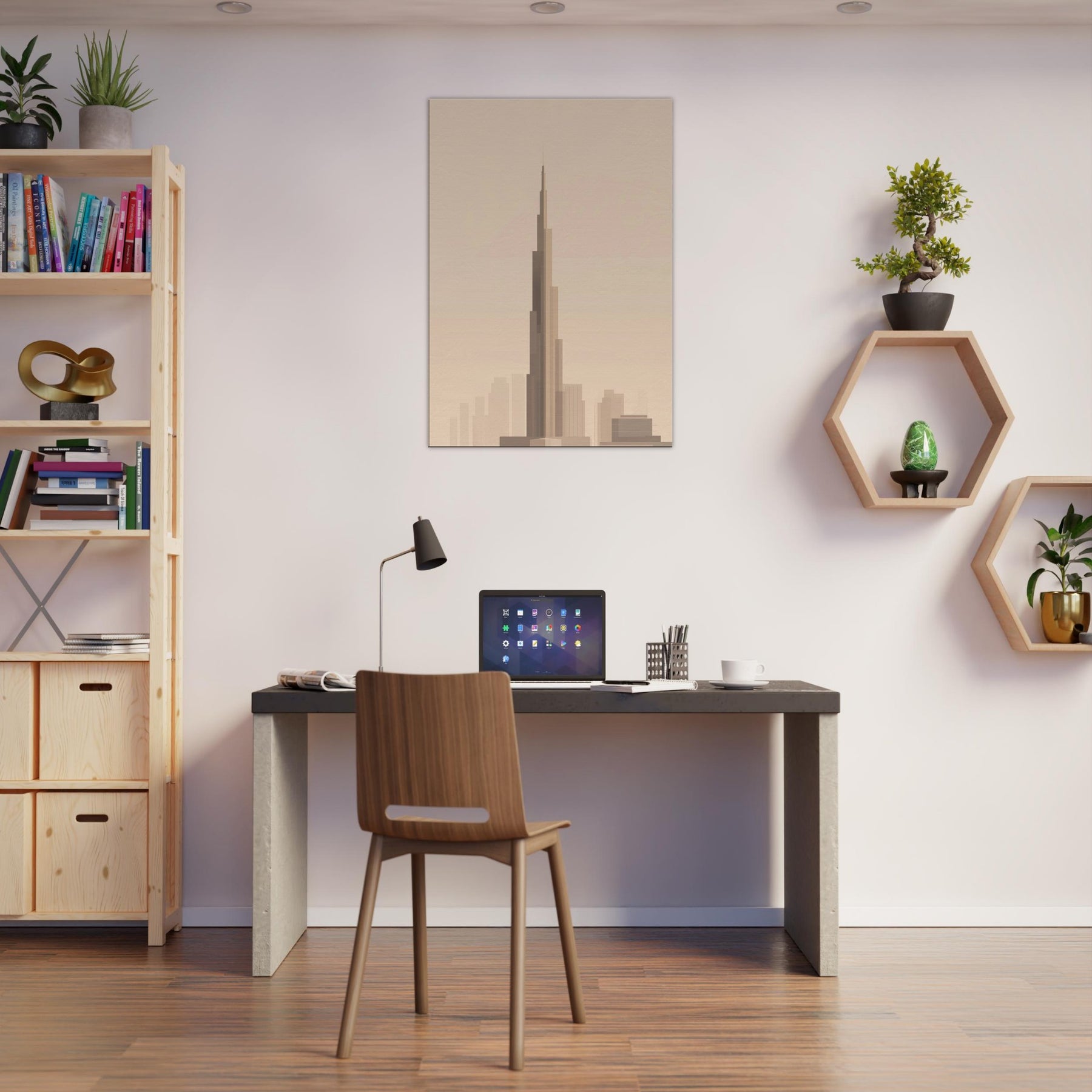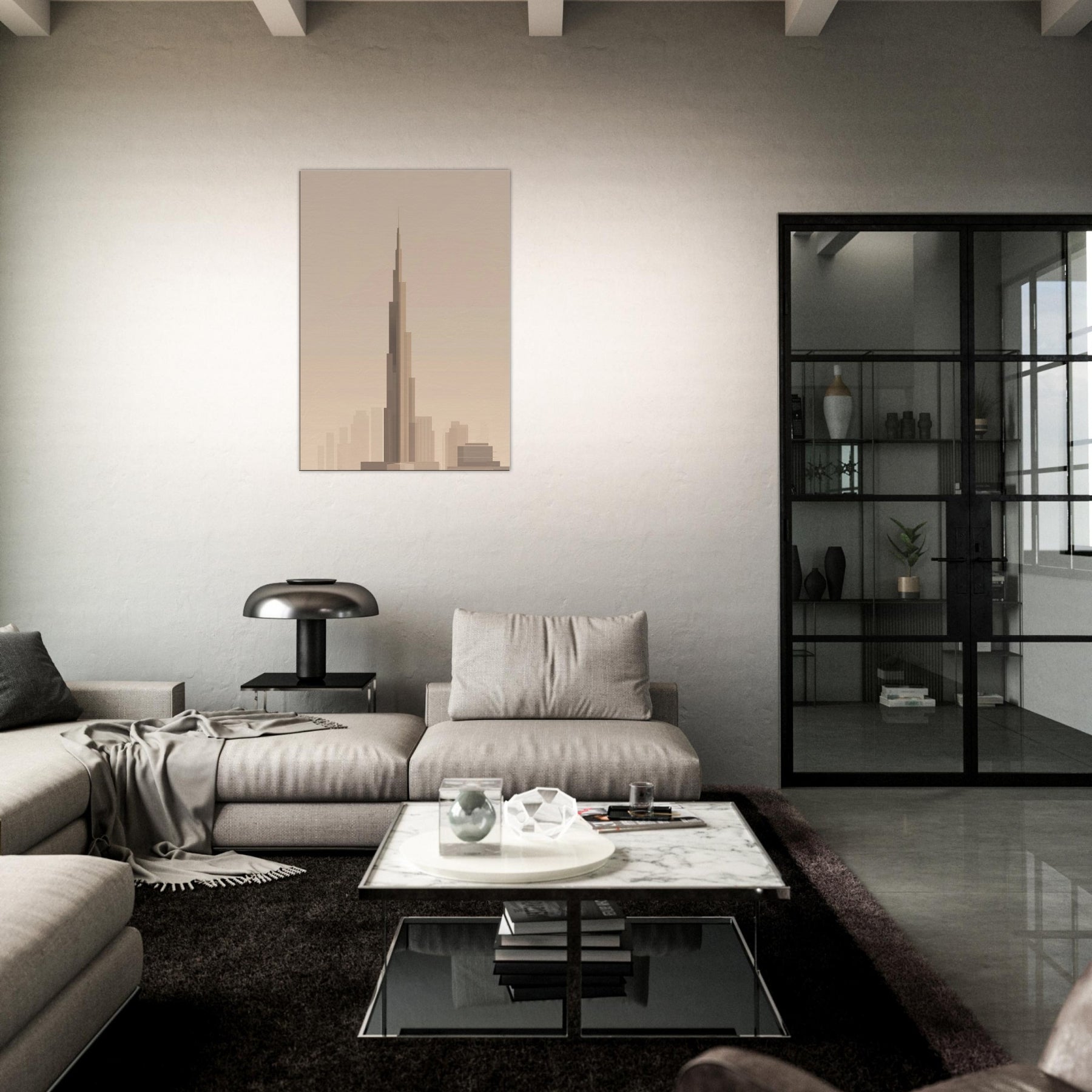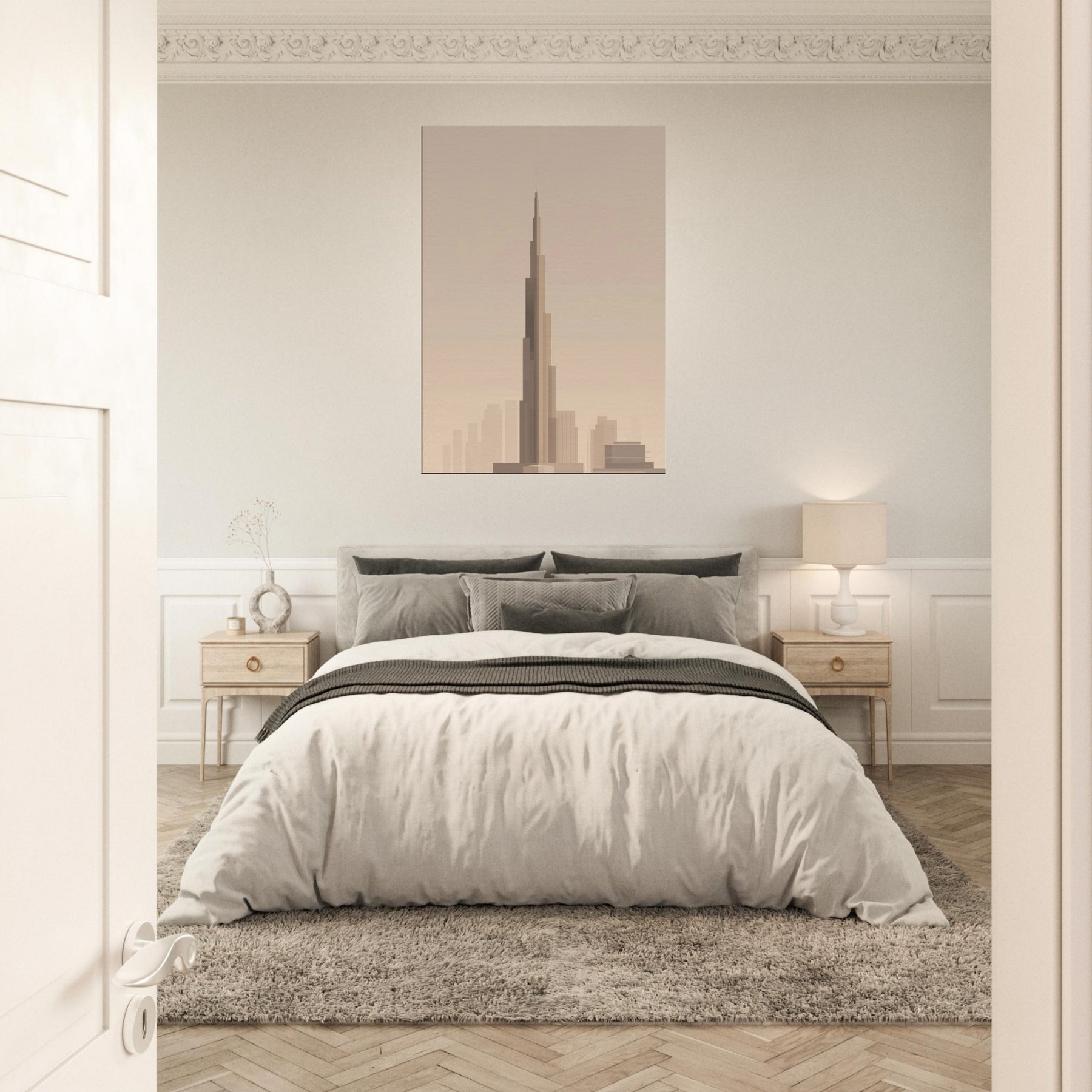 Bathed in warm, pale light, this minimalist portrayal captures the Burj Khalifa as a quiet, soaring line against a soft horizon. The gentle gradations evoke a city waking, inviting calm into any room. Hang it in a living area or study to soften glass and metal with airy restraint, letting the silhouette guide your gaze upward. It's not just a print; it's a mood an invitation to pause, dream, and let Dubai's iconic tower lend grace to everyday moments.