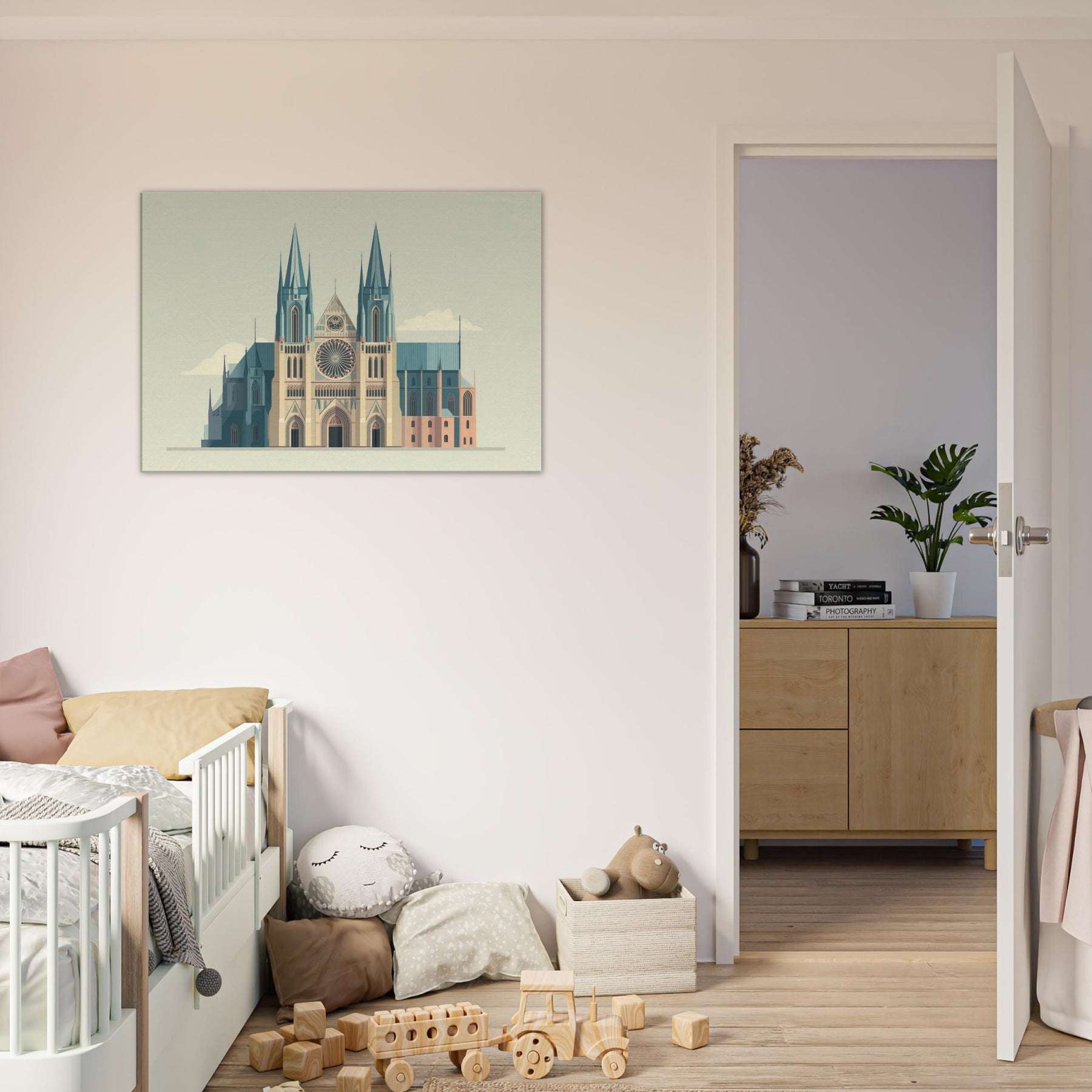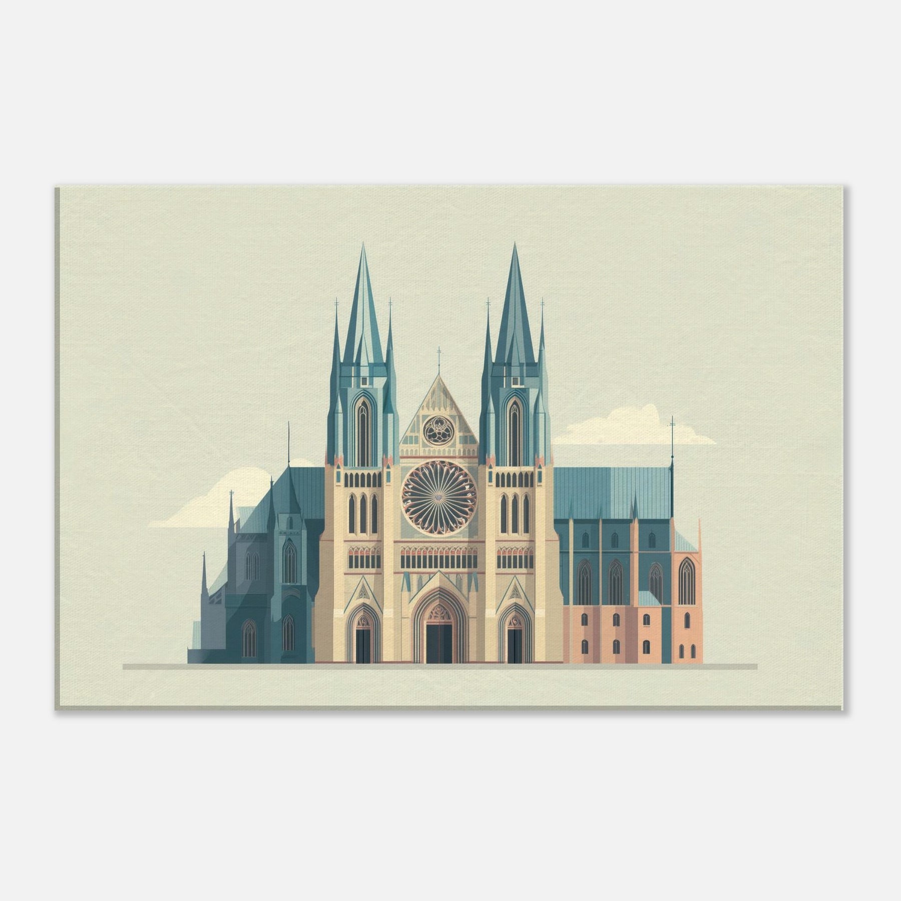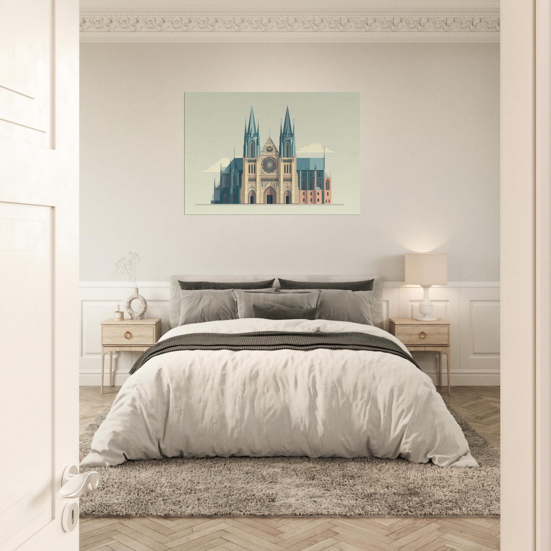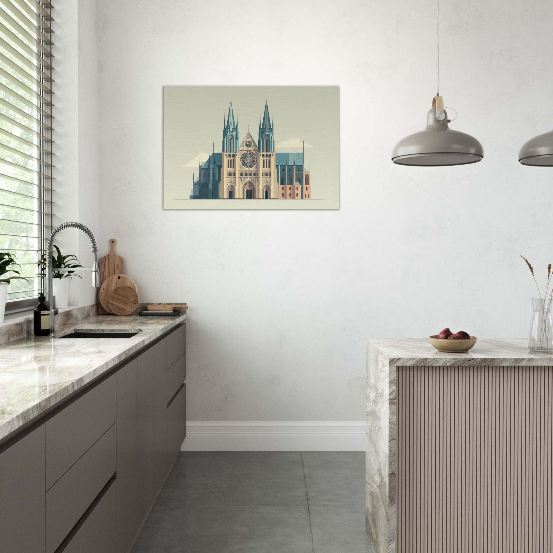 This minimalist rendering of a Gothic Cathedral radiates calm and clarity, where soaring spires and a radiant rose window are distilled into clean geometry and soft, dusk toned color. The quiet rhythm of arches invites contemplation, turning any wall into a sanctuary of light and shadow. Perfect for a living room or study, it elevates the space with a sense of architectural poetry bold without shouting, timeless yet contemporary while allowing personal pieces to breathe beside its serene, symphonic lines.