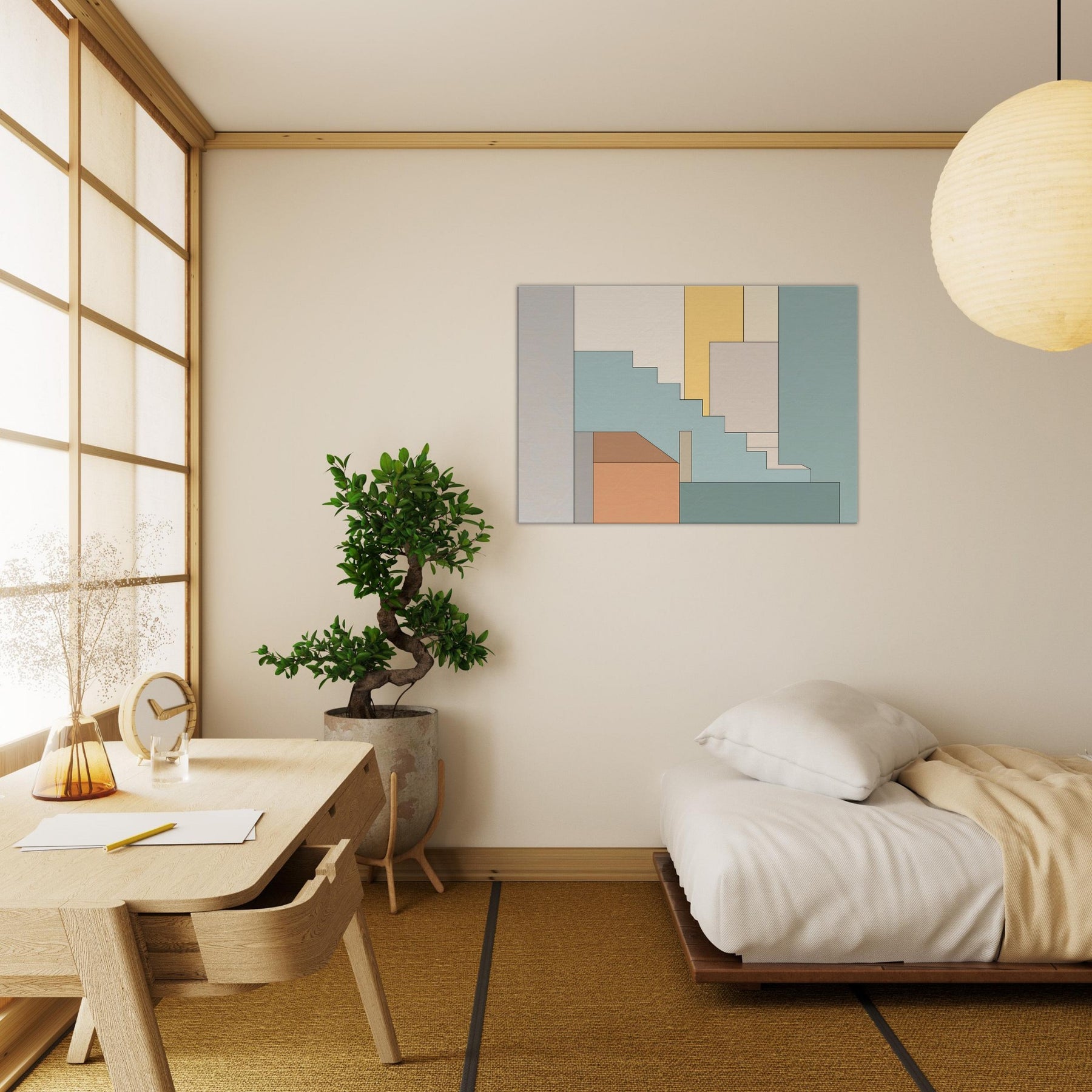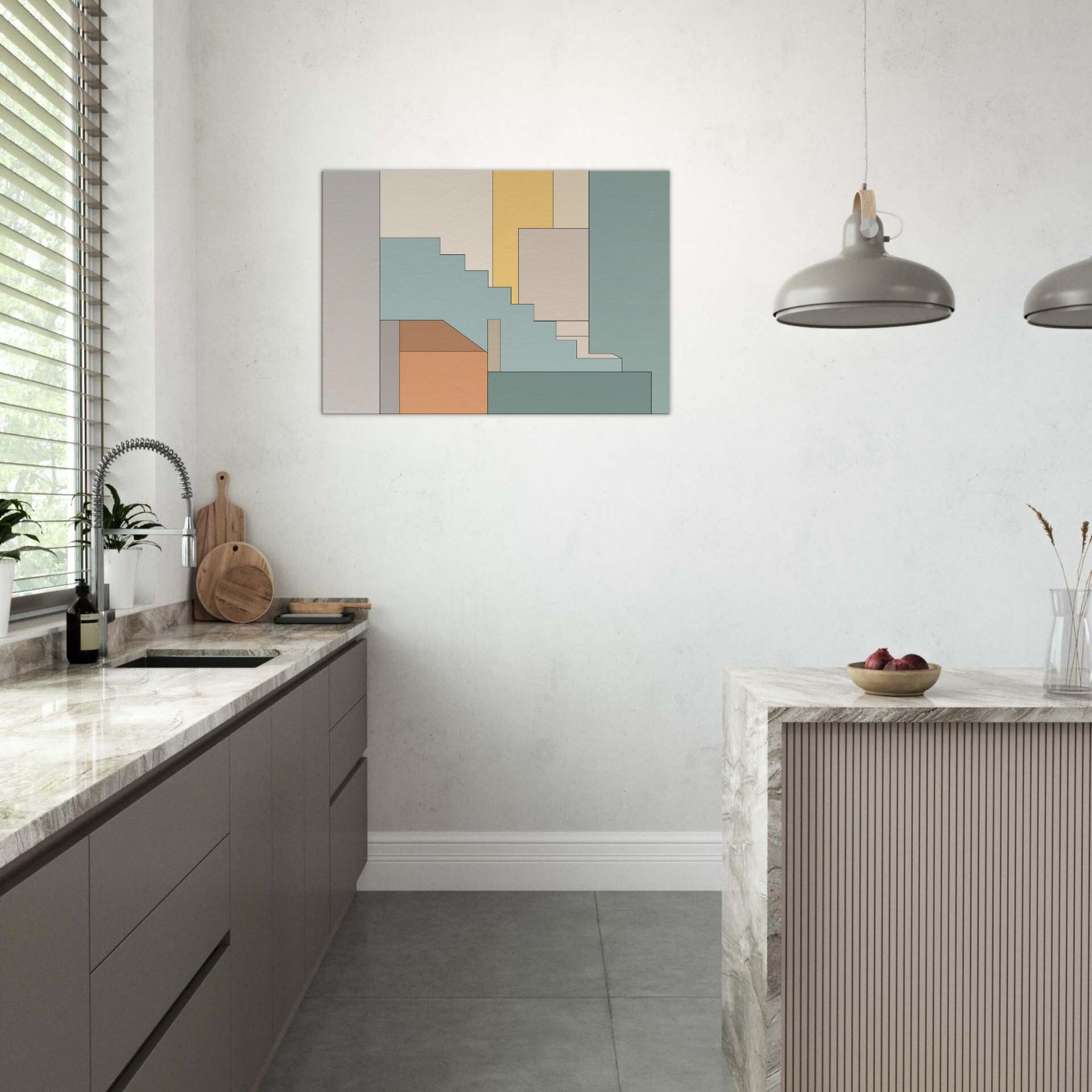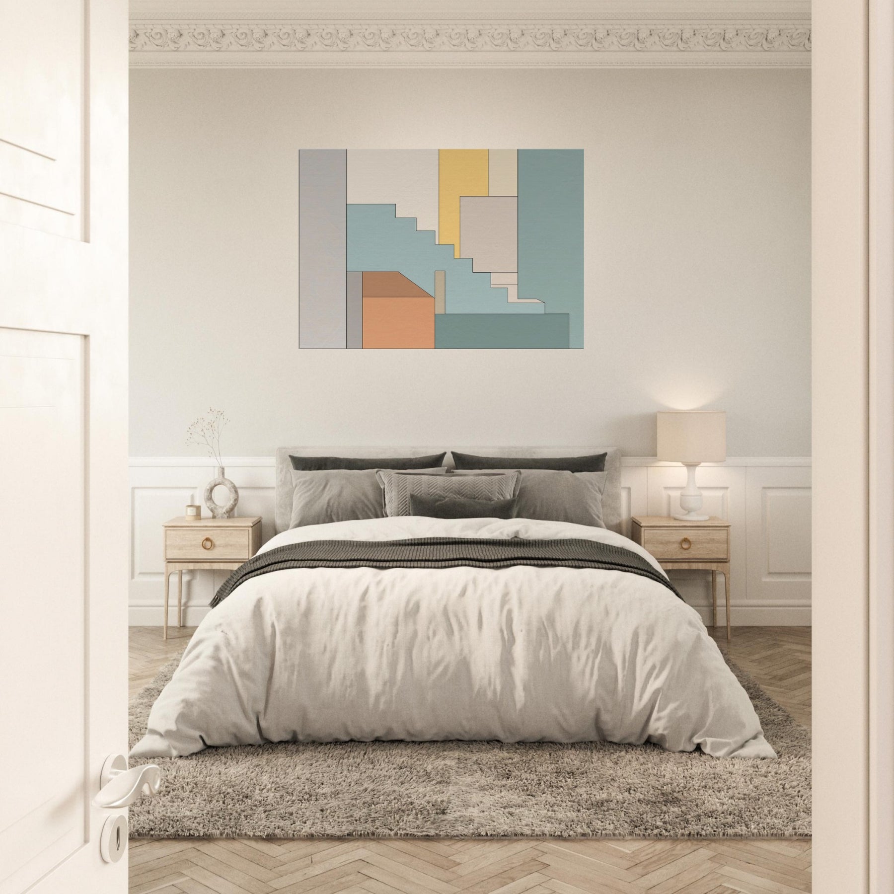 An abstract cityscape distilled to calm blocks and lines, the Staircase Switchback unfolds in soft crescents of cream, sage, peach, and warm ochre. The composition invites the eye to wander along quiet steps, as if a street morphs into a rhythm of light and shadow. In a living room, this piece creates a serene horizon, neutral yet alive, echoing urban architecture with a gentleness that complements modern furniture and airy spaces. A subtle, contemplative focal point for contemporary interiors.
