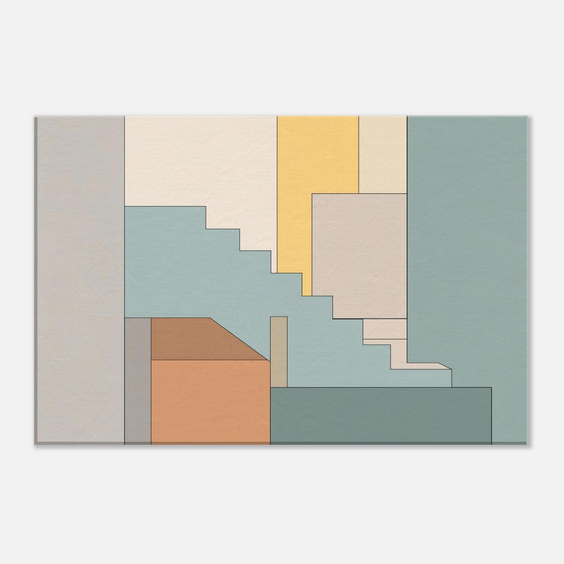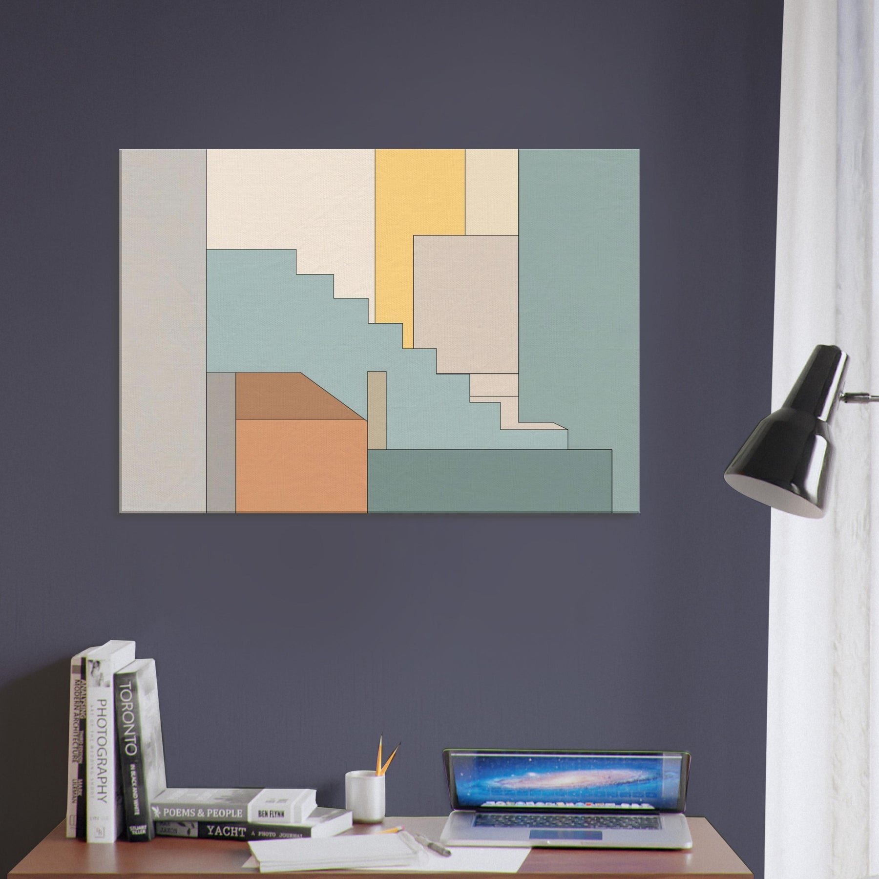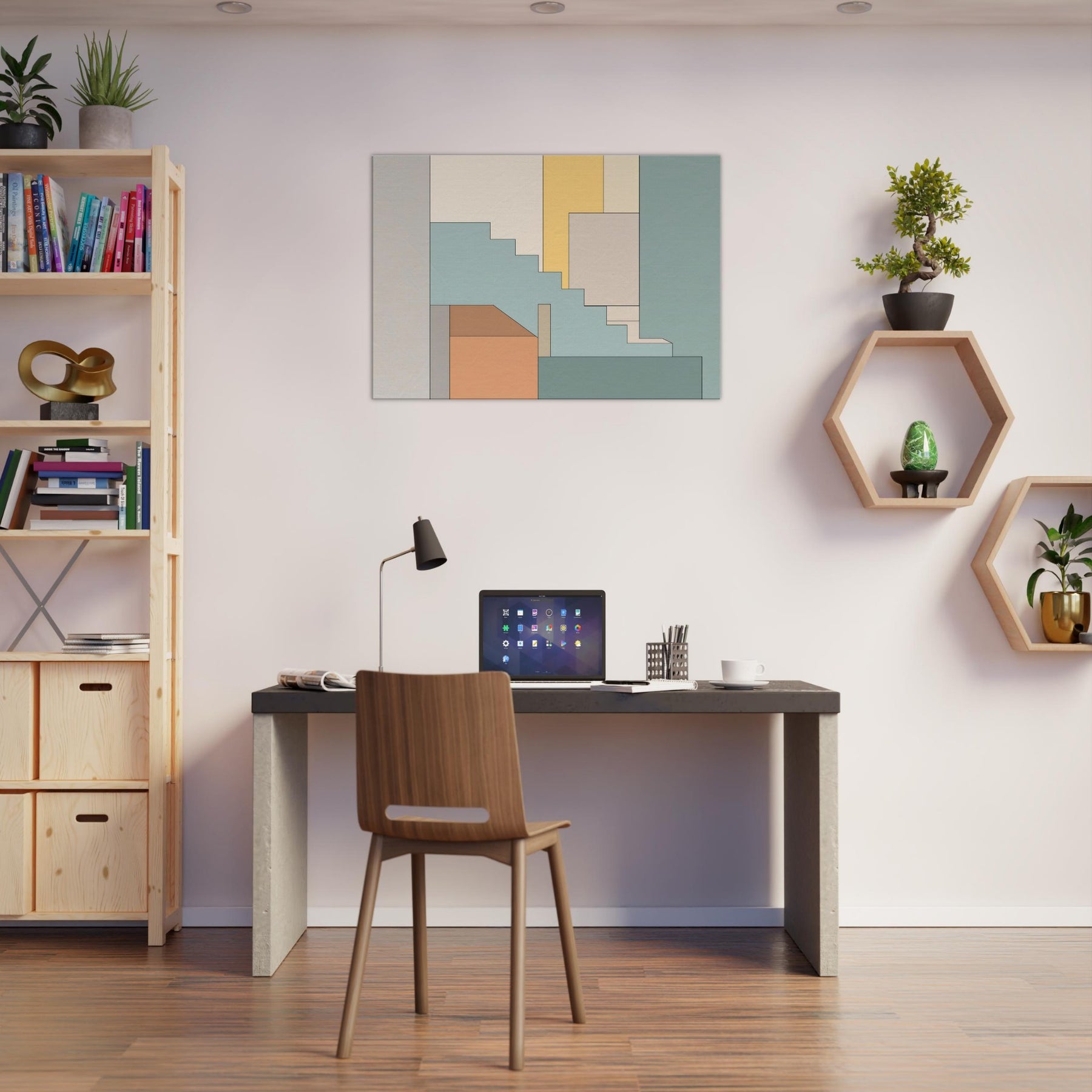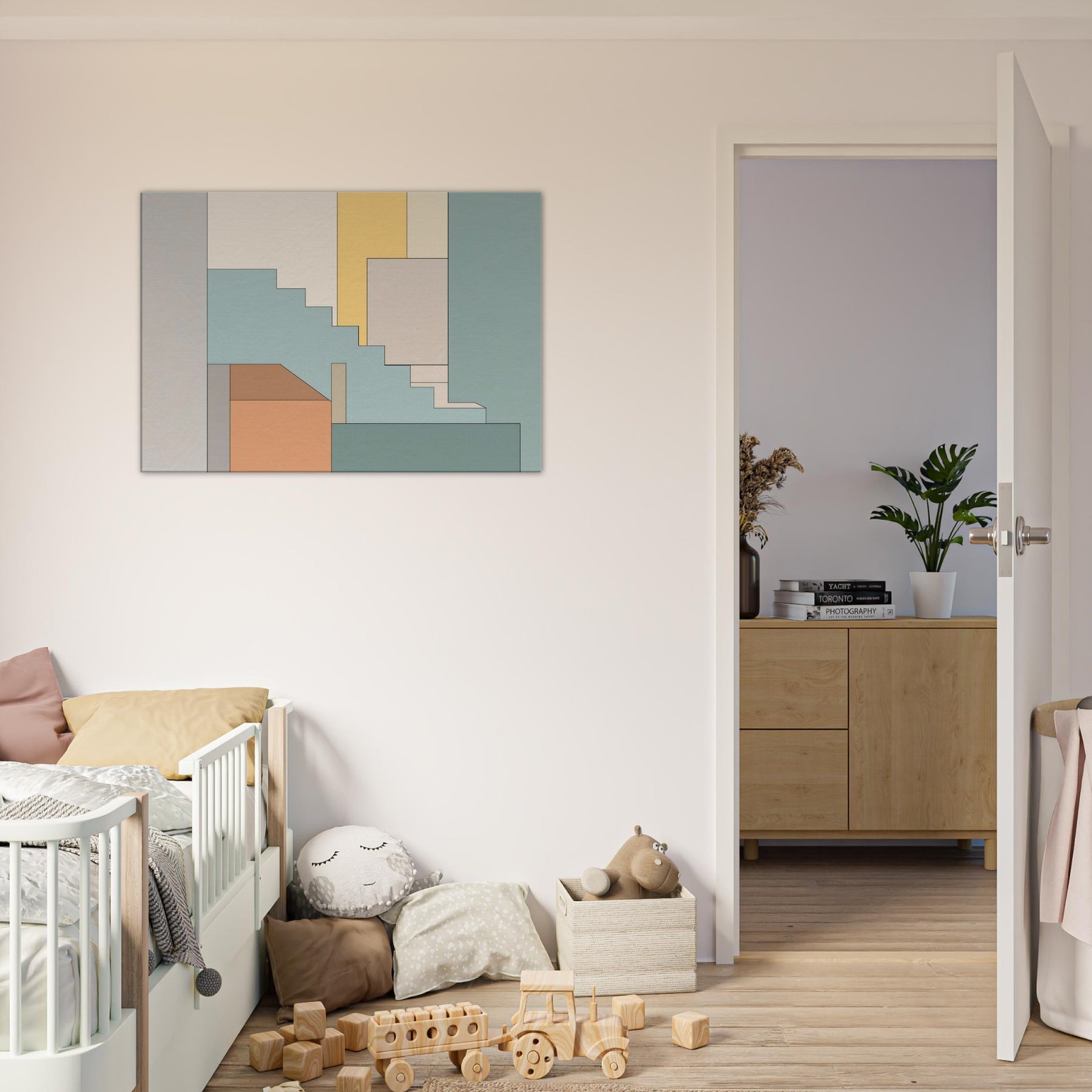 An abstract cityscape distilled to calm blocks and lines, the Staircase Switchback unfolds in soft crescents of cream, sage, peach, and warm ochre. The composition invites the eye to wander along quiet steps, as if a street morphs into a rhythm of light and shadow. In a living room, this piece creates a serene horizon, neutral yet alive, echoing urban architecture with a gentleness that complements modern furniture and airy spaces. A subtle, contemplative focal point for contemporary interiors.