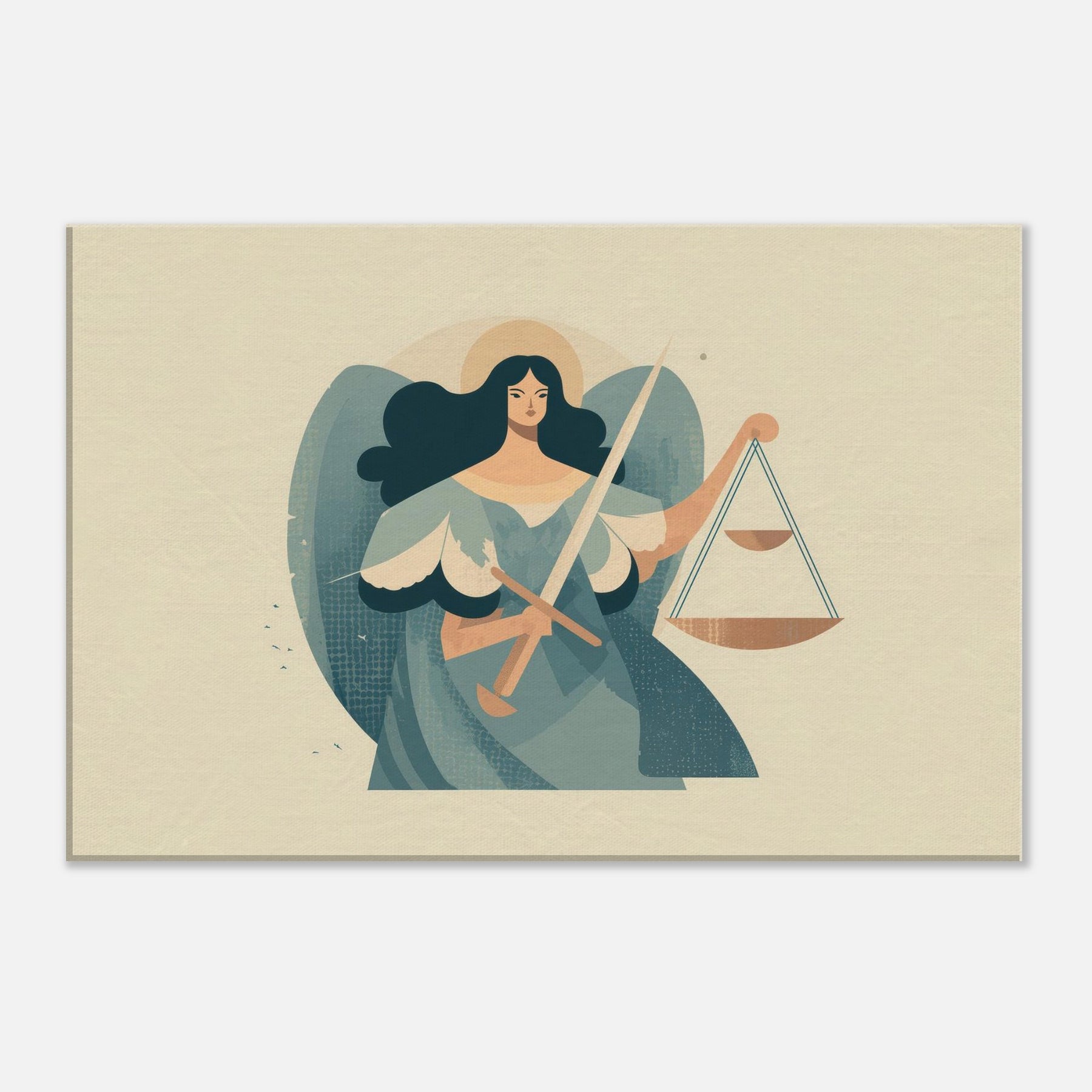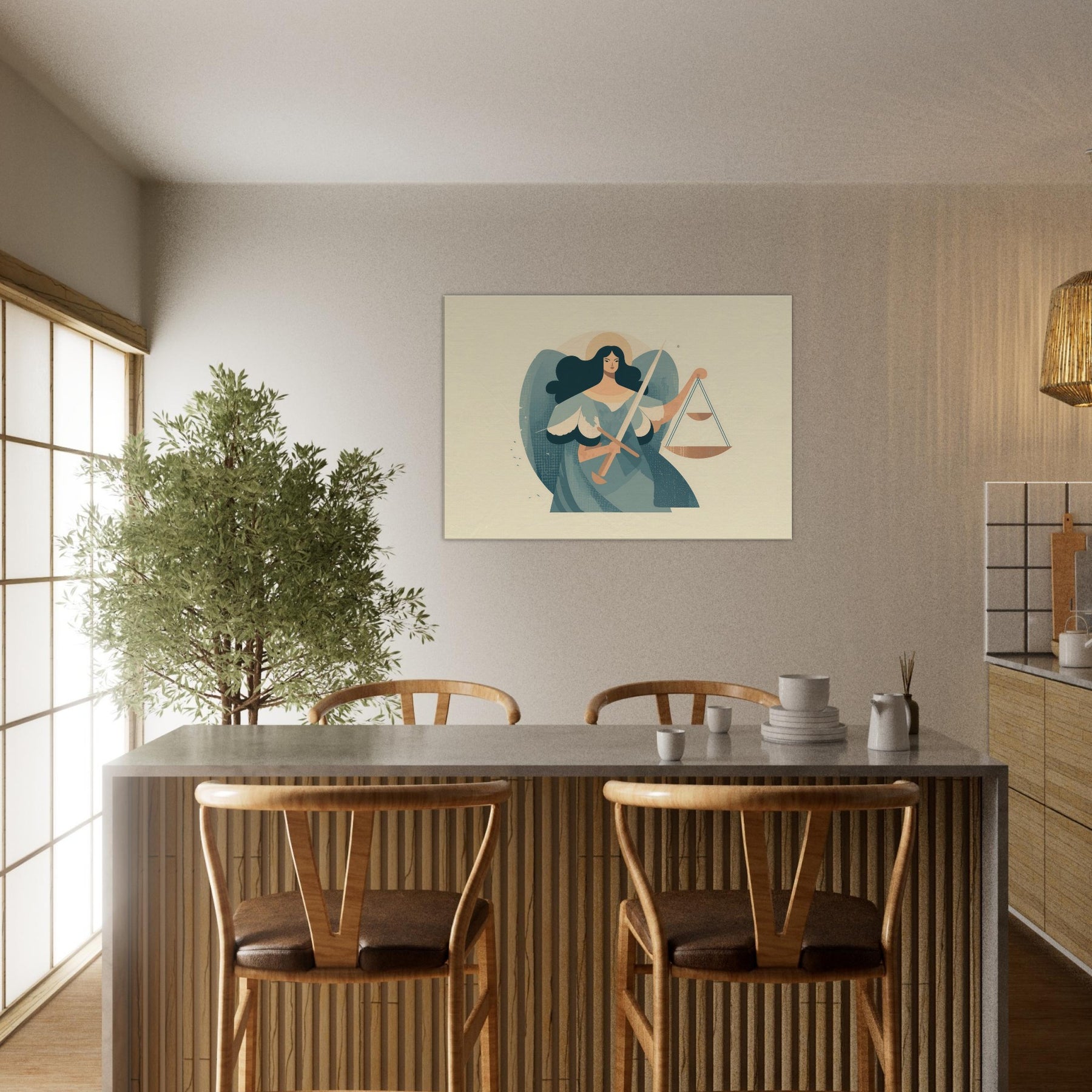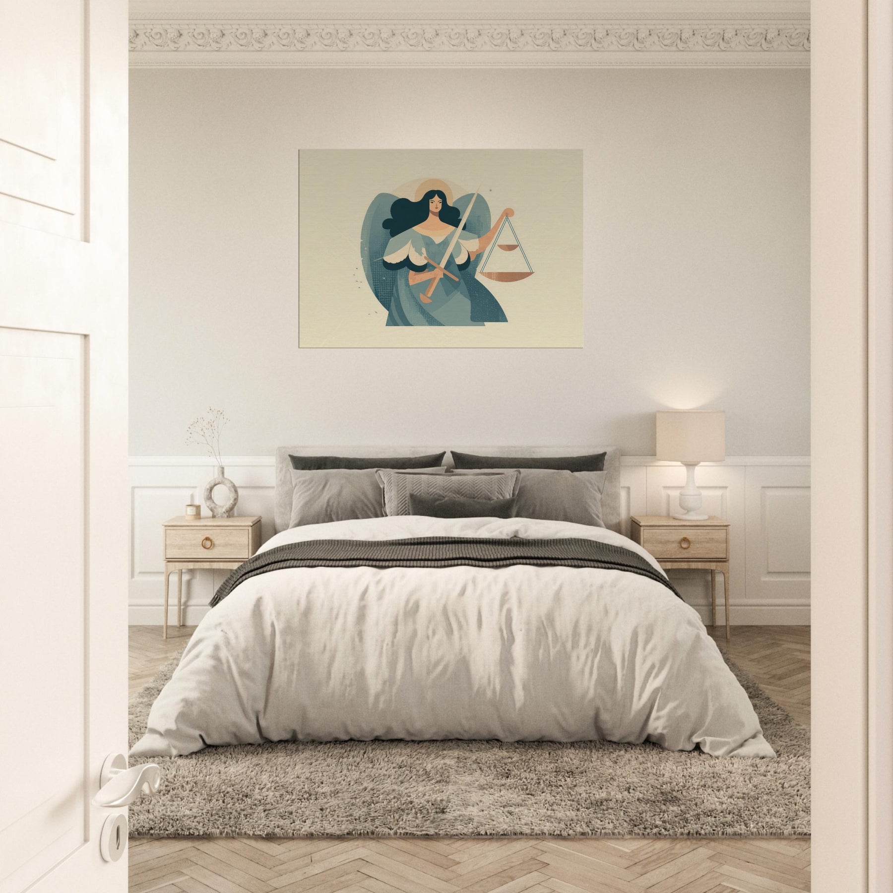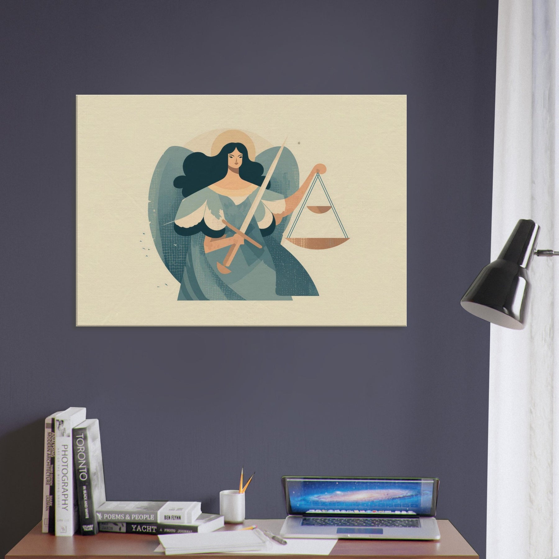 Let Archangel Michael guide your living space with quiet authority. This minimalist wall art distills a celestial figure into clean planes of color, where the sword and the scales hover like symbols of balance and courage. The restrained palette navy, teal, sand breathes calm into any room, inviting contemplation at dawn or dusk. Hang this piece in an entryway, living room, or study to evoke protection, clarity, and a serene, modern mystique. The central subject is Archangel Michael (Sword & Scales).