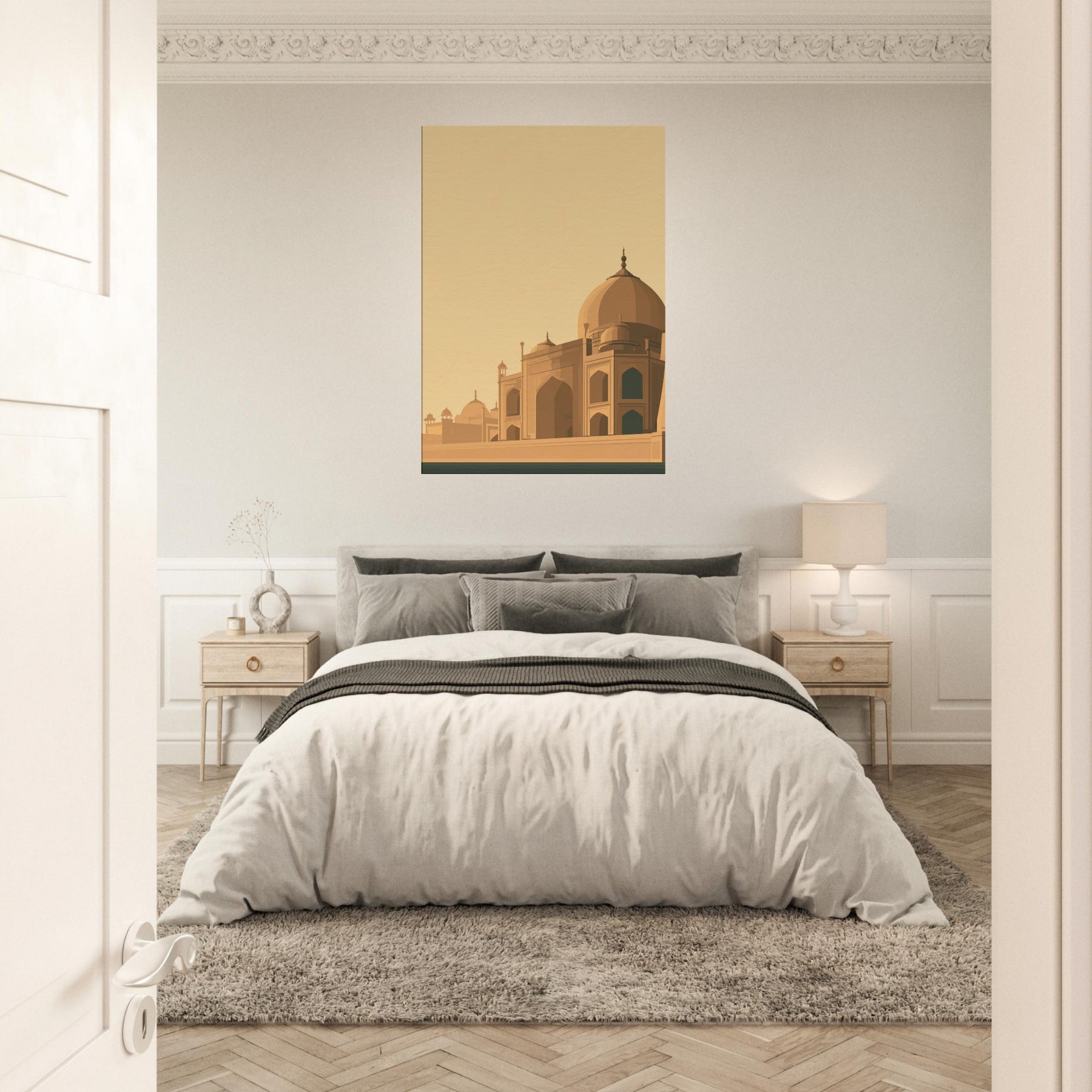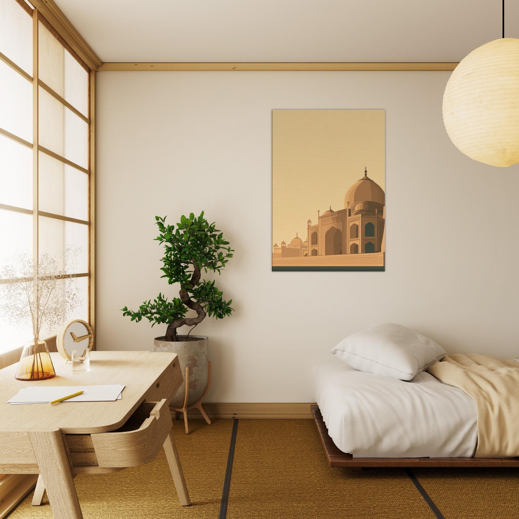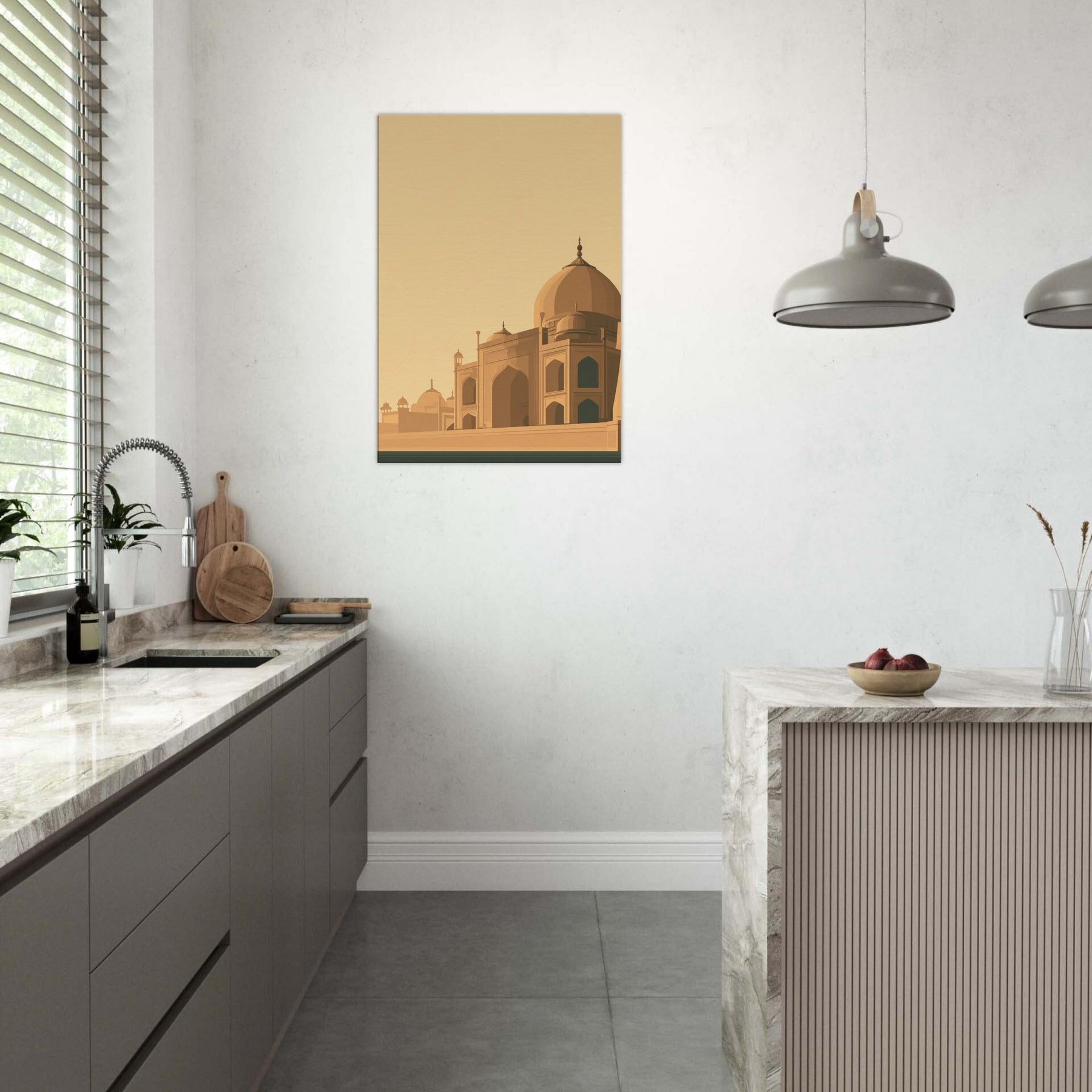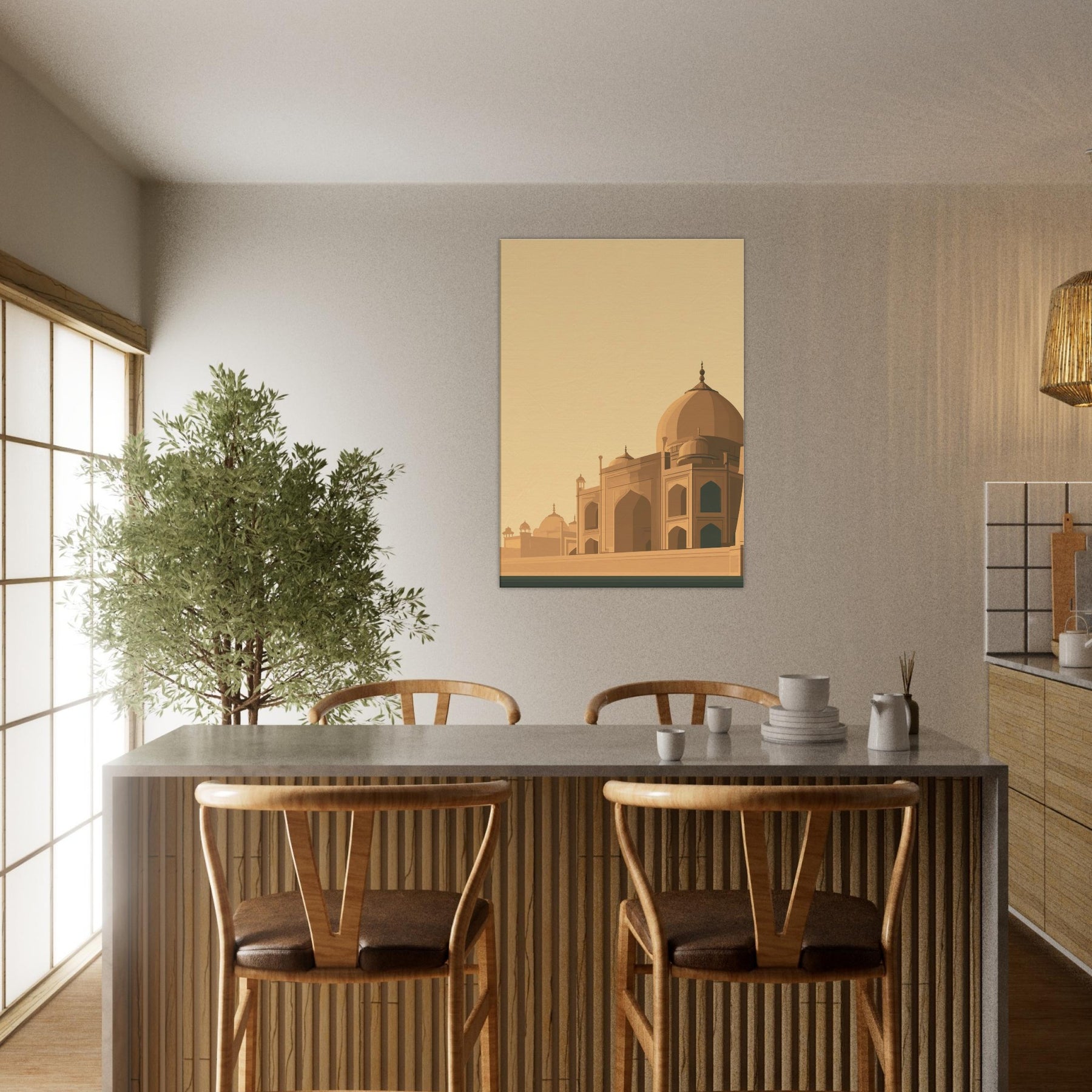 Elevate your space with the quiet grandeur of the Taj Mahal rendered in minimalist lines and warm amber tones. This artwork breathes calm into any room, its clean silhouette suggesting infinite arches and moonlit courtyards. The soft gradient of peach evokes sunrise over marble, inviting stillness, reflection, and a sense of spaciousness. Perfect above a sofa or in a study, it pairs with natural textures to create a timeless, serene focus.