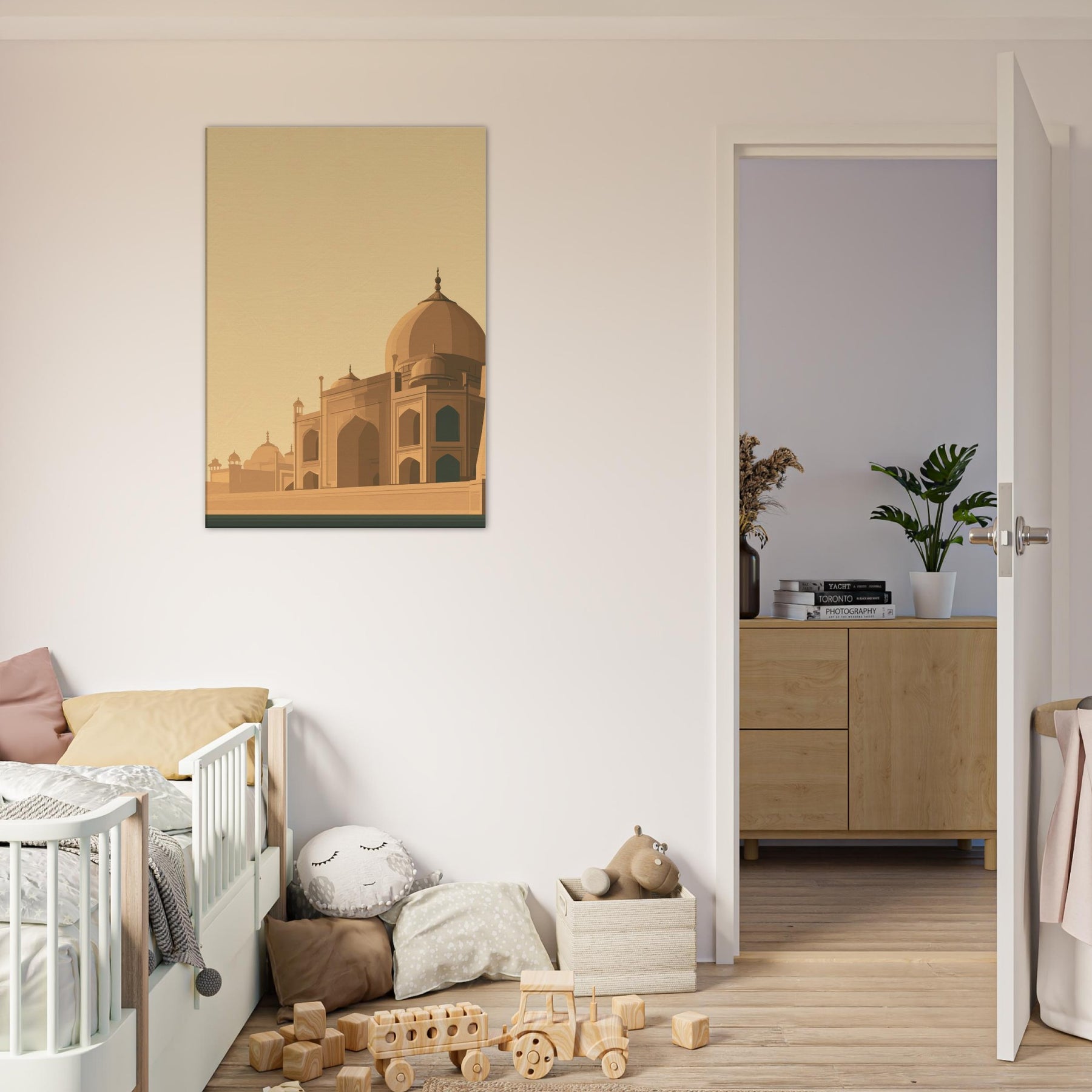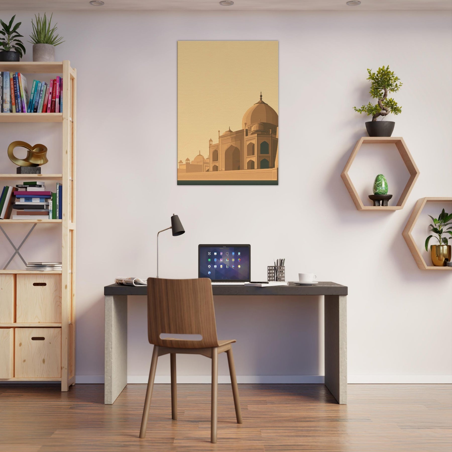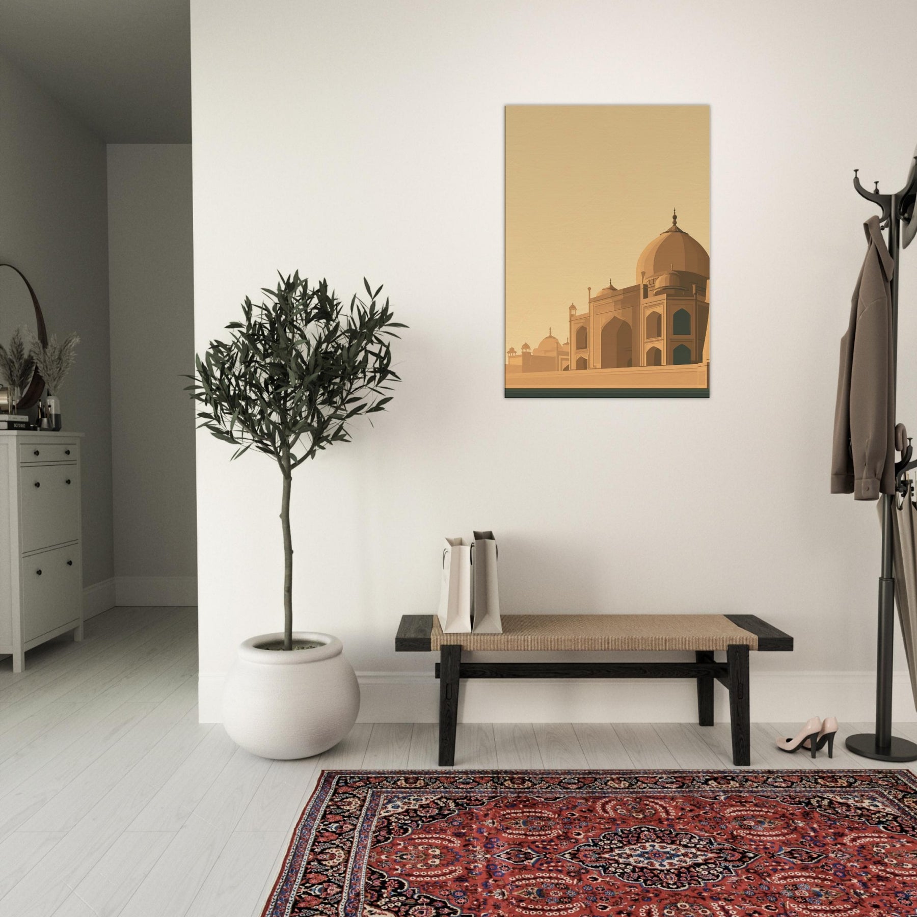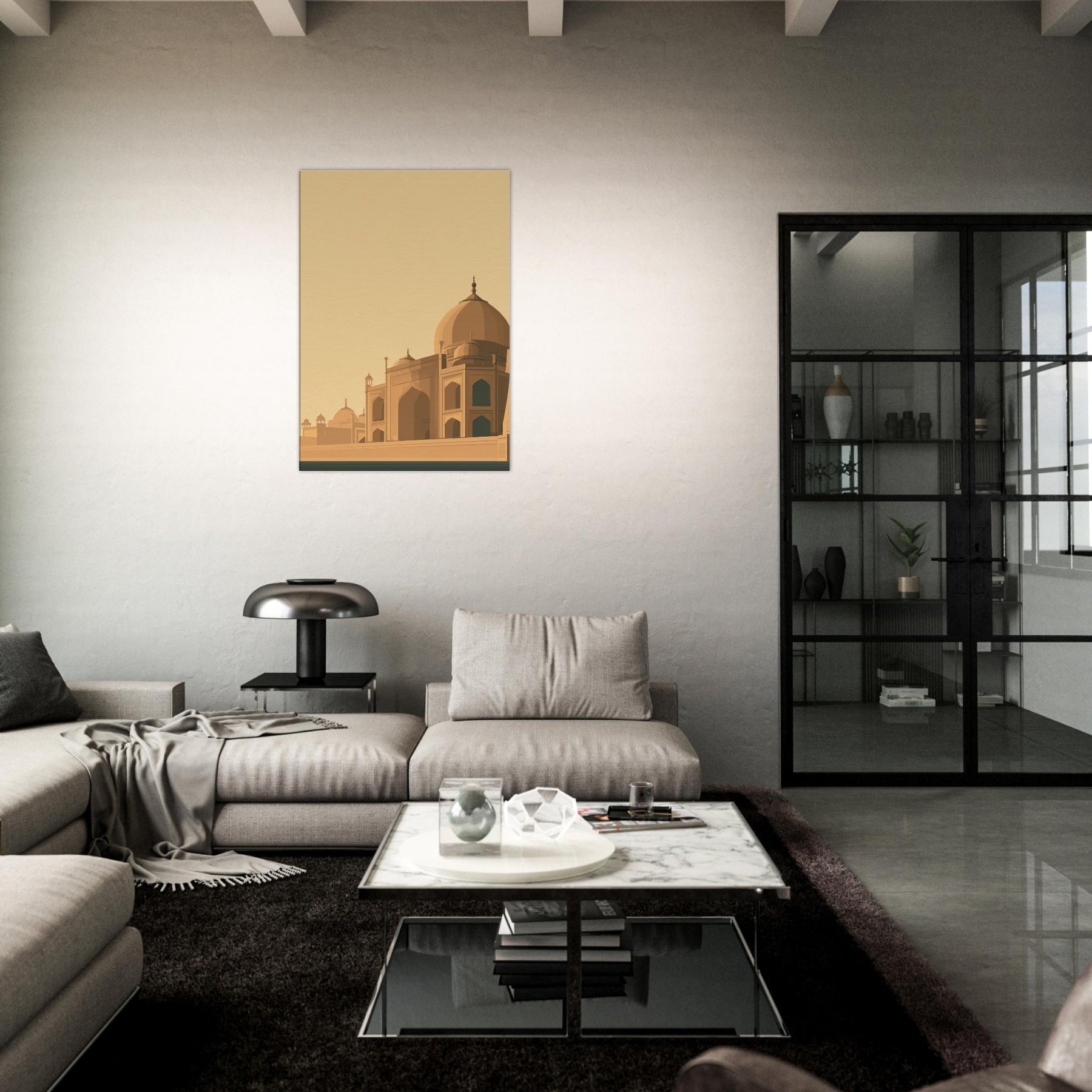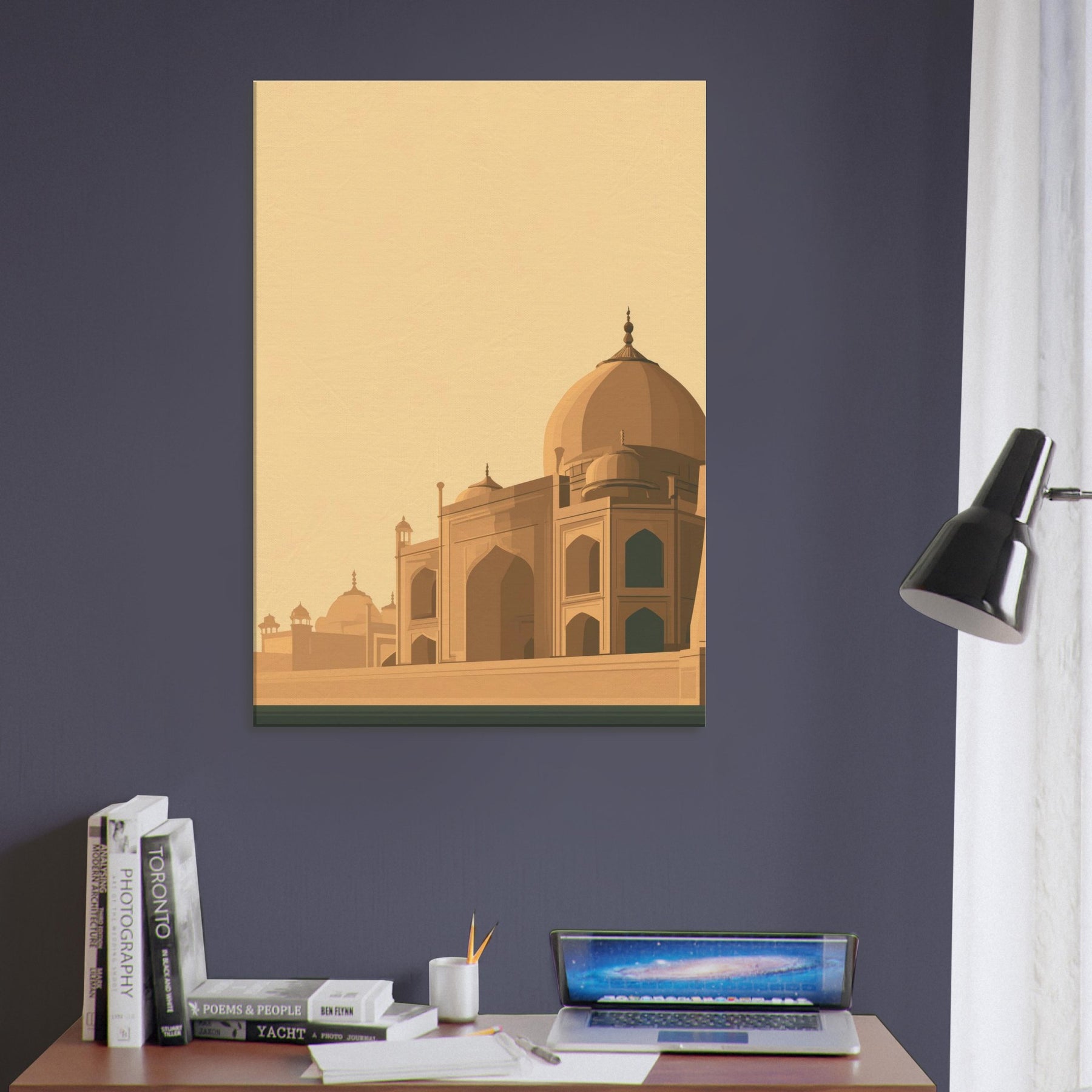 Elevate your space with the quiet grandeur of the Taj Mahal rendered in minimalist lines and warm amber tones. This artwork breathes calm into any room, its clean silhouette suggesting infinite arches and moonlit courtyards. The soft gradient of peach evokes sunrise over marble, inviting stillness, reflection, and a sense of spaciousness. Perfect above a sofa or in a study, it pairs with natural textures to create a timeless, serene focus.