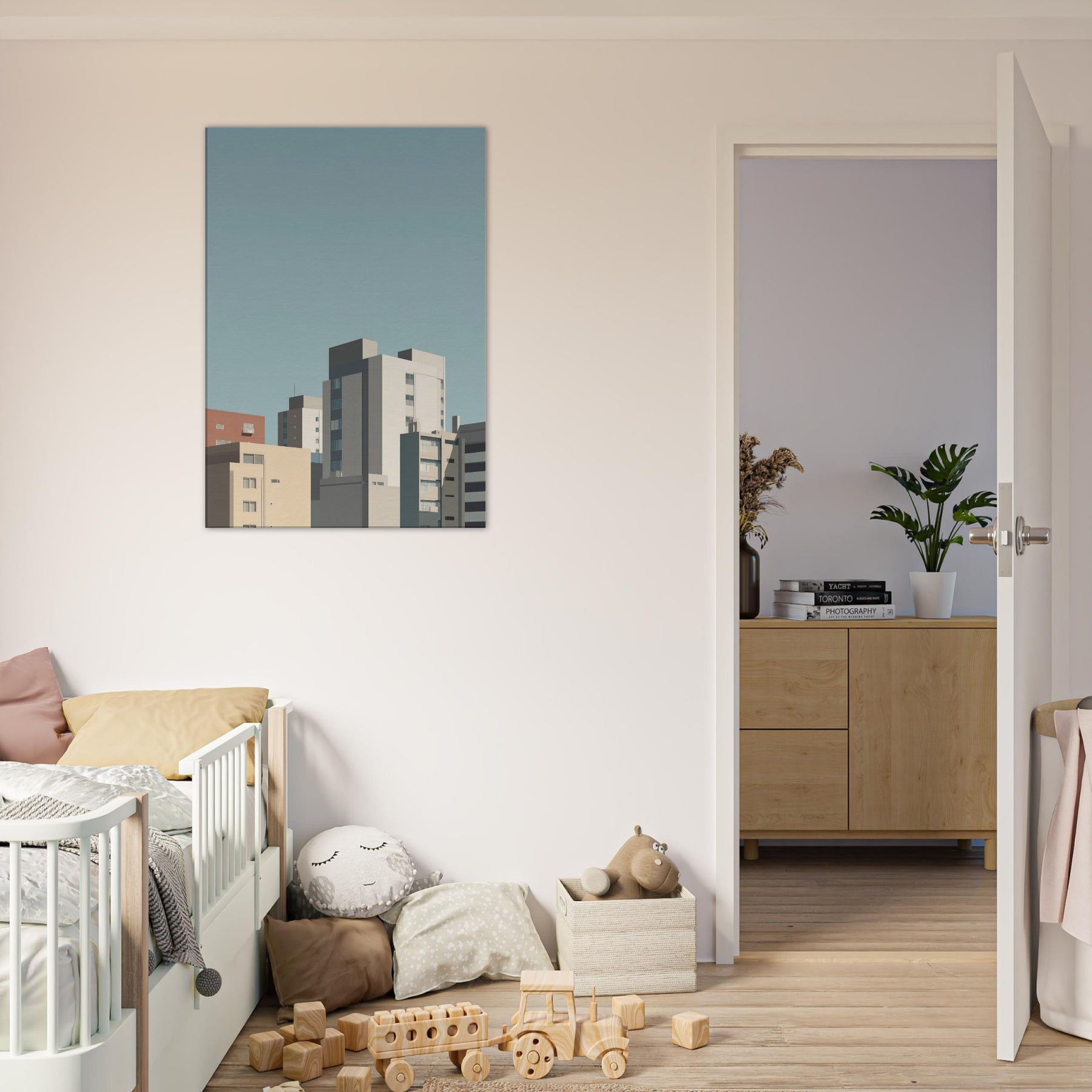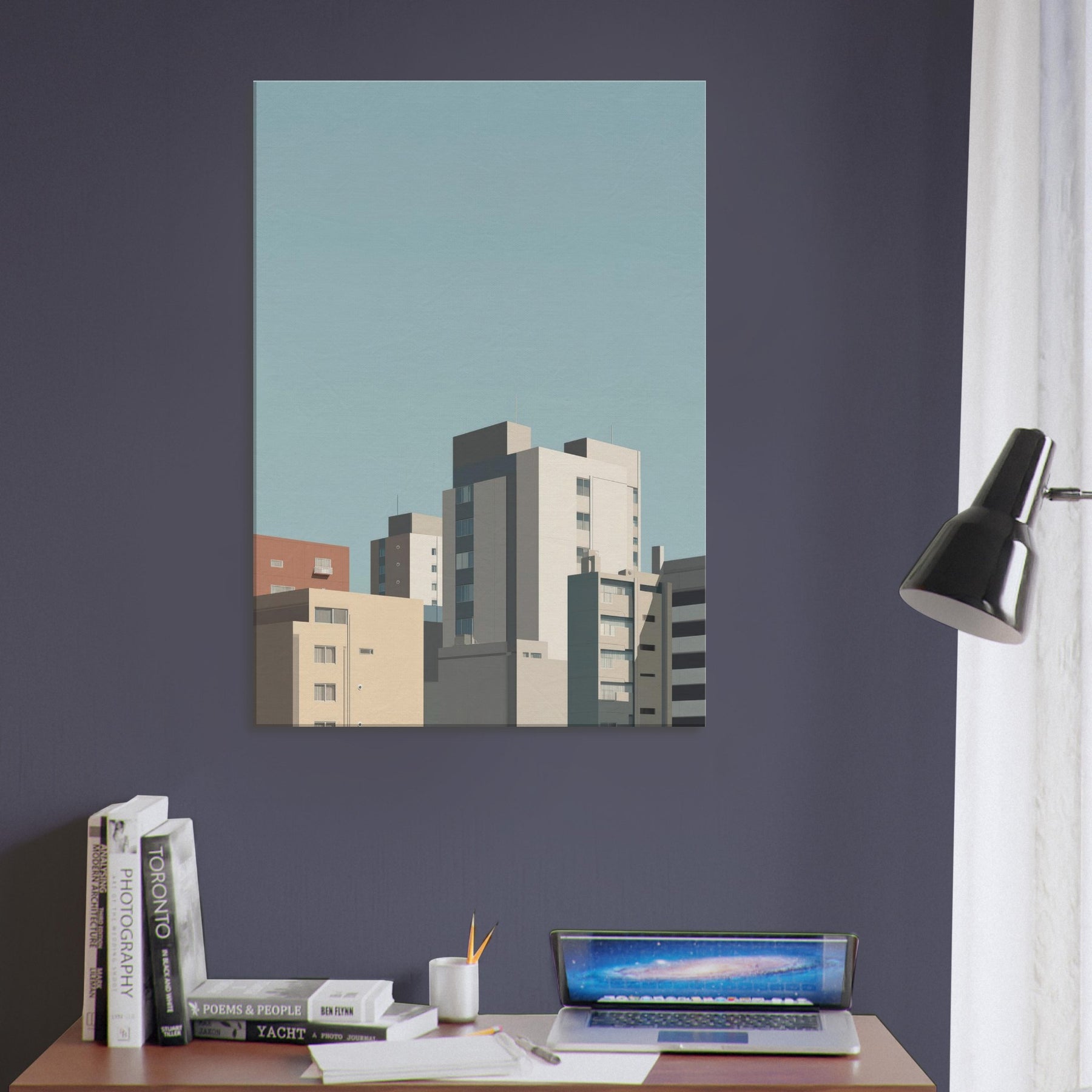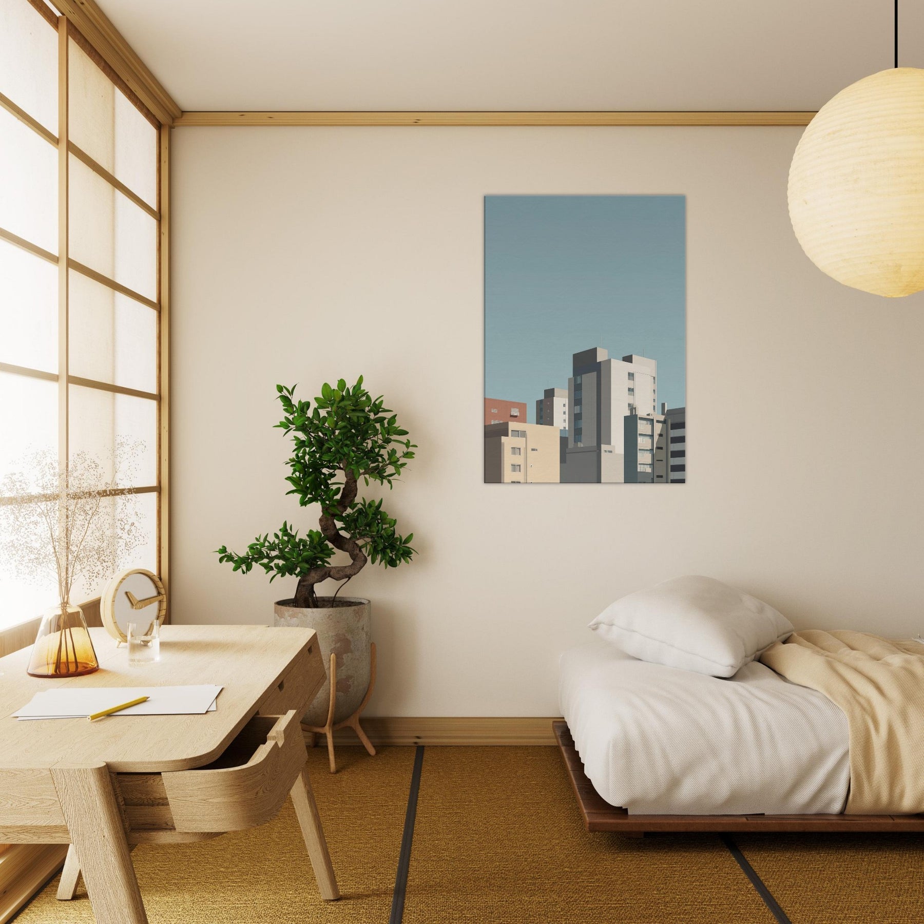 Tokyo unfolds in quiet geometry, where clean lines meet a softened horizon. This minimalist cityscape captures a moment of calm amid steel and glass, inviting light to pool along pale facades. The cool palette and simple forms create a tranquil atmosphere that enlarges a living room, pairs with neutral fabrics, and fosters focus in a busy home. Hang it above a sofa or desk to feel a gentle urban breath without distraction.