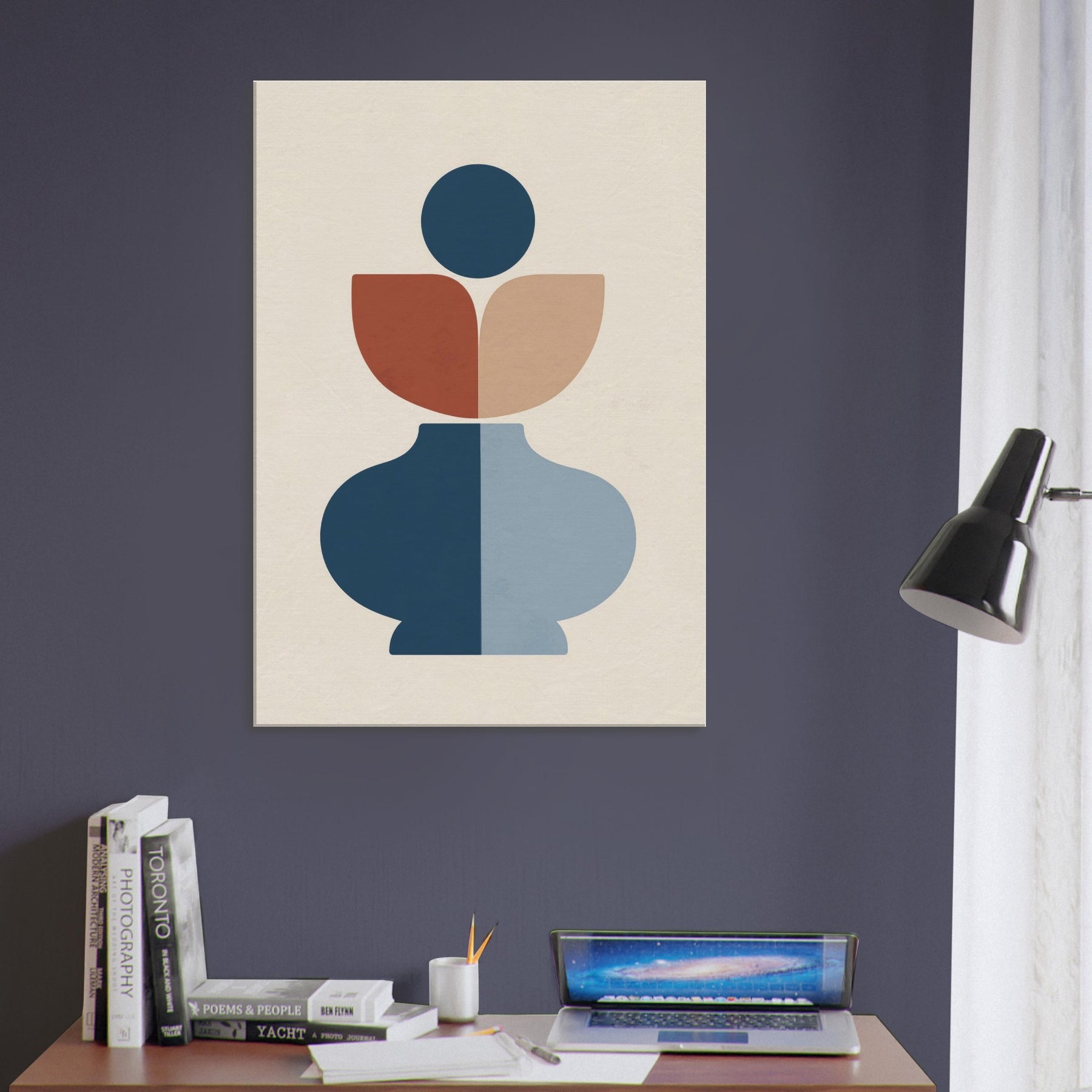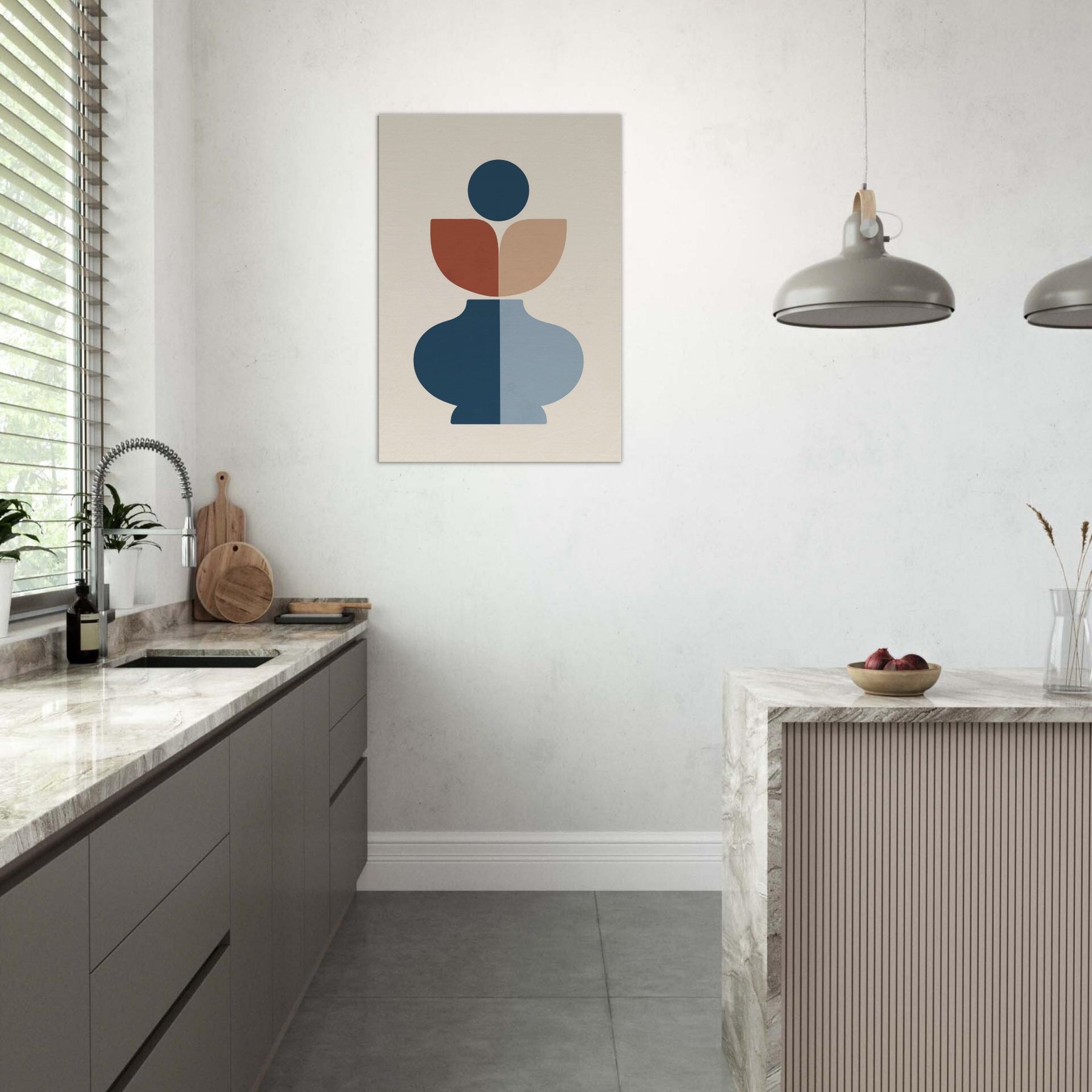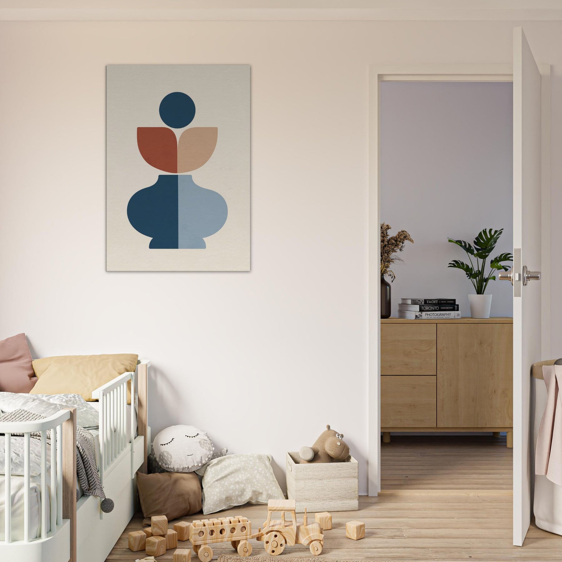 Mysterious yet comforting, this Totem rises as a quiet mystical ritual for the modern home. Minimalist shapes in a hushed palette of blue, rust, and cream gather into a balanced form, inviting stillness and reflection. The composition glows softly, catching ambient light to create depth and serenity in any living space. It pairs effortlessly with warm woods and soft textiles, turning an empty wall into a sanctuary where conversation and calm can breathe.