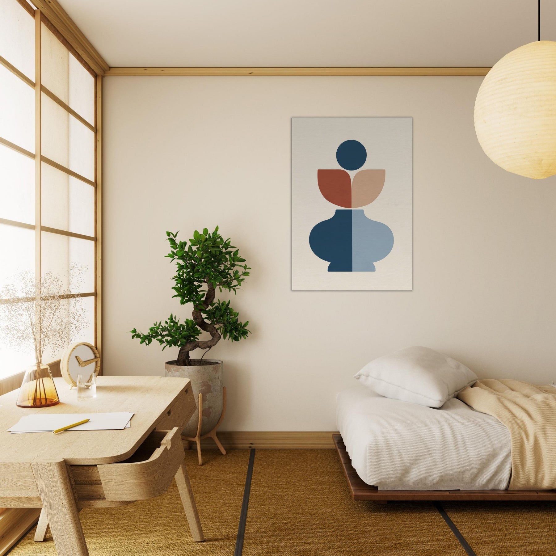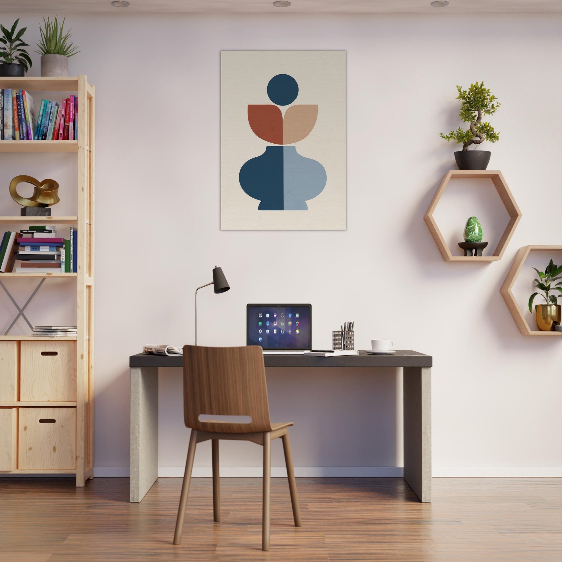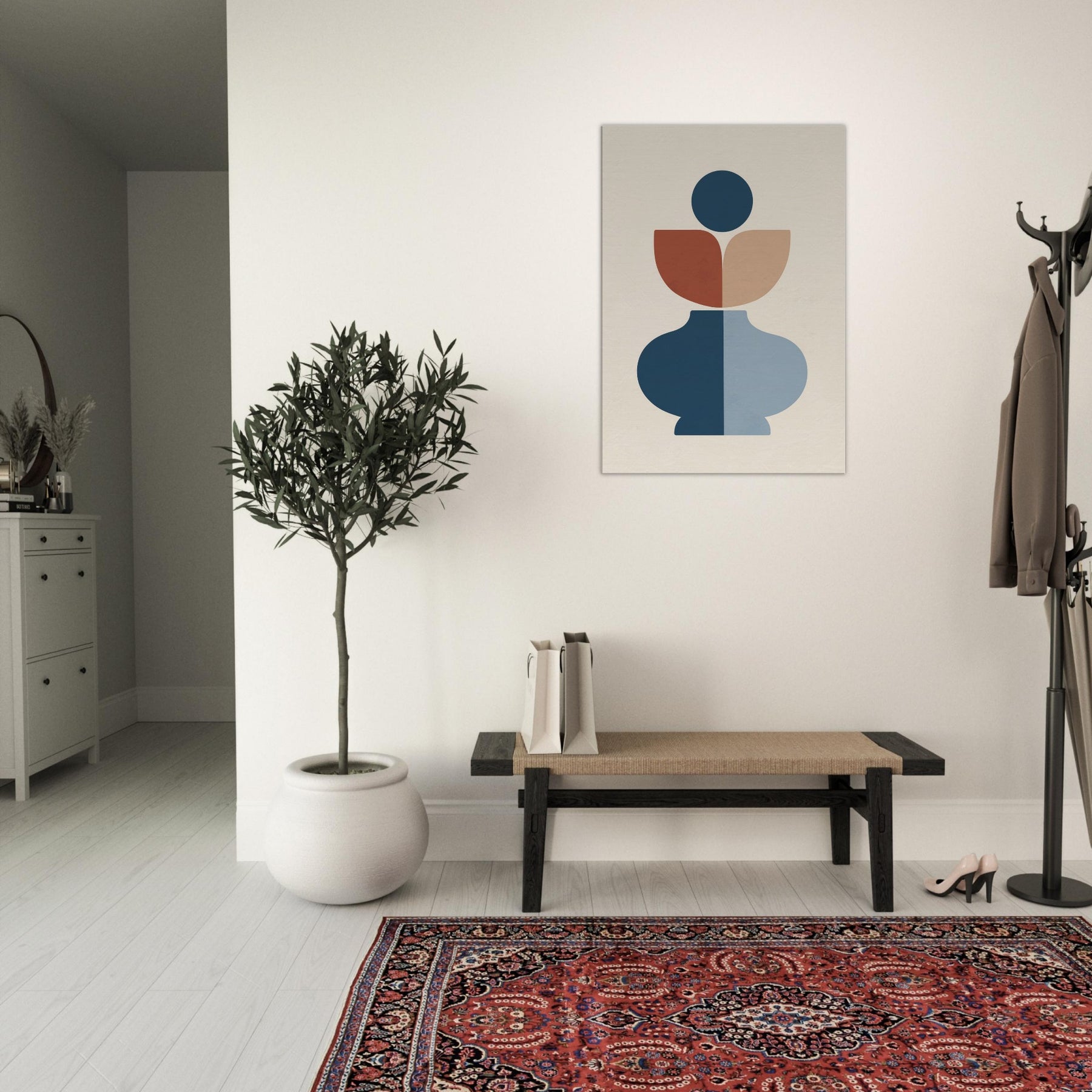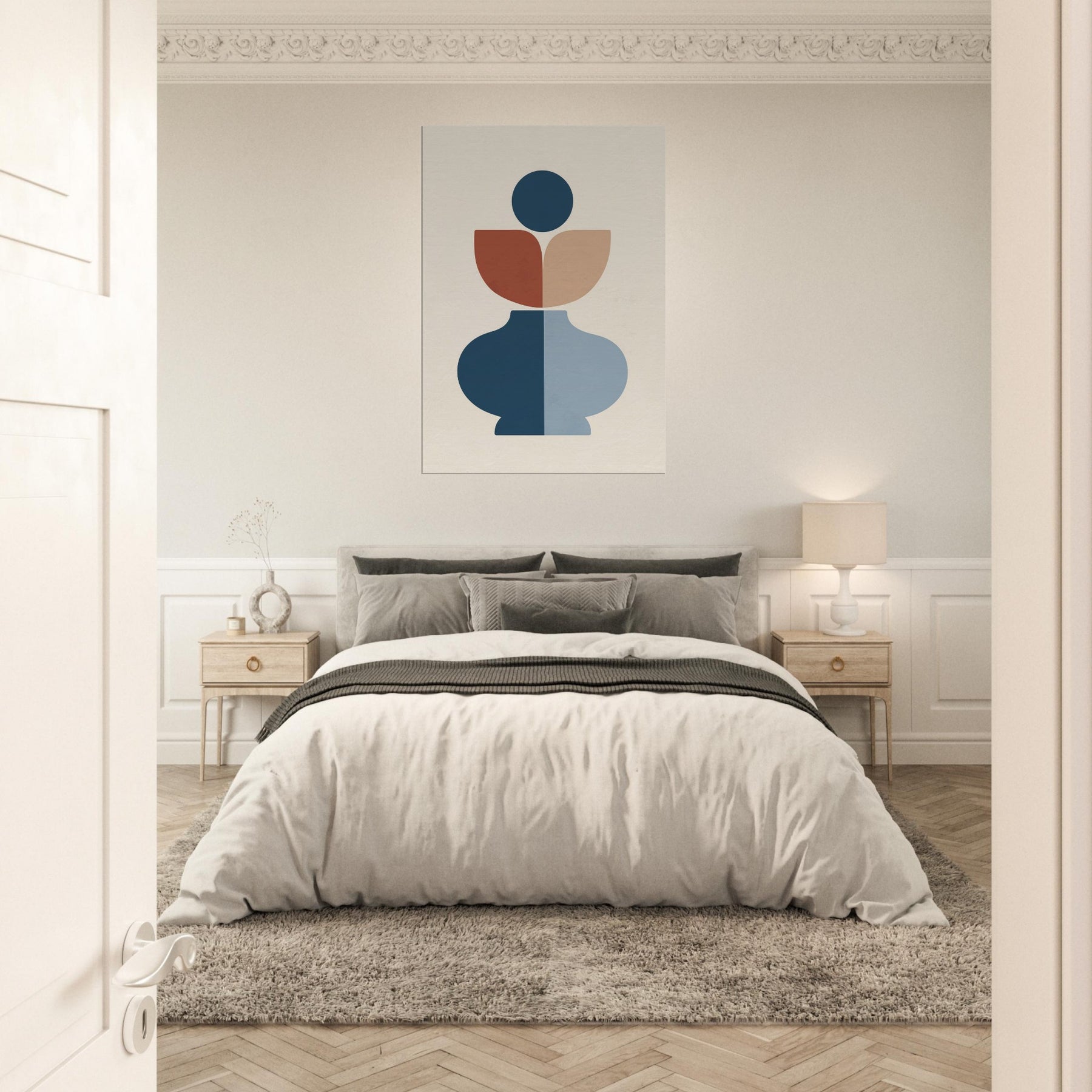 Mysterious yet comforting, this Totem rises as a quiet mystical ritual for the modern home. Minimalist shapes in a hushed palette of blue, rust, and cream gather into a balanced form, inviting stillness and reflection. The composition glows softly, catching ambient light to create depth and serenity in any living space. It pairs effortlessly with warm woods and soft textiles, turning an empty wall into a sanctuary where conversation and calm can breathe.