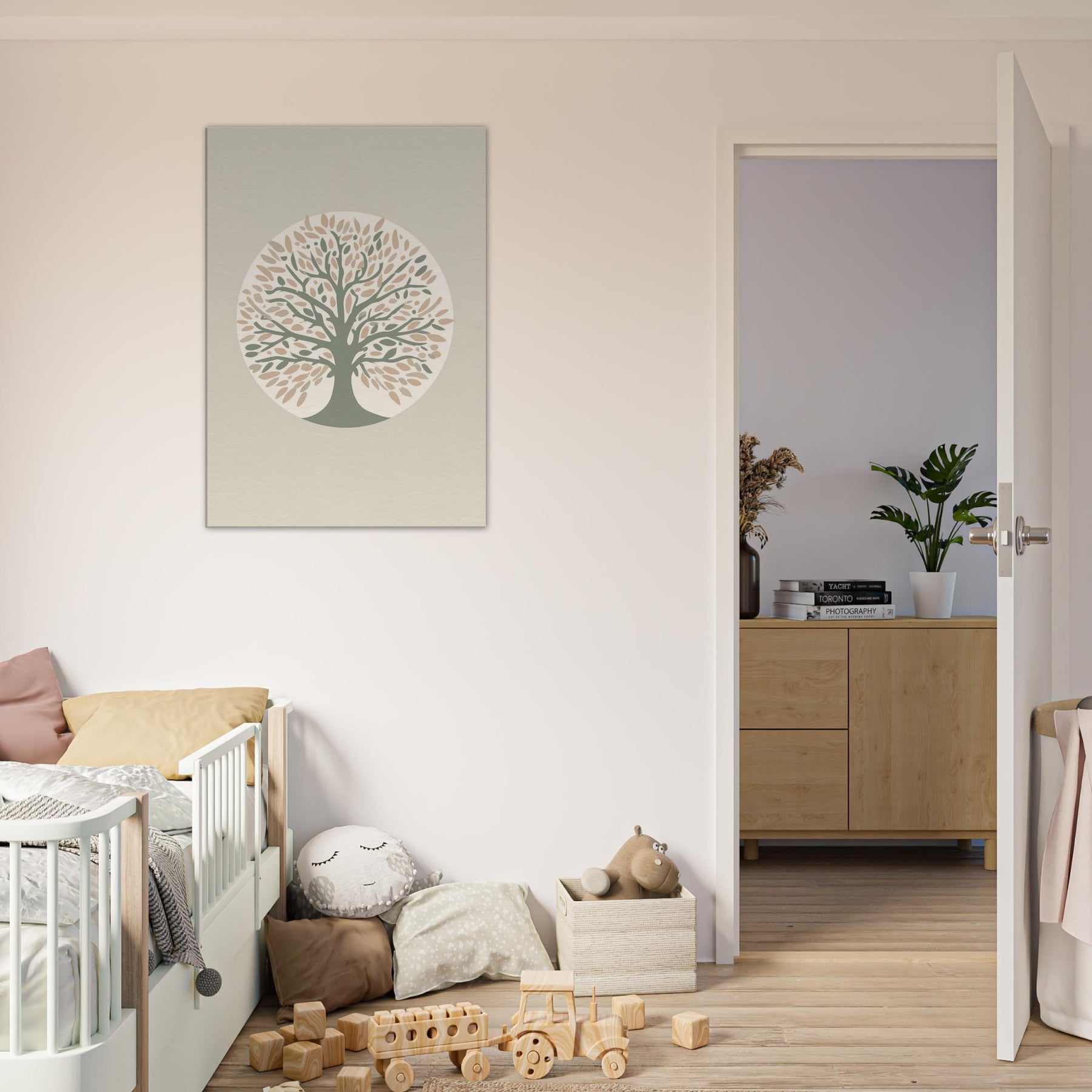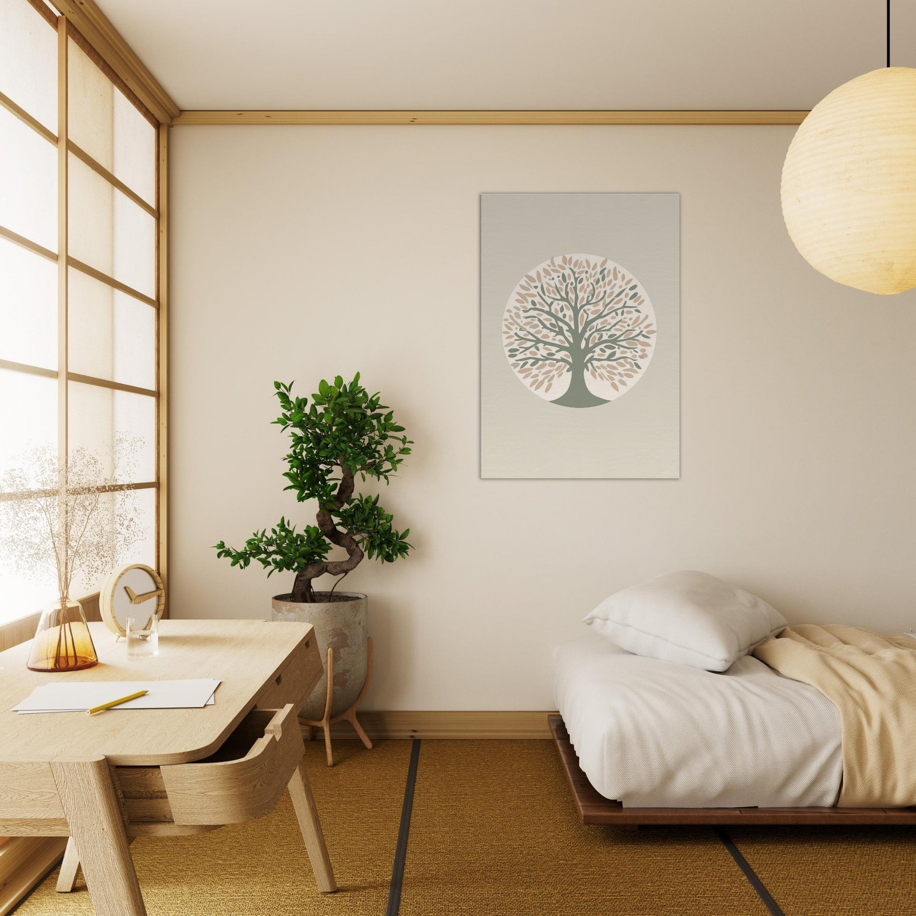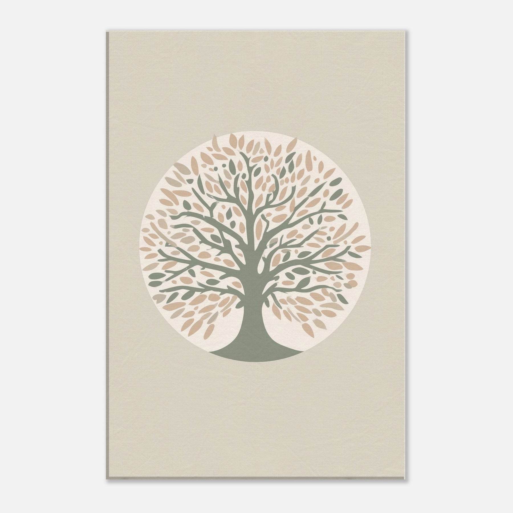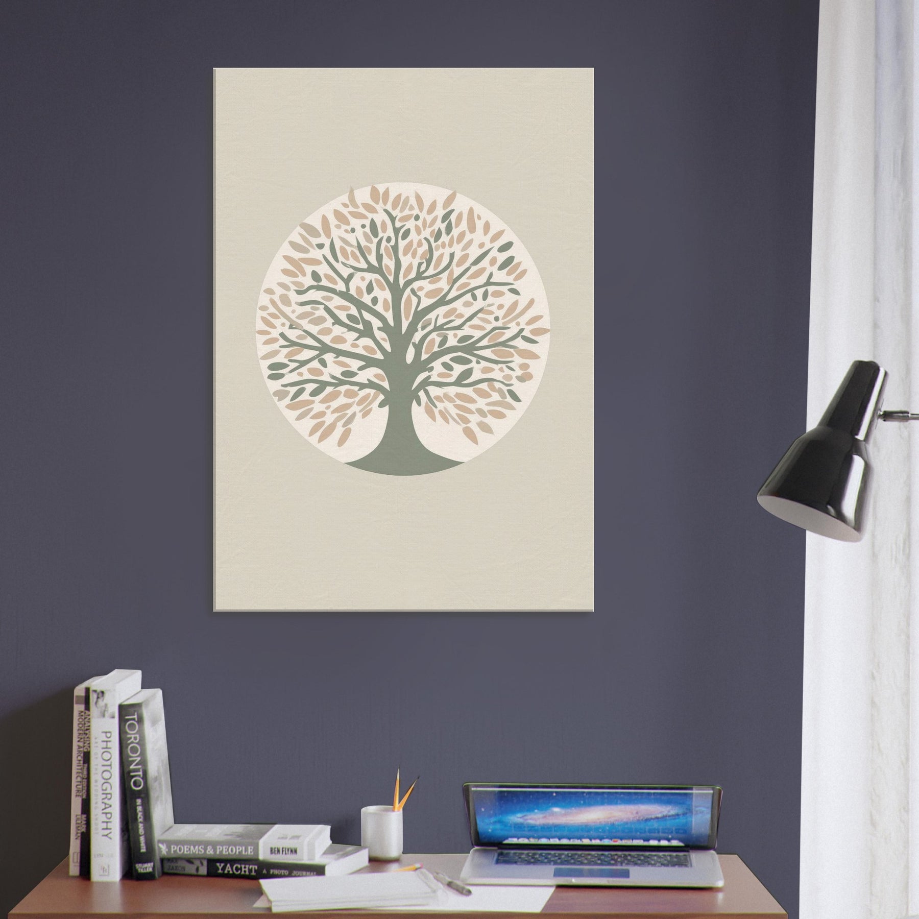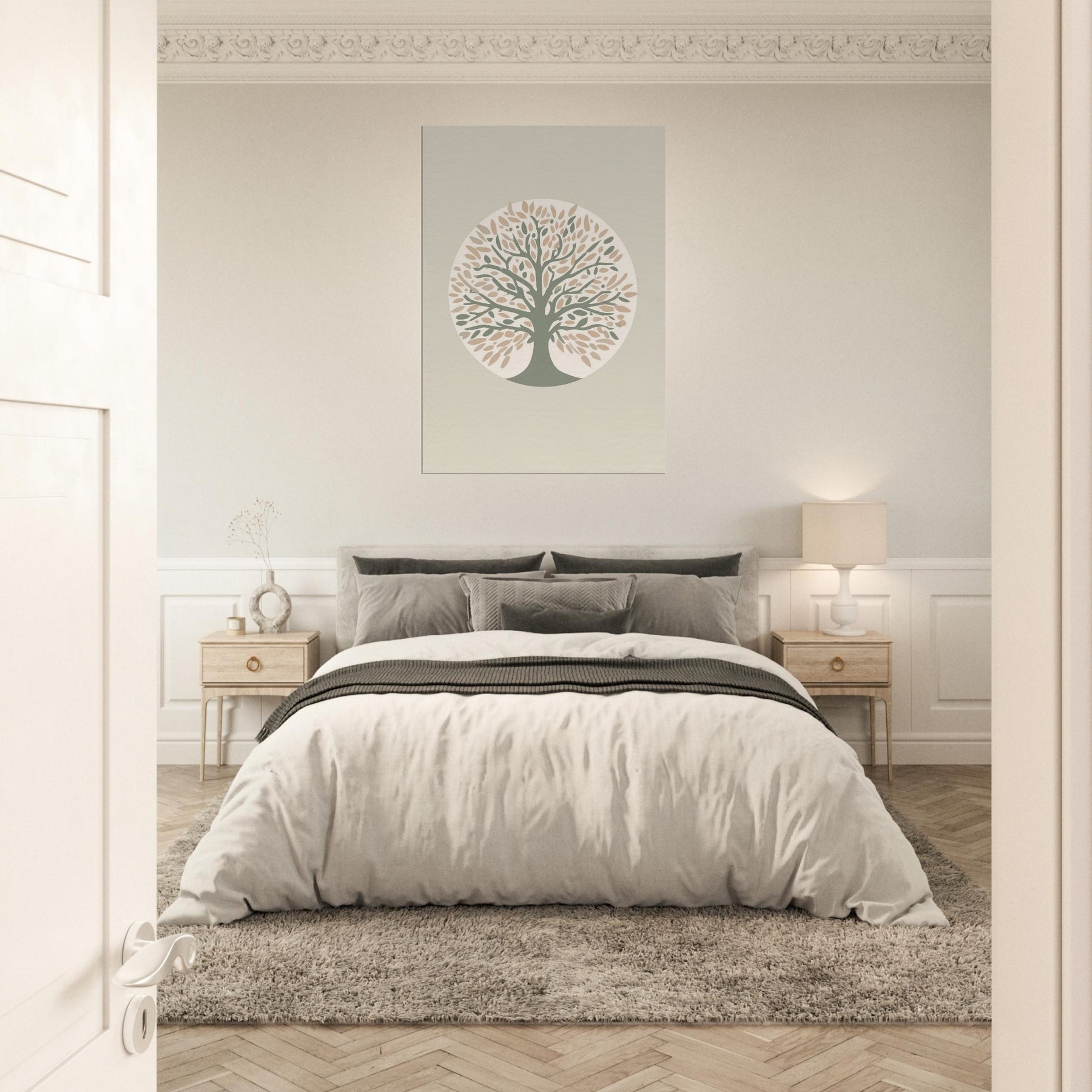 Rendered in clean lines, this Tree of Life invites quiet reflection. The minimalist circle cradles a graceful tree in muted greens and warm beige, a mystic emblem that softens modern interiors with presence rather than flourish. Its open canopy suggests connection and renewal, while the restrained palette lets light breathe across walls. Hang it where you seek calm above a sofa, in a reading nook, or at the entry and let the art slow the day, turning any room into a tranquil sanctuary.