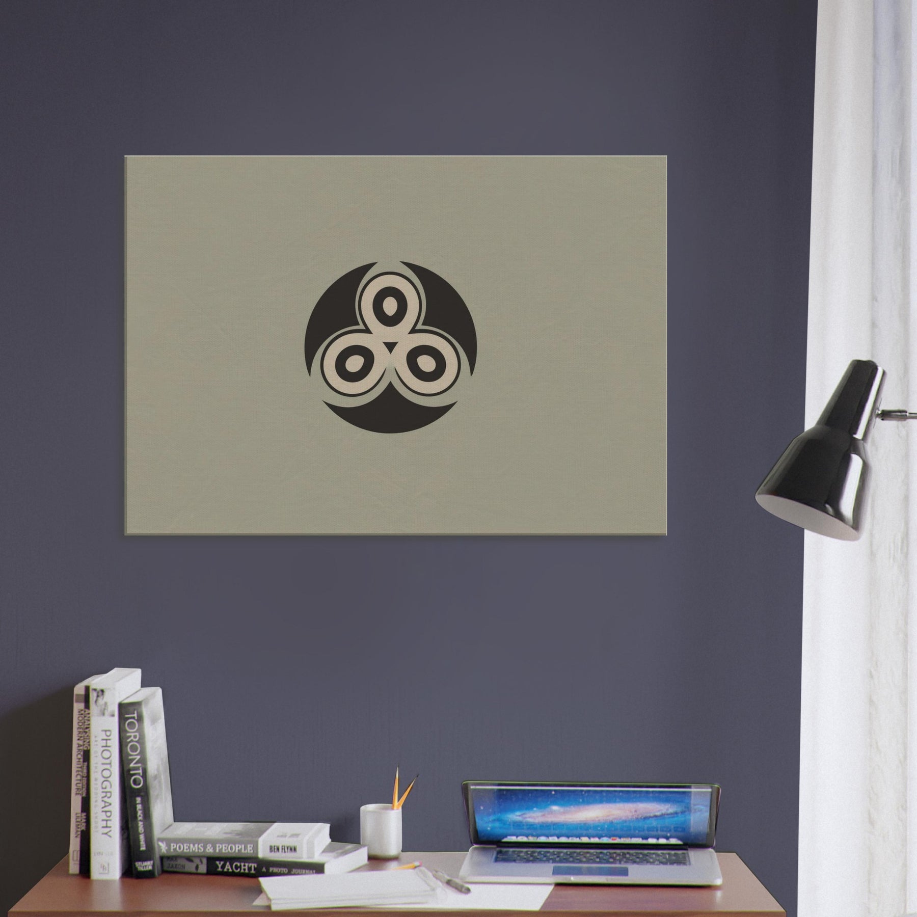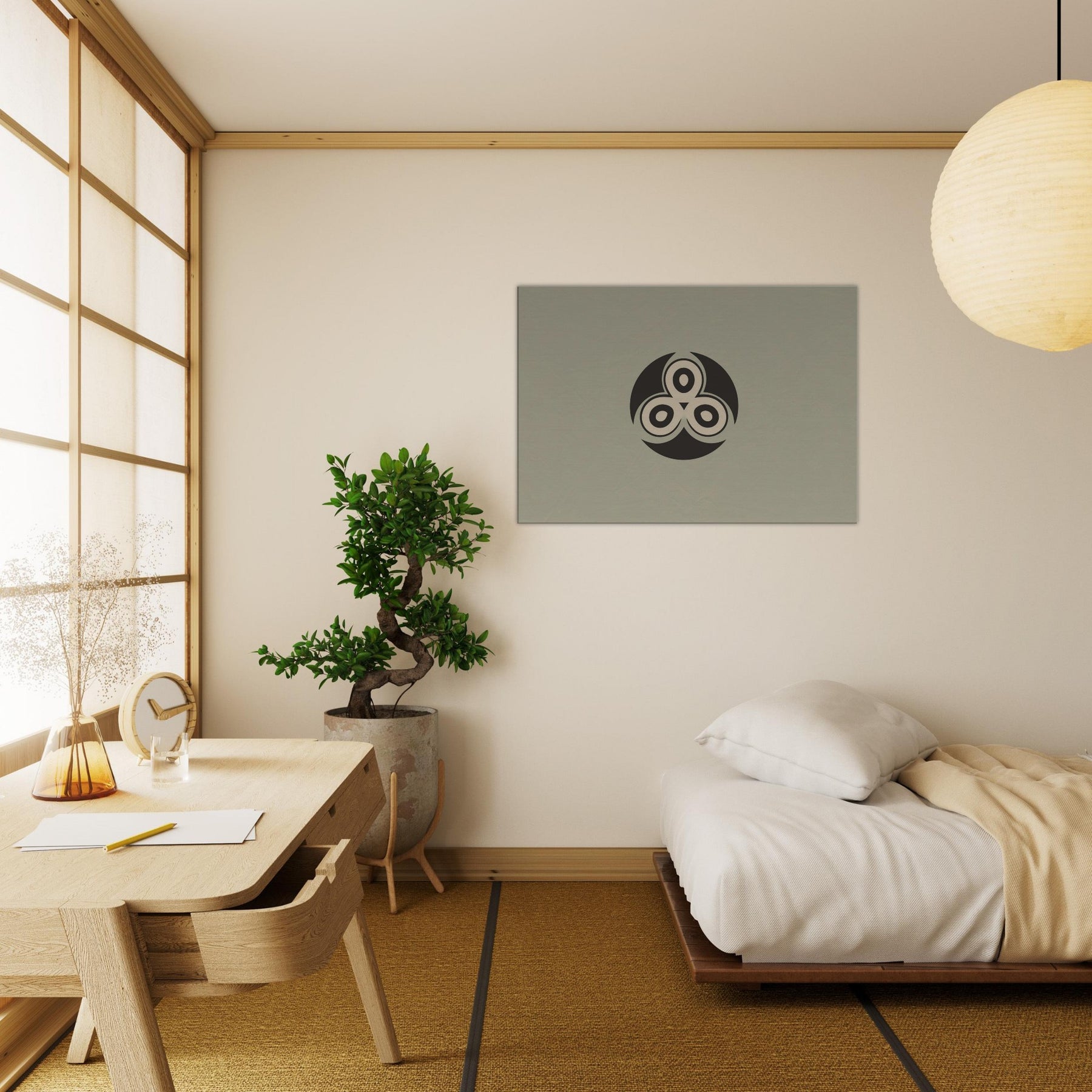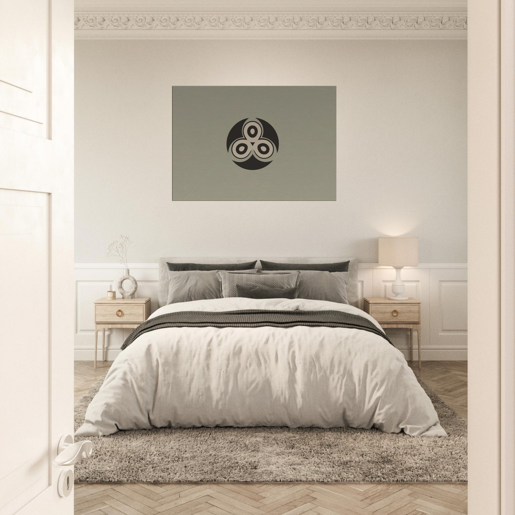Triskelion rises from a quiet field of muted taupe, a minimalist emblem that feels ancient and new at once. The Triskelion’s three interlocking curves breathe rhythm into the room, casting a soft balance between shadow and light. Its restrained geometry invites quiet reflection, turning blank walls into a sanctuary of focus. With its timeless, mystical presence, this print pours calm into living spaces, pairing perfectly with warm woods or cool neutrals and transforming everyday corners into contemplative havens.