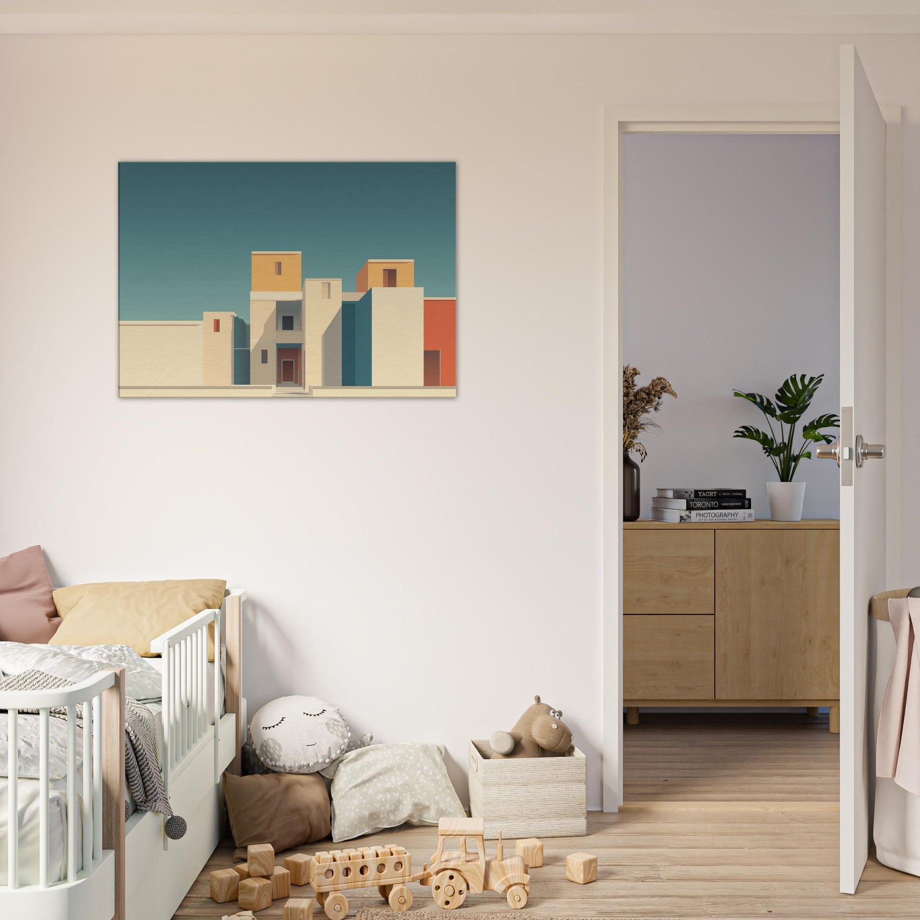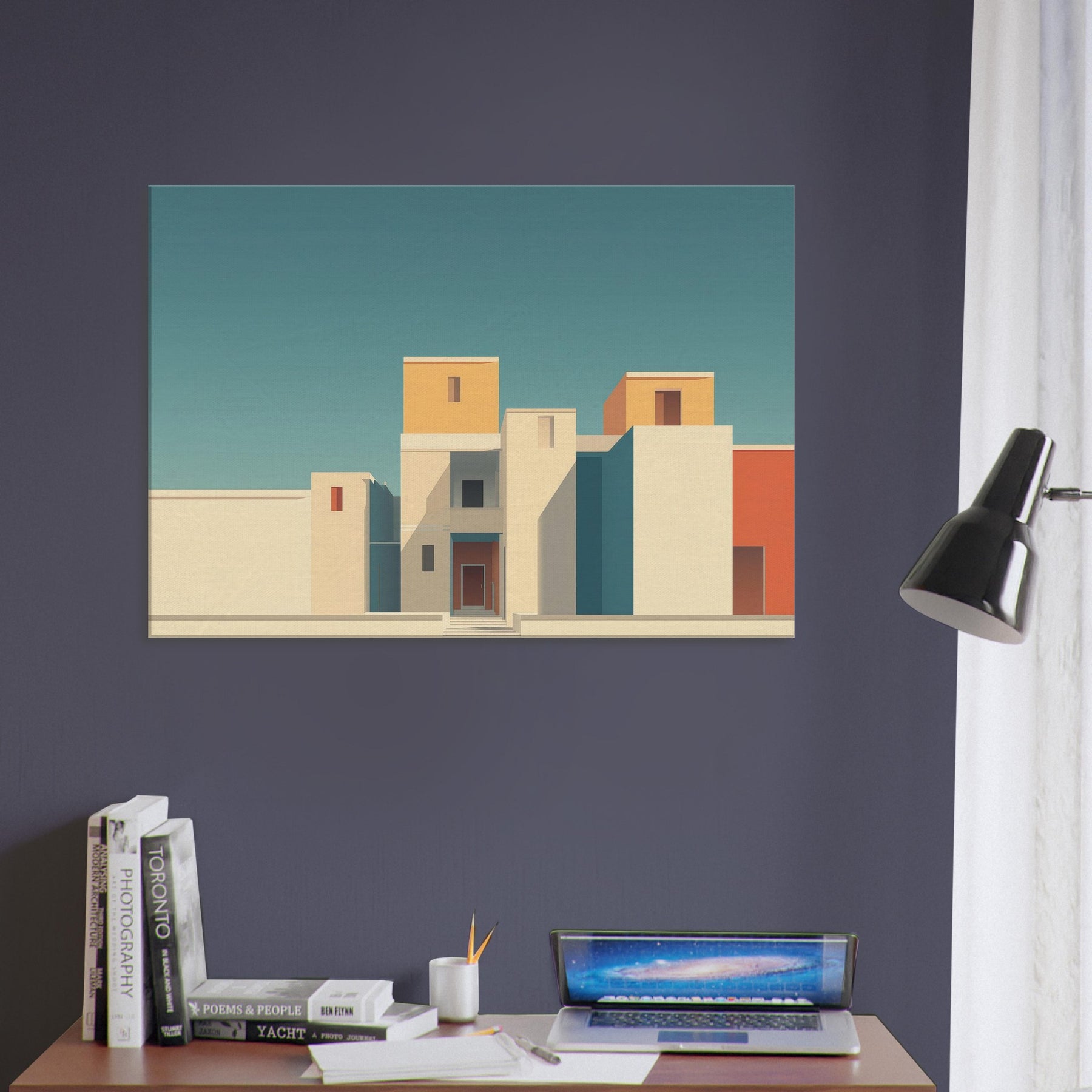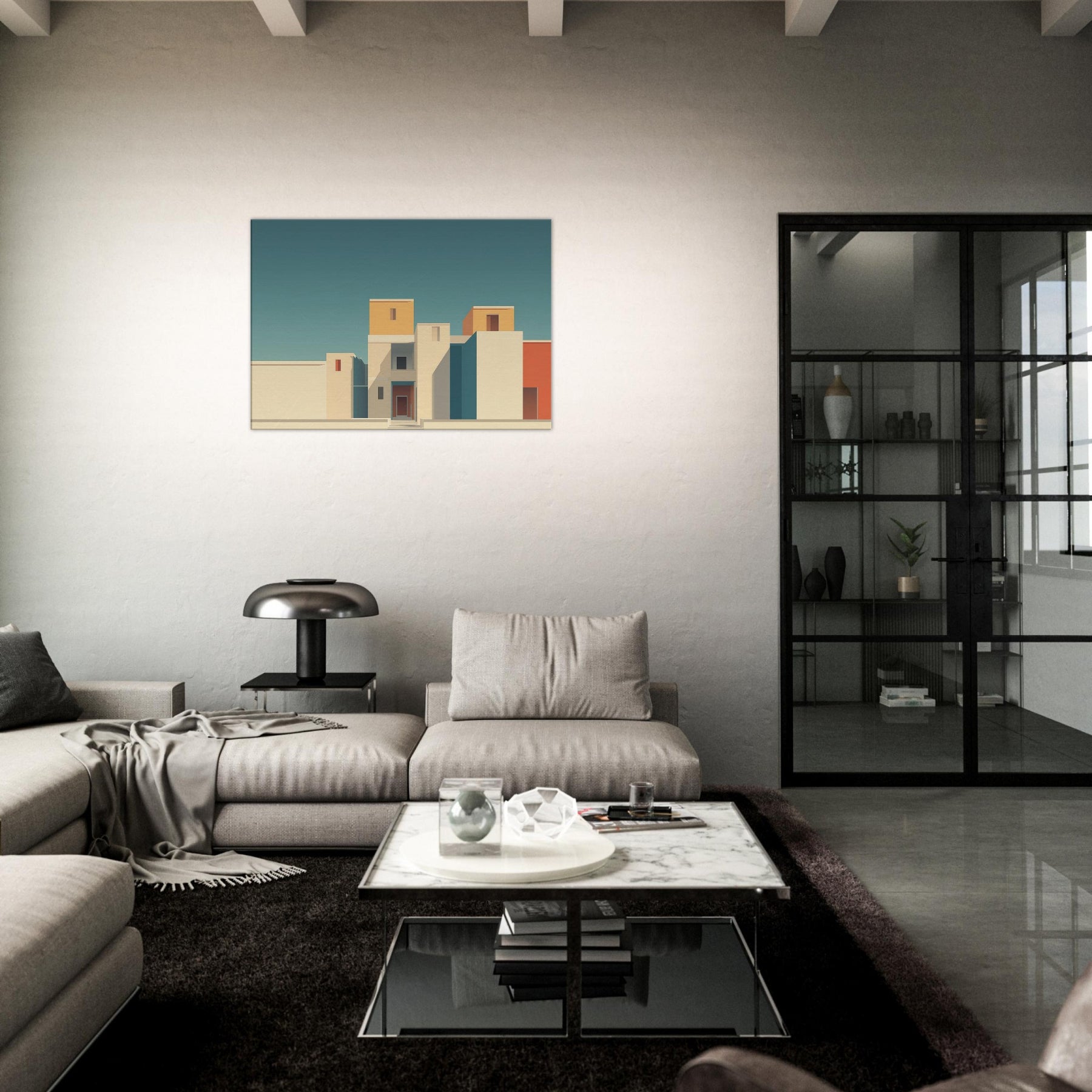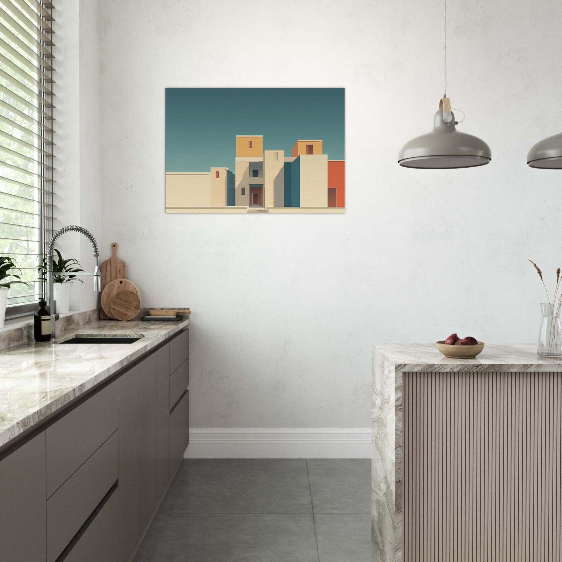 Venice Horizon distills the city's quiet grandeur into crisp, sunlit blocks. The minimalist composition layers pale creams, ochres, and teal against a gradient sky, evoking canals and cloisters without clutter. This piece brings a serene architectural hush to a living space, inviting the eye to glide along clean lines and soft shadows. Perfect above a sofa or in a reading nook, it infuses rooms with the timeless romance and restrained elegance of Venice.
