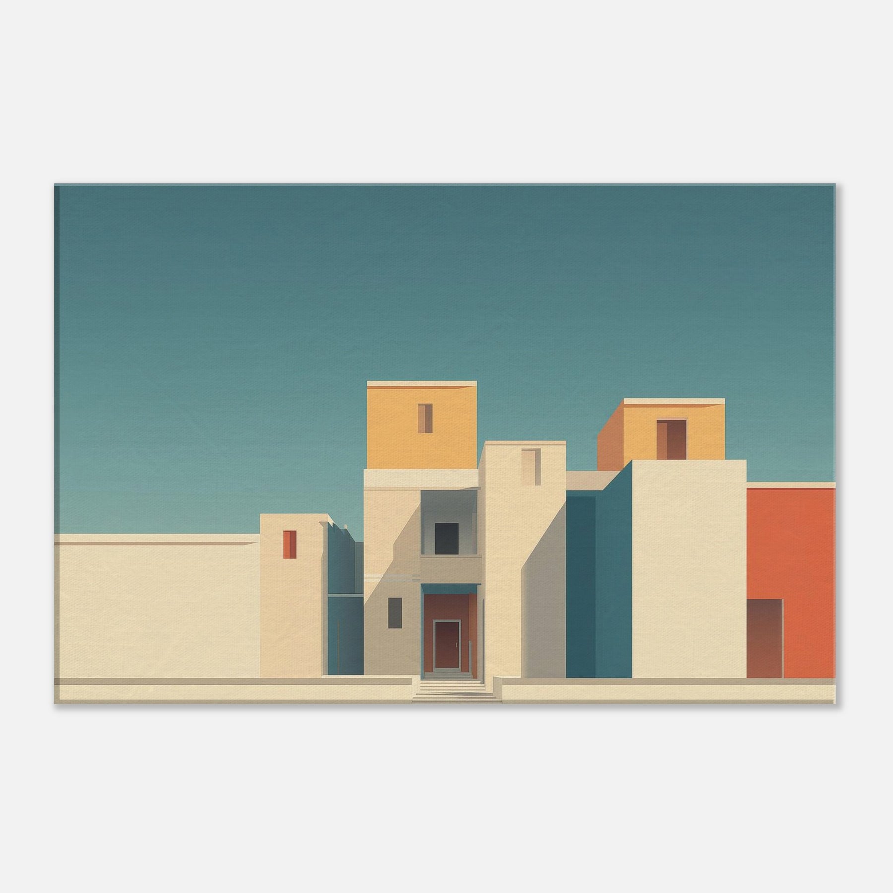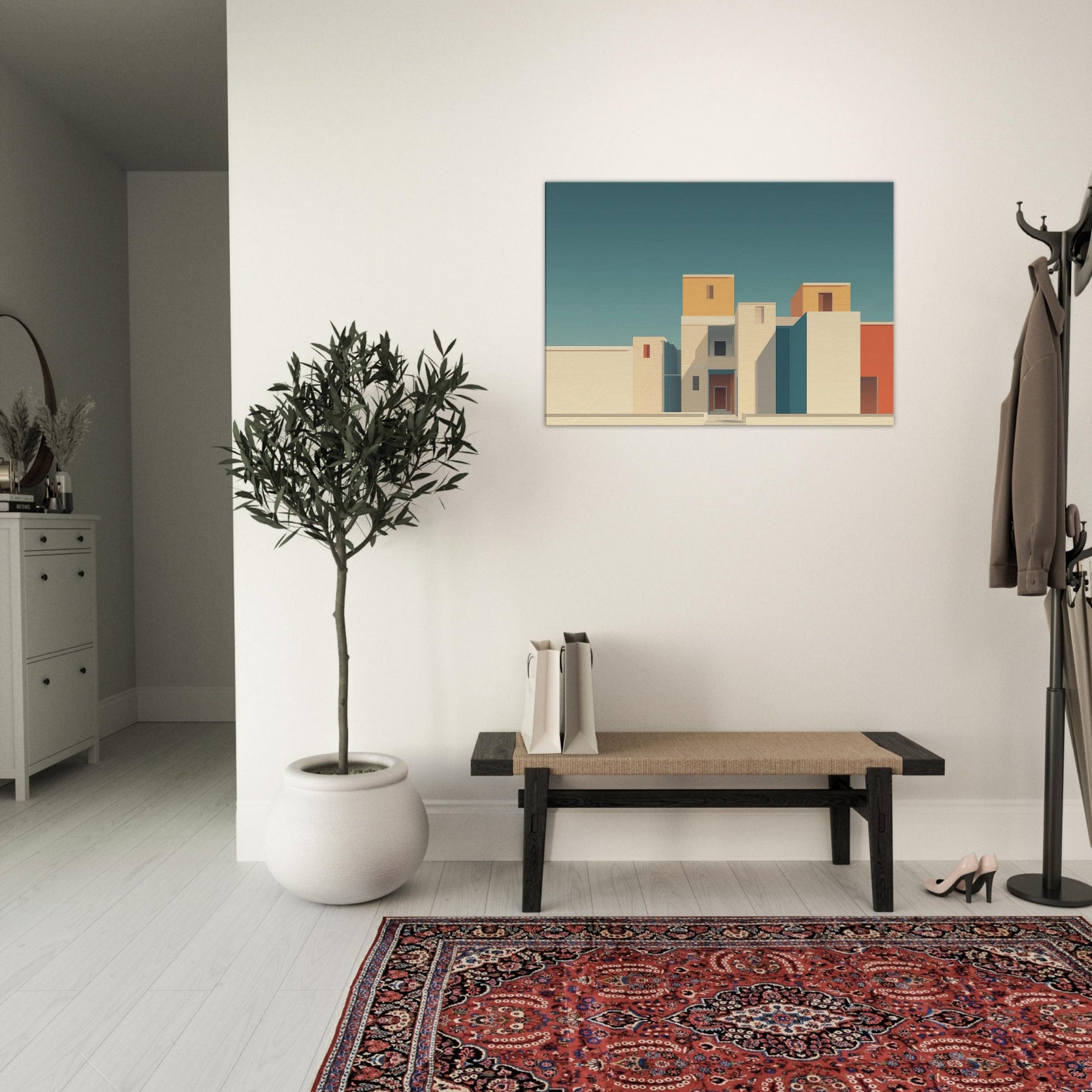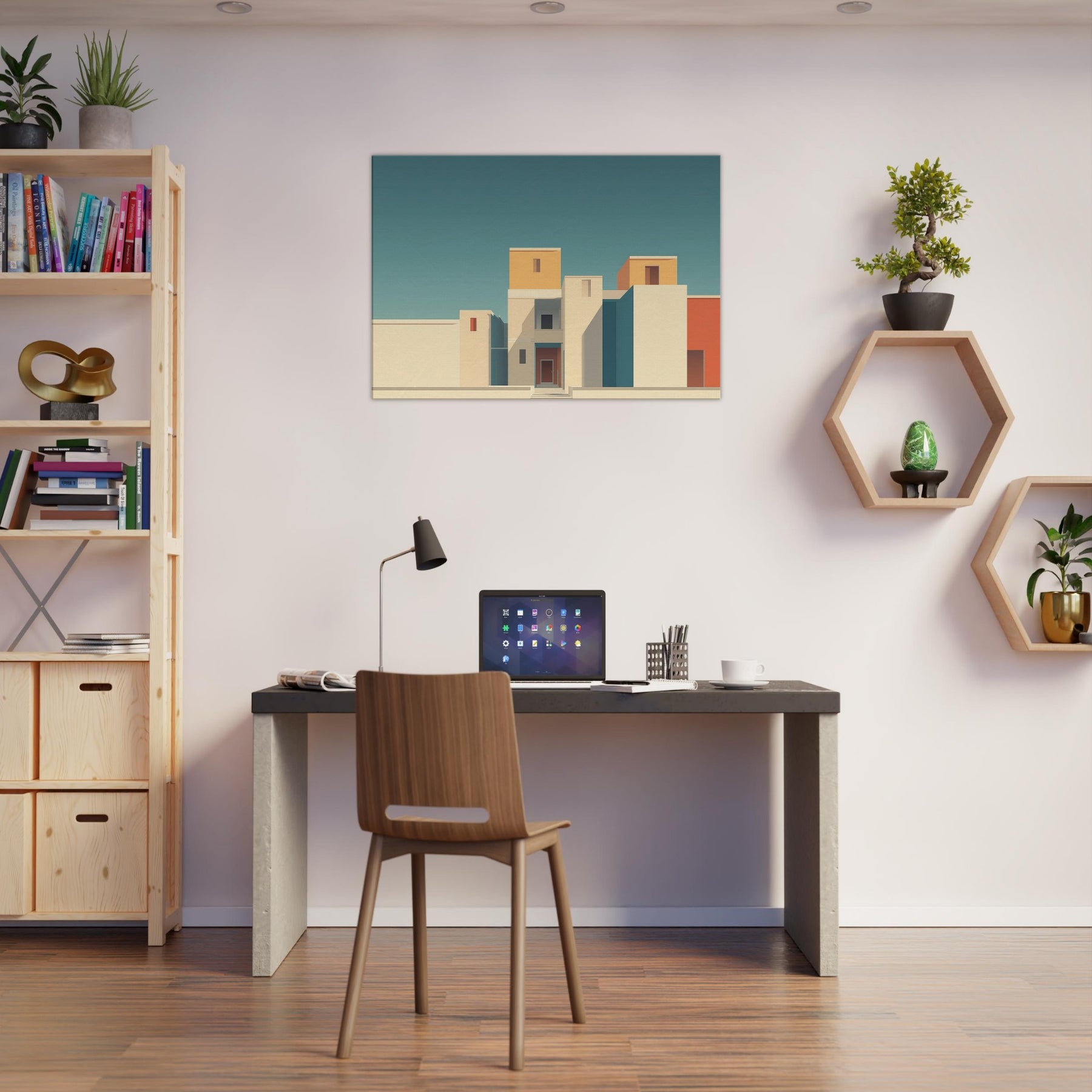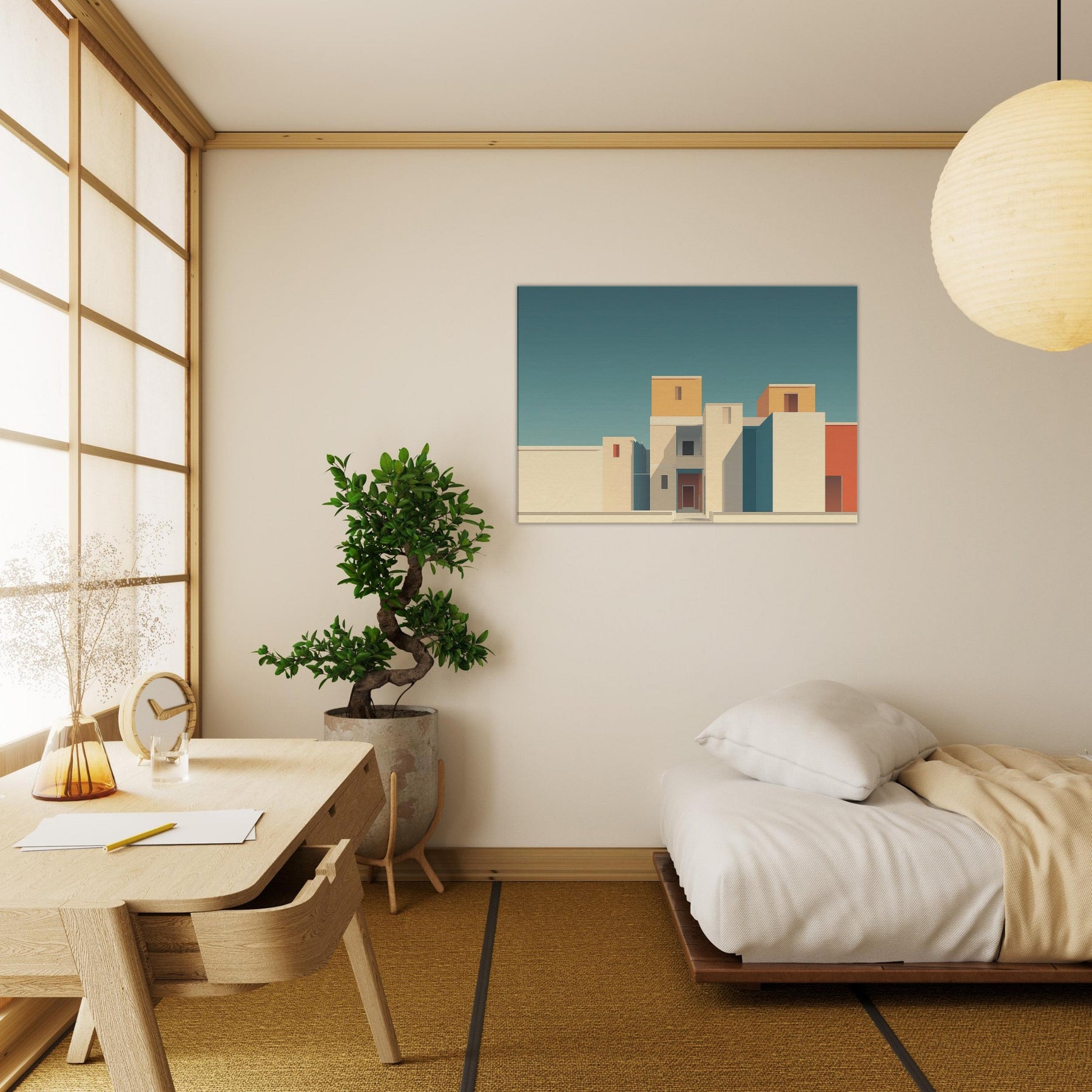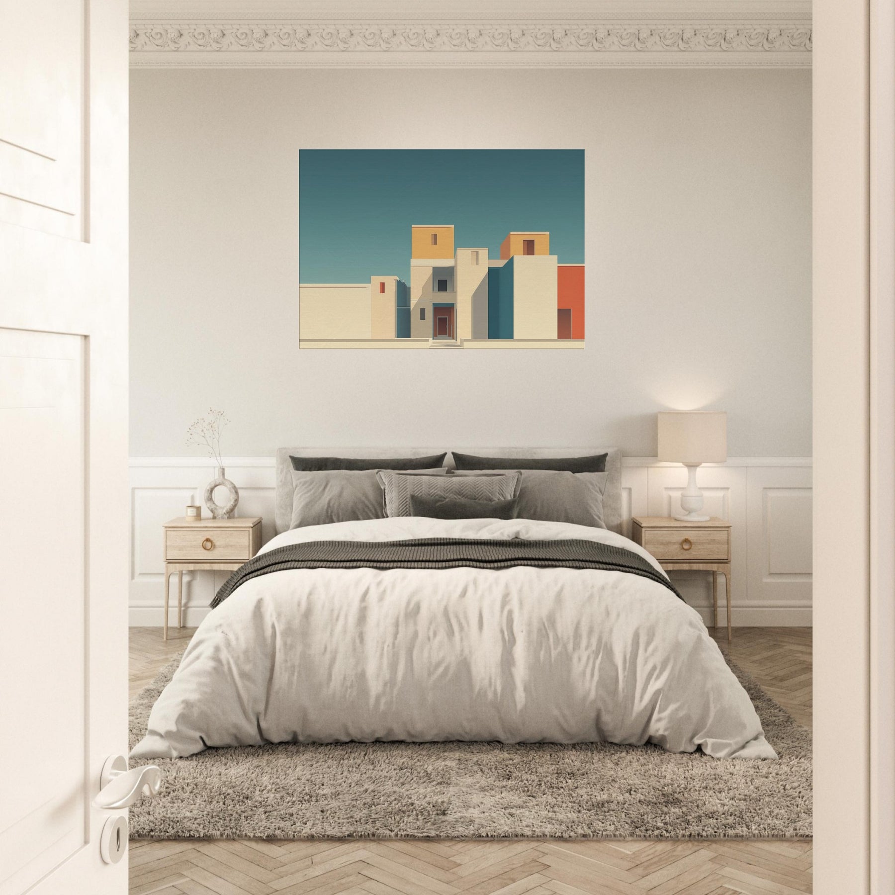Venice Horizon distills the city's quiet grandeur into crisp, sunlit blocks. The minimalist composition layers pale creams, ochres, and teal against a gradient sky, evoking canals and cloisters without clutter. This piece brings a serene architectural hush to a living space, inviting the eye to glide along clean lines and soft shadows. Perfect above a sofa or in a reading nook, it infuses rooms with the timeless romance and restrained elegance of Venice.