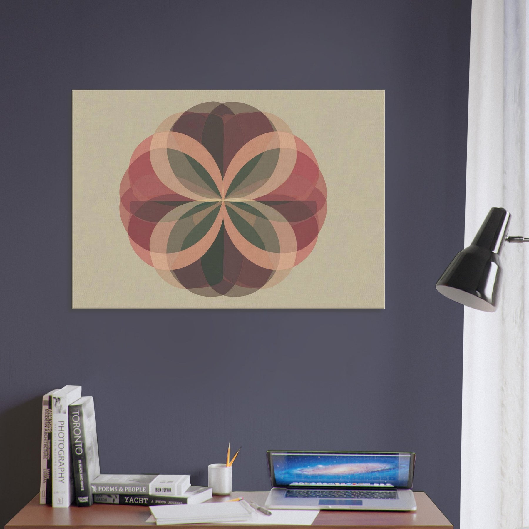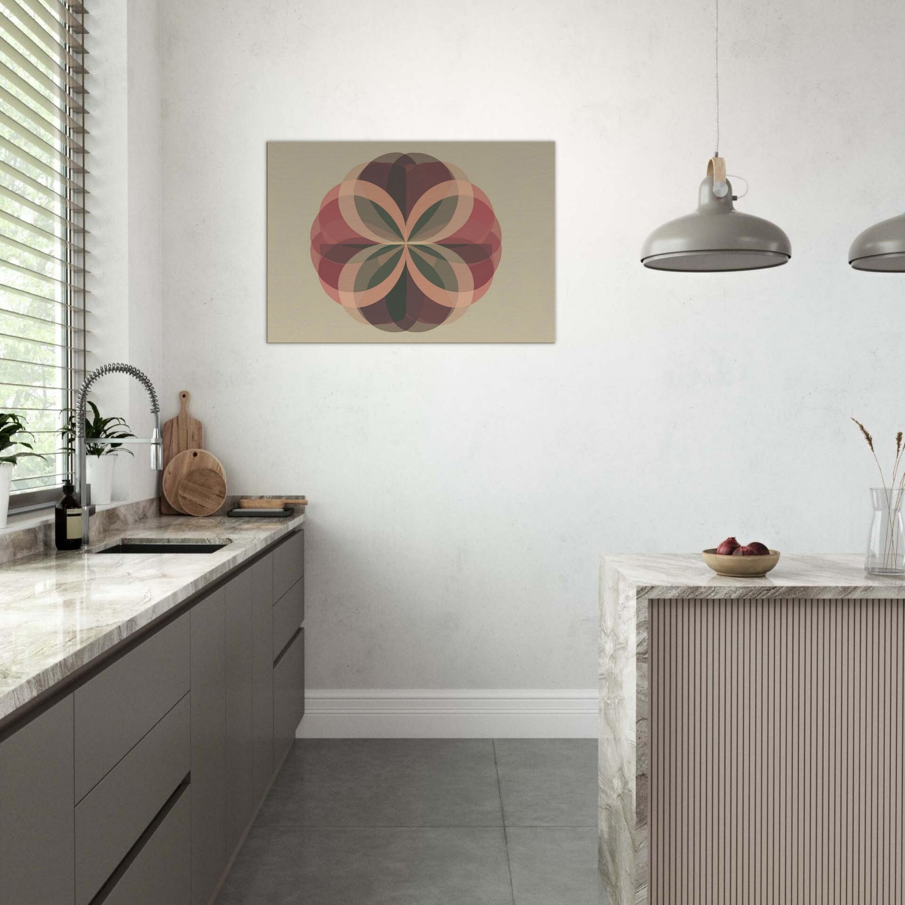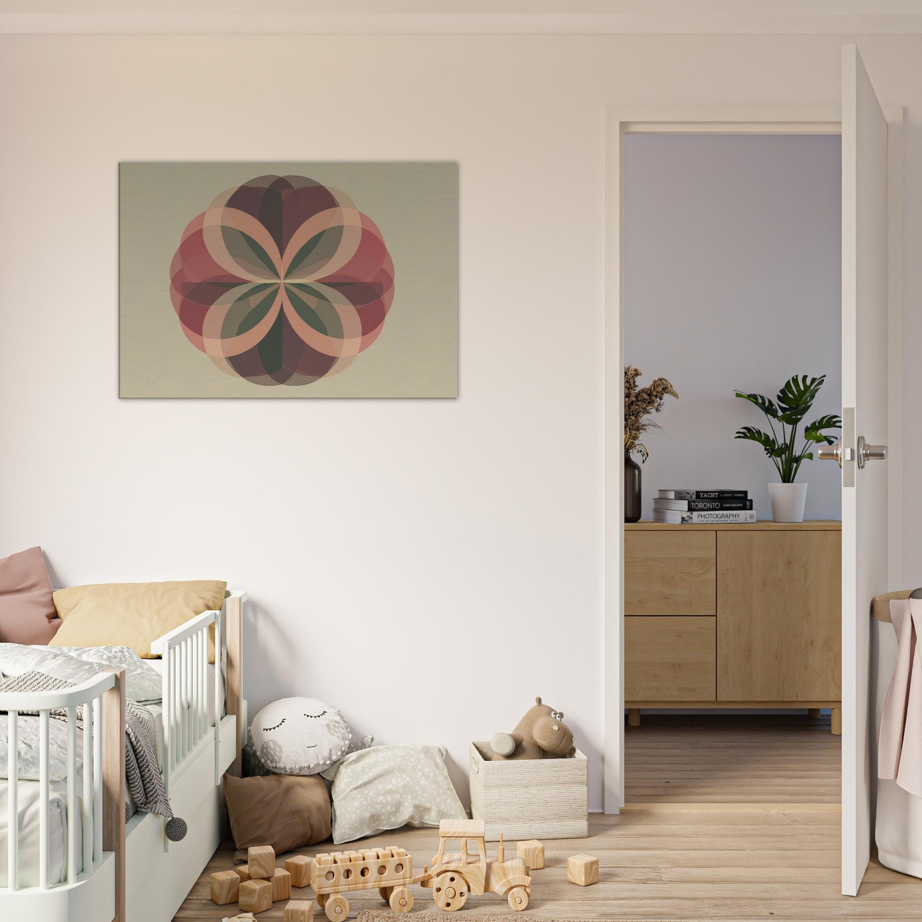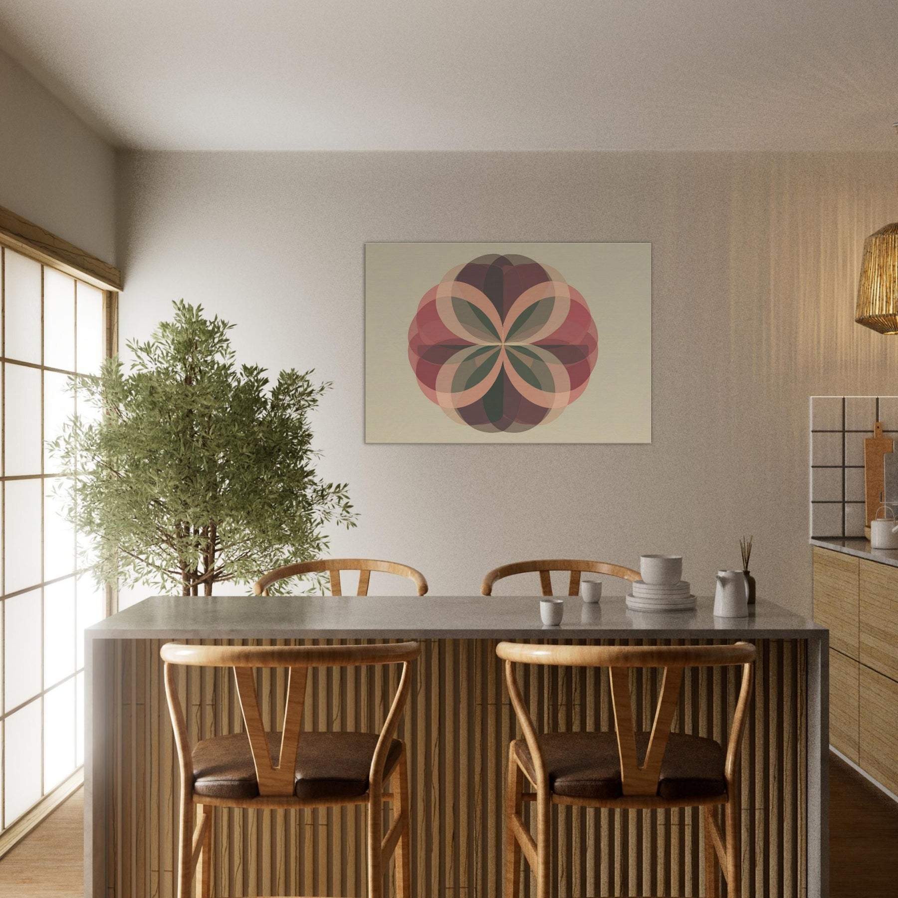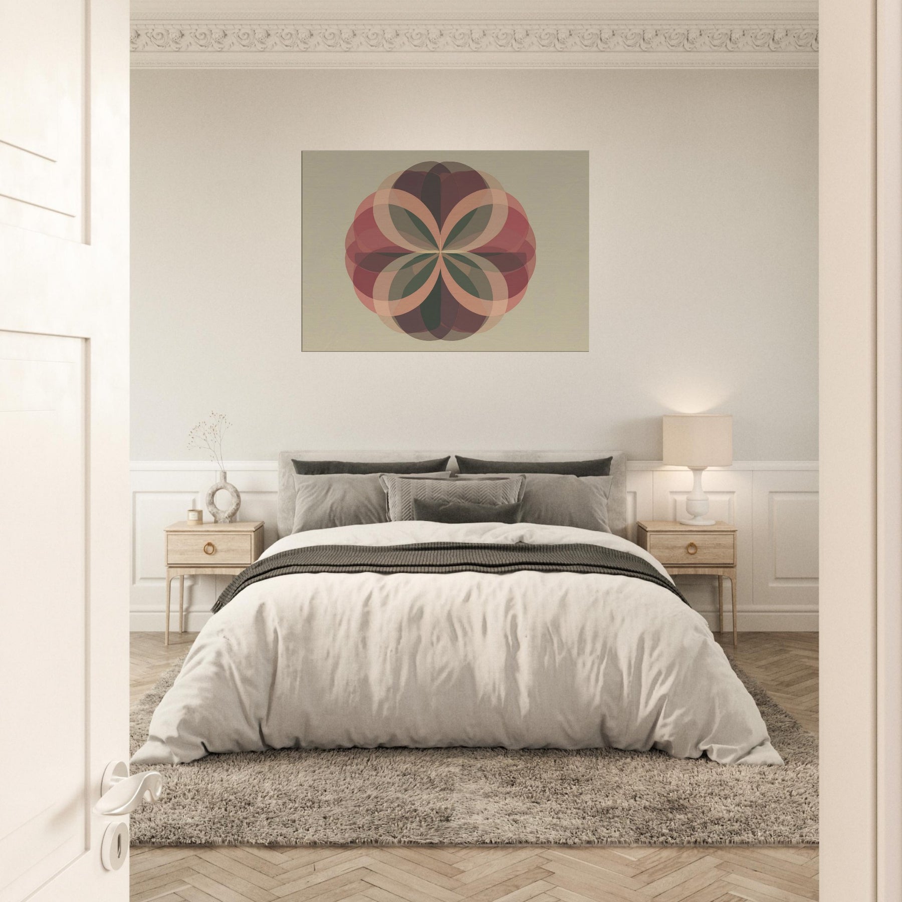 Fruit of Life Minimalist wall art that feels like a quiet ceremony of form. Centered on the Fruit of Life, the piece unfolds through interlocking, translucent petals that radiate from a calm core. Soft terracotta, sage, and cacao tones layer over a warm beige field, catching the light to create shifting depth. The atmosphere is serene and contemplative, inviting stillness amid everyday noise. Hang it in a living room or meditation nook to transform the space into a sanctuary of balance, focus, and subtle grace.