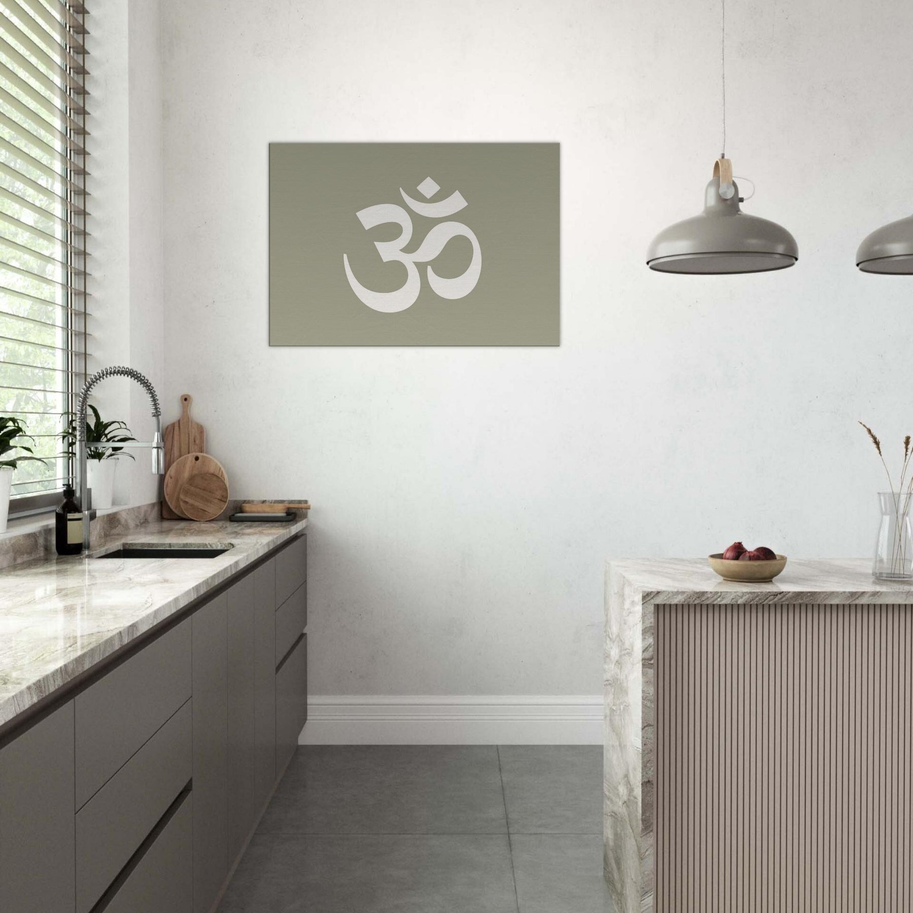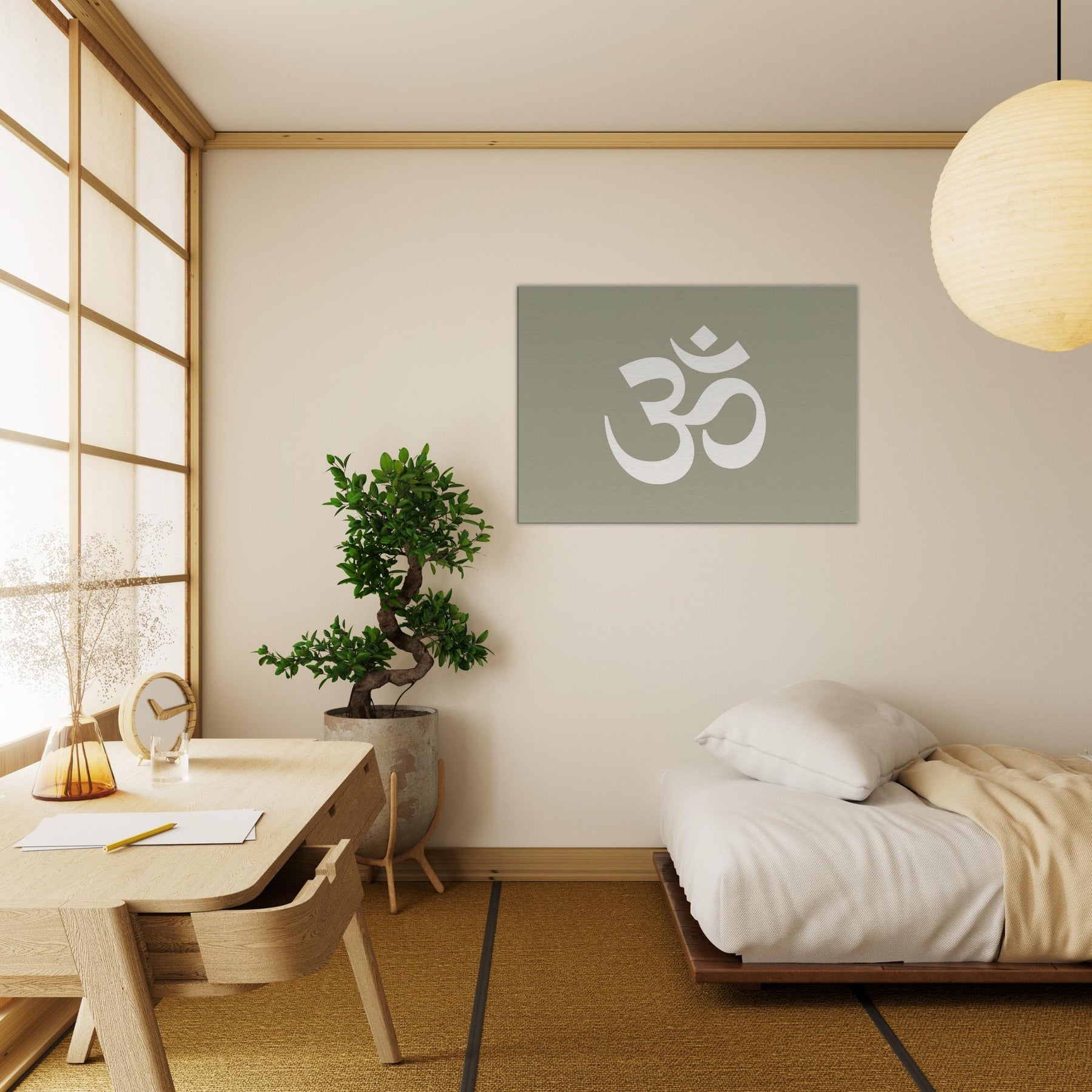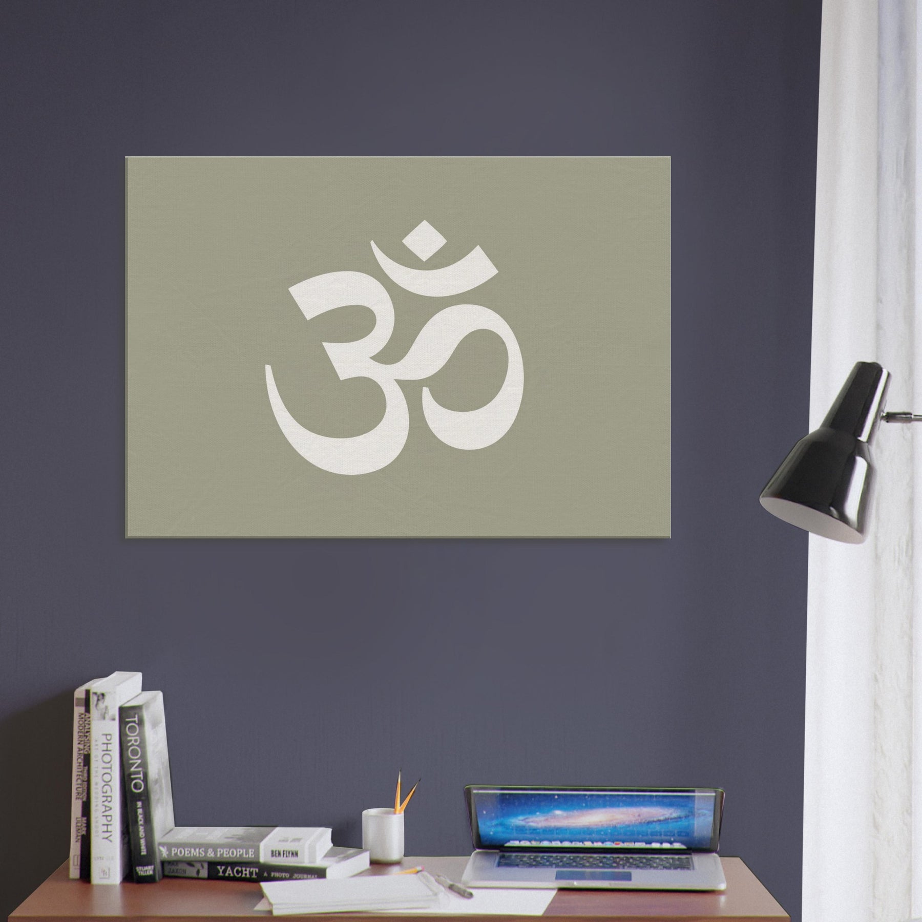 On a muted sage field, this minimalist study of Om (Aum Symbol) crystallizes stillness into form. The large, airy glyph breathes with space, inviting stillness, reflection, and a soft rhythm into the room. Perfect for a living area or meditation corner, it heightens a calm atmosphere without shouting. Pair it with warm woods and natural textiles to slow time, invite quiet conversation, and let the wall become a portal to balance, clarity, and subtle spiritual resonance.