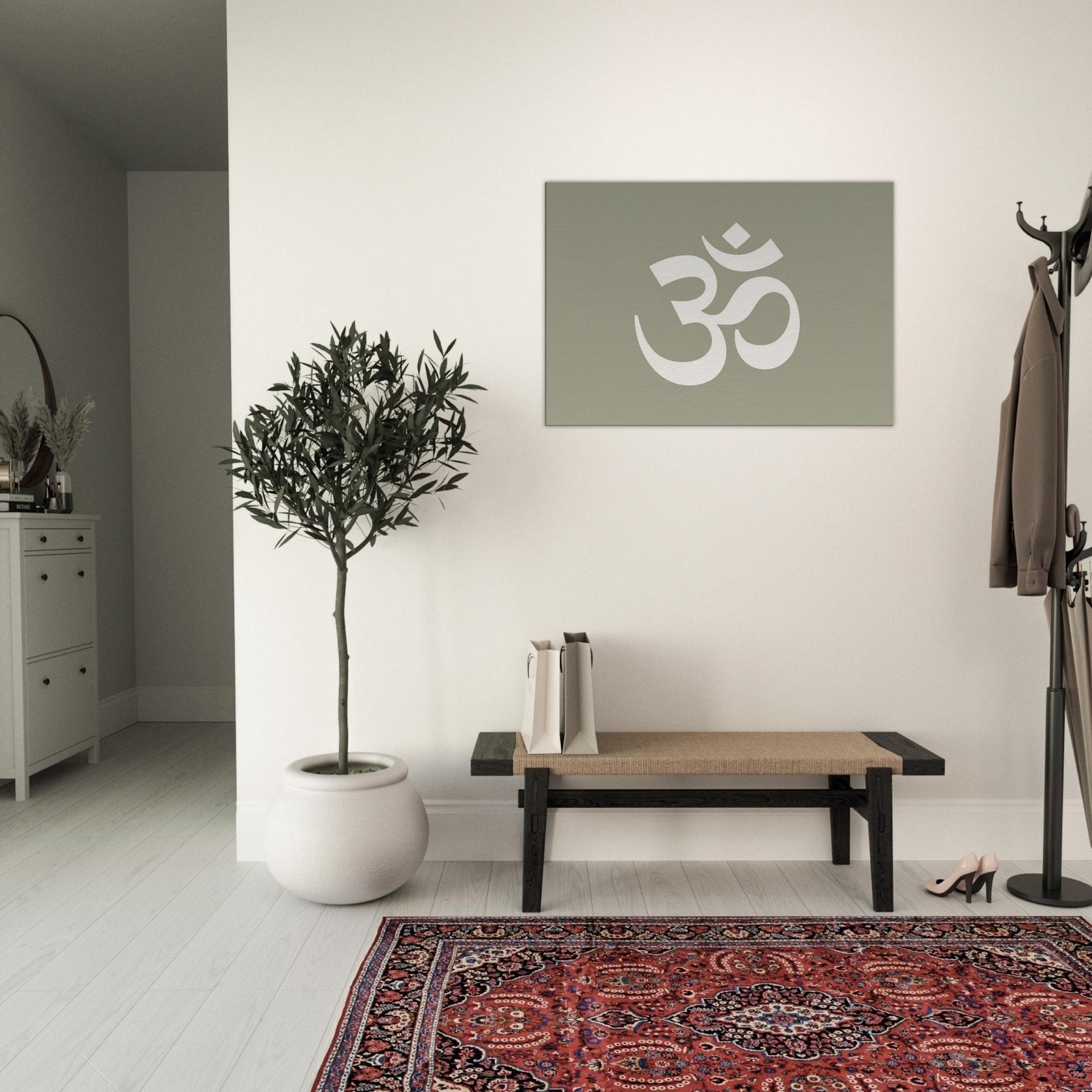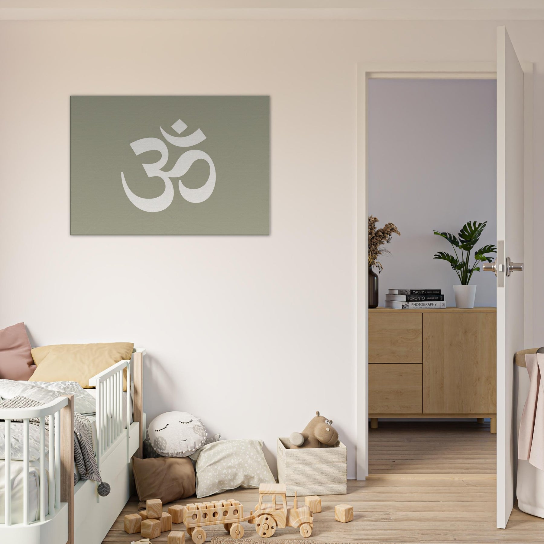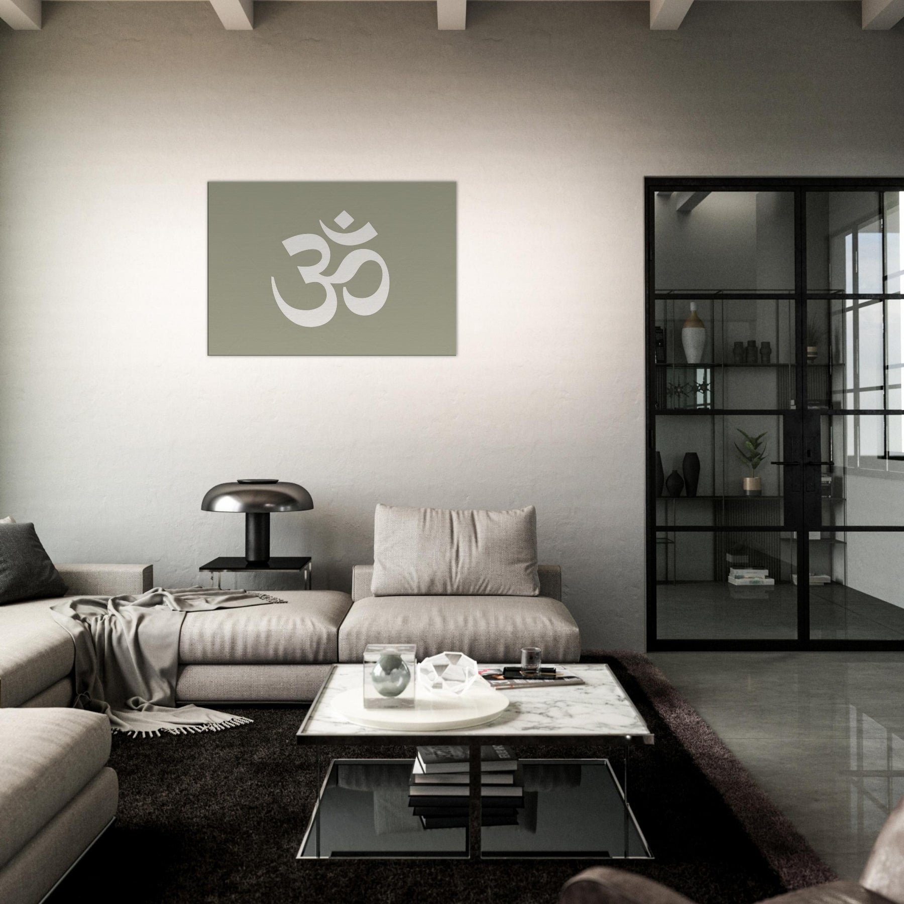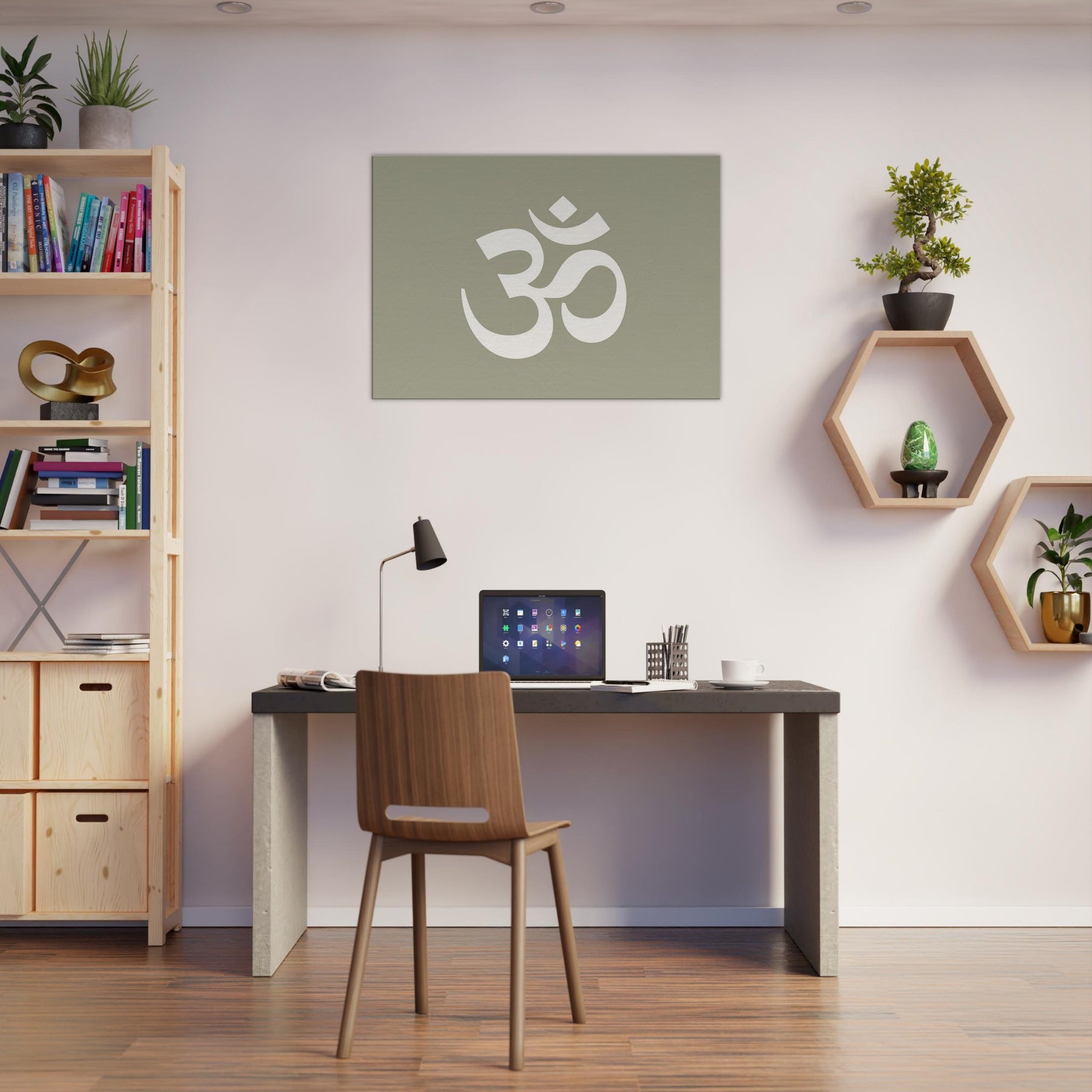 On a muted sage field, this minimalist study of Om (Aum Symbol) crystallizes stillness into form. The large, airy glyph breathes with space, inviting stillness, reflection, and a soft rhythm into the room. Perfect for a living area or meditation corner, it heightens a calm atmosphere without shouting. Pair it with warm woods and natural textiles to slow time, invite quiet conversation, and let the wall become a portal to balance, clarity, and subtle spiritual resonance.