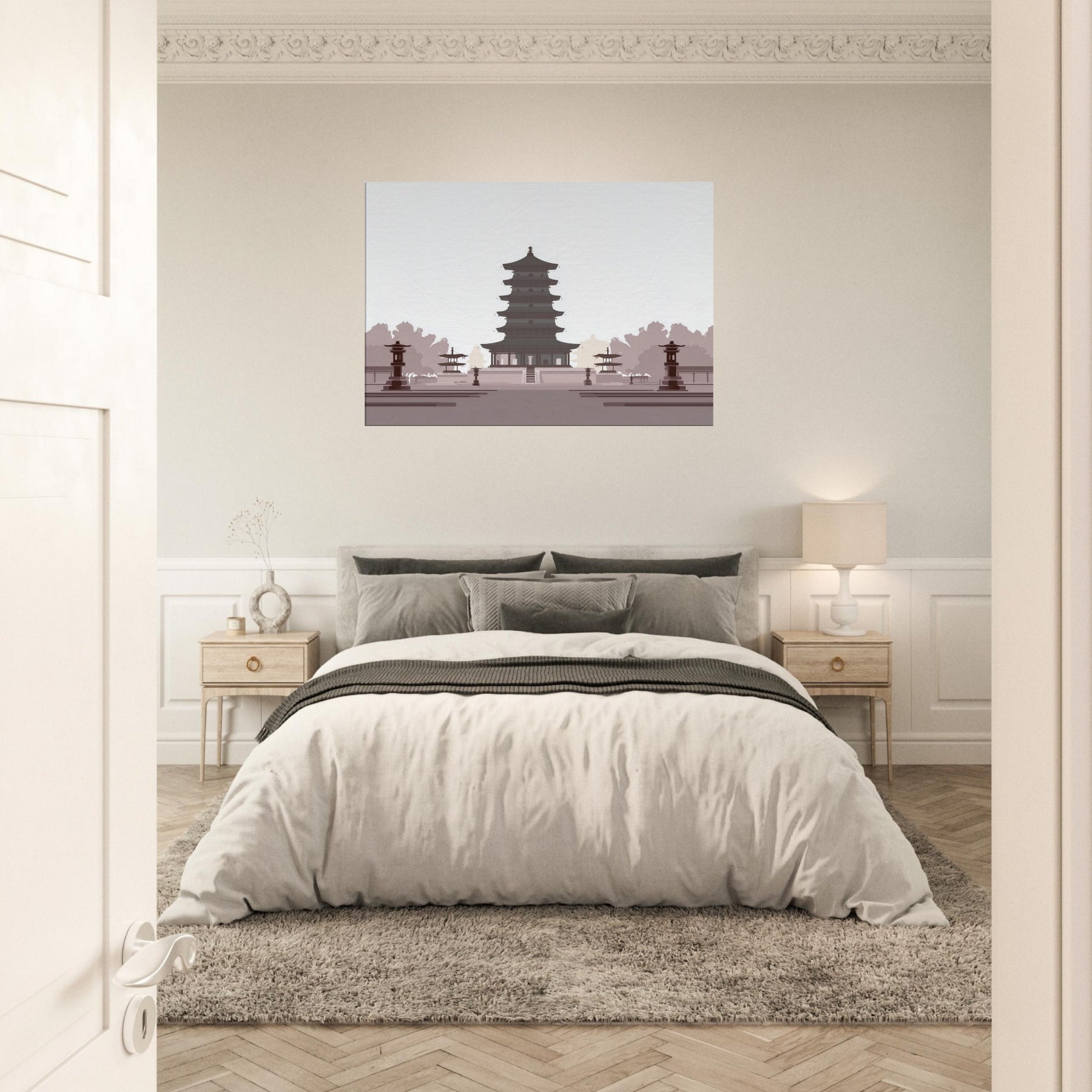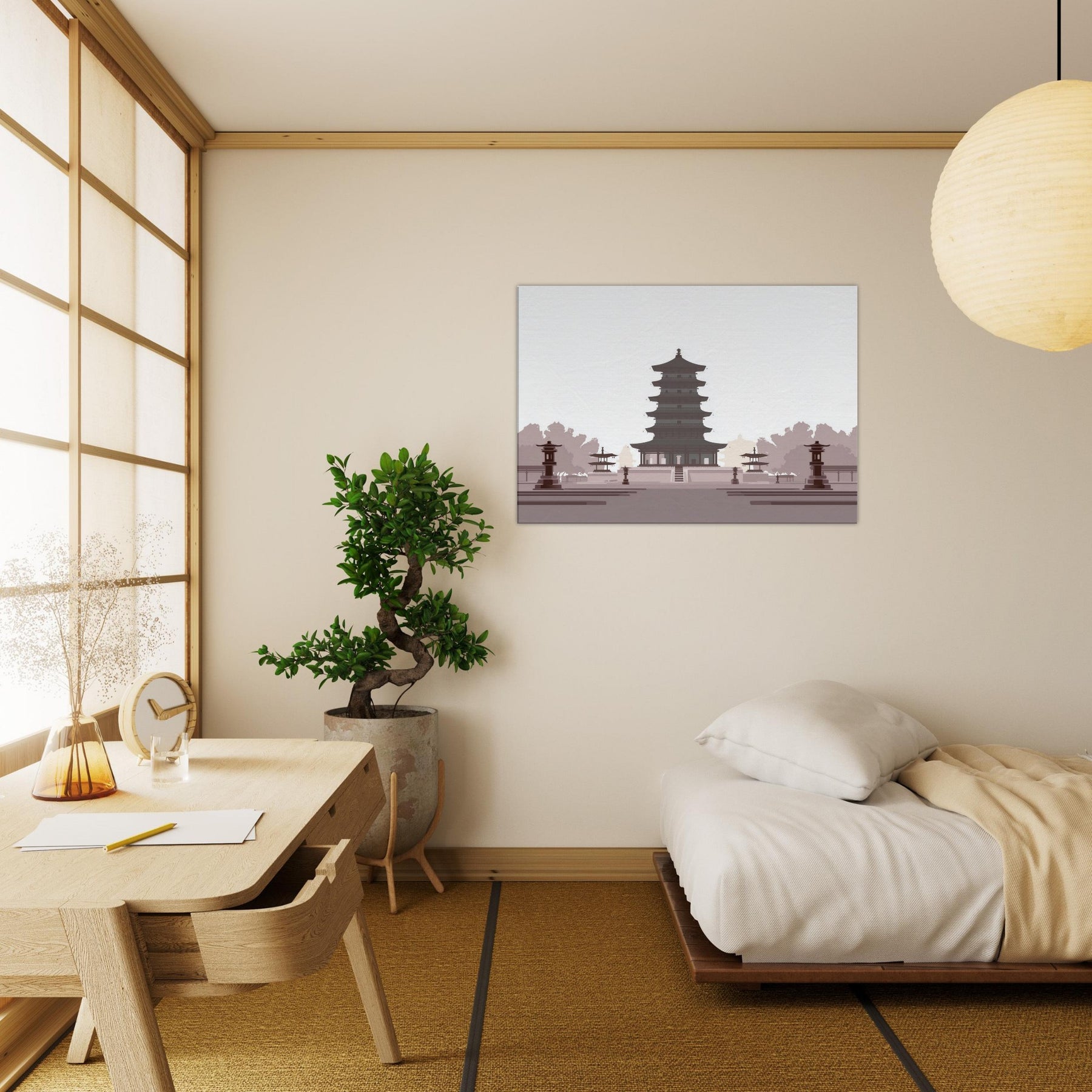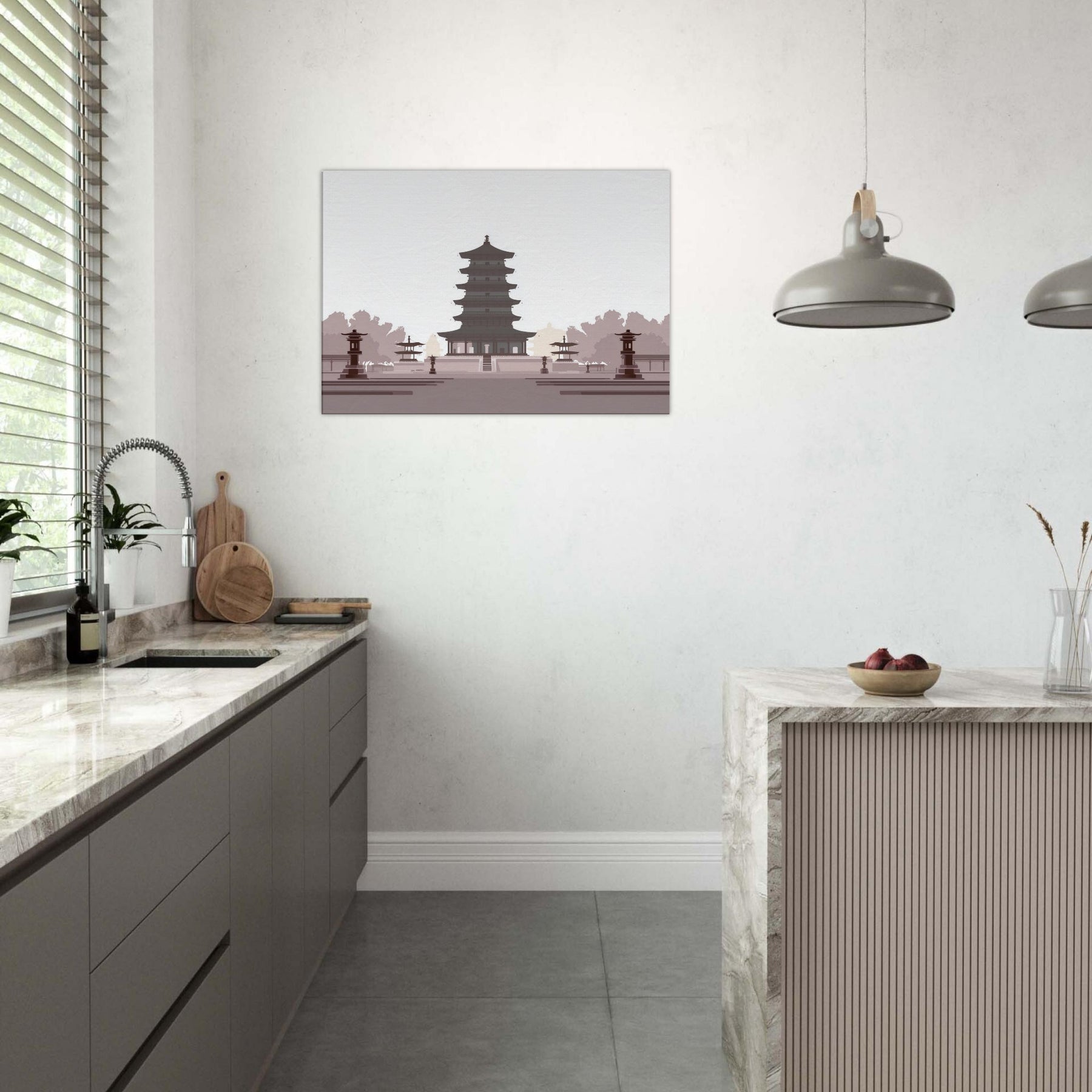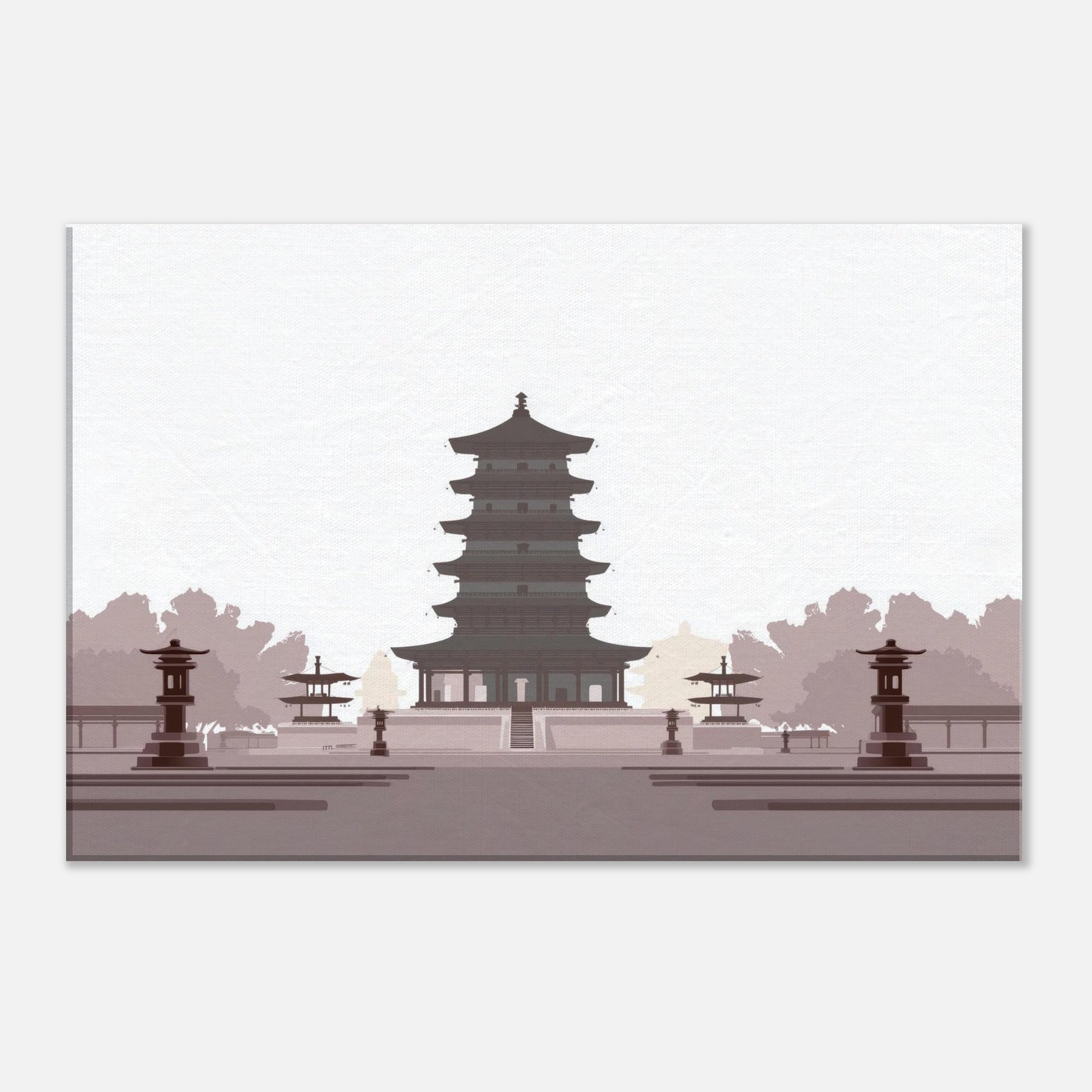 Let a serene Pagoda anchor your living space with quiet gravity. This minimalist study of balance unfolds in generous negative space, where every tier feels deliberate and calm. The soft, monochrome palette evokes dawn shadows and temple quiet, inviting reflection as you unwind after a long day. Hang it in a living room or entryway to slow the tempo of the room, turning walls into a meditative horizon of architecture and light.