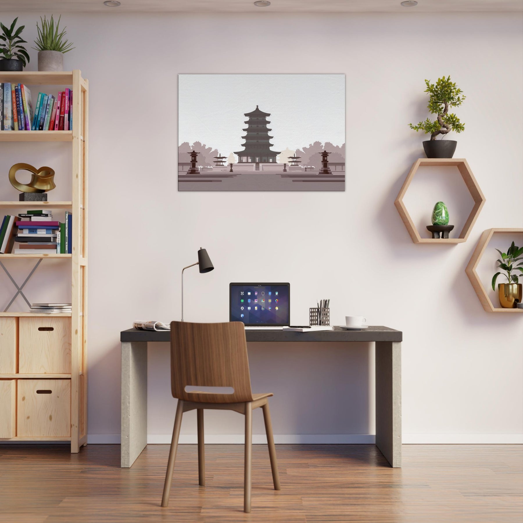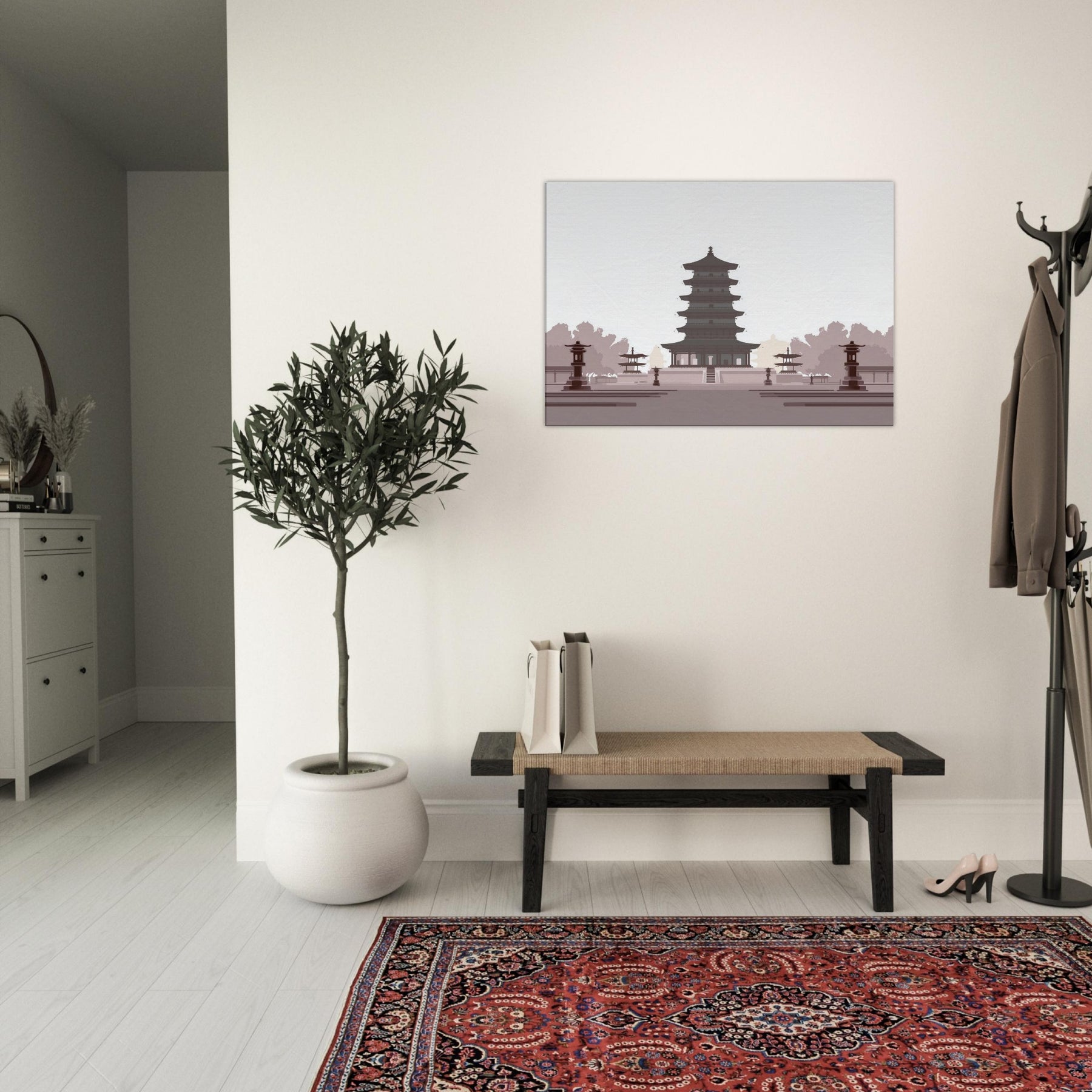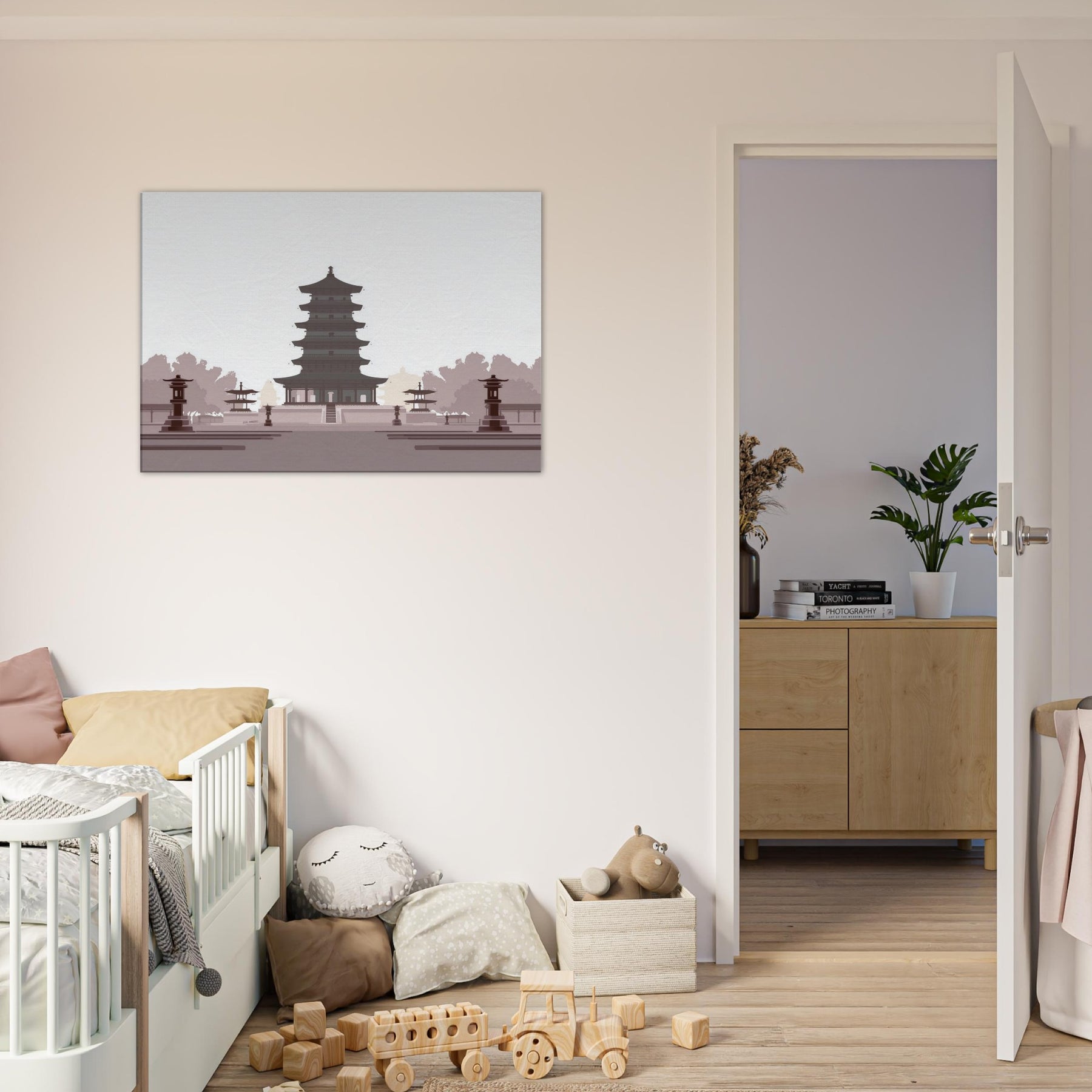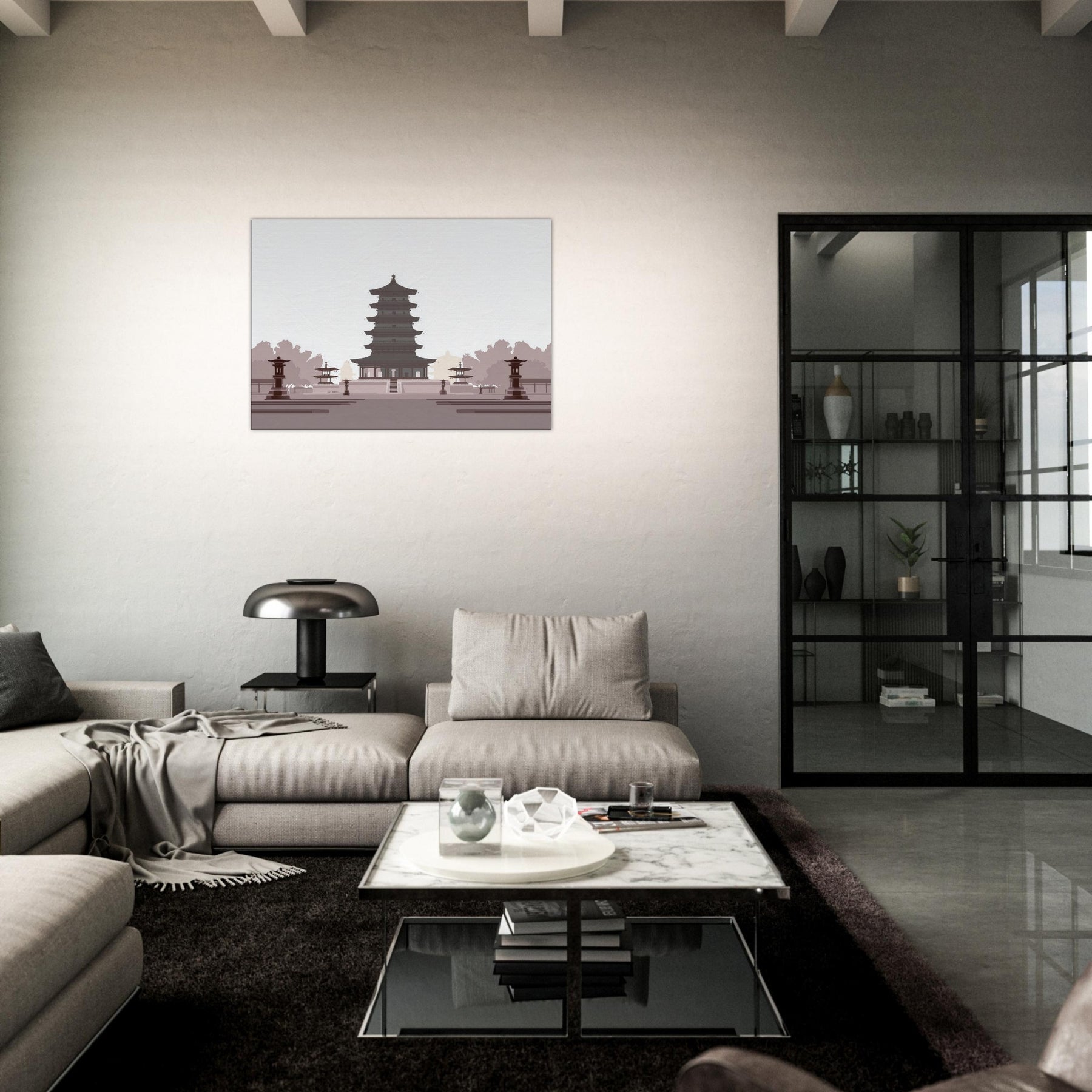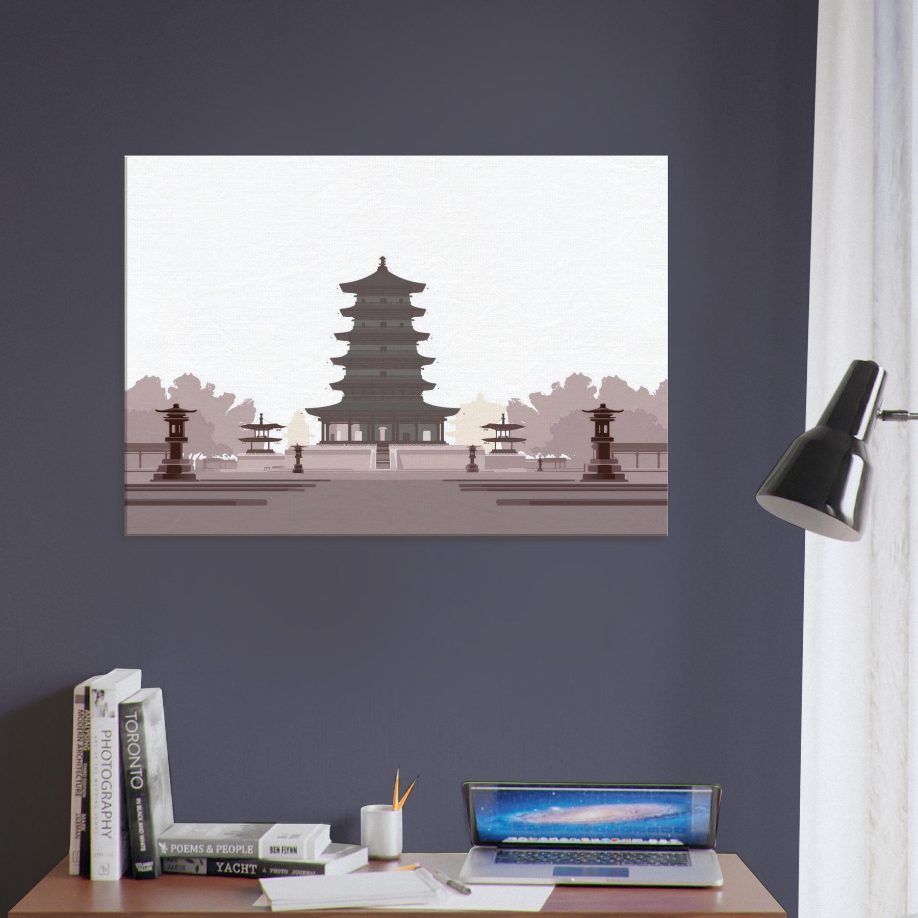 Let a serene Pagoda anchor your living space with quiet gravity. This minimalist study of balance unfolds in generous negative space, where every tier feels deliberate and calm. The soft, monochrome palette evokes dawn shadows and temple quiet, inviting reflection as you unwind after a long day. Hang it in a living room or entryway to slow the tempo of the room, turning walls into a meditative horizon of architecture and light.