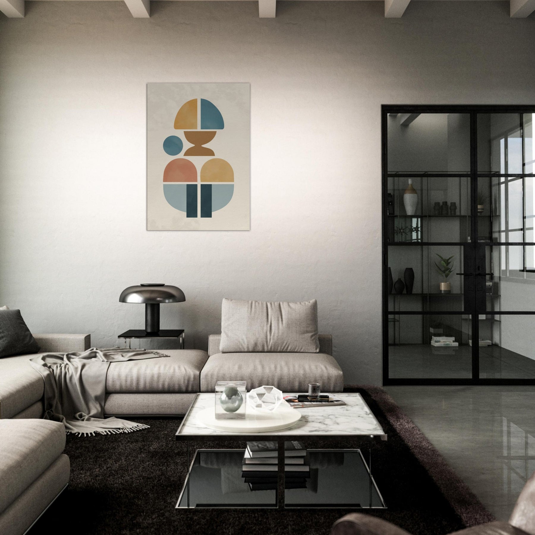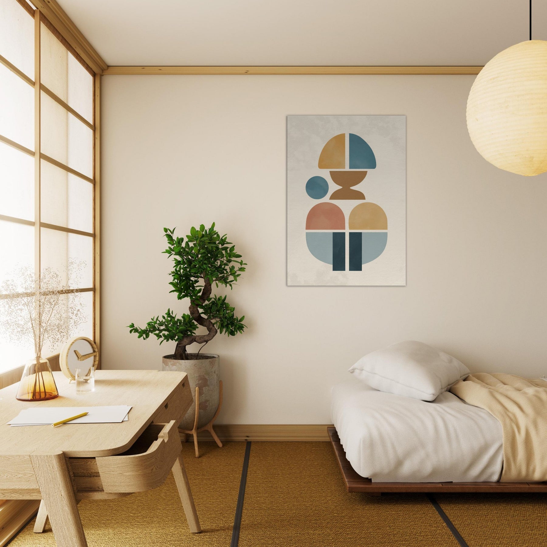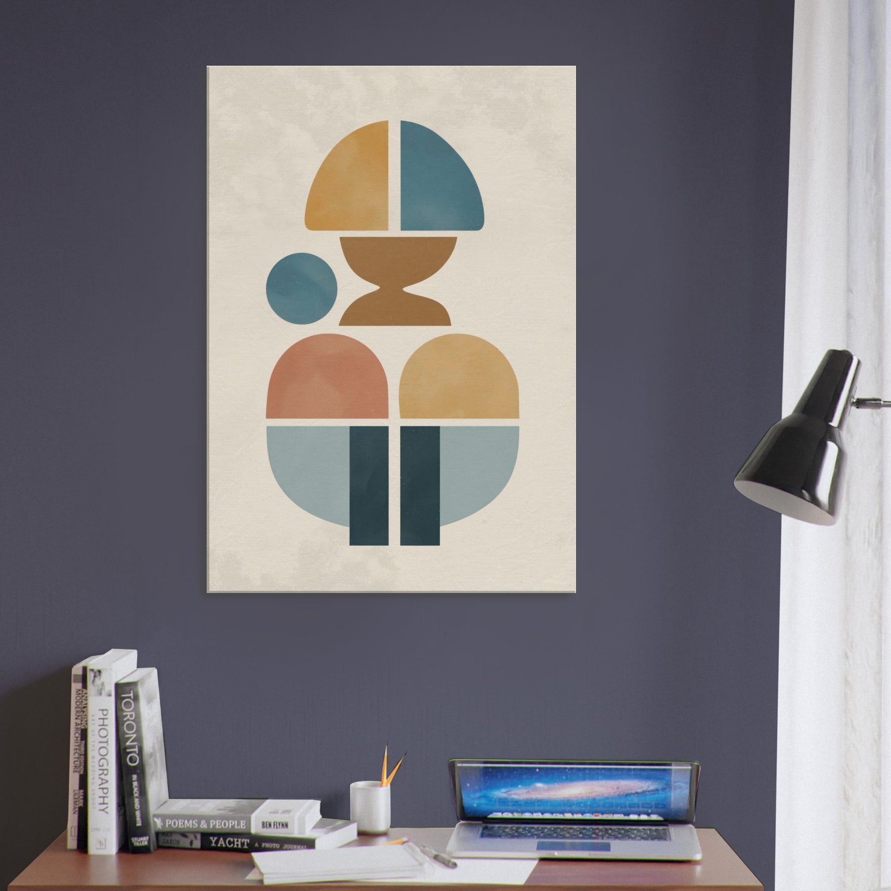 Totem stands as a quiet oracle in your room, a minimalist embrace of color and form. This Totem inspired composition spirals into calm: ochre, slate blue, and soft terracotta rise in a balanced ascent that invites stillness and reflection. The air around it feels warmer, the light softened by its rounded shapes. Place it where daily rituals unfold above a sofa, in a hallway, or beside a bed and let the Totem cultivate focus, intimacy, and a gentle sense of wonder.