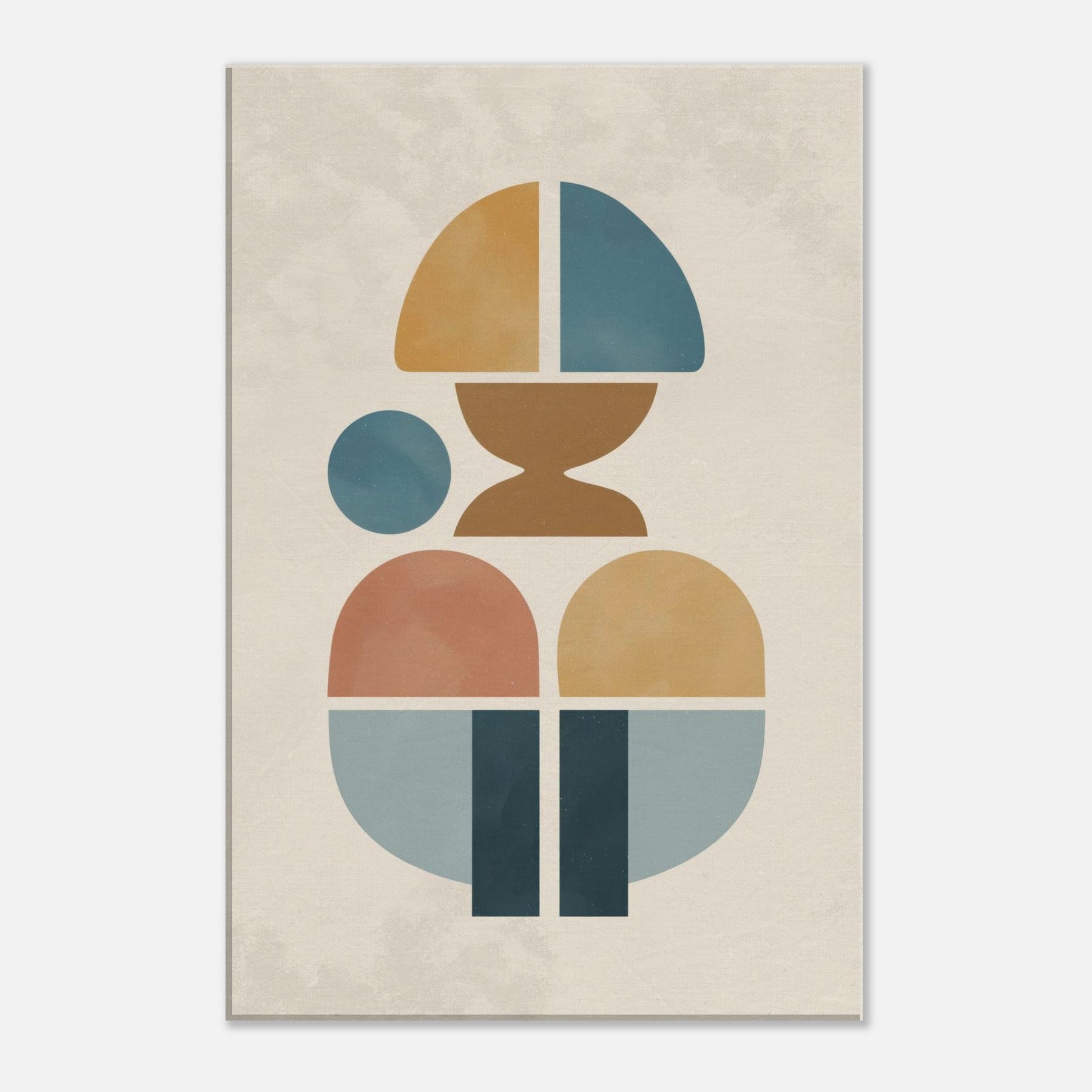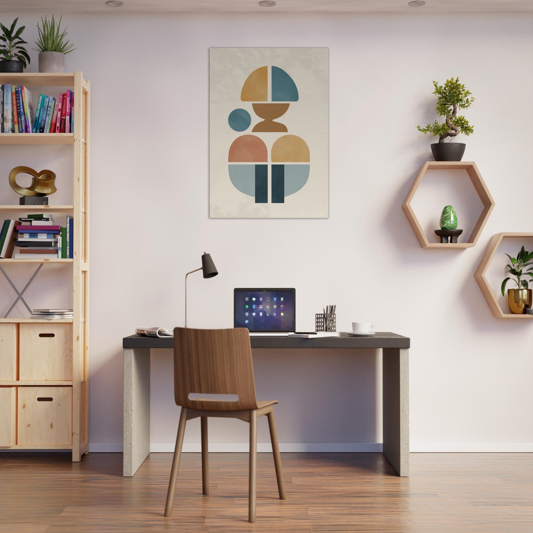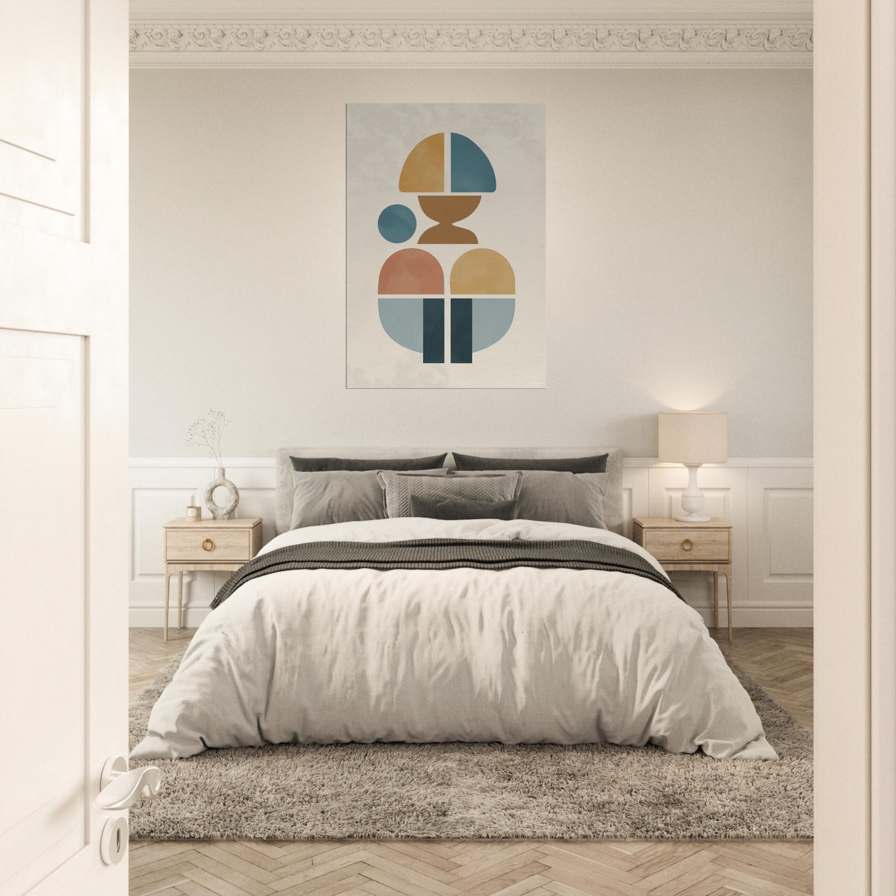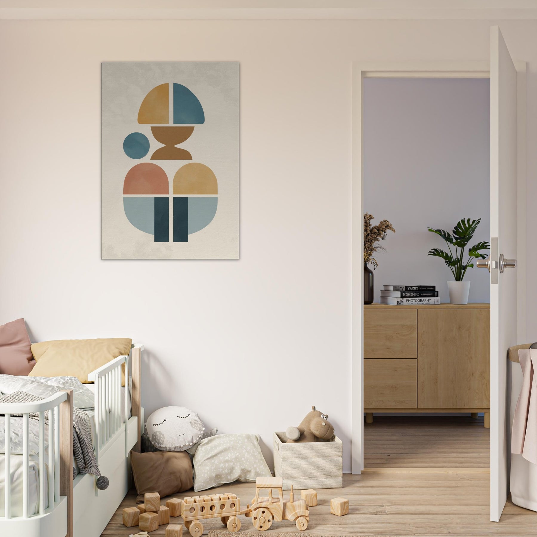 Totem stands as a quiet oracle in your room, a minimalist embrace of color and form. This Totem inspired composition spirals into calm: ochre, slate blue, and soft terracotta rise in a balanced ascent that invites stillness and reflection. The air around it feels warmer, the light softened by its rounded shapes. Place it where daily rituals unfold above a sofa, in a hallway, or beside a bed and let the Totem cultivate focus, intimacy, and a gentle sense of wonder.
