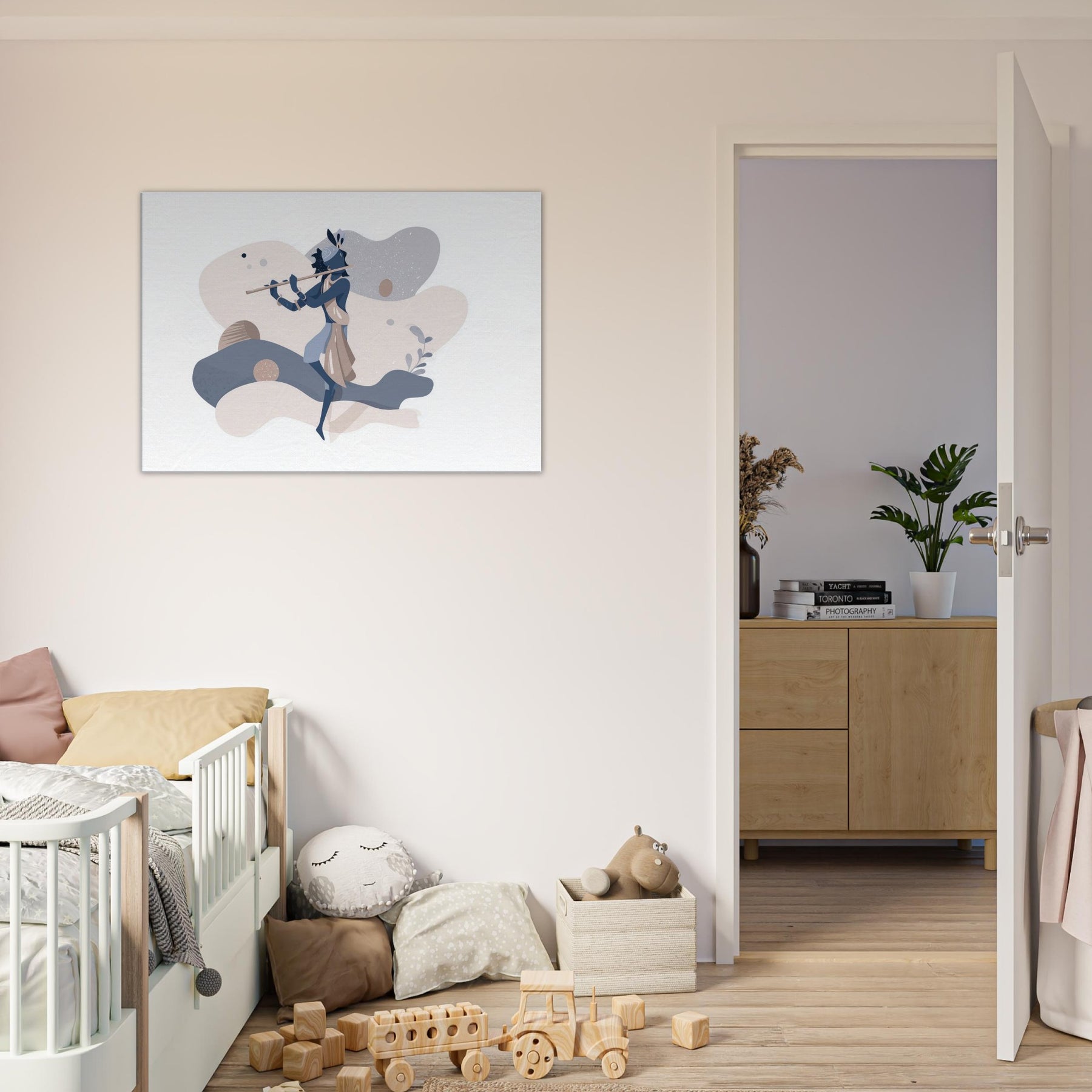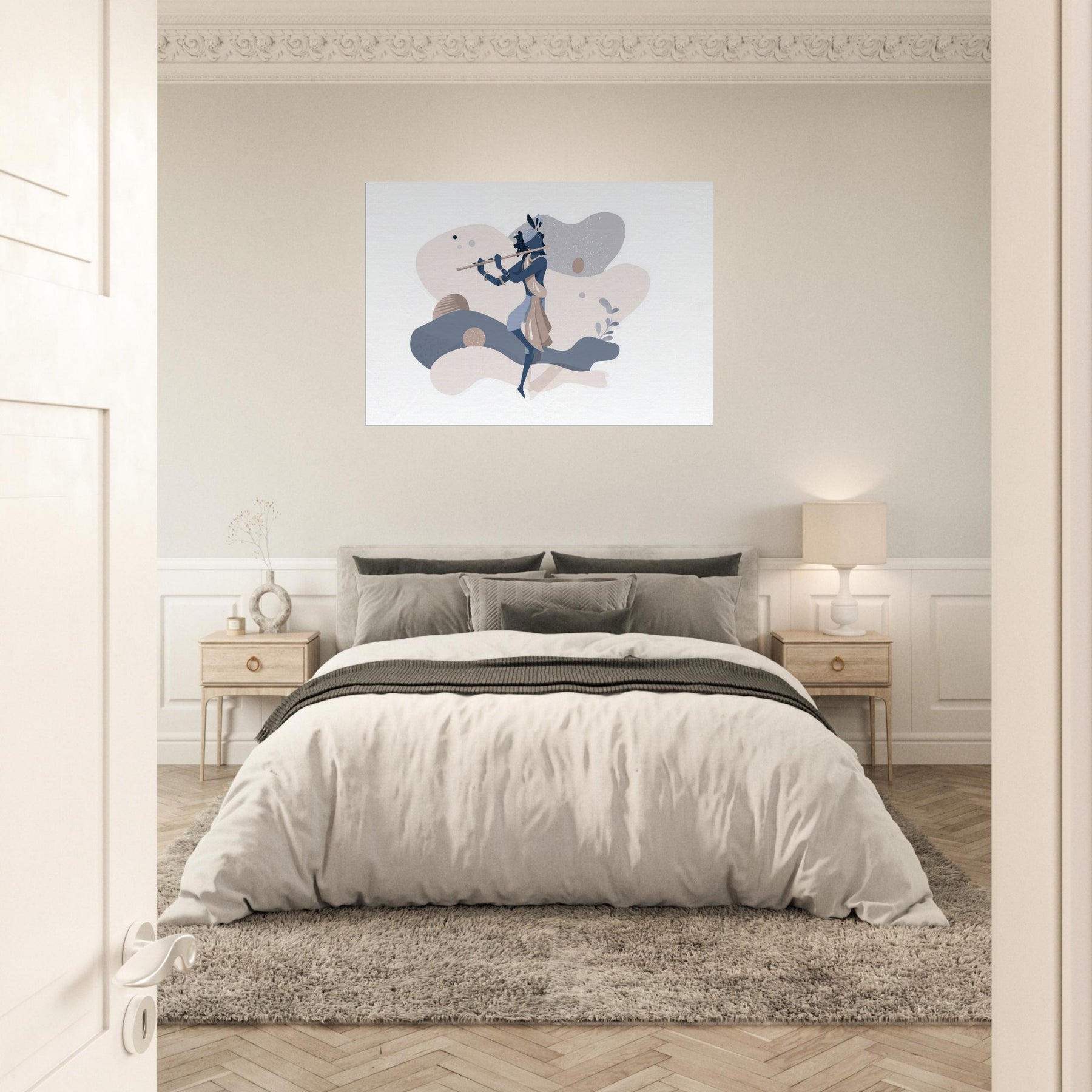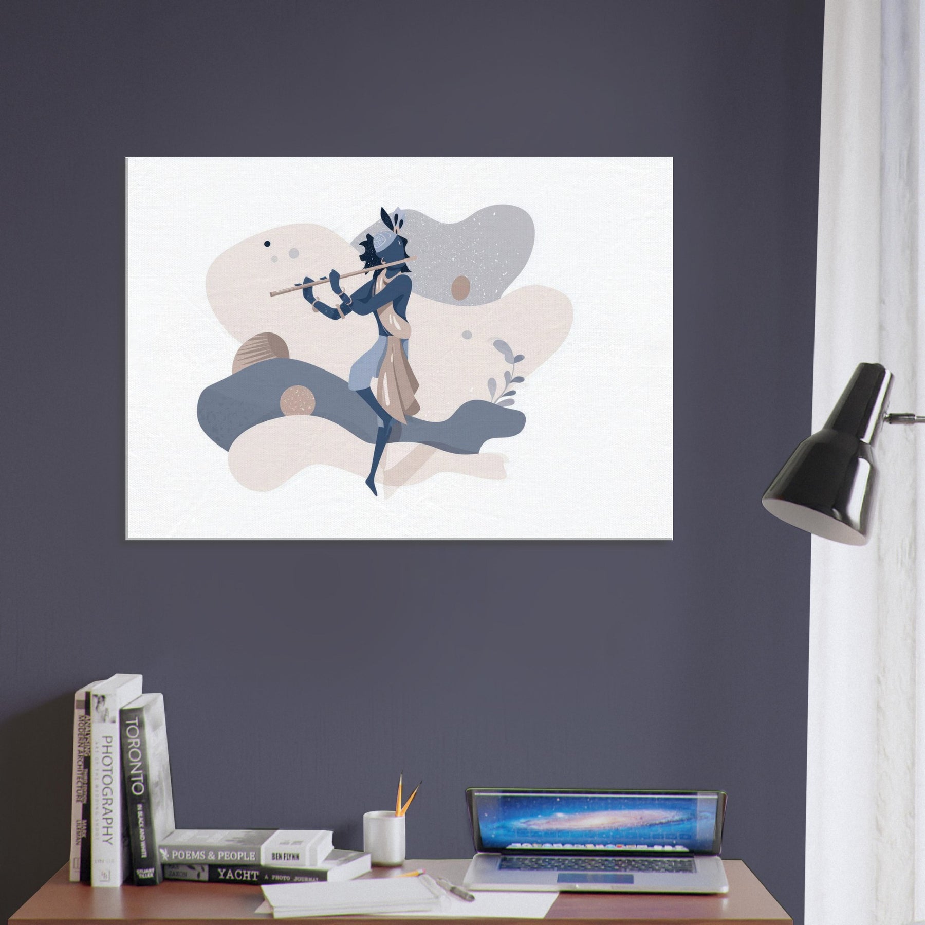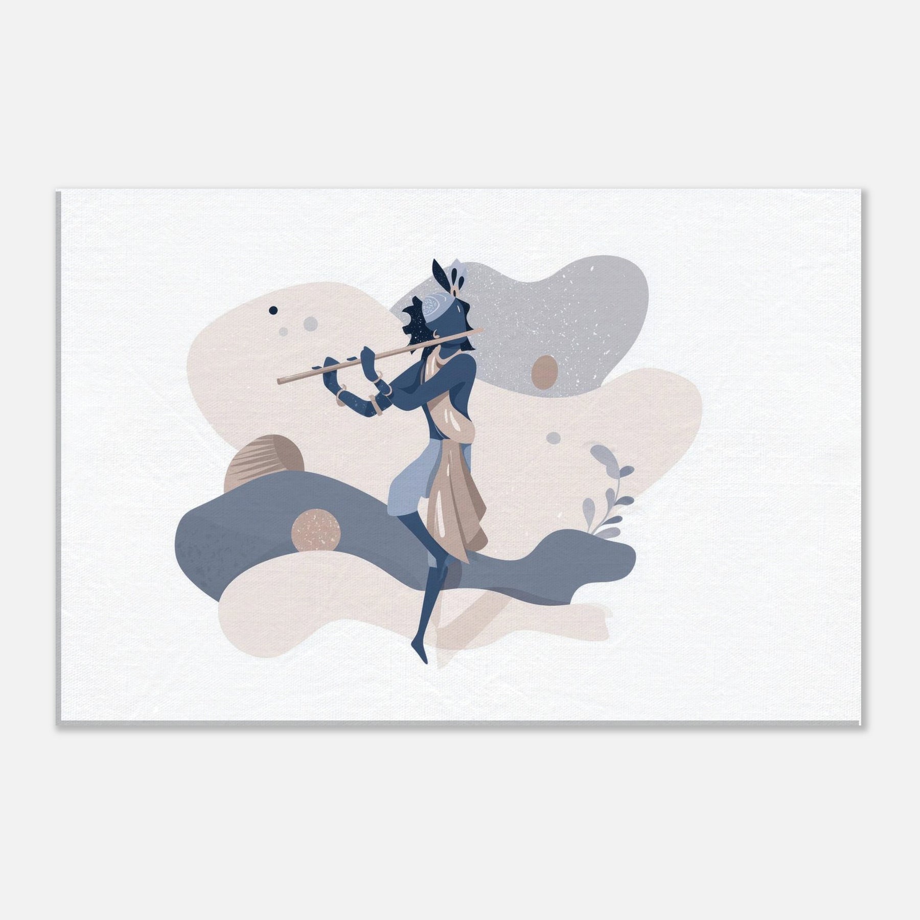 Krishna with Flute exudes a hushed radiance, distilled into simple curves and a velvet palette. The composition moves like a soft mantra blues and beiges mingling in airy silhouettes that carry the flute’s tranquil music across the room. It invites a serene gaze, turning walls into a calm horizon where morning light and evening shadows play. In any living space, this mystical, minimalist image becomes a steady focal point, elevating quiet moments, conversations, and a sense of timeless balance.