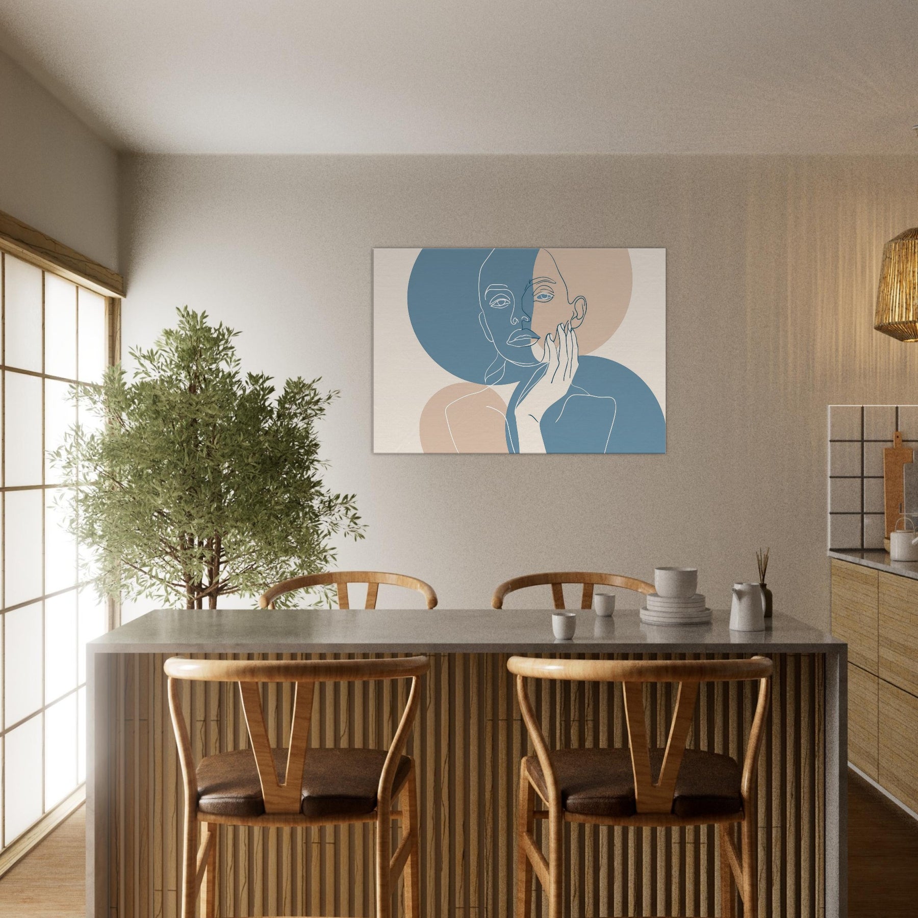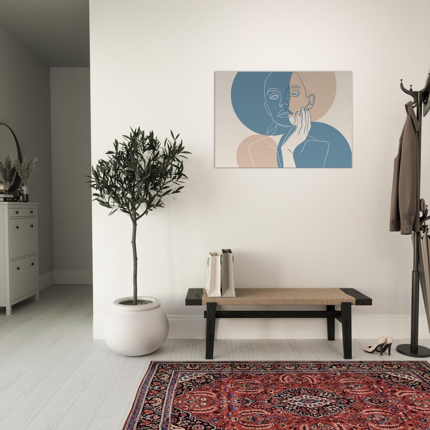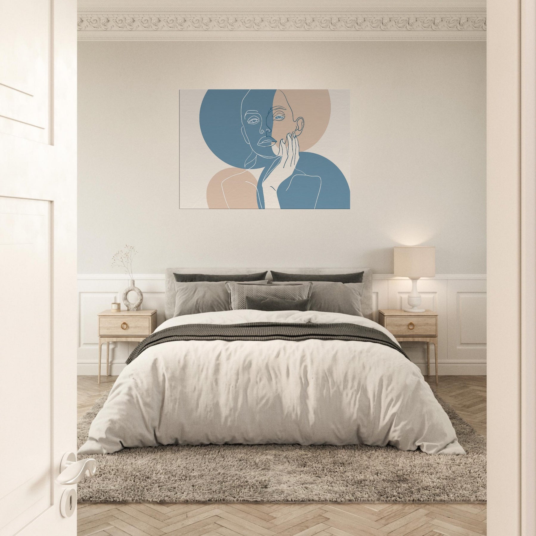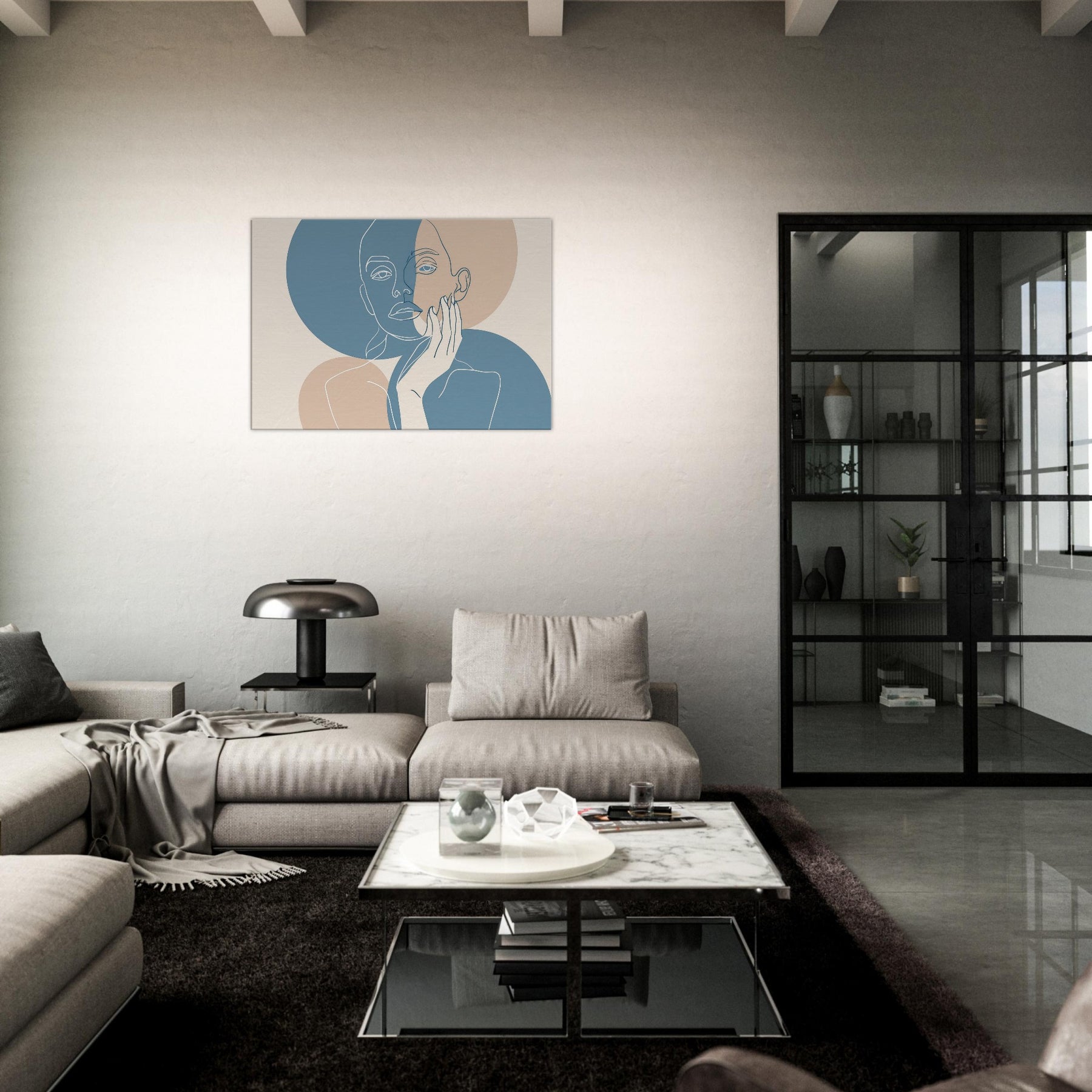 This piece centers on Hands Line Art, a minimalist study of gesture and connection. White contour lines trace two faces and a tender hand, set against soothing blue and warm beige shapes that breathe with soft light. The atmosphere feels intimate yet open, inviting quiet moments of reflection and gentle conversations with the space itself. Placed in a living room or hallway, it softens the room with its tactile calm and modern elegance, turning everyday walls into a sanctuary of connection and calm.