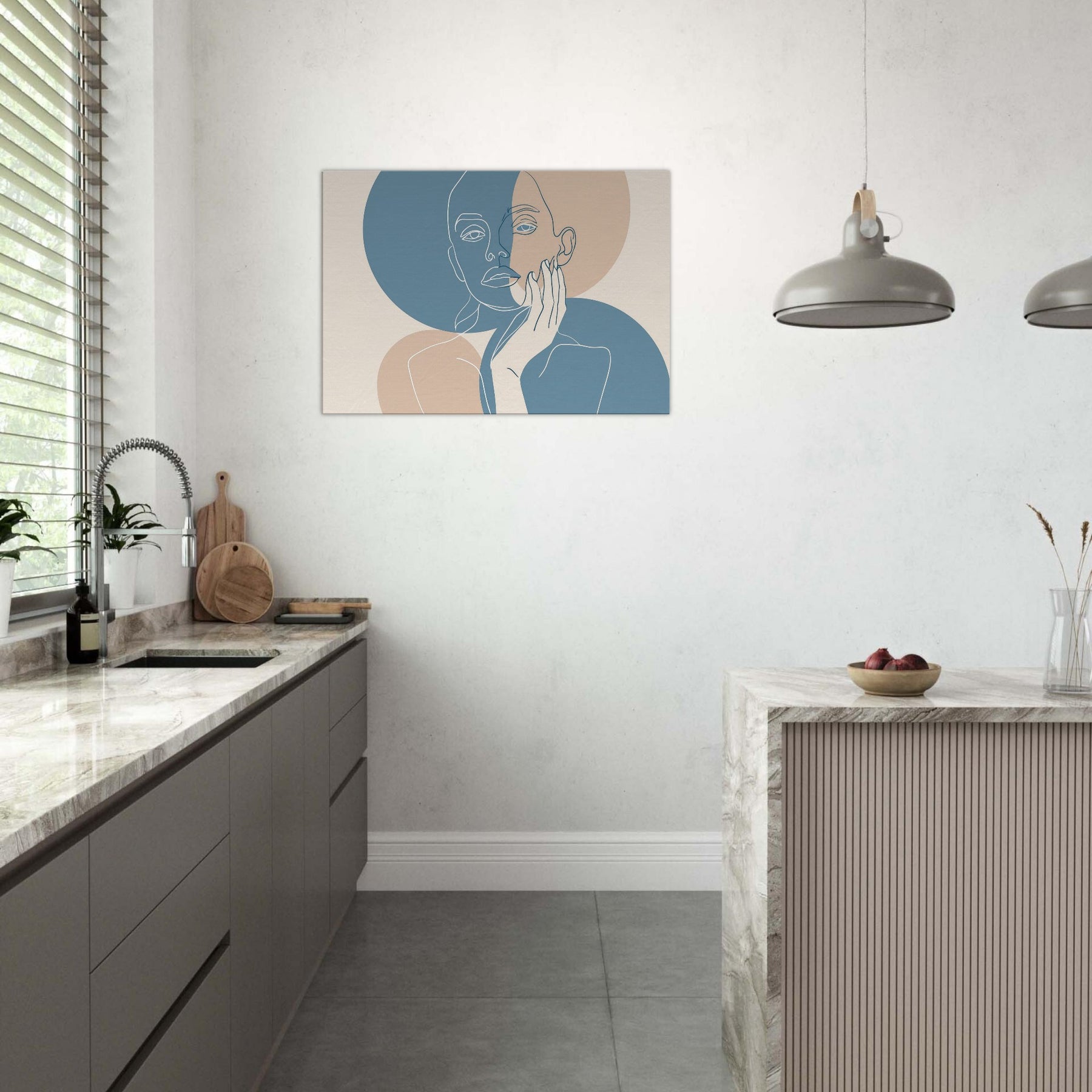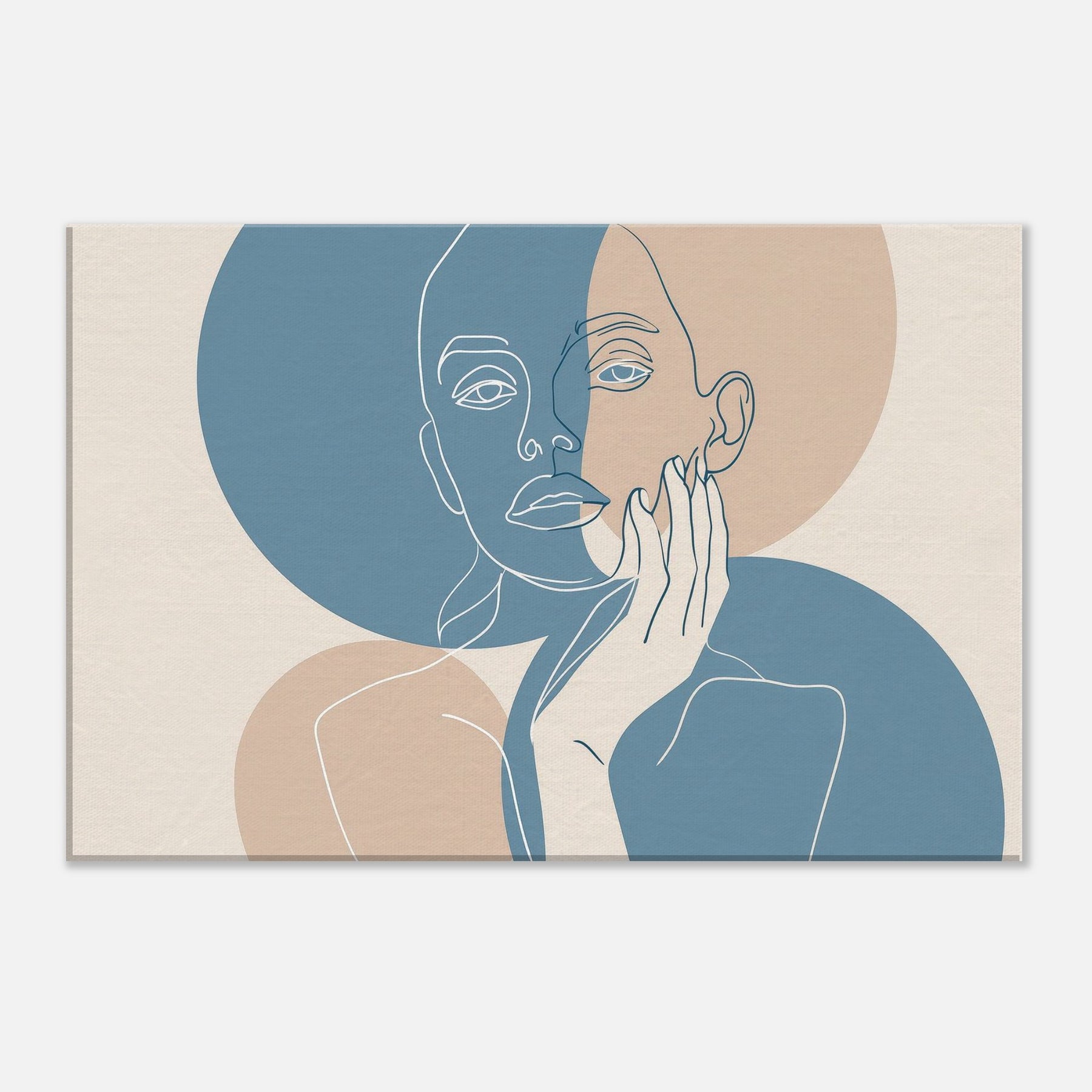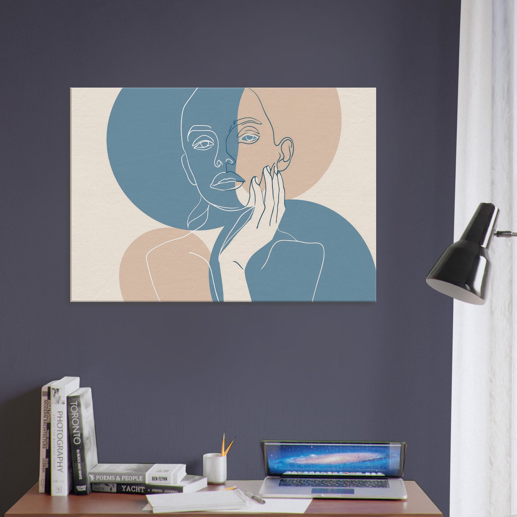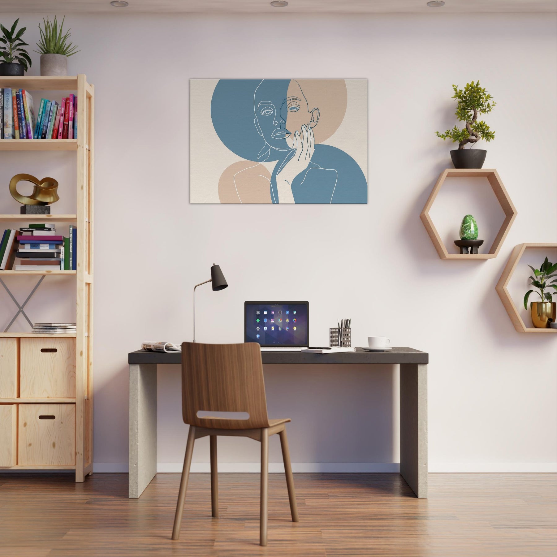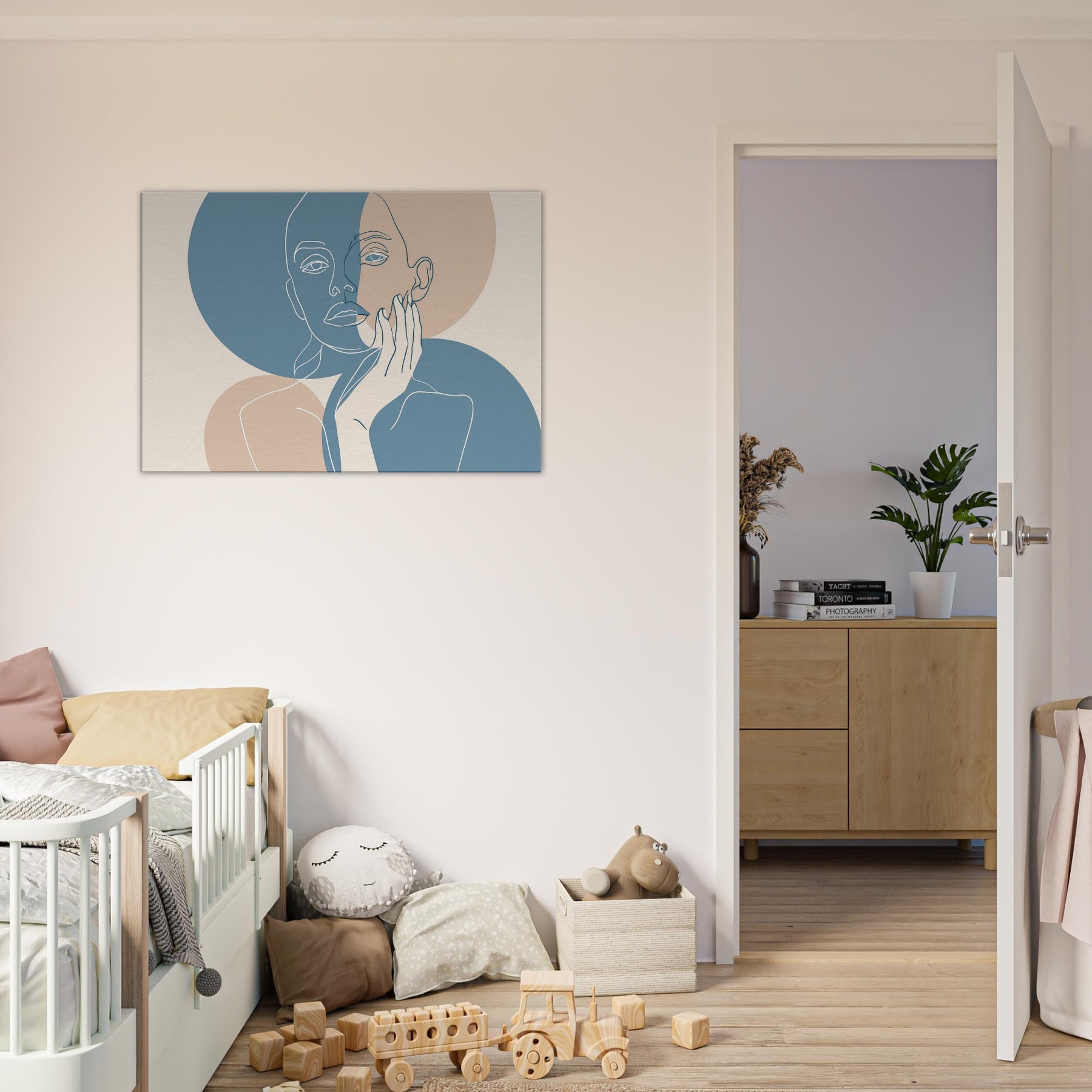 This piece centers on Hands Line Art, a minimalist study of gesture and connection. White contour lines trace two faces and a tender hand, set against soothing blue and warm beige shapes that breathe with soft light. The atmosphere feels intimate yet open, inviting quiet moments of reflection and gentle conversations with the space itself. Placed in a living room or hallway, it softens the room with its tactile calm and modern elegance, turning everyday walls into a sanctuary of connection and calm.