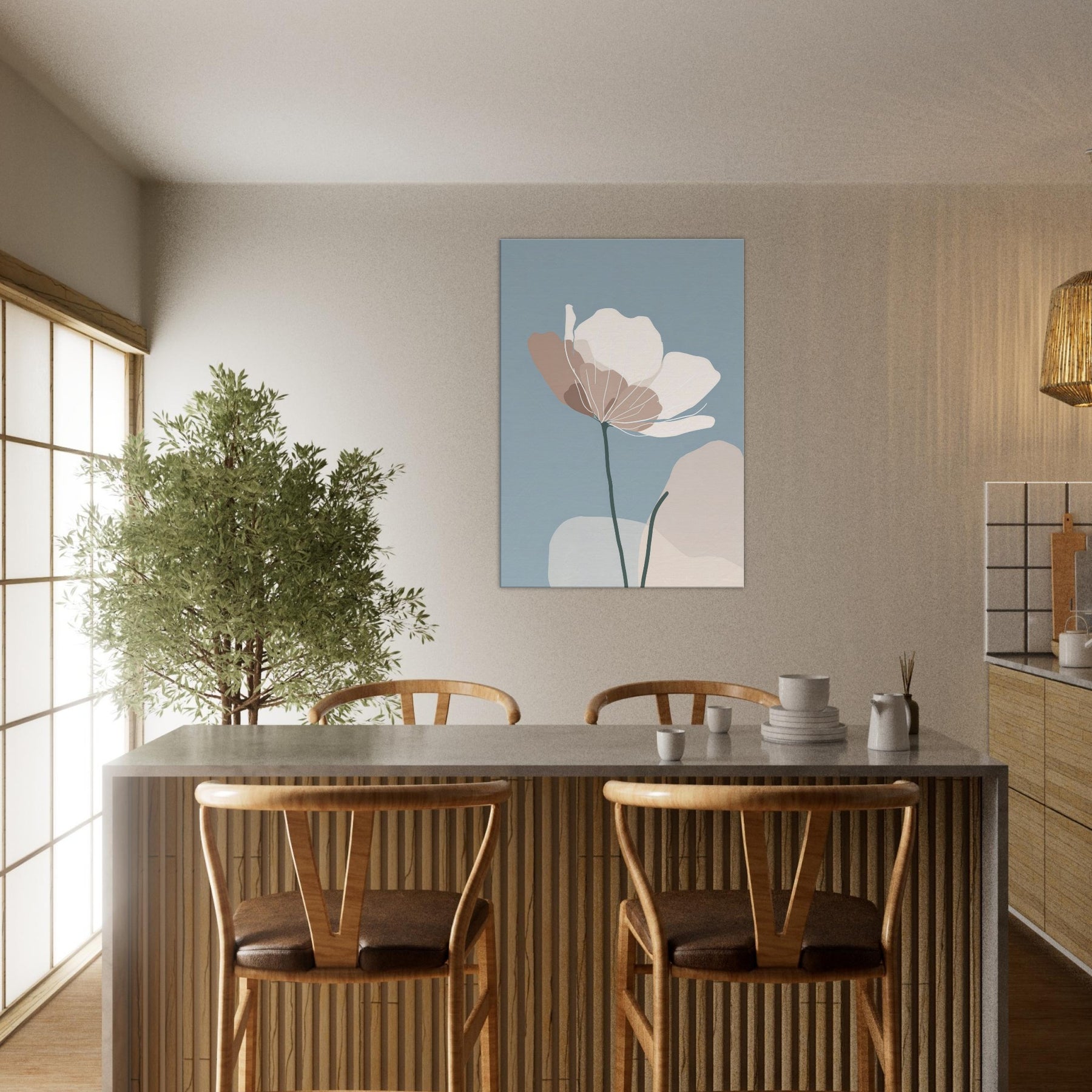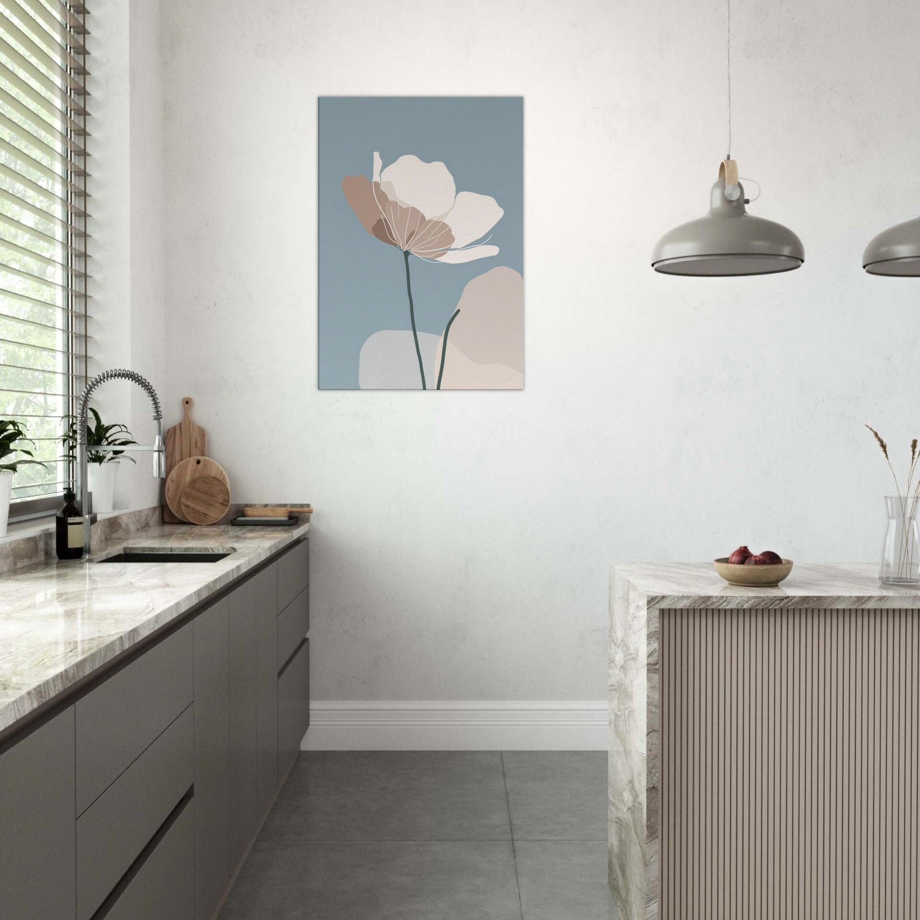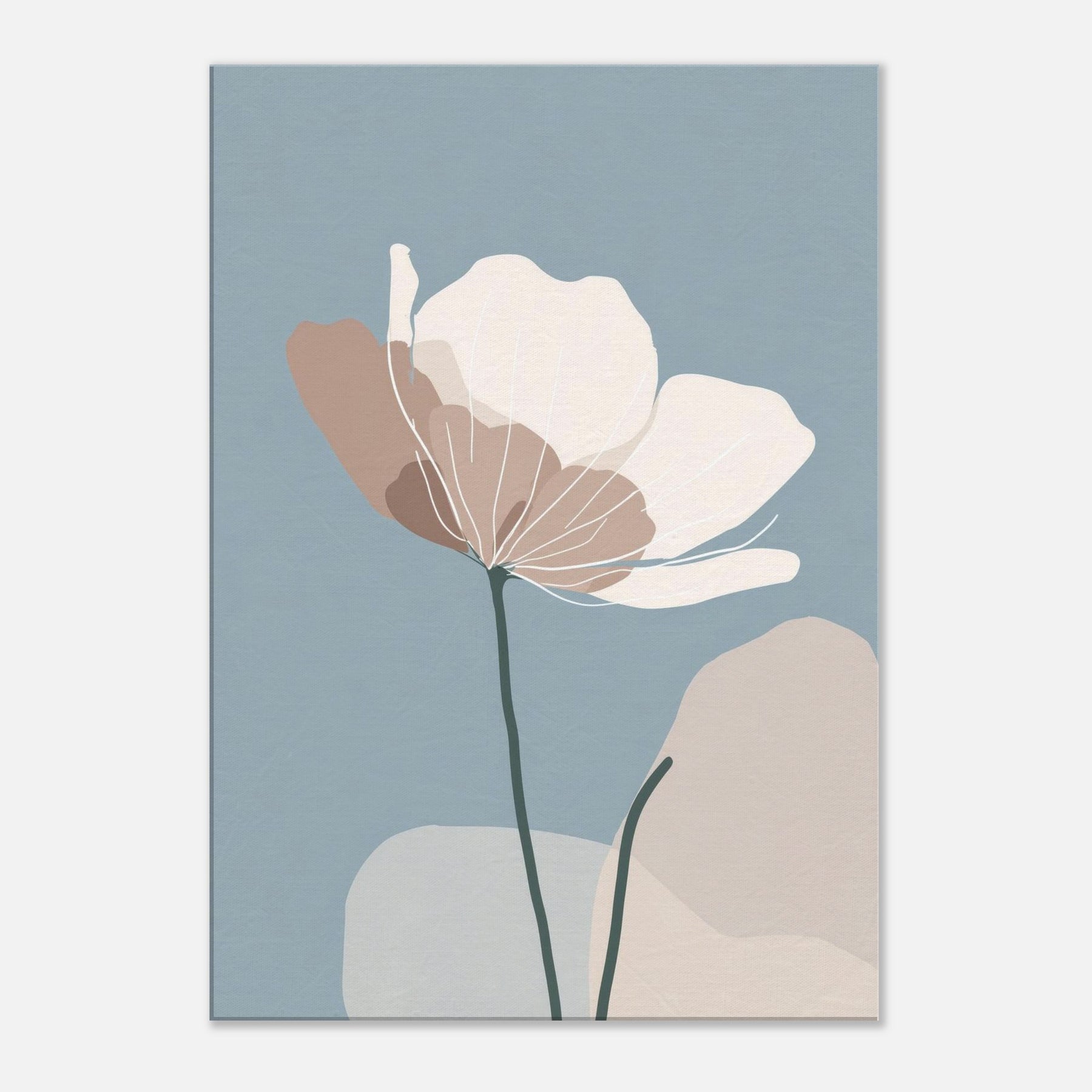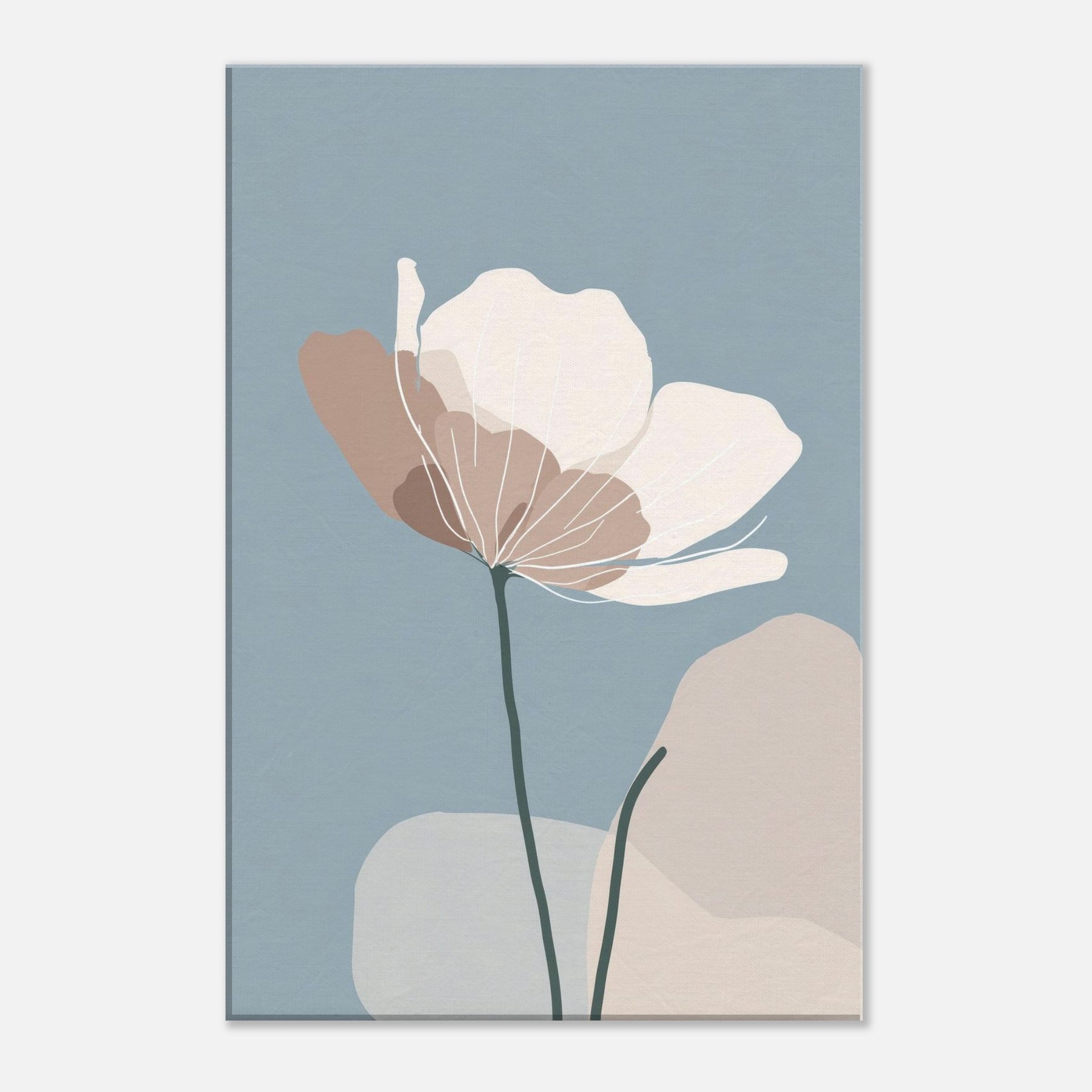 Anemone unfurls in a whisper of color against a serene blue field, its delicate silhouette rendered in soft taupe and ivory. The minimalist lines invite the eye to breathe, turning any wall into a quiet refuge where morning light spills gently across the room. The sculpture like stem anchors the composition, while the airy petals float with effortless grace an invitation to stillness. Place this piece in a living room or bedroom to evoke nature’s calm, and let the atmosphere soften conversations and rhythms of daily life.