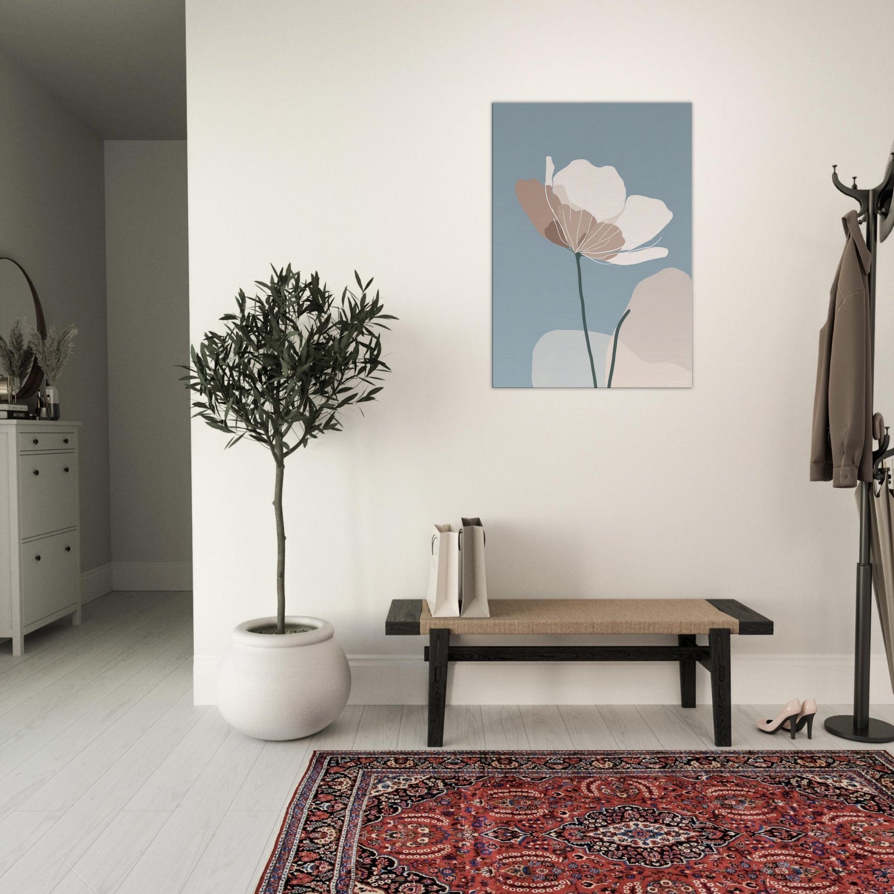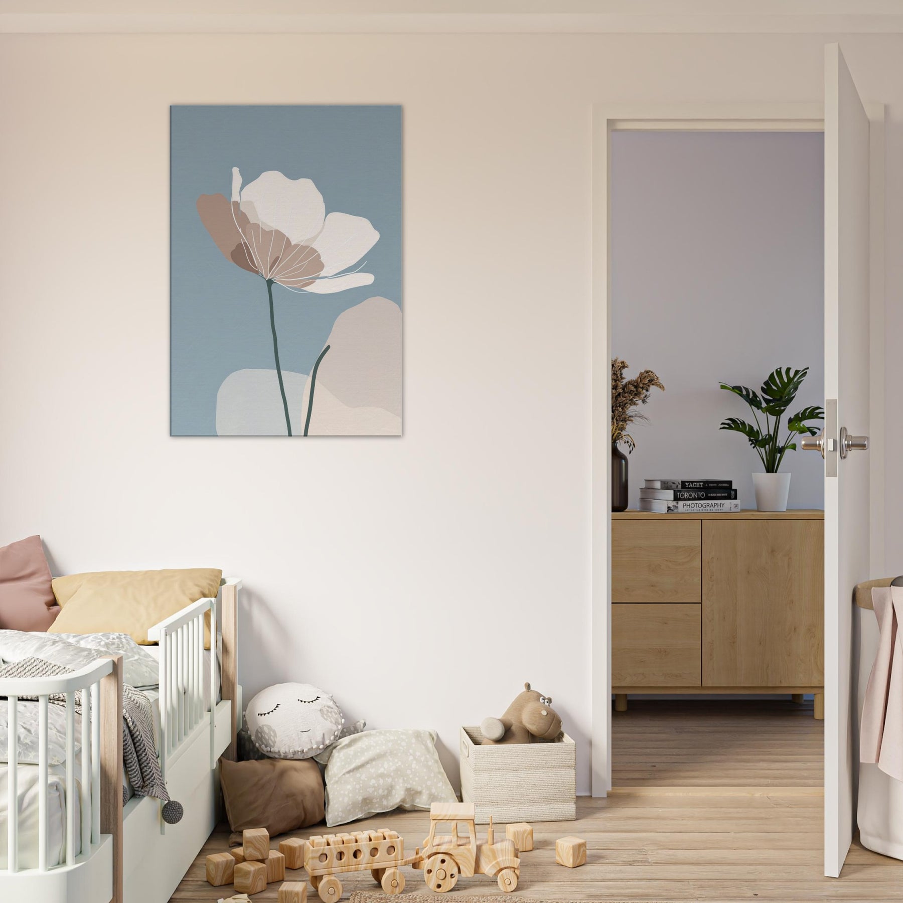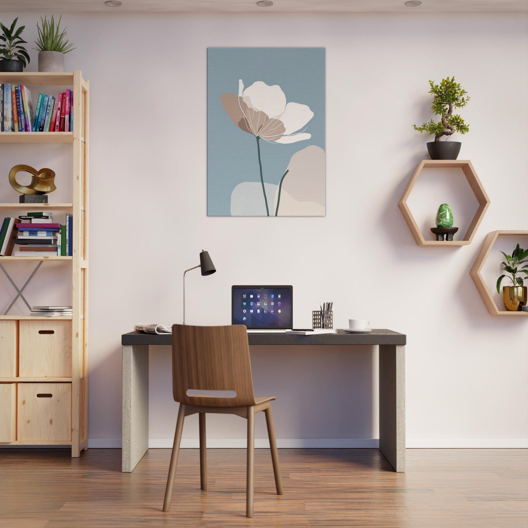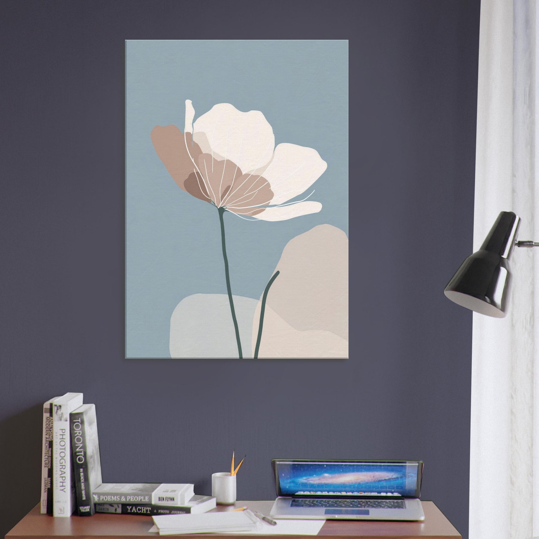 Anemone unfurls in a whisper of color against a serene blue field, its delicate silhouette rendered in soft taupe and ivory. The minimalist lines invite the eye to breathe, turning any wall into a quiet refuge where morning light spills gently across the room. The sculpture like stem anchors the composition, while the airy petals float with effortless grace an invitation to stillness. Place this piece in a living room or bedroom to evoke nature’s calm, and let the atmosphere soften conversations and rhythms of daily life.
