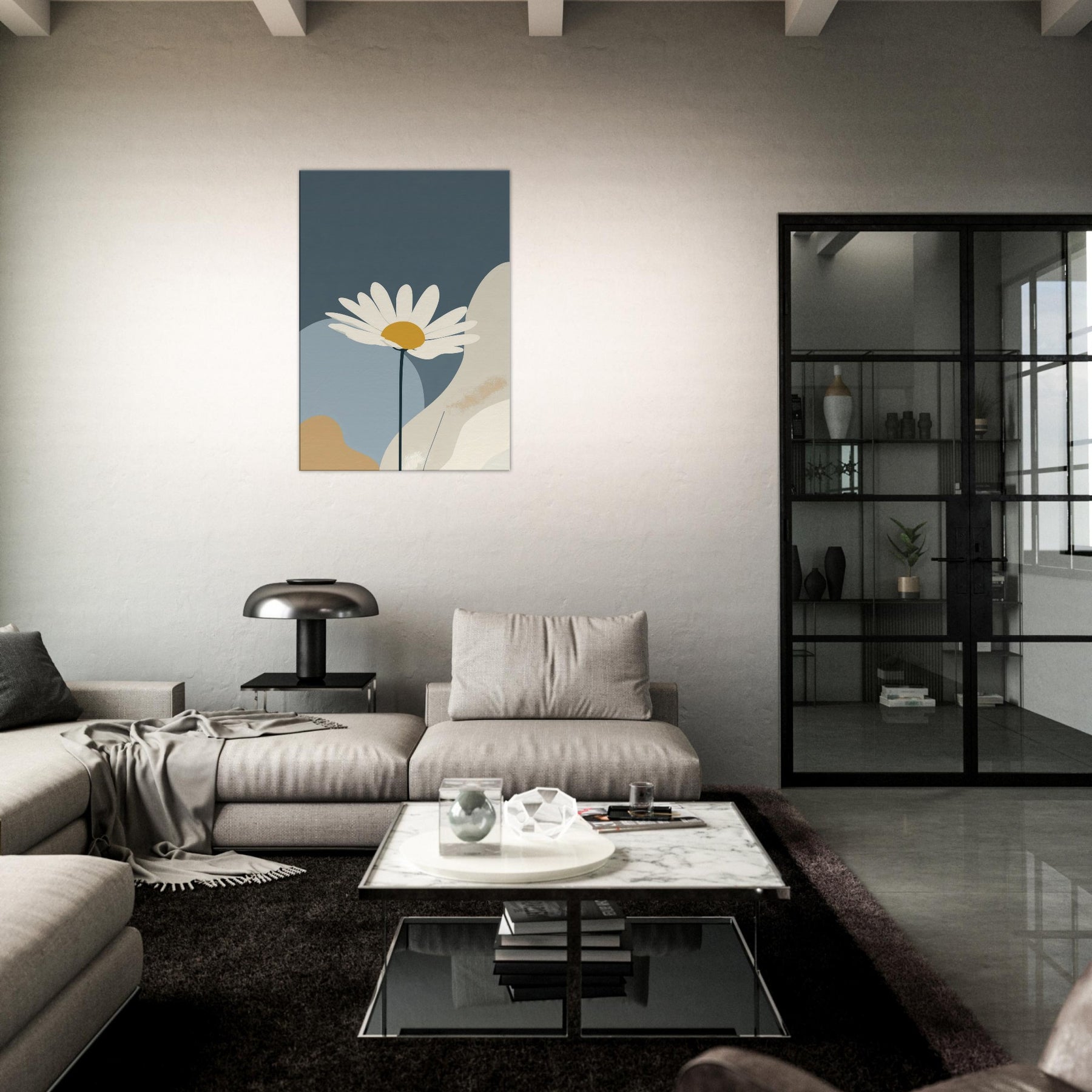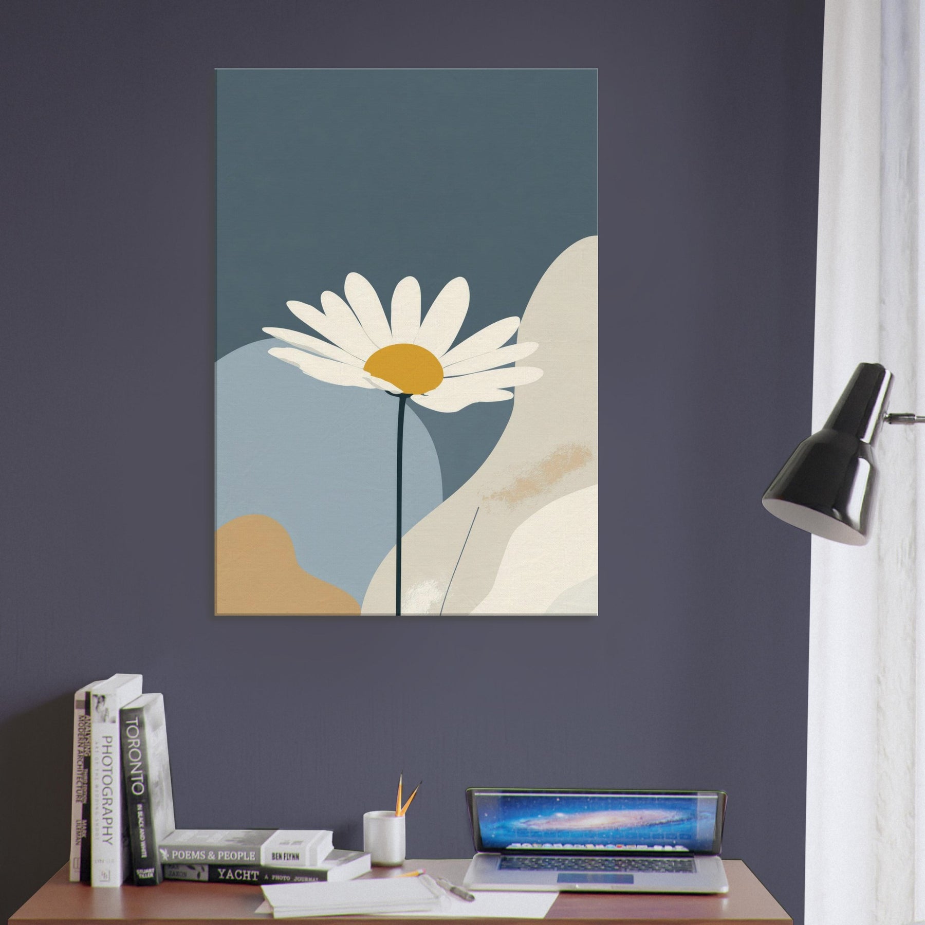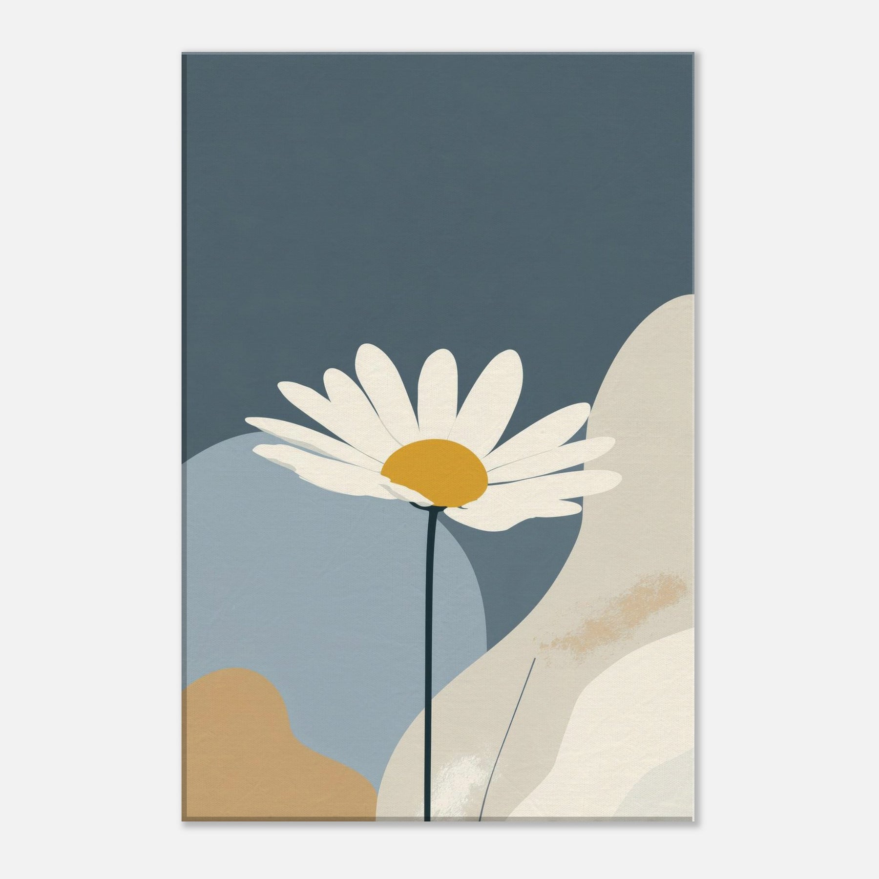 Let the clean line of a single Daisy unfurl across a quiet field of color. This minimalist study invites calm into your living space, turning daily moments into a hush of light and space. The Daisy’s white petals and sunny center float above muted blues and creams, like a sunlit bloom resting on a tranquil horizon. Framed with generous negative space, it creates a gentle focal point that elevates your walls without shouting, perfect for serene, everyday elegance.