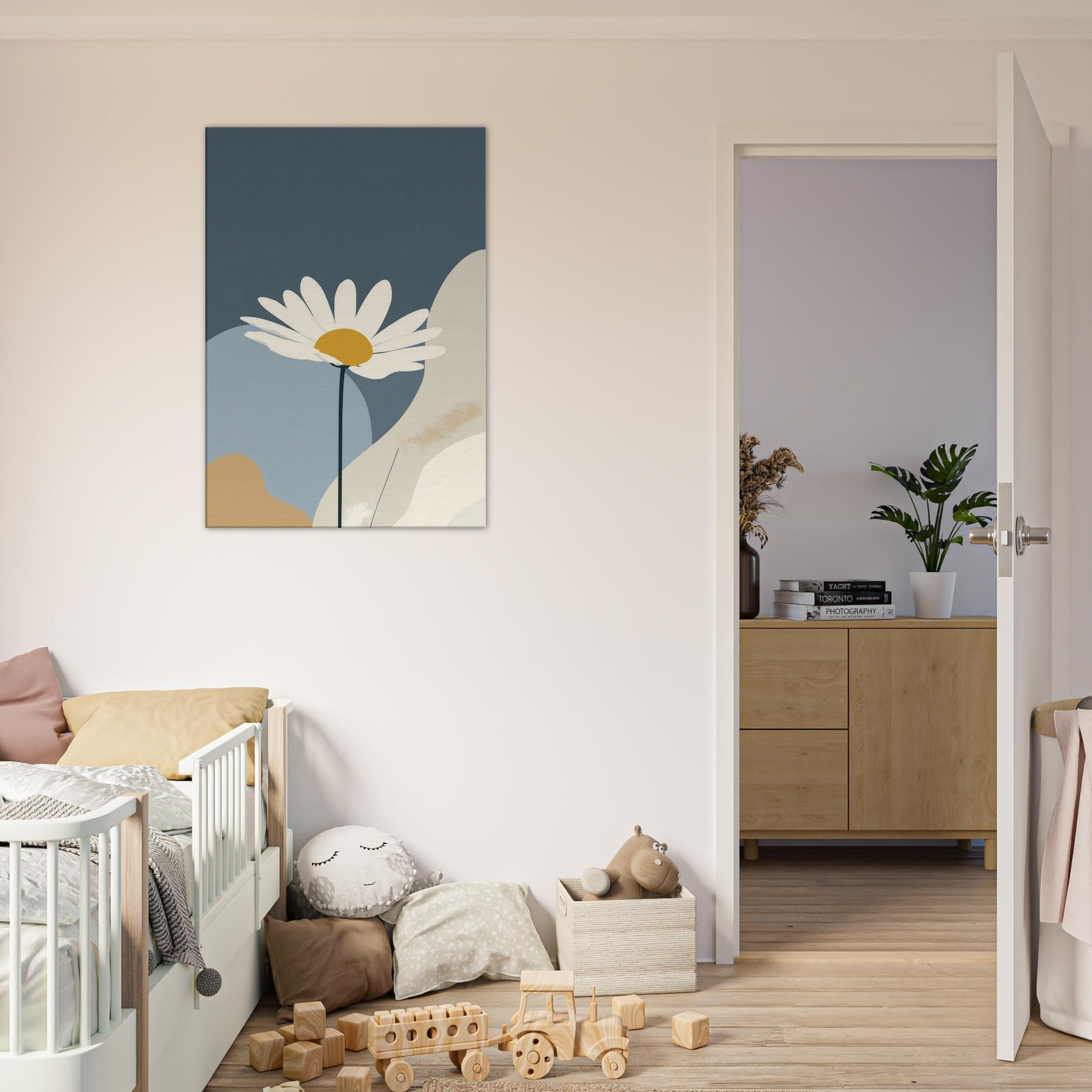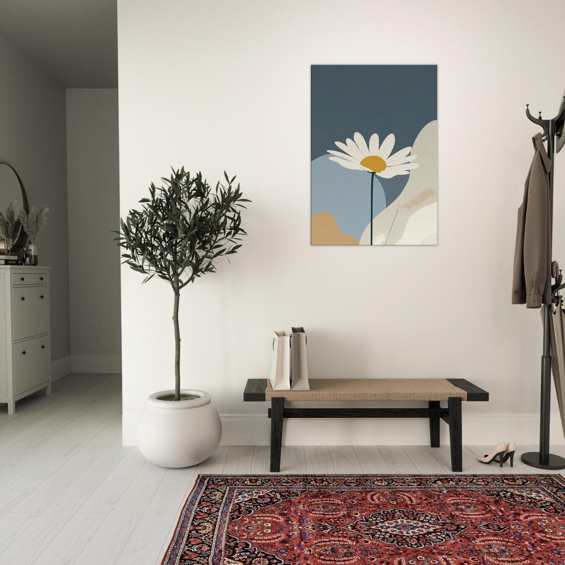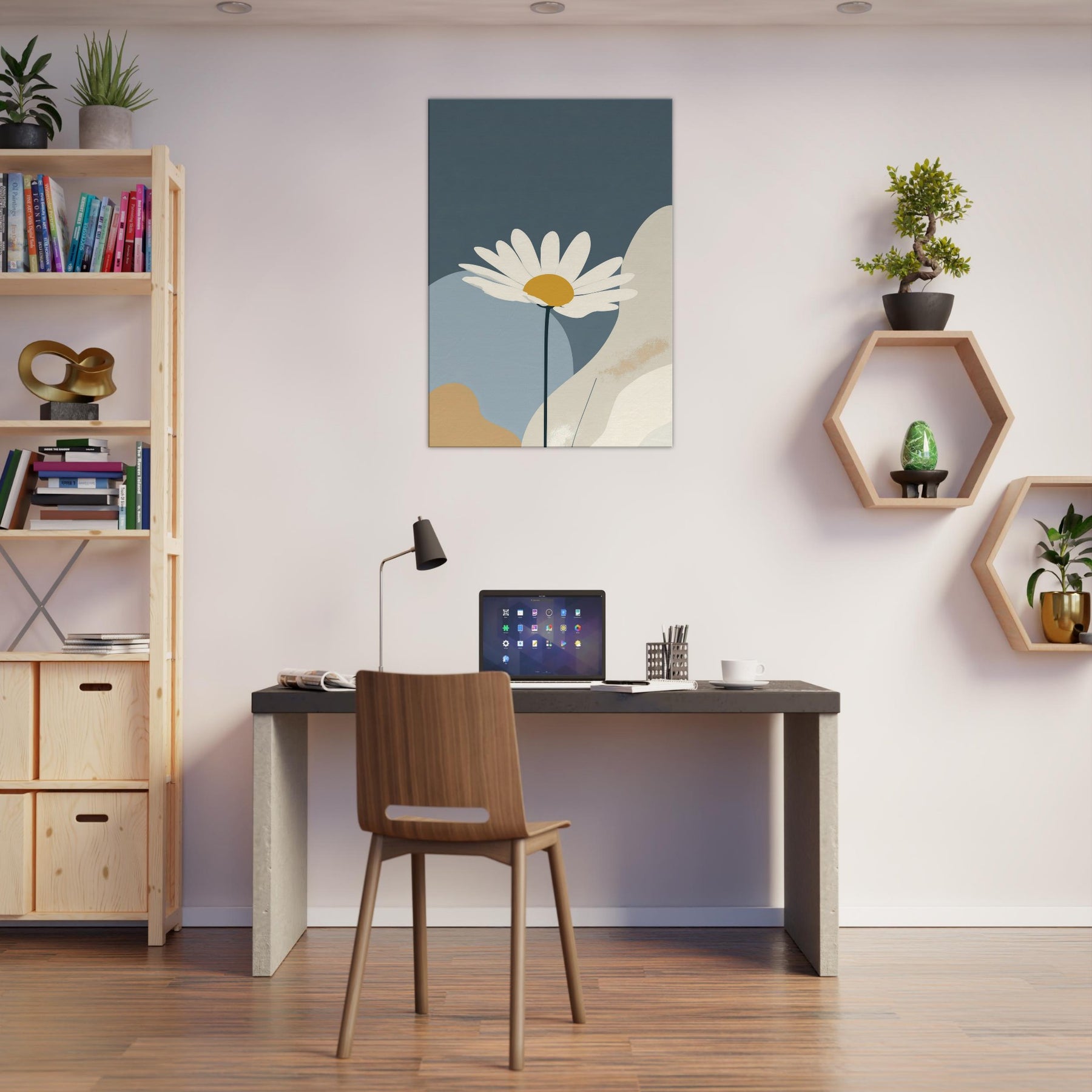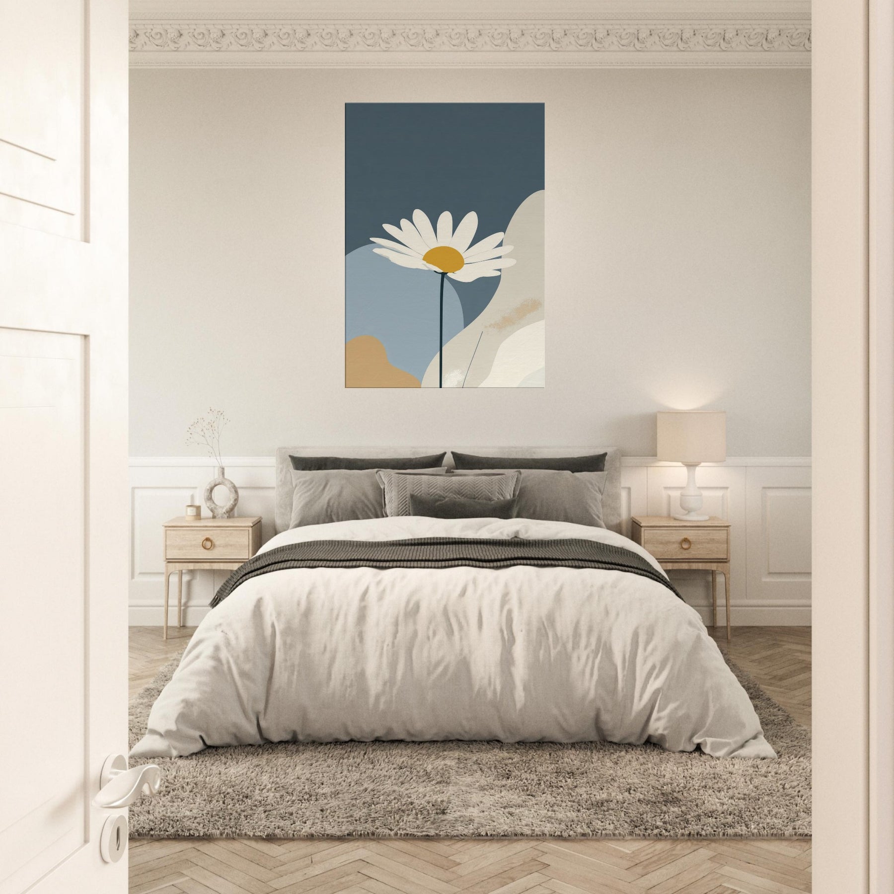 Let the clean line of a single Daisy unfurl across a quiet field of color. This minimalist study invites calm into your living space, turning daily moments into a hush of light and space. The Daisy’s white petals and sunny center float above muted blues and creams, like a sunlit bloom resting on a tranquil horizon. Framed with generous negative space, it creates a gentle focal point that elevates your walls without shouting, perfect for serene, everyday elegance.