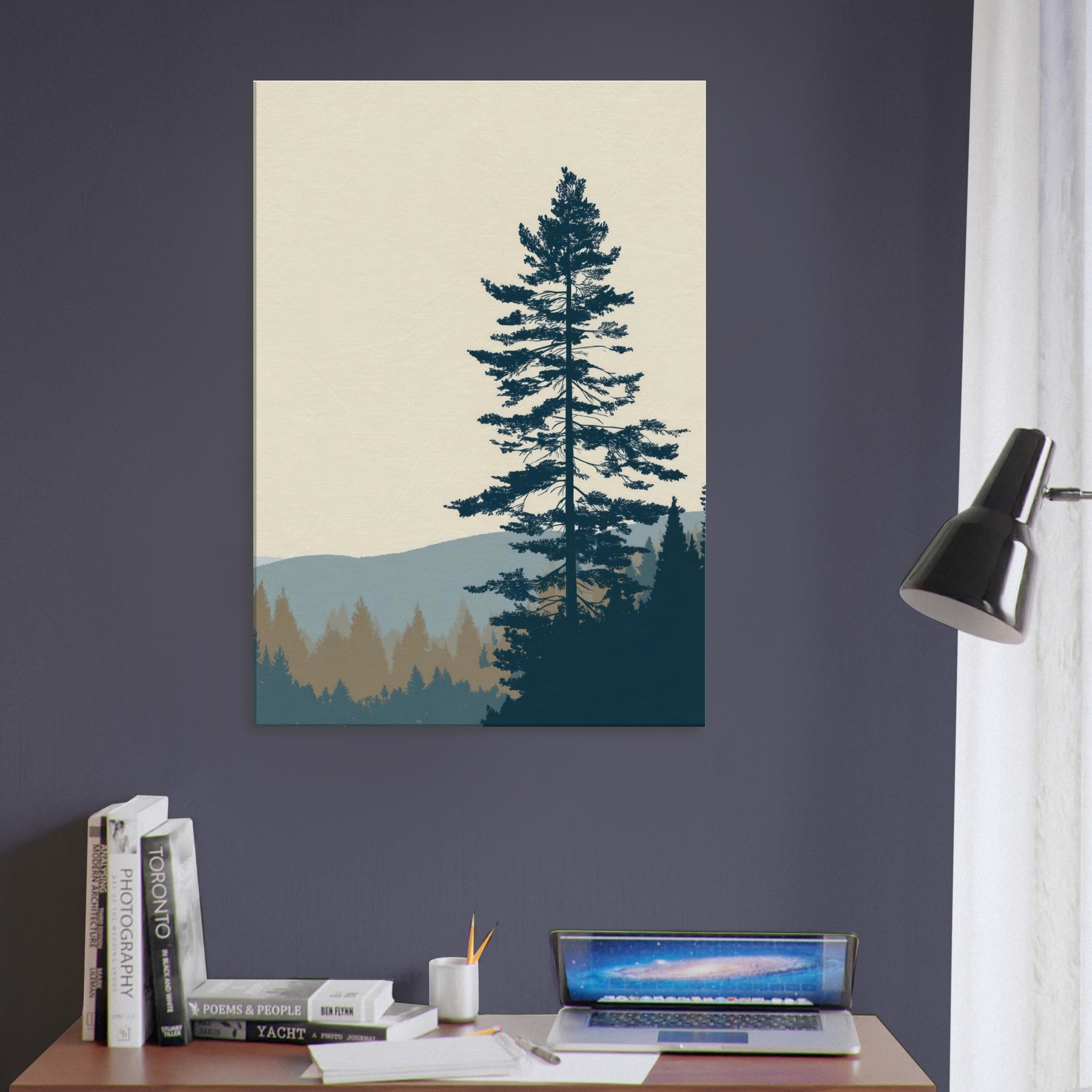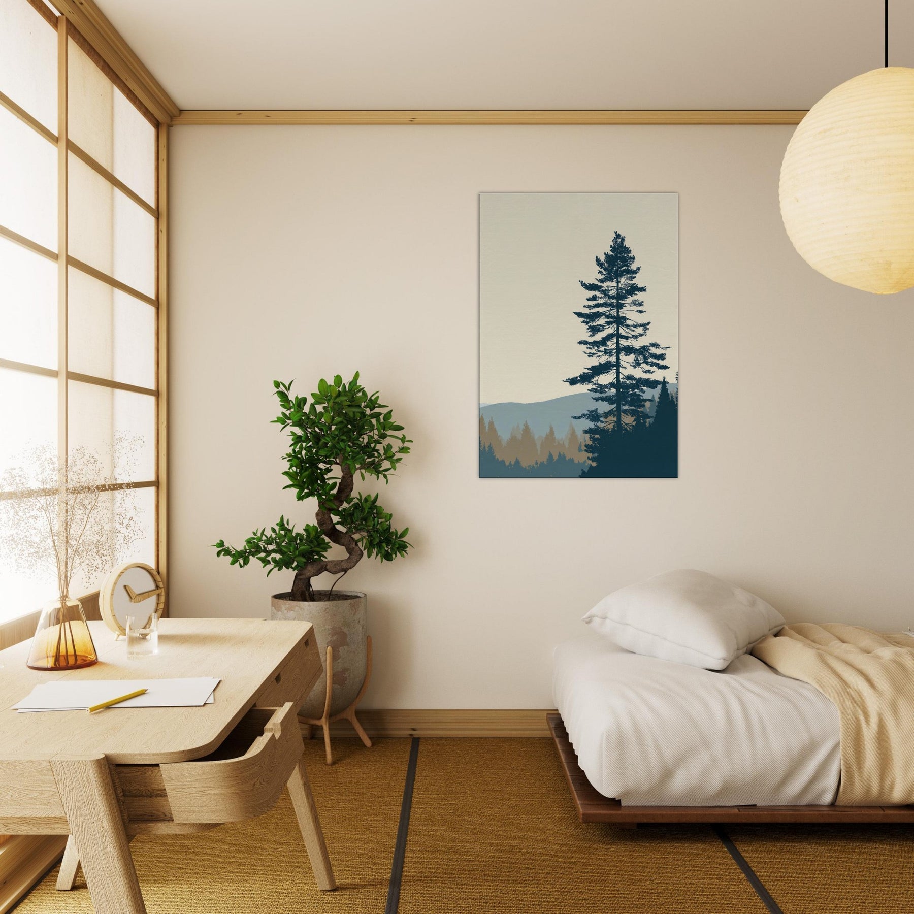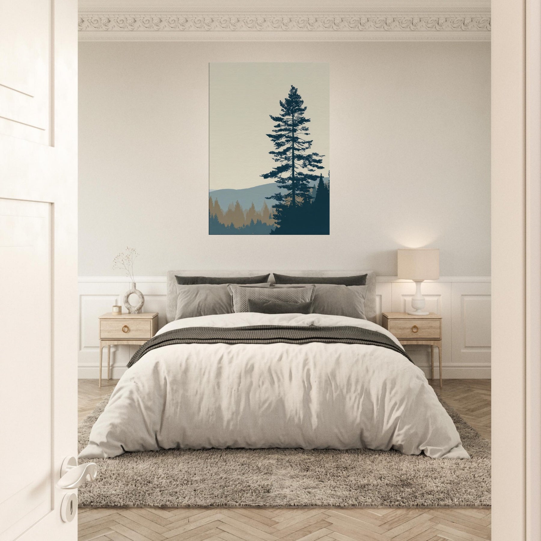 Step into the Boreal Forest through minimalist lens: a calm, monochrome silhouette set against soft horizons. This wall art uses negative space and restrained tones to echo quiet mornings, pine needles like delicate threads, and the distant hills in tranquil blues. In your living space, it grounds the room with stillness, inviting slow breaths and reflective moments. Perfect for a serene lounge, bedroom, or office, it brings nature’s hush into everyday life with elegant restraint.