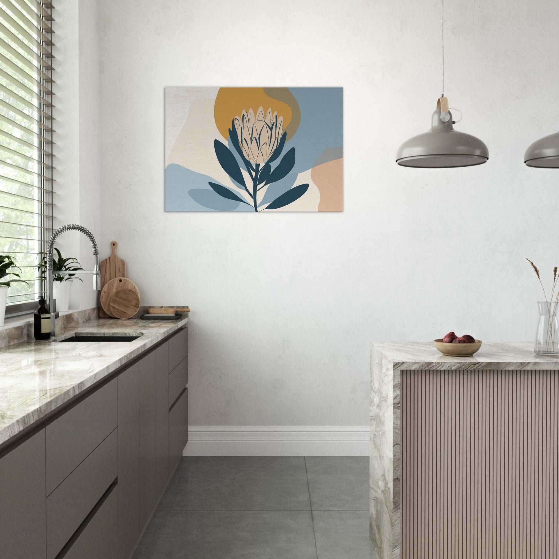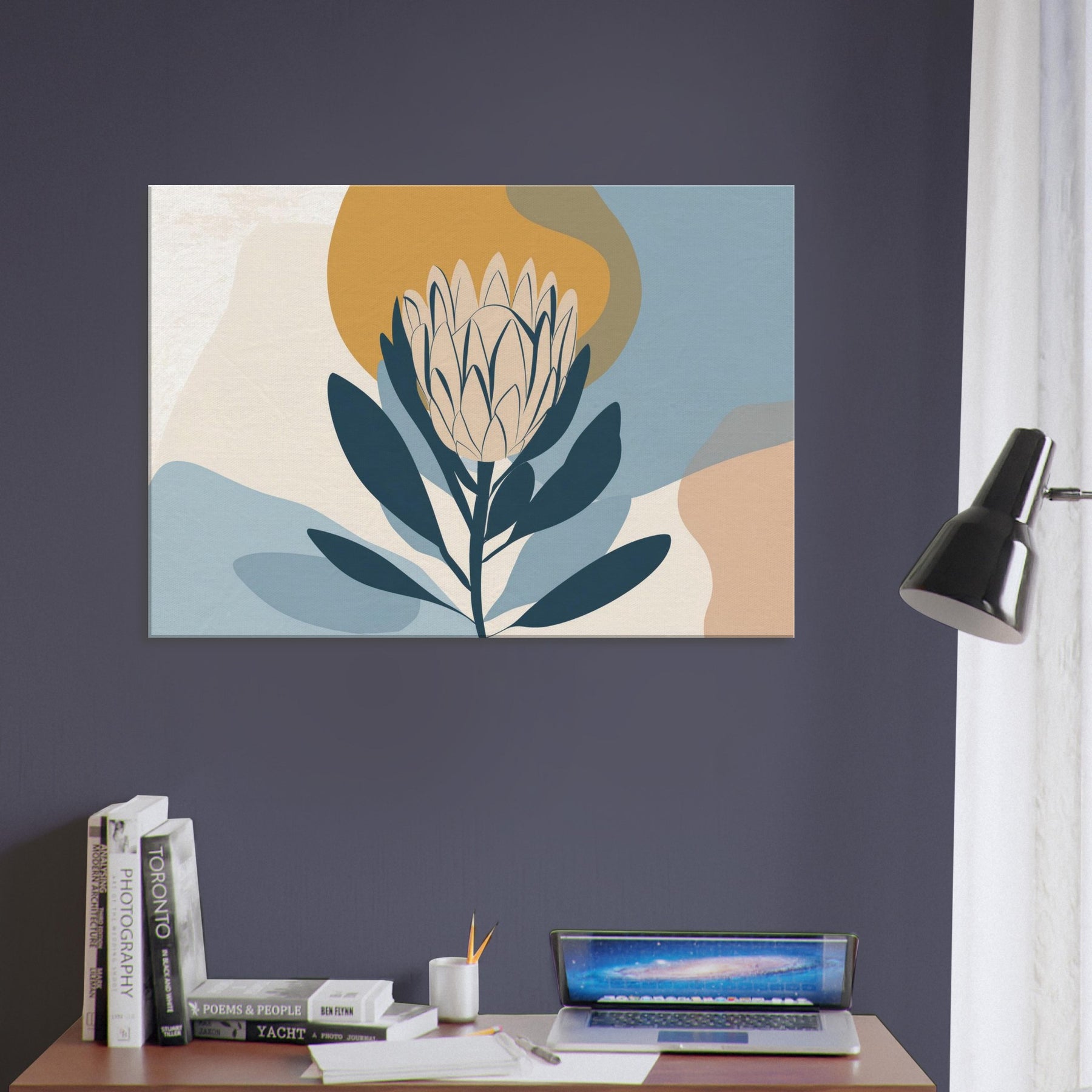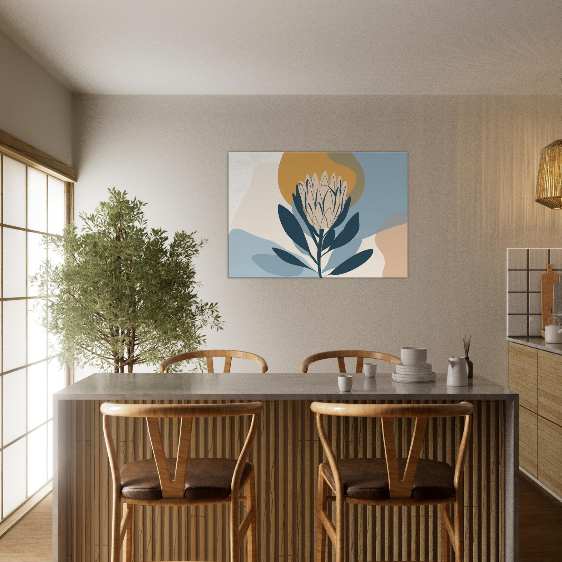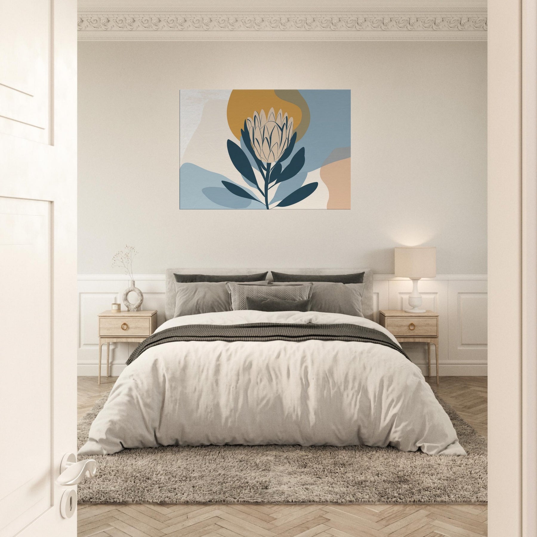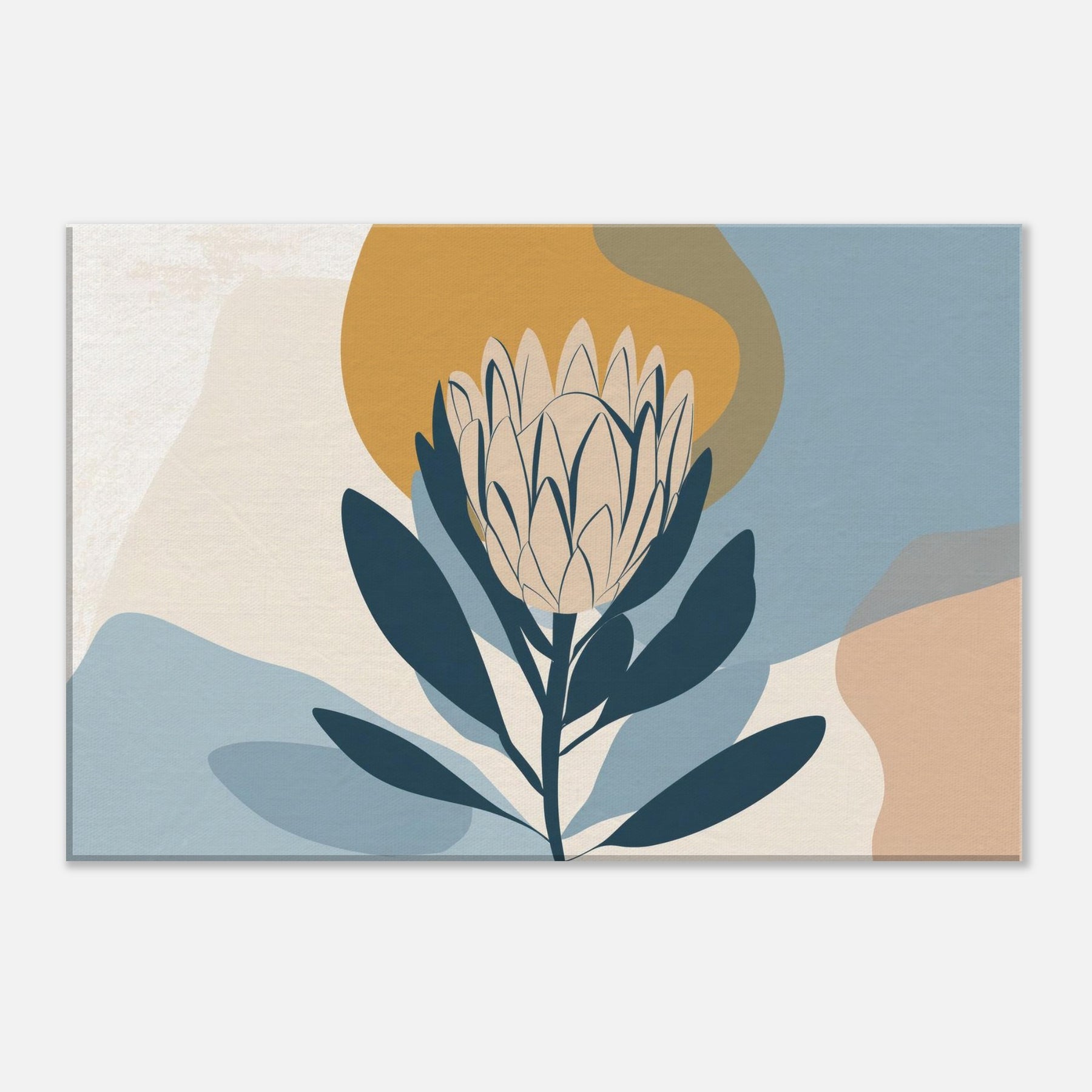 Softly sculpted and serene, this minimalist study of the Protea invites quiet contemplation. The restrained palette dusty blues, pale creams, and a warm ochre halo enfolds the bloom in a tranquil atmosphere, as if dawn were resting on the room. Perfect for a living area or bedroom, it pairs with natural woods and neutral textiles to create a calm focal point that breathes light and space. A refined, nature inspired accent that elevates everyday moments.