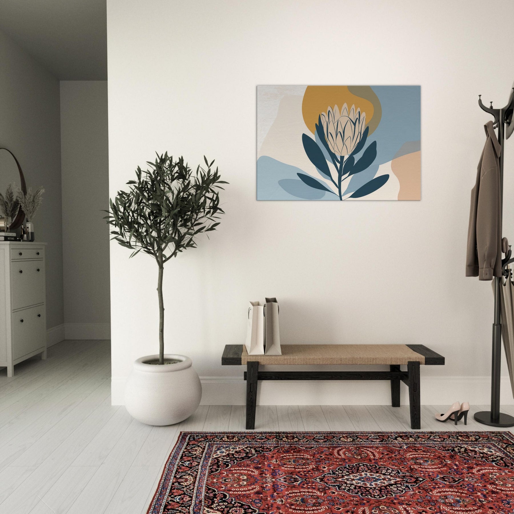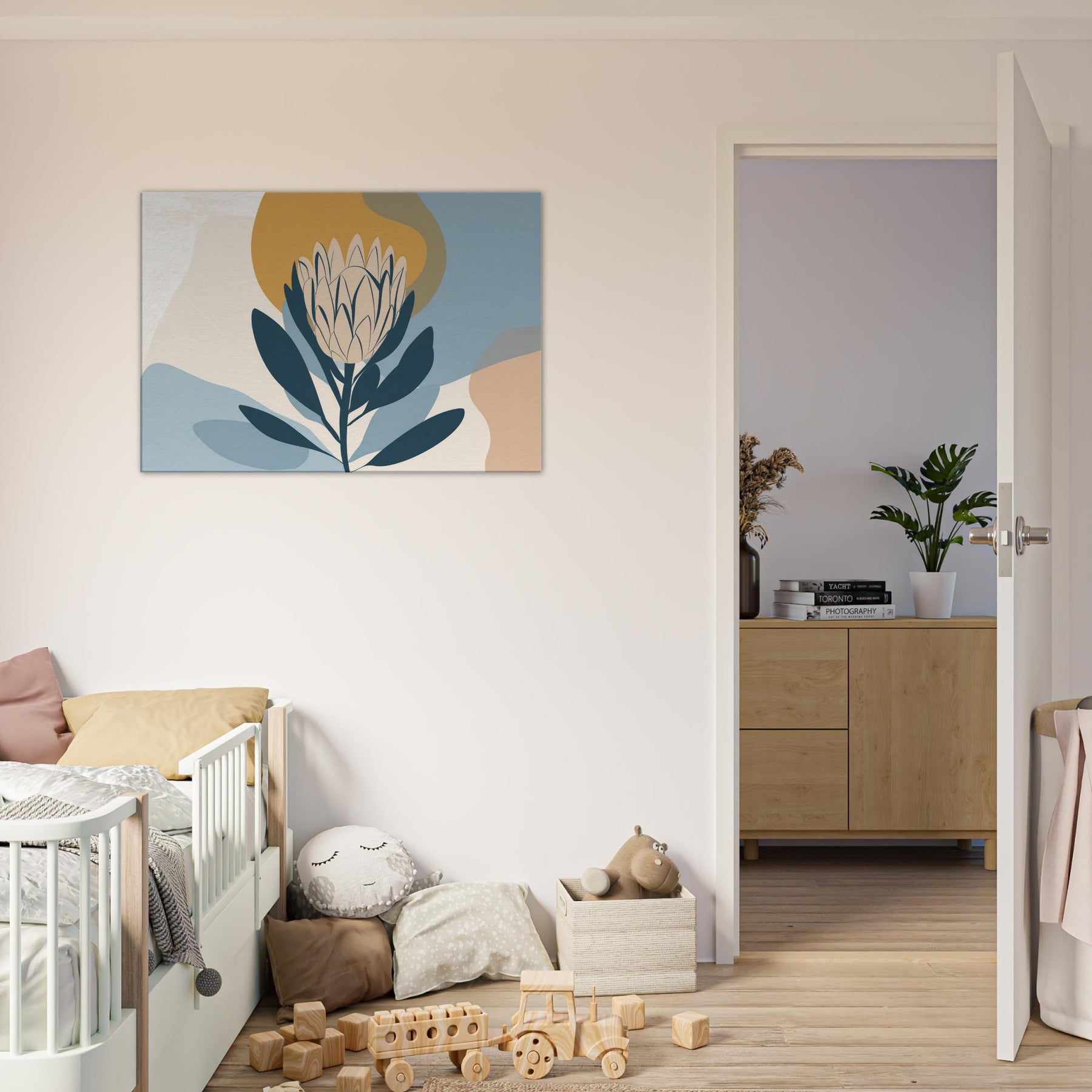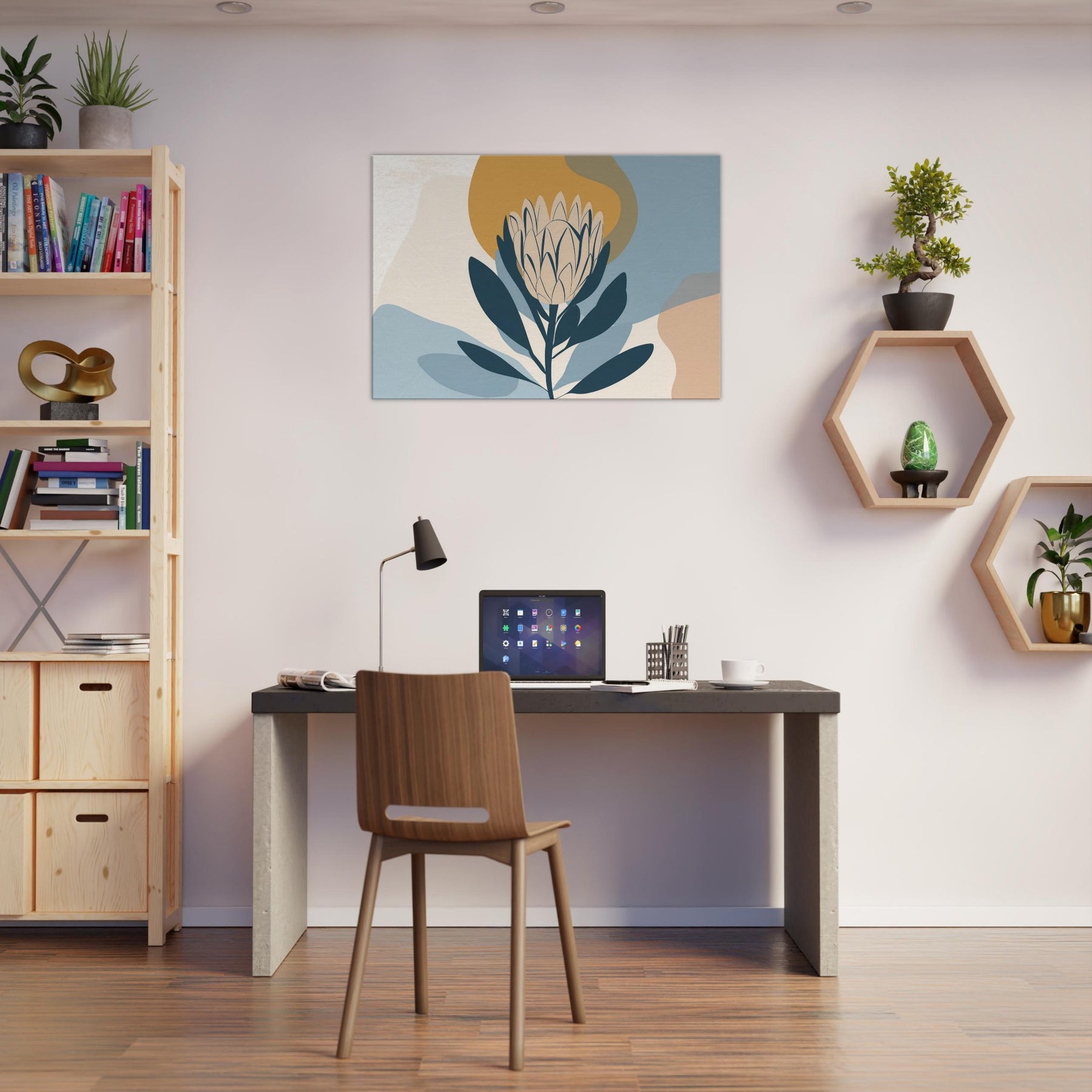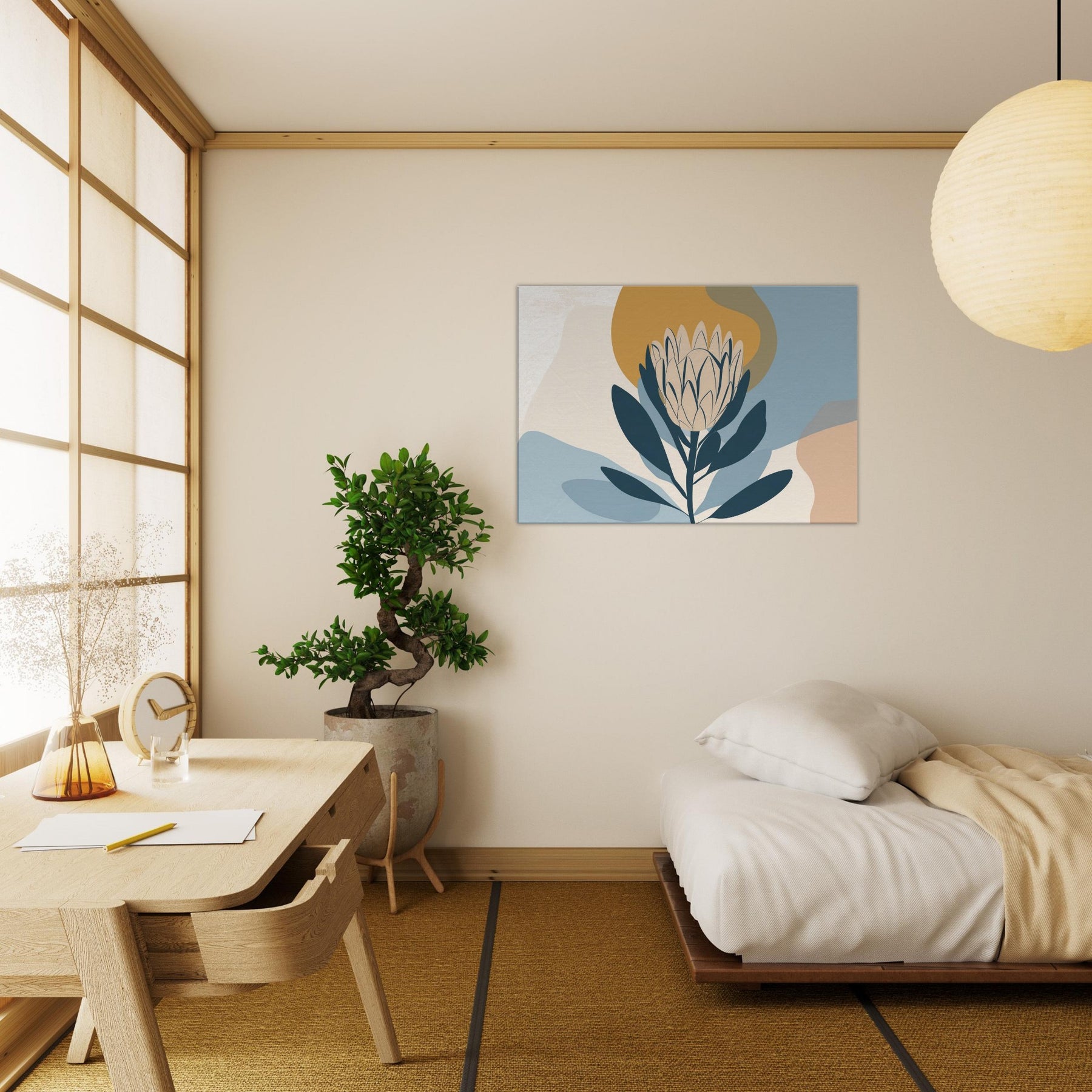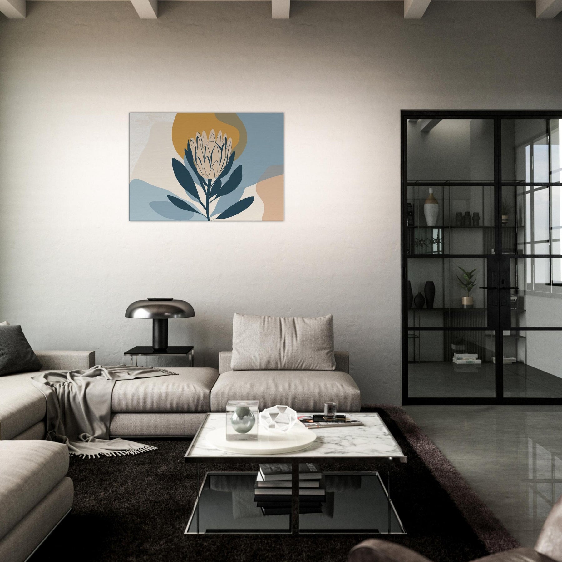 Softly sculpted and serene, this minimalist study of the Protea invites quiet contemplation. The restrained palette dusty blues, pale creams, and a warm ochre halo enfolds the bloom in a tranquil atmosphere, as if dawn were resting on the room. Perfect for a living area or bedroom, it pairs with natural woods and neutral textiles to create a calm focal point that breathes light and space. A refined, nature inspired accent that elevates everyday moments.