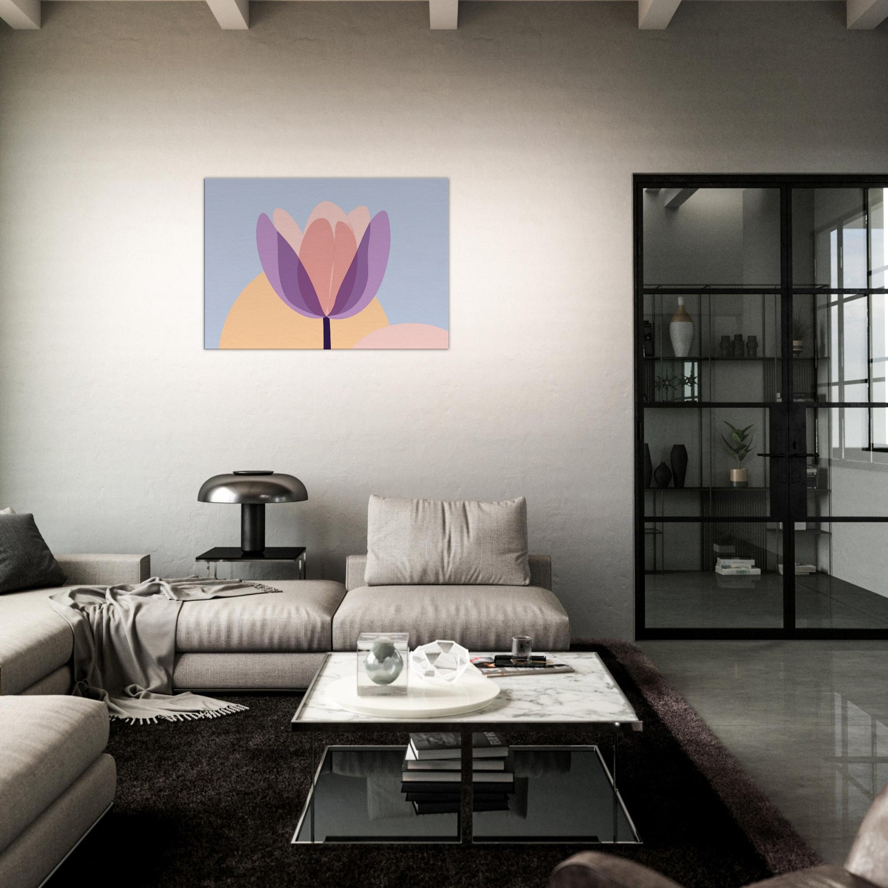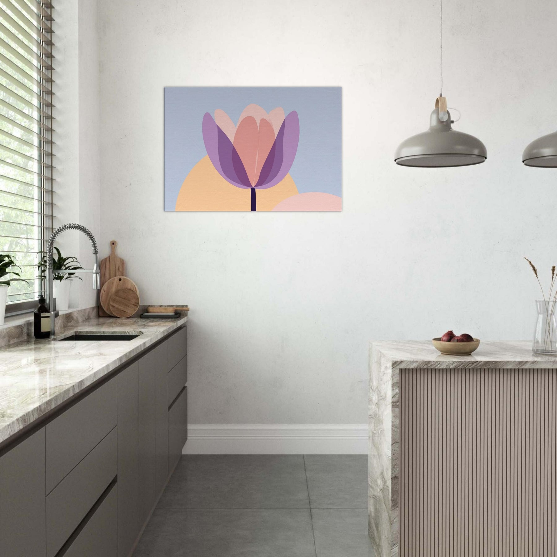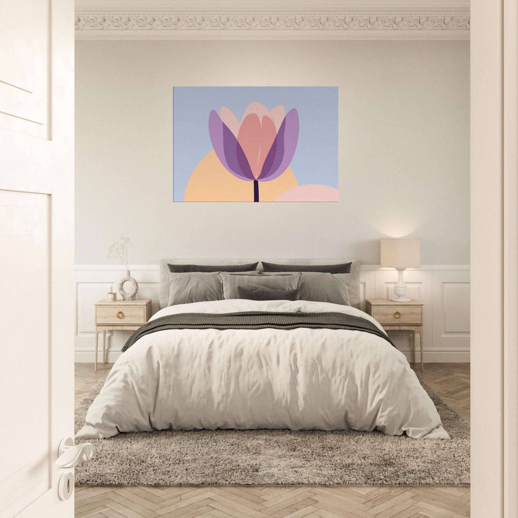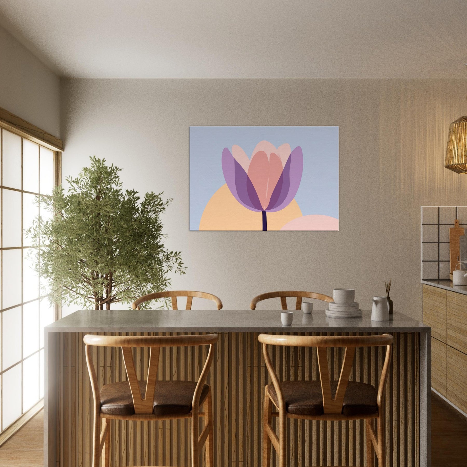 Effortless grace unfolds in a quiet tulip, rendered in clean planes of lilac, peach, and ash against a pale sky. This minimalist composition invites meditation as light travels across color fields, turning everyday corners into a moment of calm. The Tulip stands as a gentle reminder of nature's simplest rituals: growth, shelter, blooming, softly echoed in the rounded forms that hover like petals caught in a breeze. Hang this piece where conversation fades and presence deepens, and let color, rhythm, and quiet become your living space atmosphere.