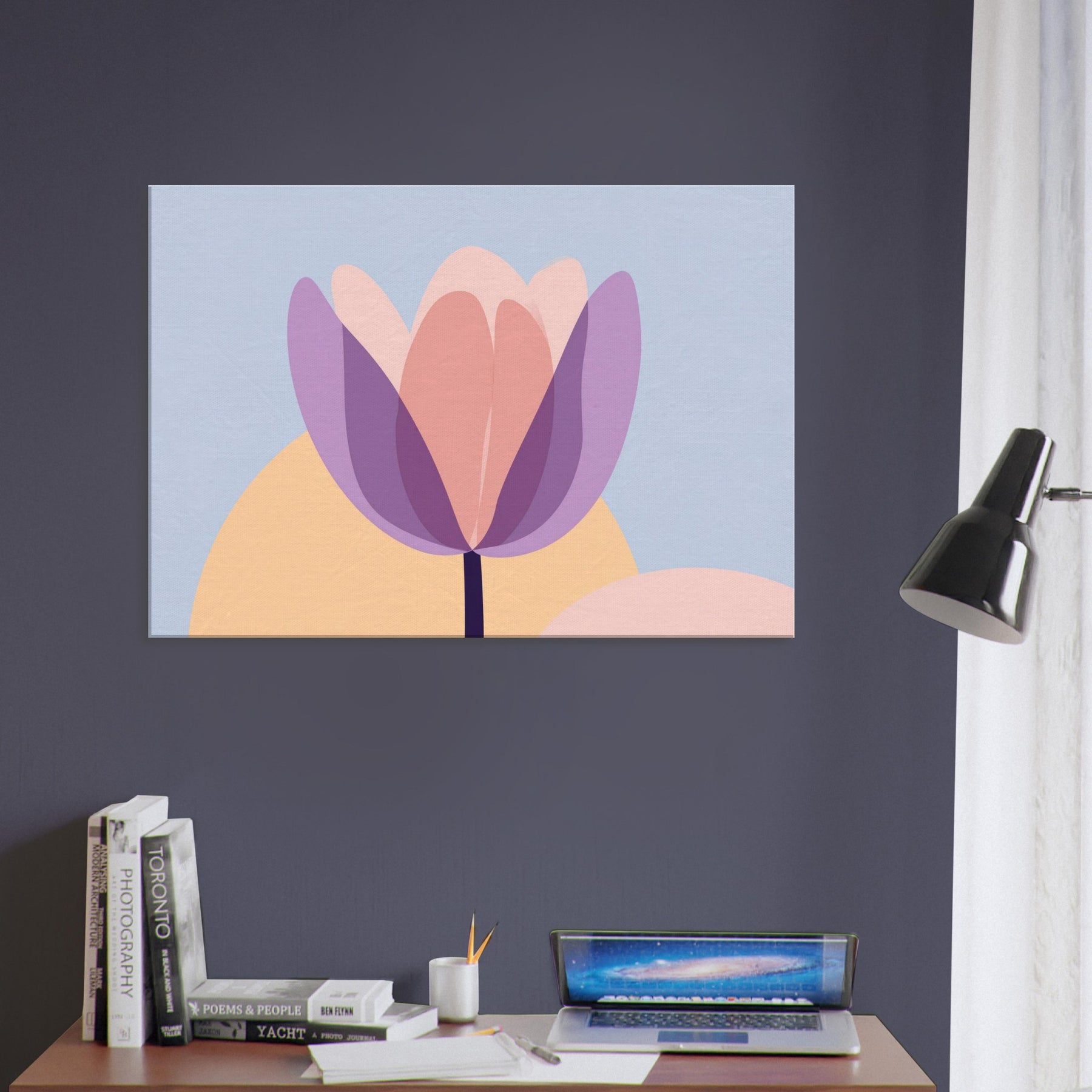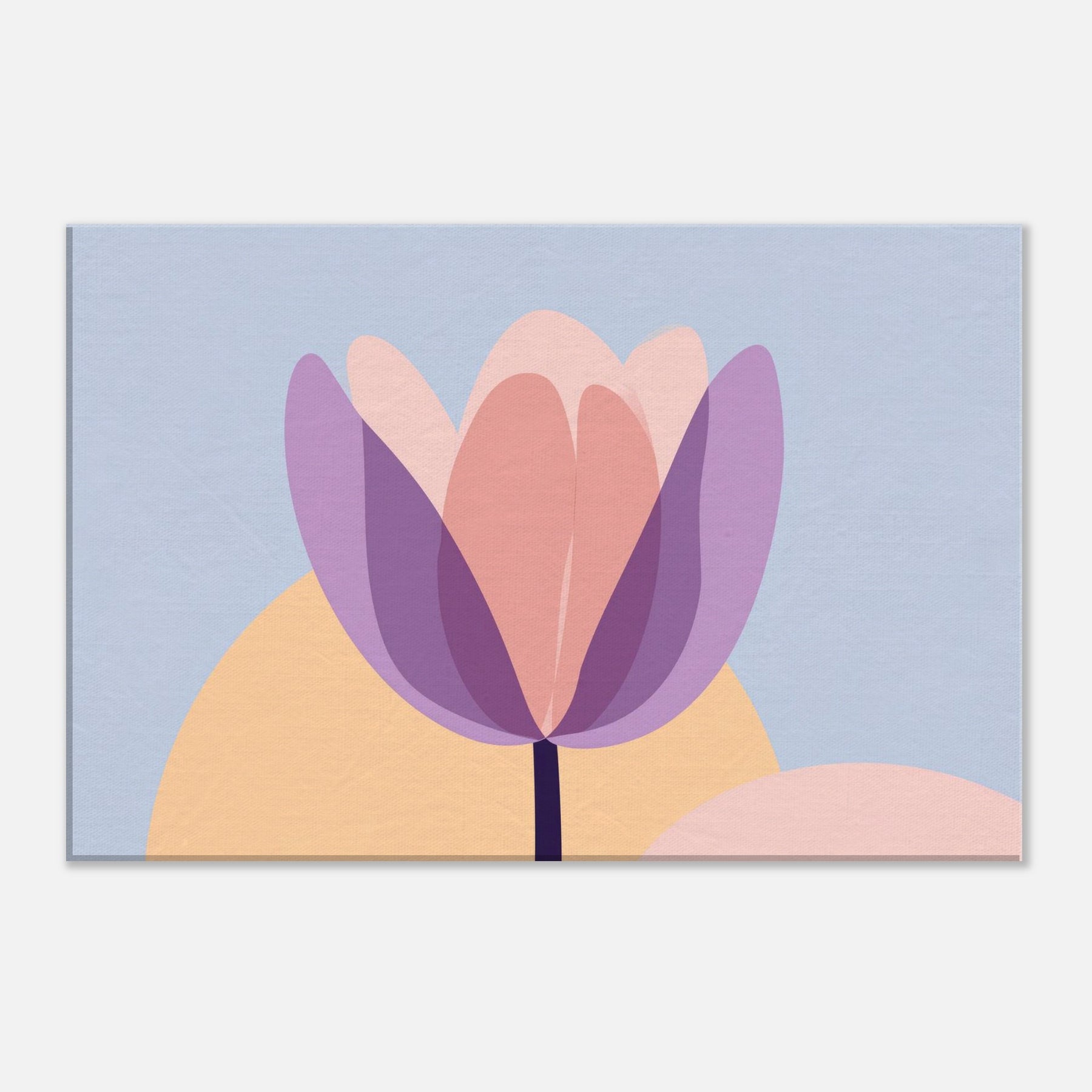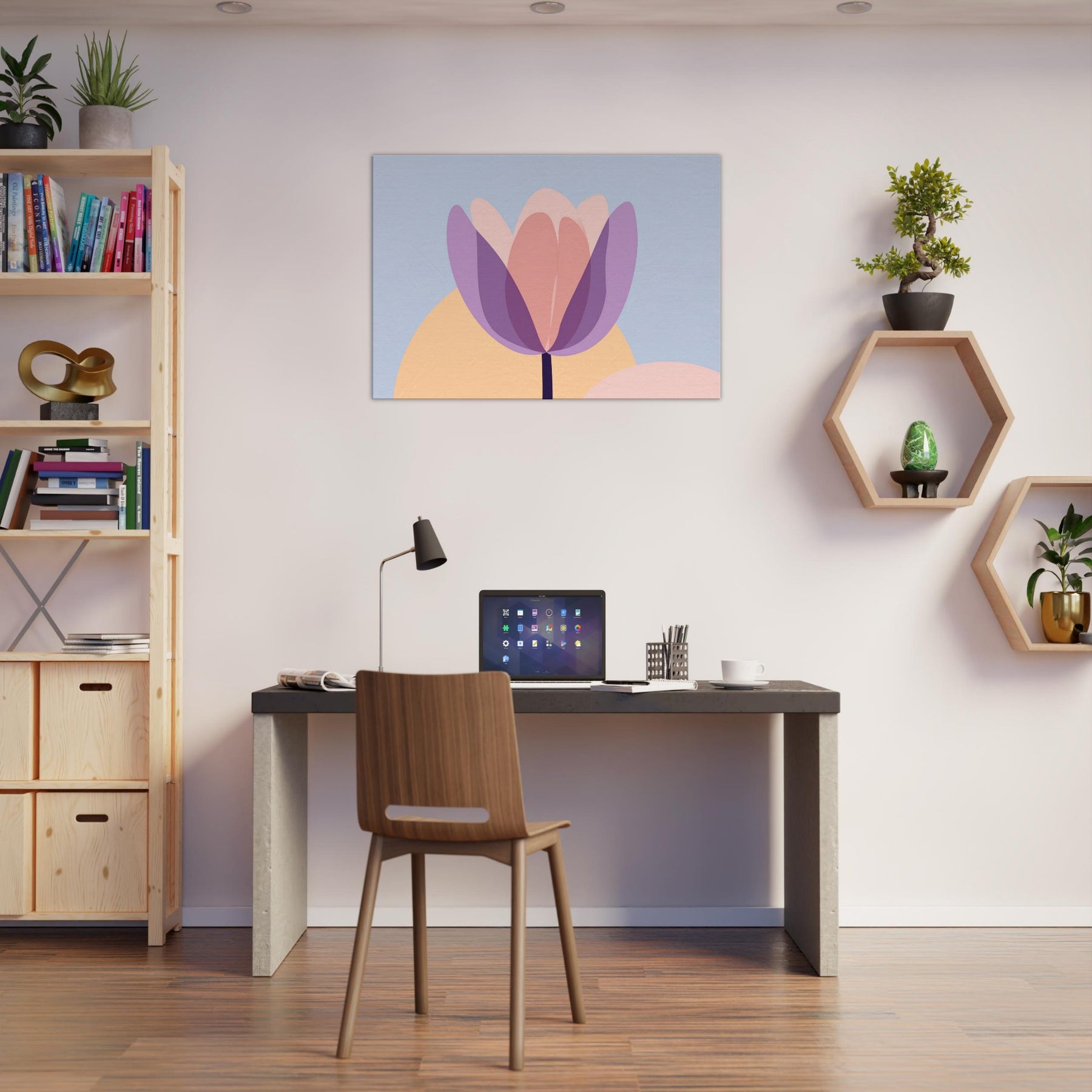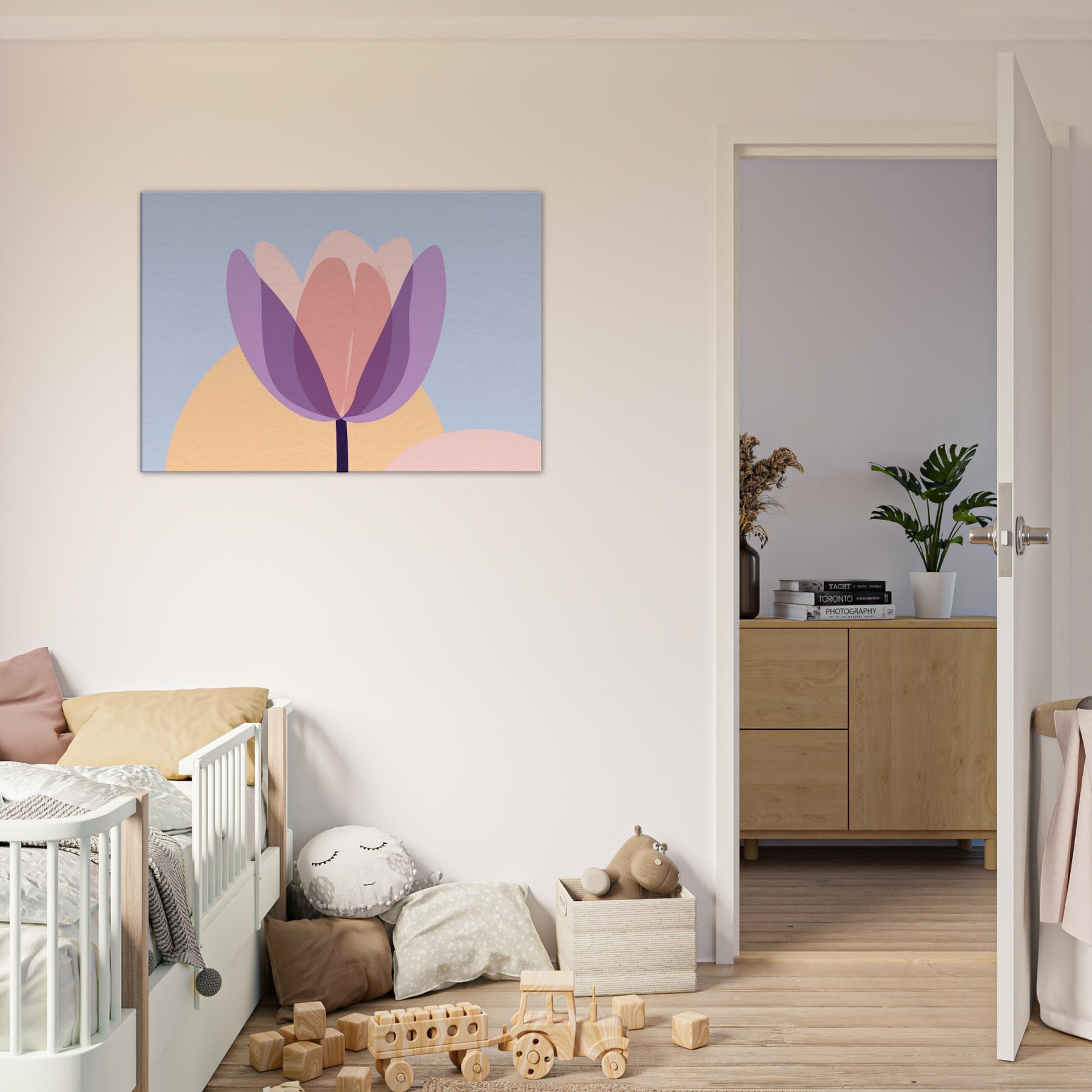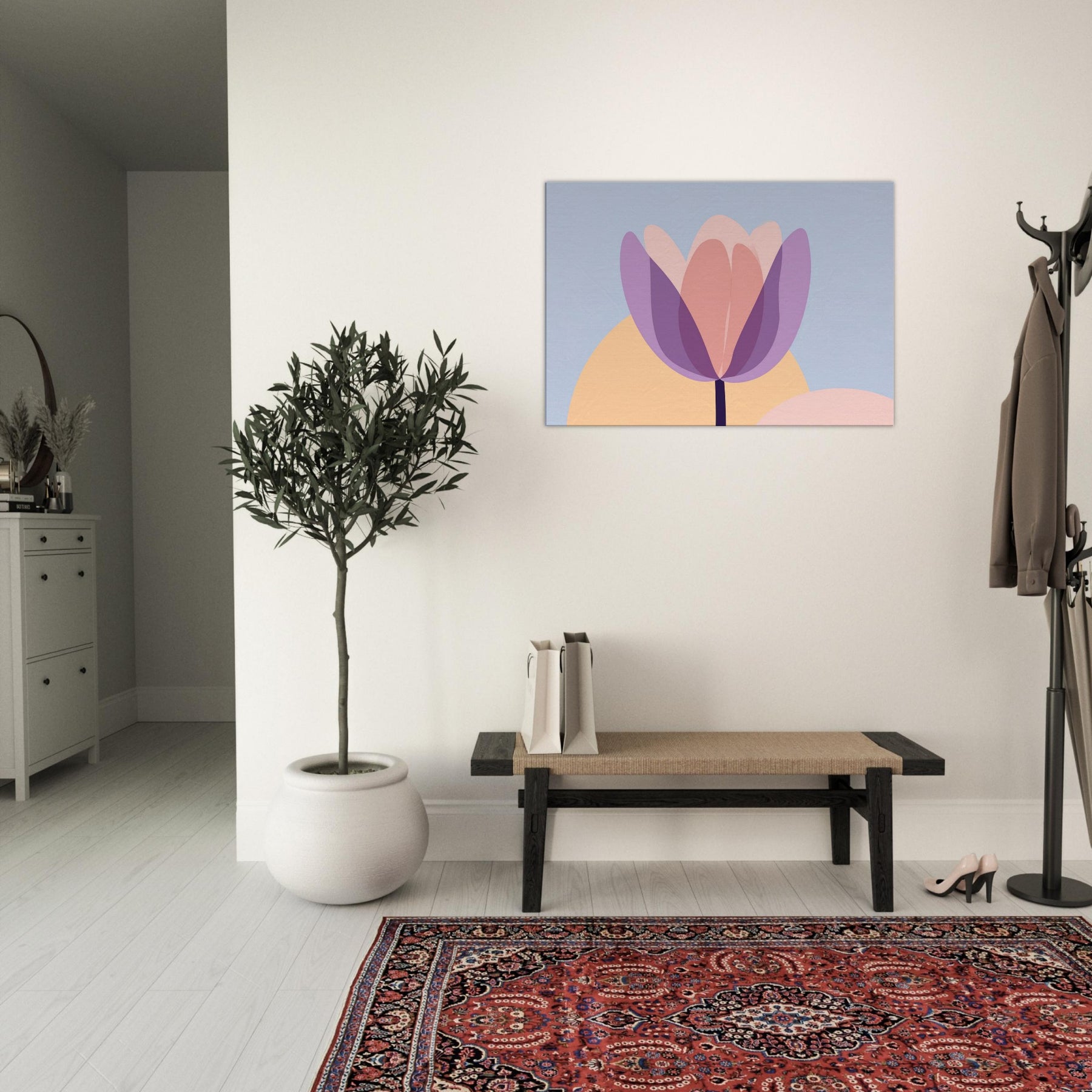 Effortless grace unfolds in a quiet tulip, rendered in clean planes of lilac, peach, and ash against a pale sky. This minimalist composition invites meditation as light travels across color fields, turning everyday corners into a moment of calm. The Tulip stands as a gentle reminder of nature's simplest rituals: growth, shelter, blooming, softly echoed in the rounded forms that hover like petals caught in a breeze. Hang this piece where conversation fades and presence deepens, and let color, rhythm, and quiet become your living space atmosphere.