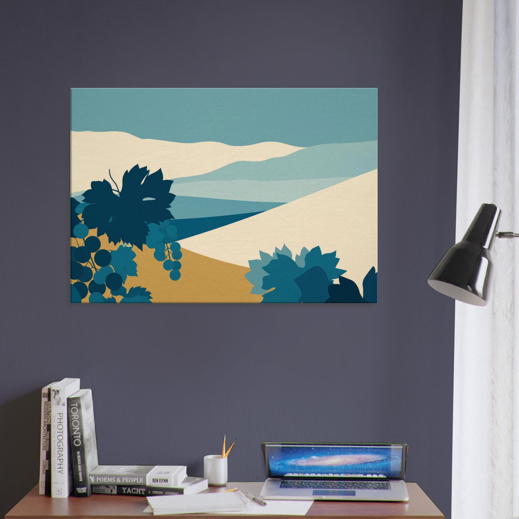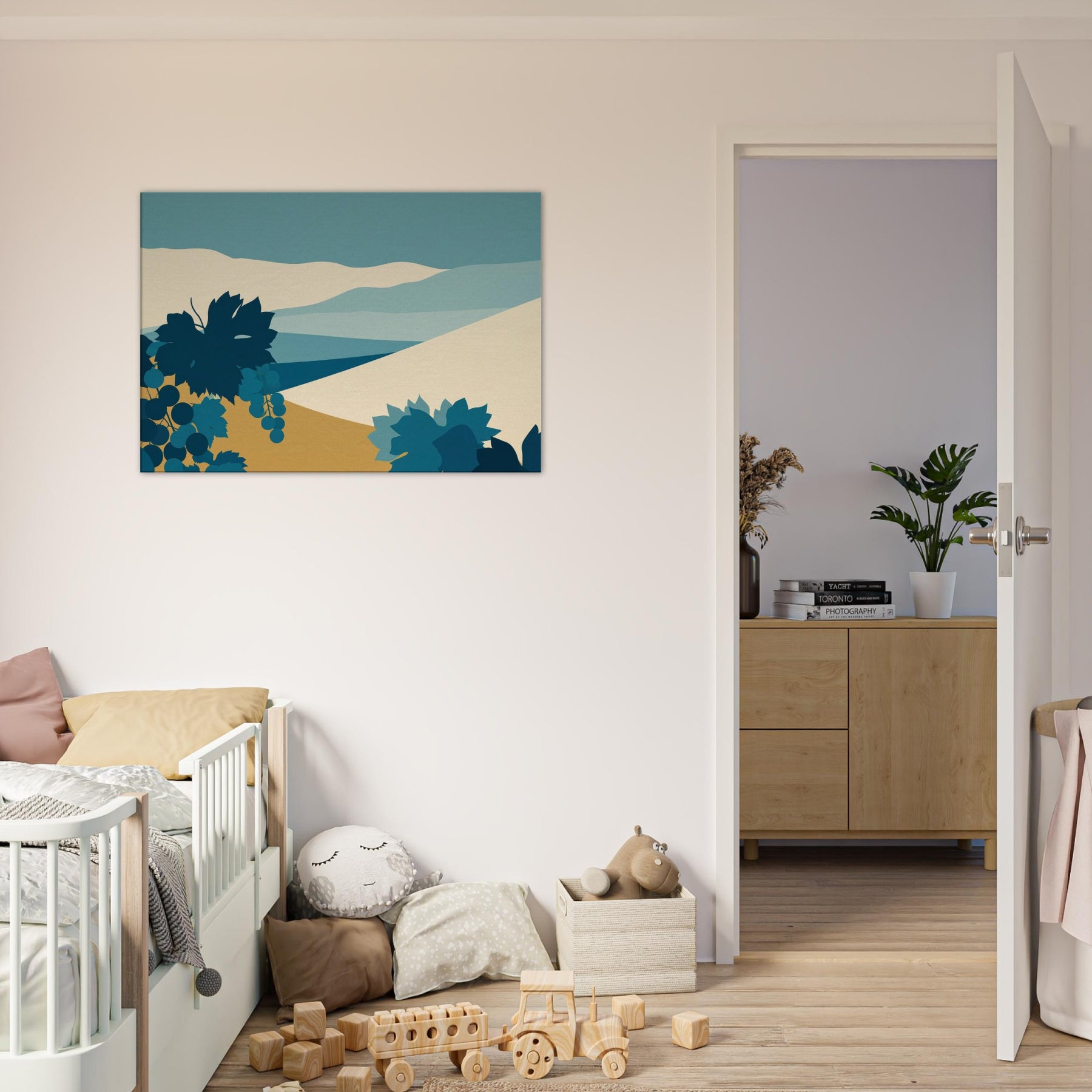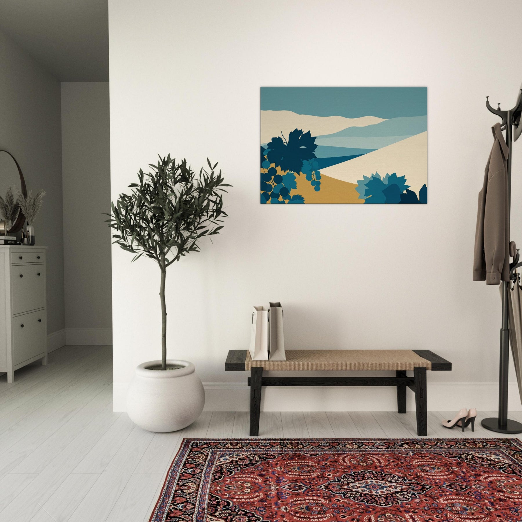 Soft and expansive, this minimalist vineyard scene invites stillness into any room. The composition layers cool blues, sand, and pale greens as rolling hills recede into a quiet horizon, while grapevines silhouette in deep indigo at the foreground. The effect is meditative, a gentle reminder of place and season. Hung above a sofa or in a bedroom nook, it slows time, inspires conversation, and elevates your living space with a whisper of nature’s elegance.