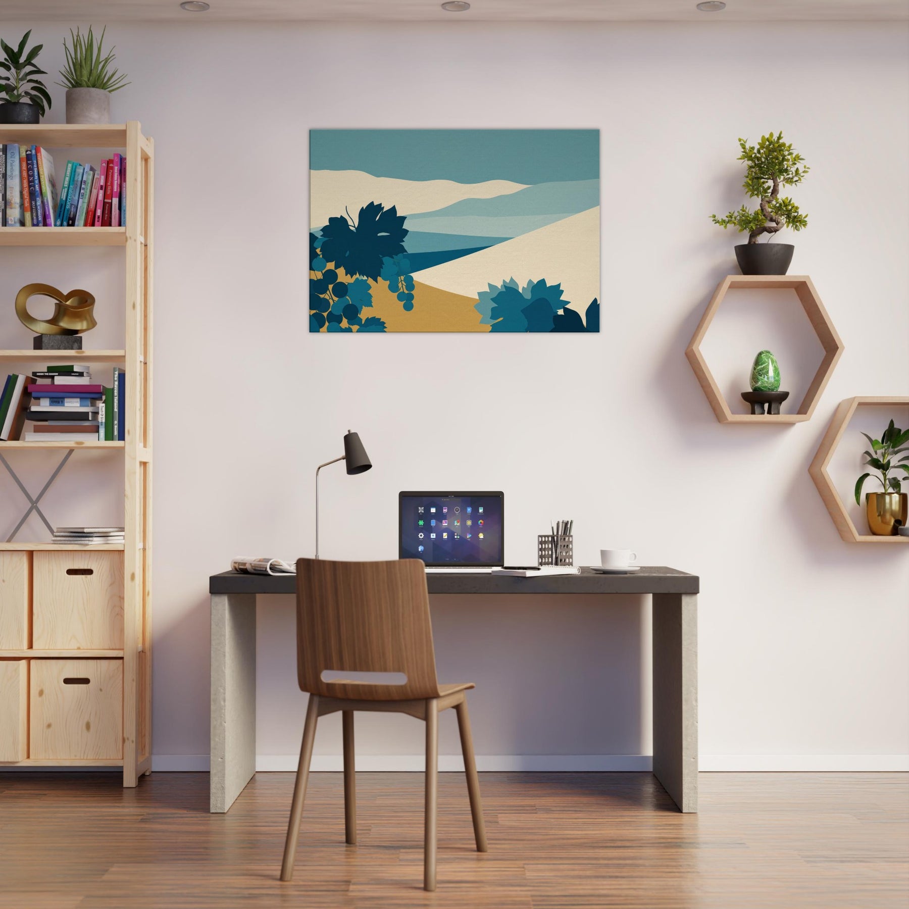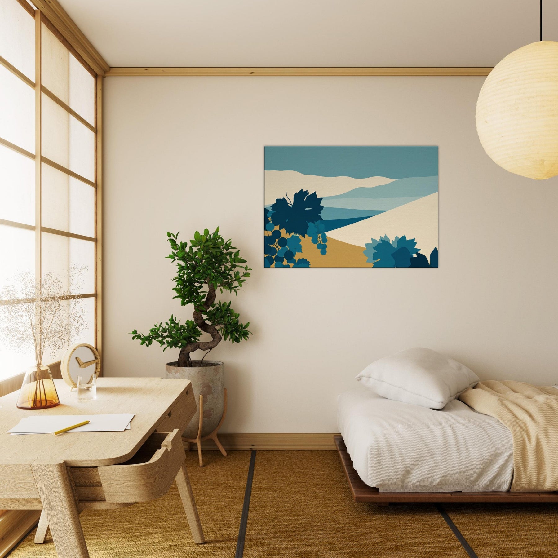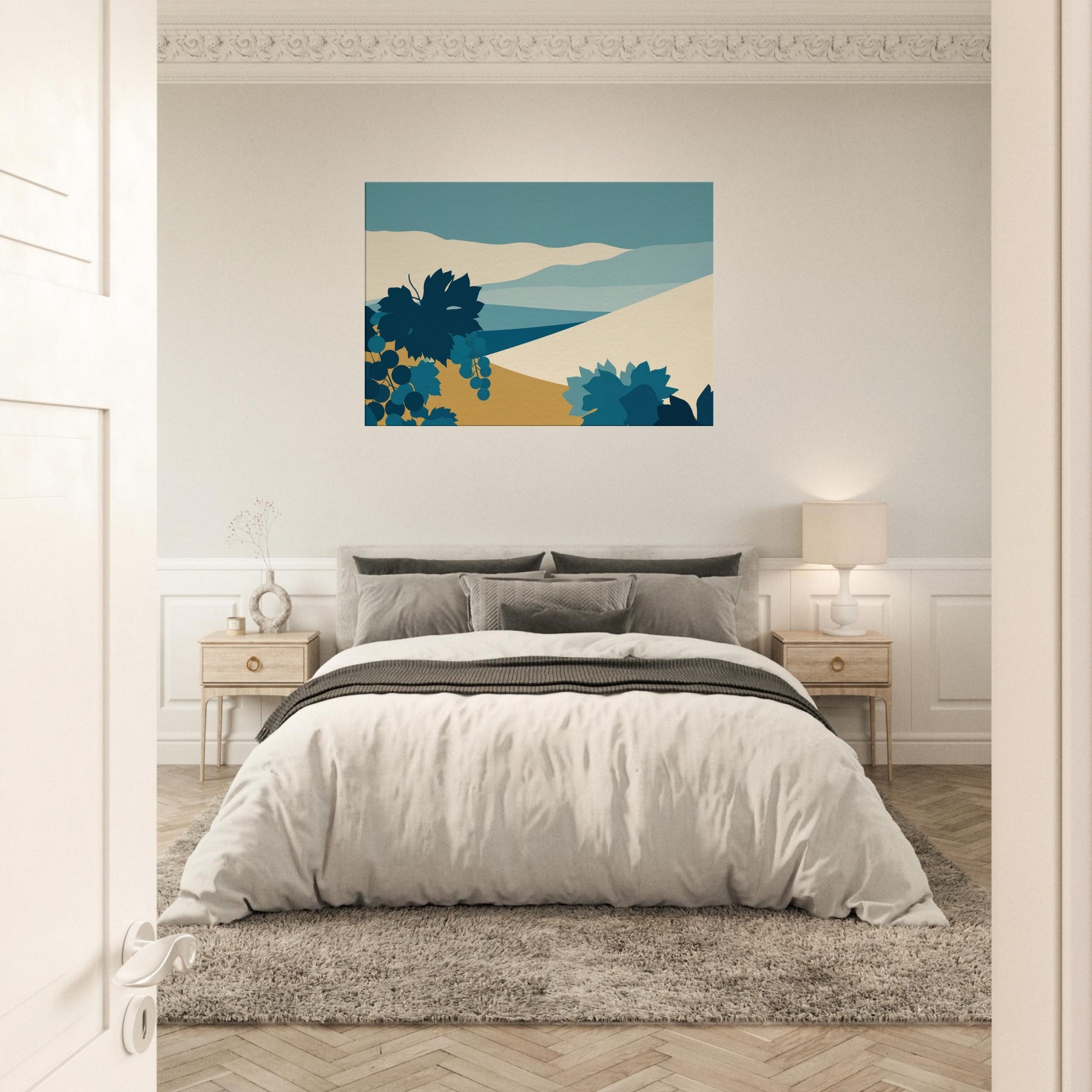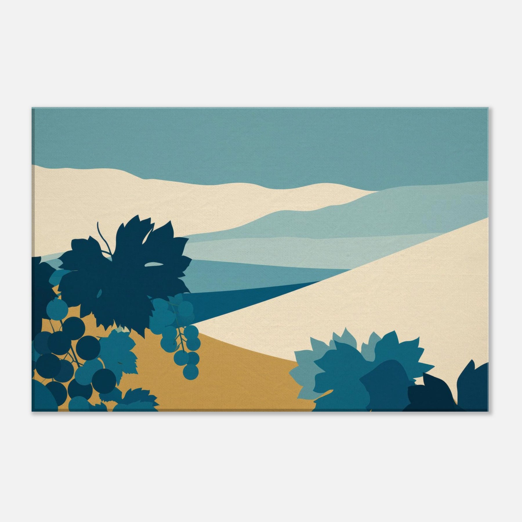 Soft and expansive, this minimalist vineyard scene invites stillness into any room. The composition layers cool blues, sand, and pale greens as rolling hills recede into a quiet horizon, while grapevines silhouette in deep indigo at the foreground. The effect is meditative, a gentle reminder of place and season. Hung above a sofa or in a bedroom nook, it slows time, inspires conversation, and elevates your living space with a whisper of nature’s elegance.