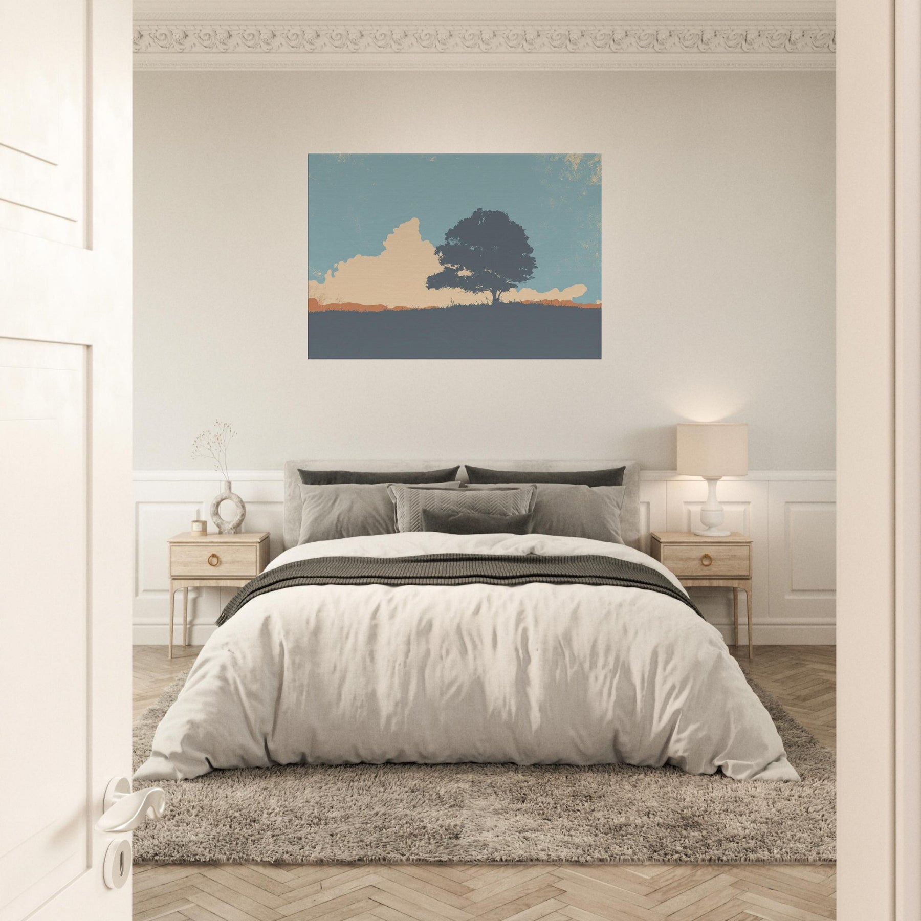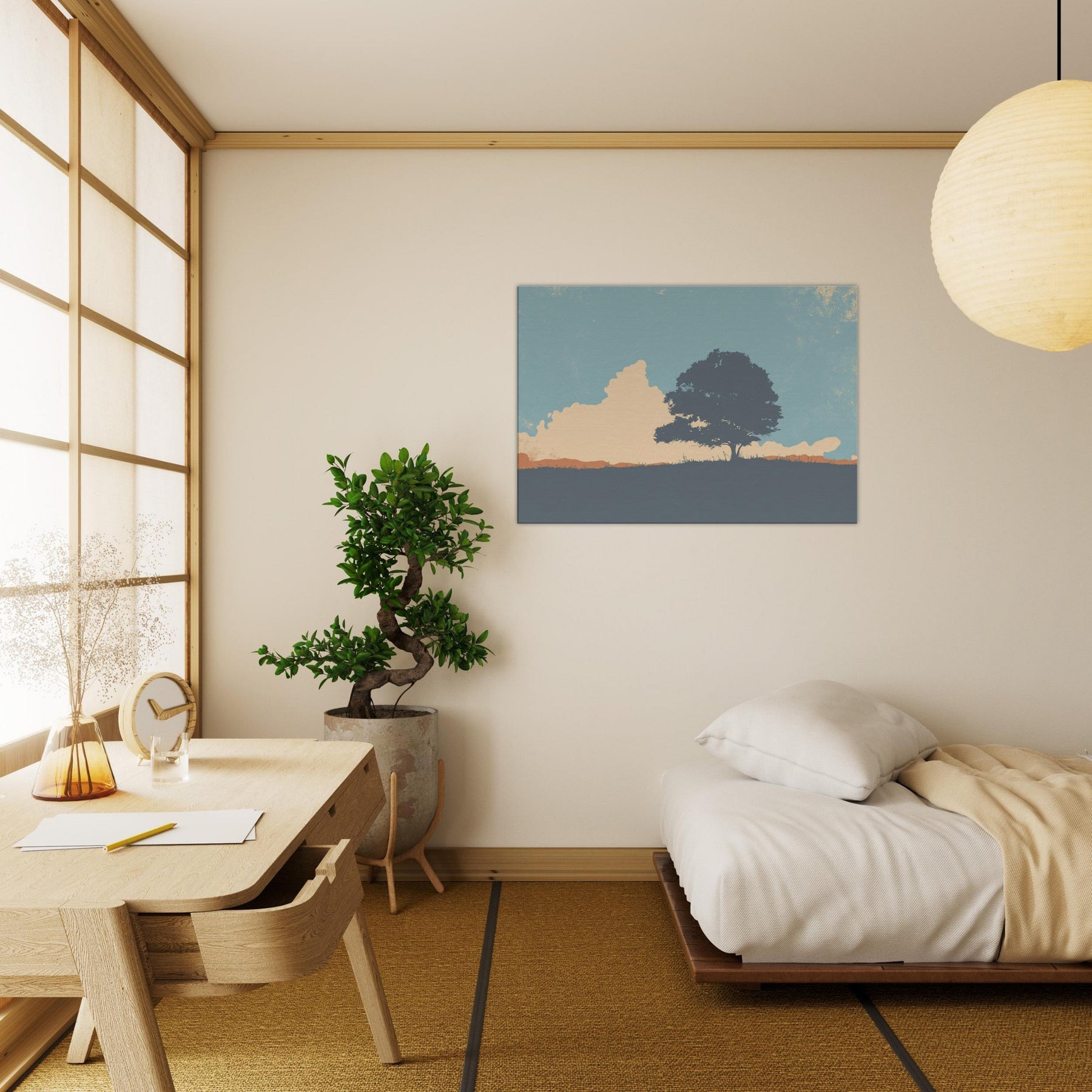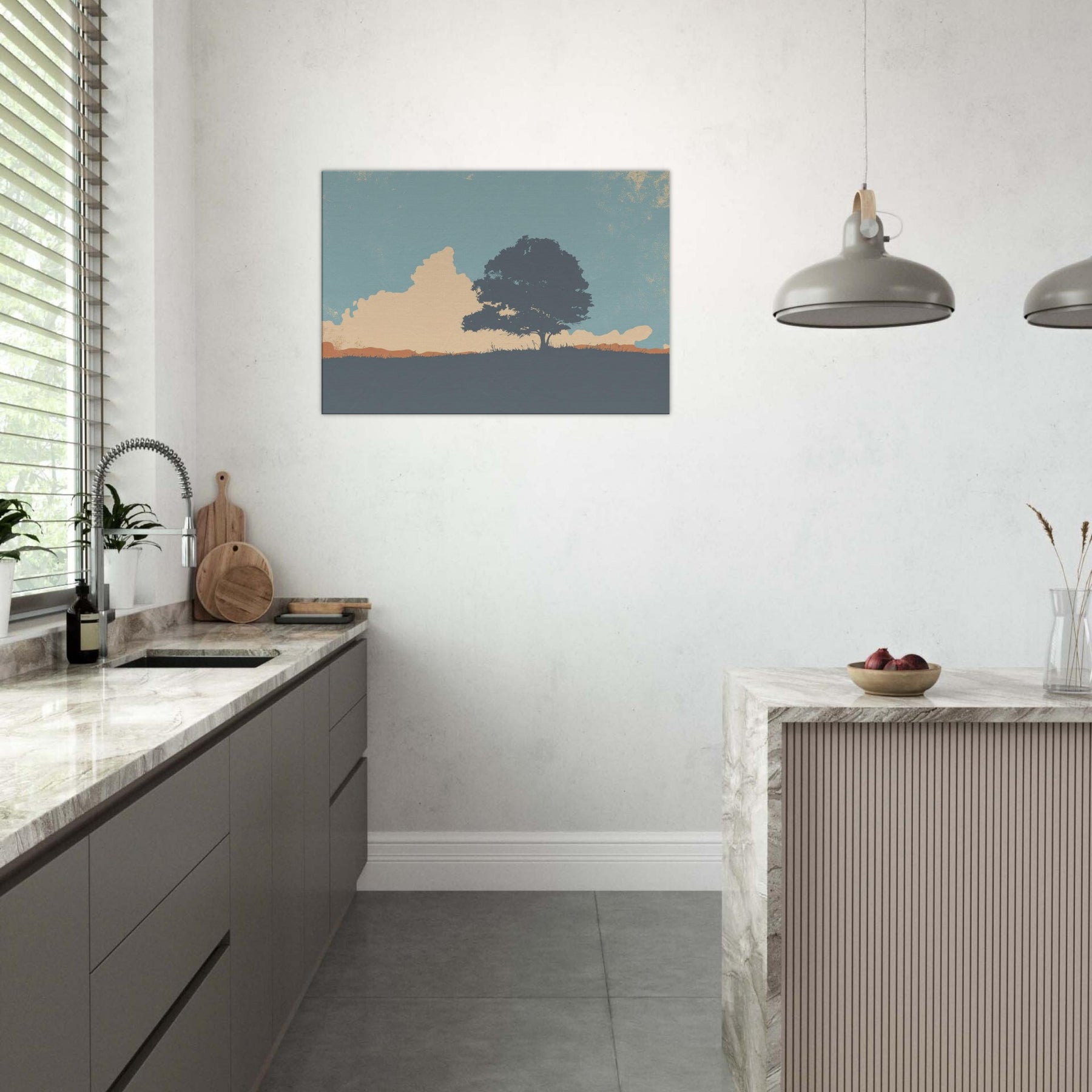 Endless Horizon invites quiet contemplation as light settles across a lone tree and sweeping hill. This minimalist composition uses soft blues, peach and sandstone tones to evoke a calm, expansive mood, like the sky leaning in to listen. Hang it above a sofa or bed to soften edges, invite stillness, and frame everyday moments with a generous, unhurried breath. The scene becomes a window to nature's vast, reassuring rhythm, turning any room into a sanctuary of gentle focus.
