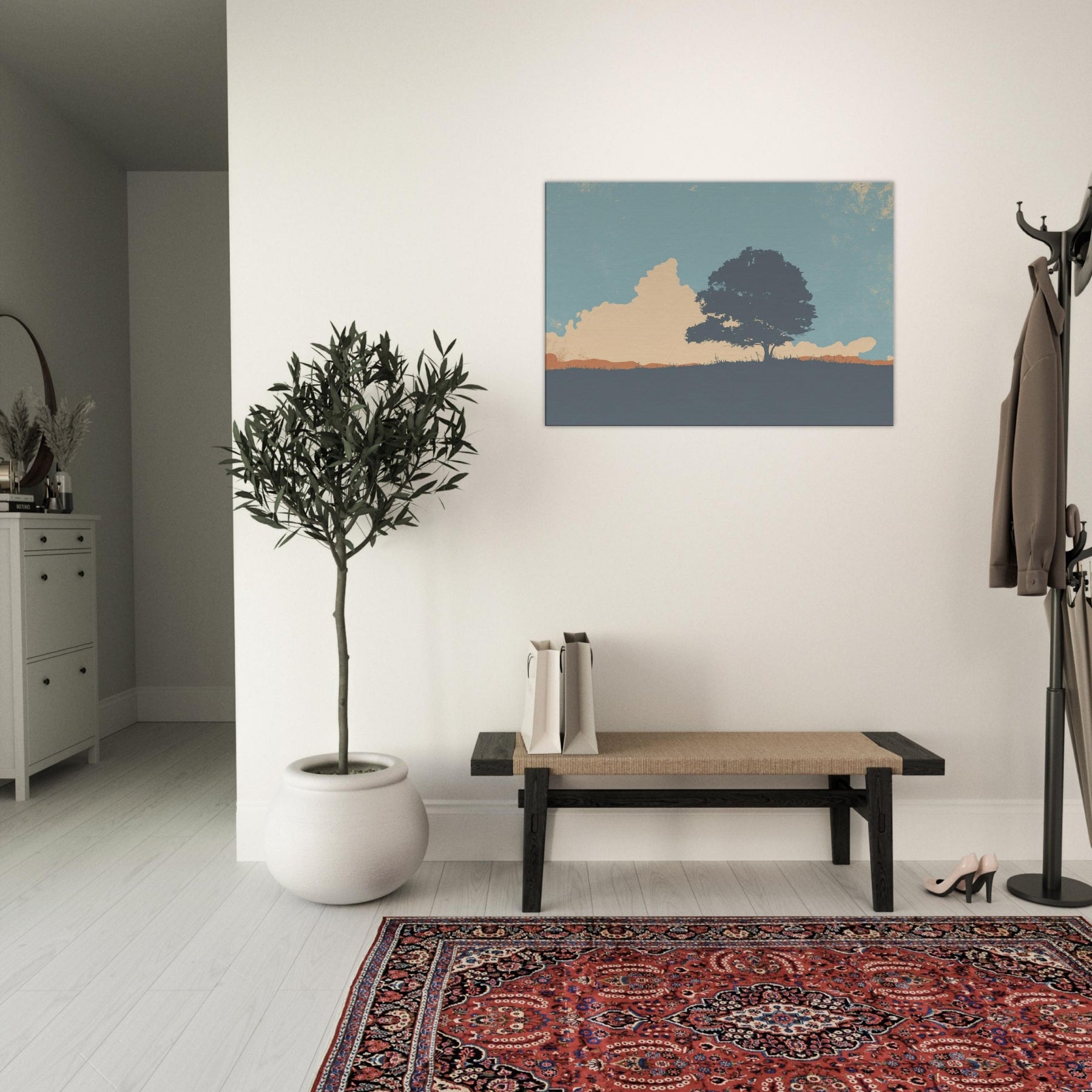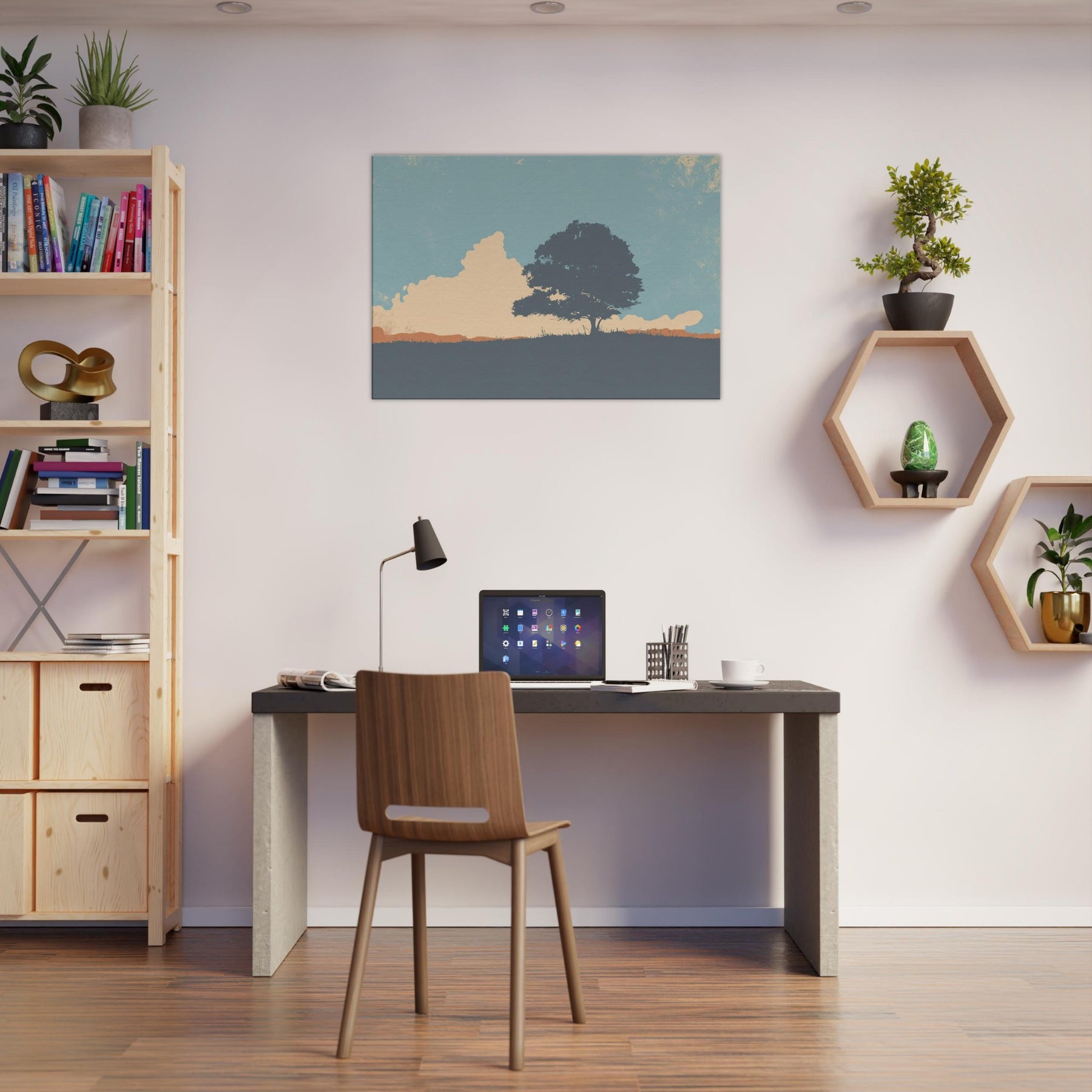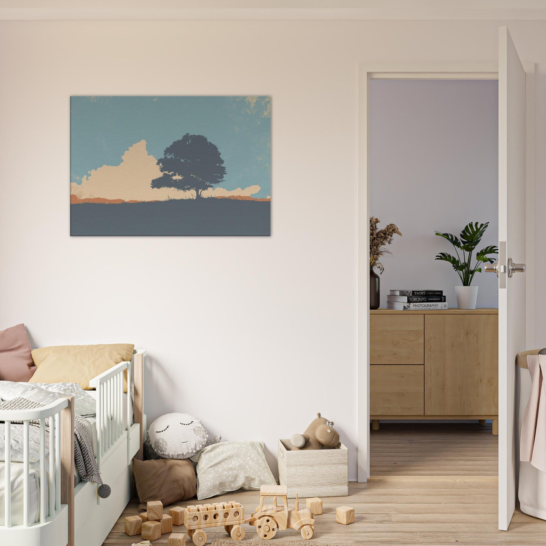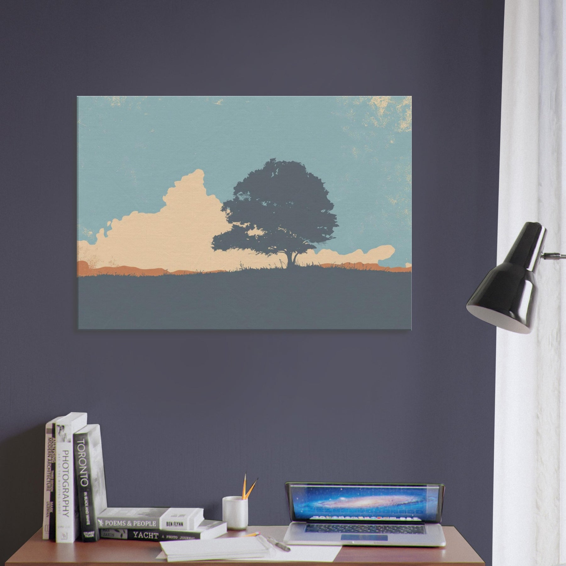 Endless Horizon invites quiet contemplation as light settles across a lone tree and sweeping hill. This minimalist composition uses soft blues, peach and sandstone tones to evoke a calm, expansive mood, like the sky leaning in to listen. Hang it above a sofa or bed to soften edges, invite stillness, and frame everyday moments with a generous, unhurried breath. The scene becomes a window to nature's vast, reassuring rhythm, turning any room into a sanctuary of gentle focus.