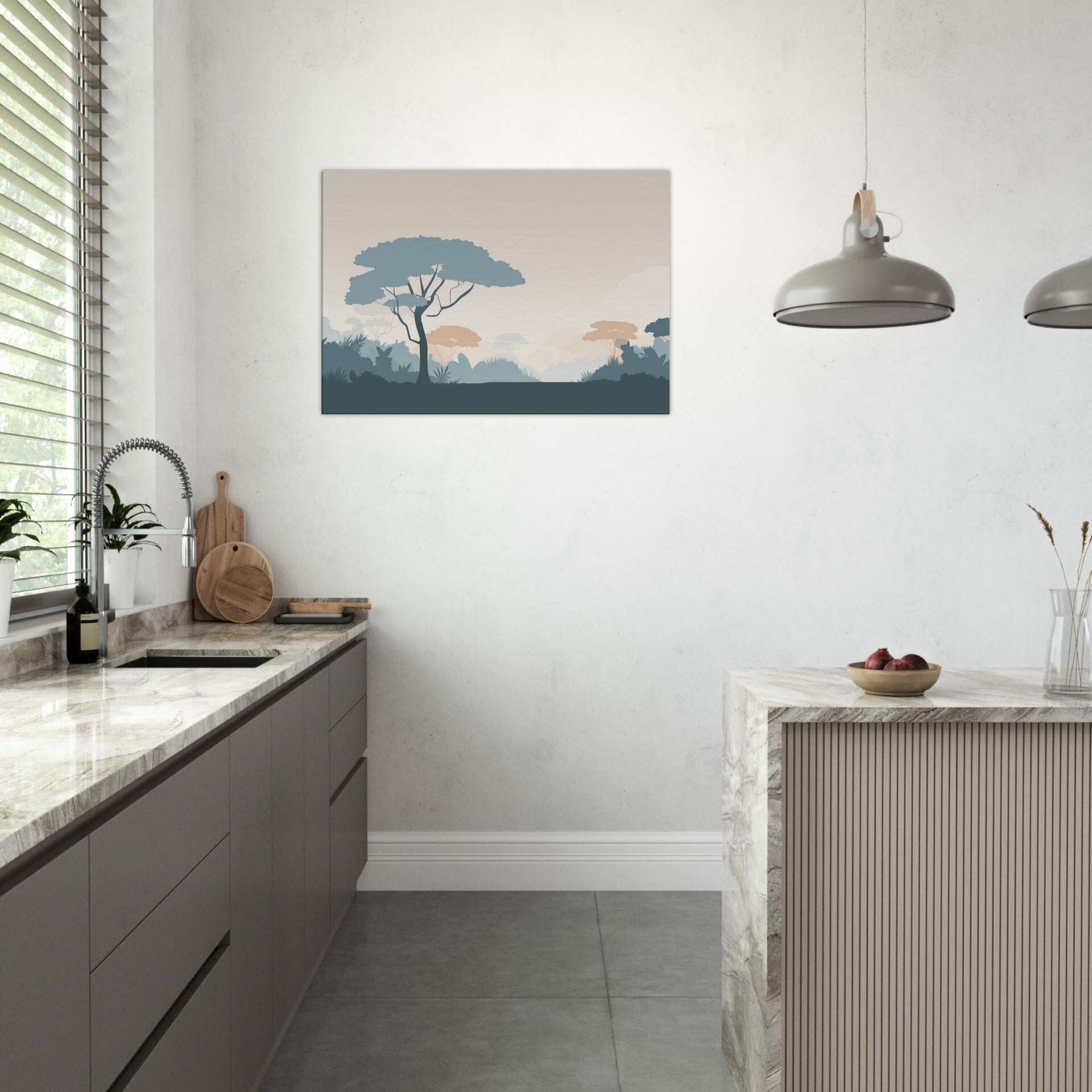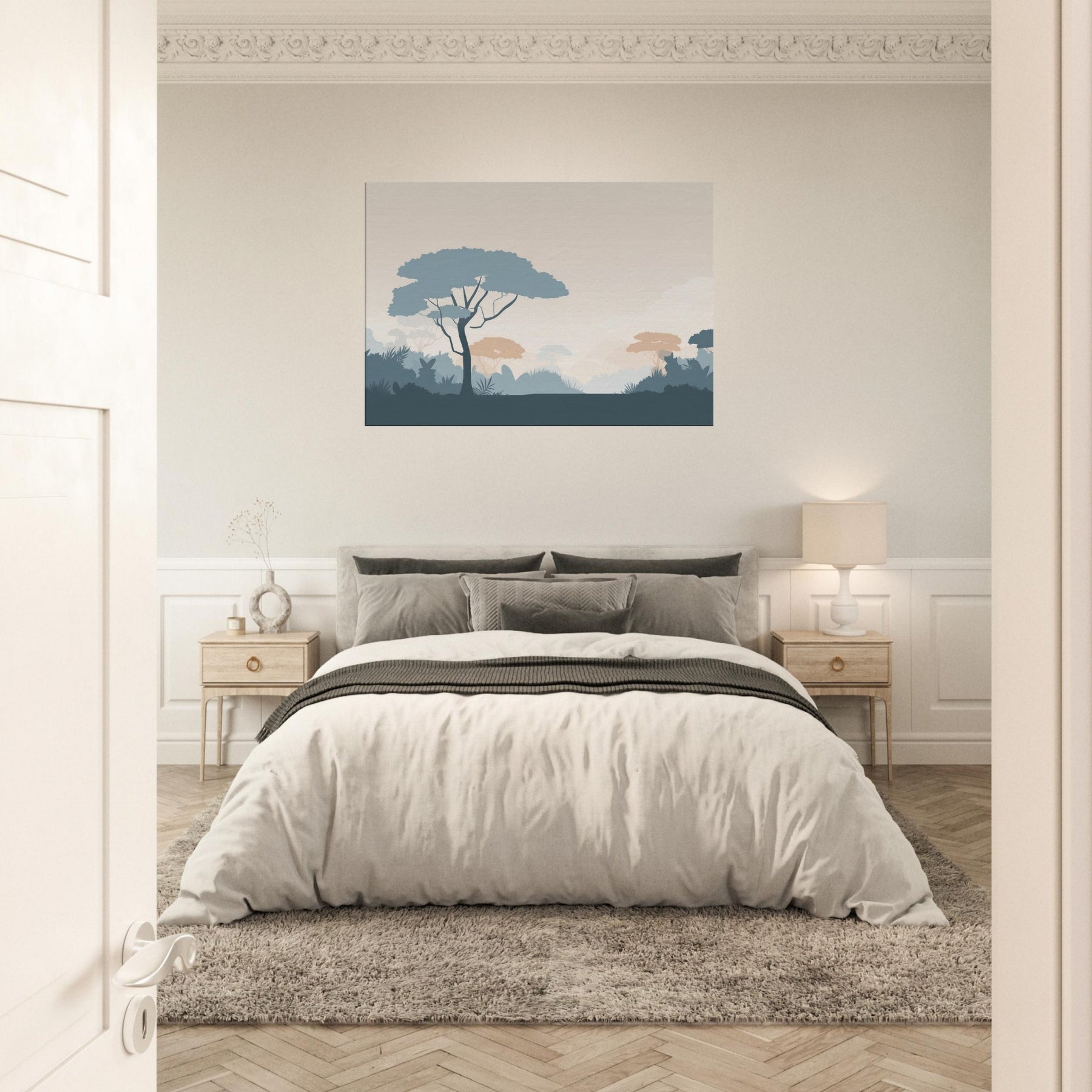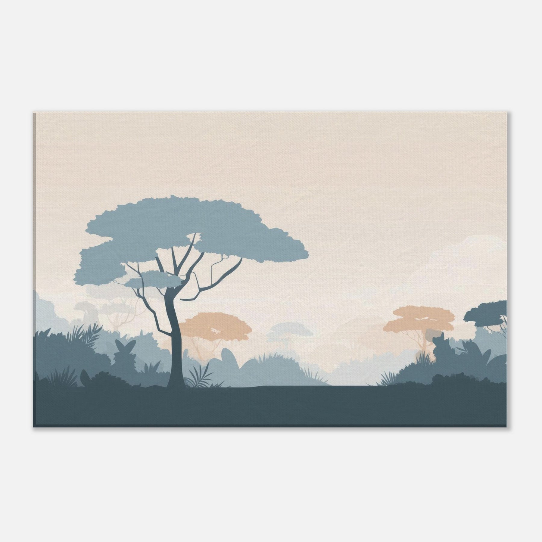 Immerse your space in the quiet vastness of a Jungle, rendered in clean, restrained forms. This minimalist scene invites a moment of stillness, where pale sky tones meet cool blues and muted terracotta foliage. The soft silhouettes breathe calm into a living room or bedroom, creating a spacious feel without shouting color. Let the gentle rhythm of the tree canopies unfold across your wall, guiding light and mood, and turning a simple corner into a serene retreat that pairs with any decor.