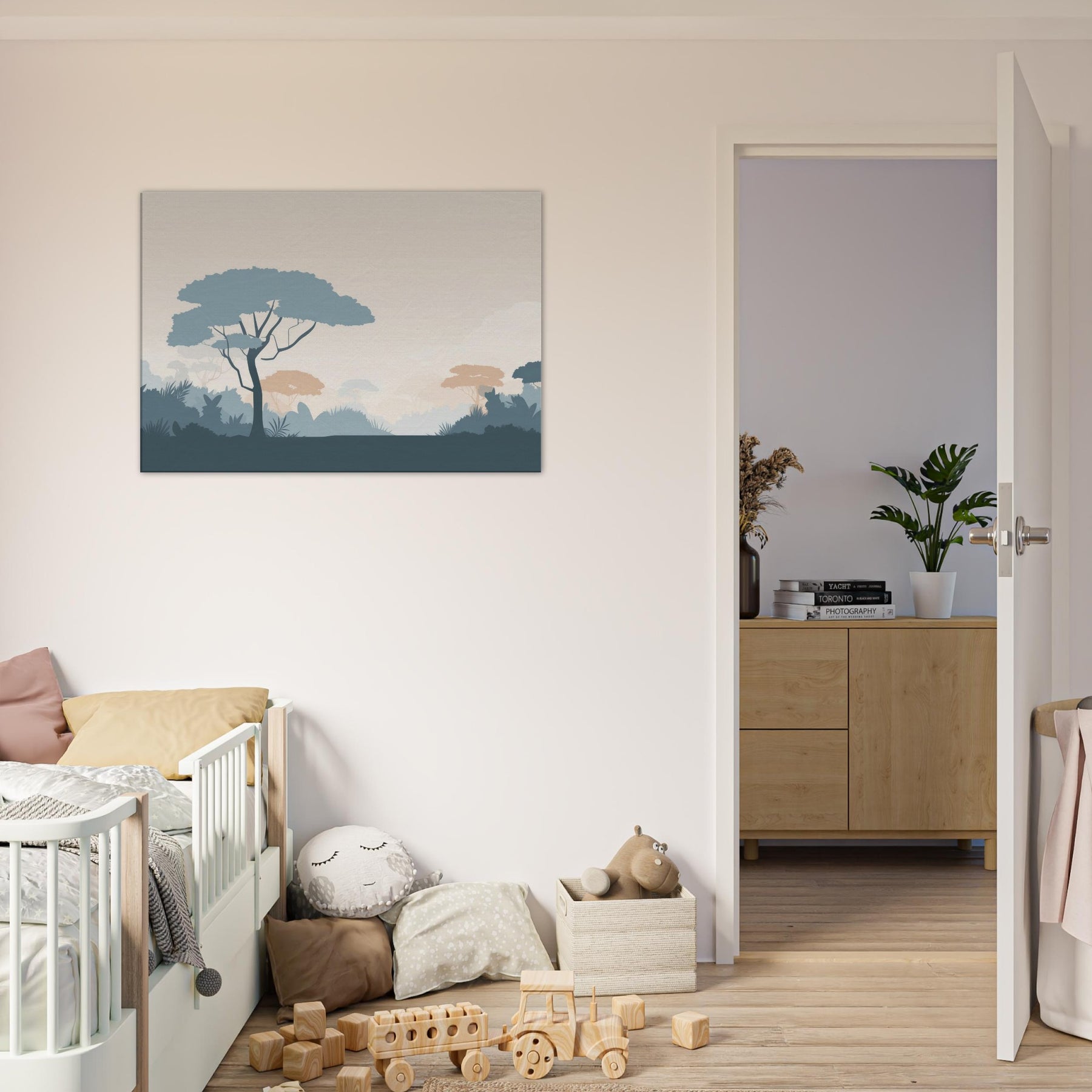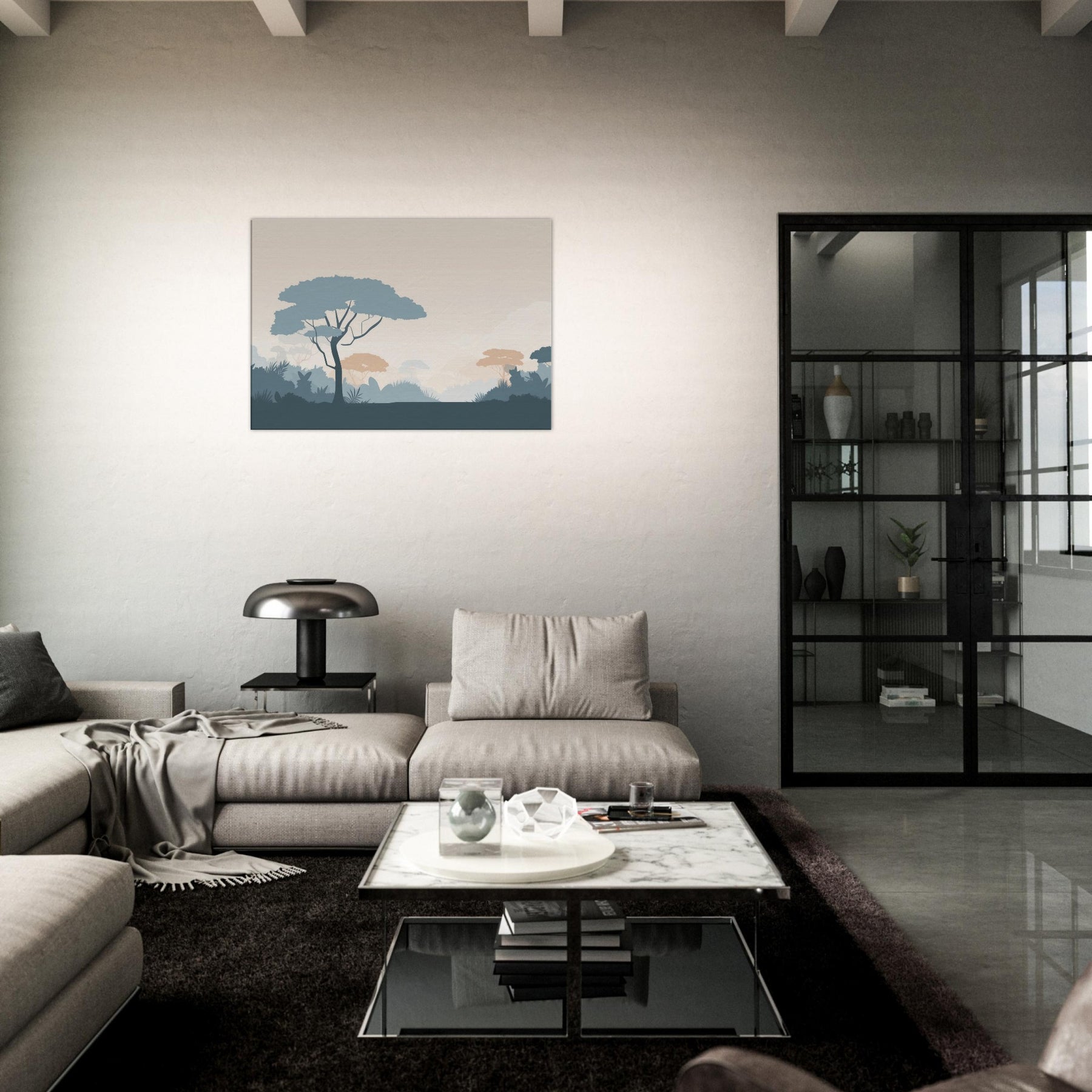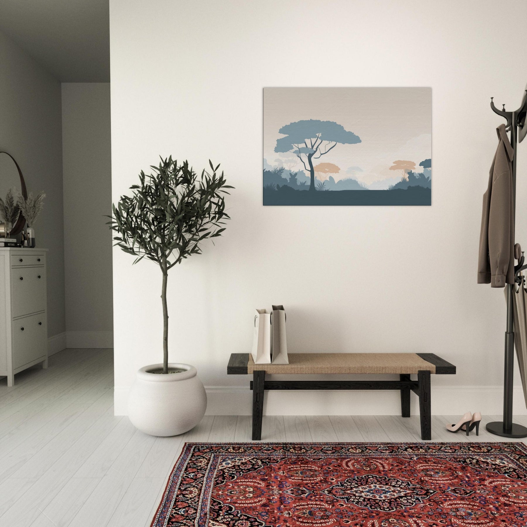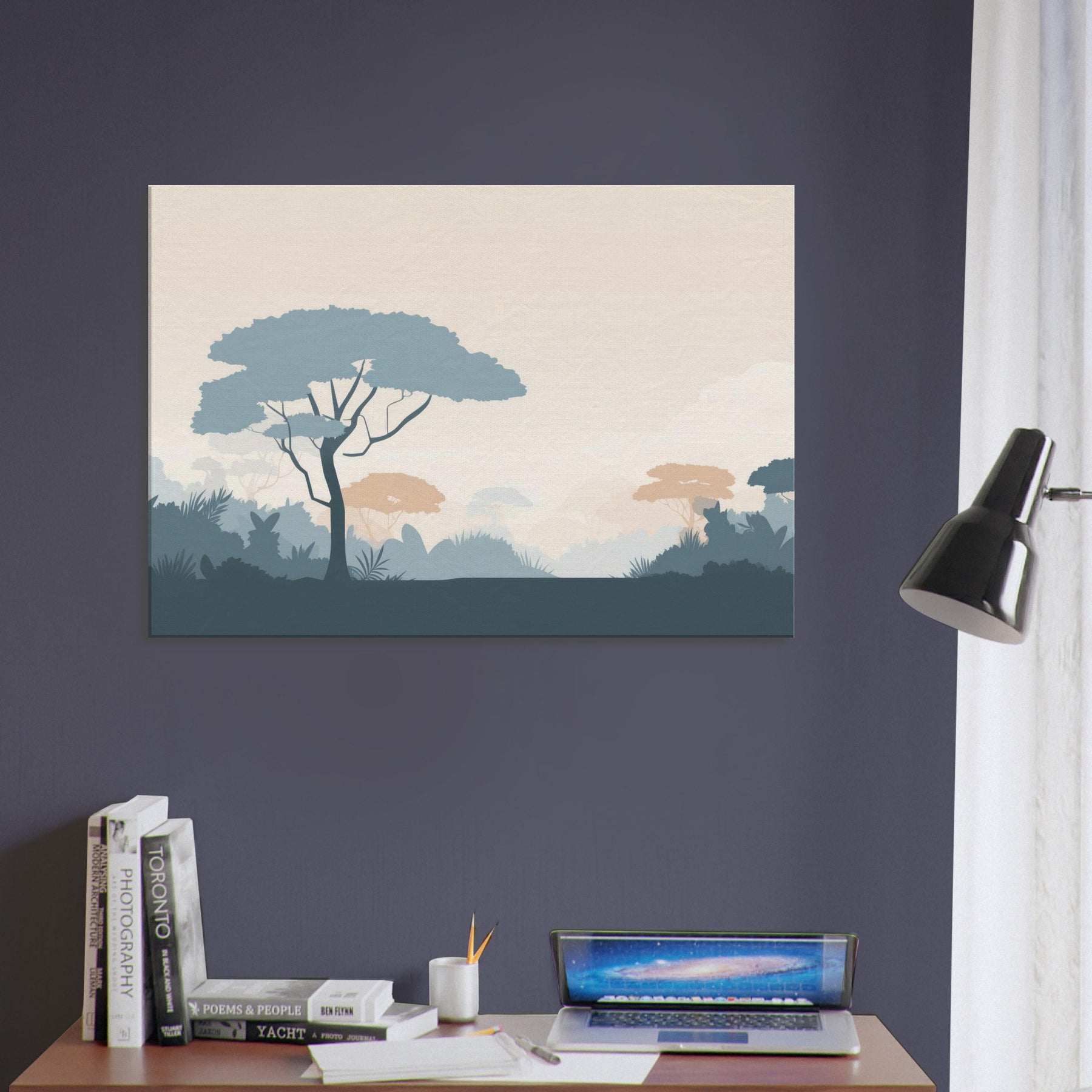 Immerse your space in the quiet vastness of a Jungle, rendered in clean, restrained forms. This minimalist scene invites a moment of stillness, where pale sky tones meet cool blues and muted terracotta foliage. The soft silhouettes breathe calm into a living room or bedroom, creating a spacious feel without shouting color. Let the gentle rhythm of the tree canopies unfold across your wall, guiding light and mood, and turning a simple corner into a serene retreat that pairs with any decor.