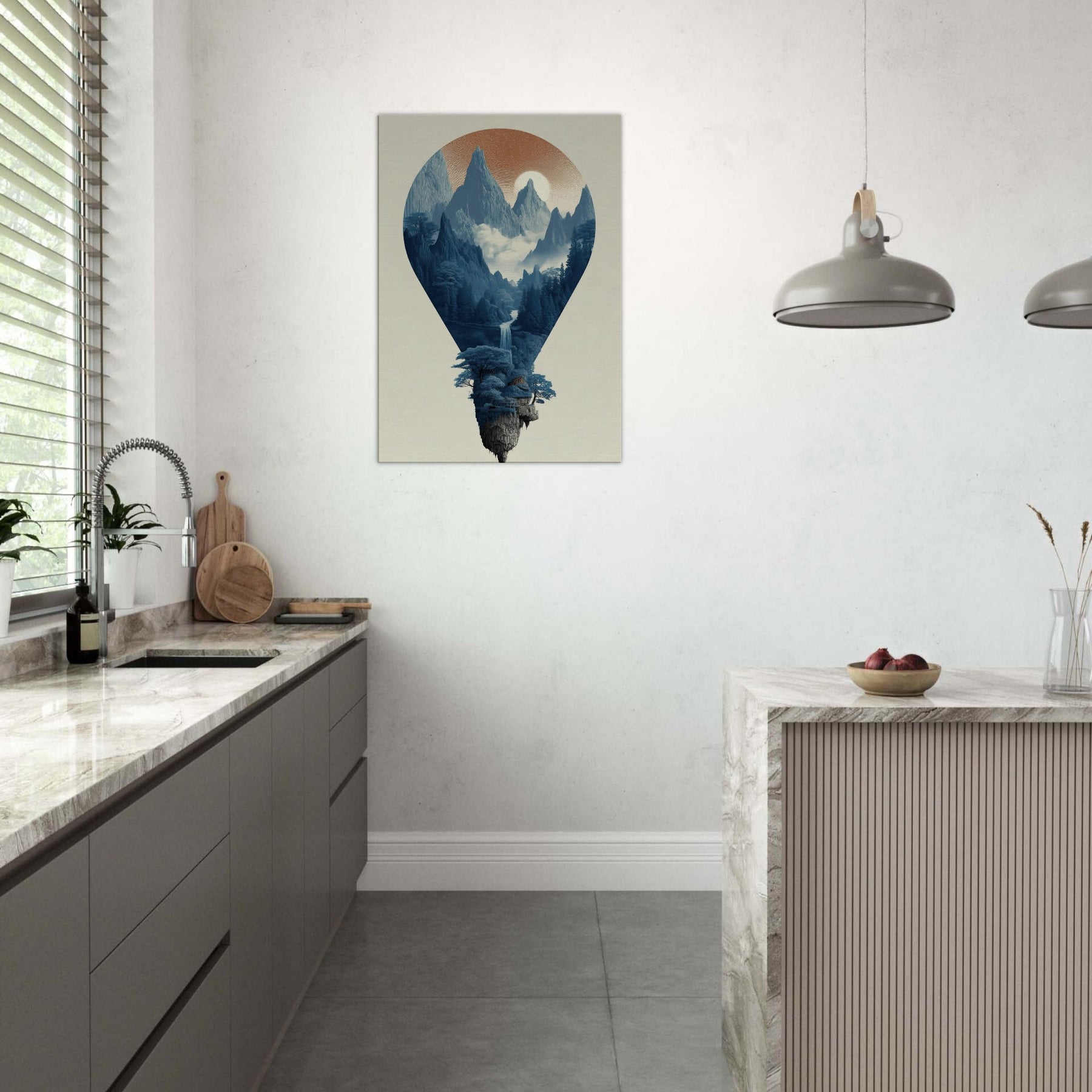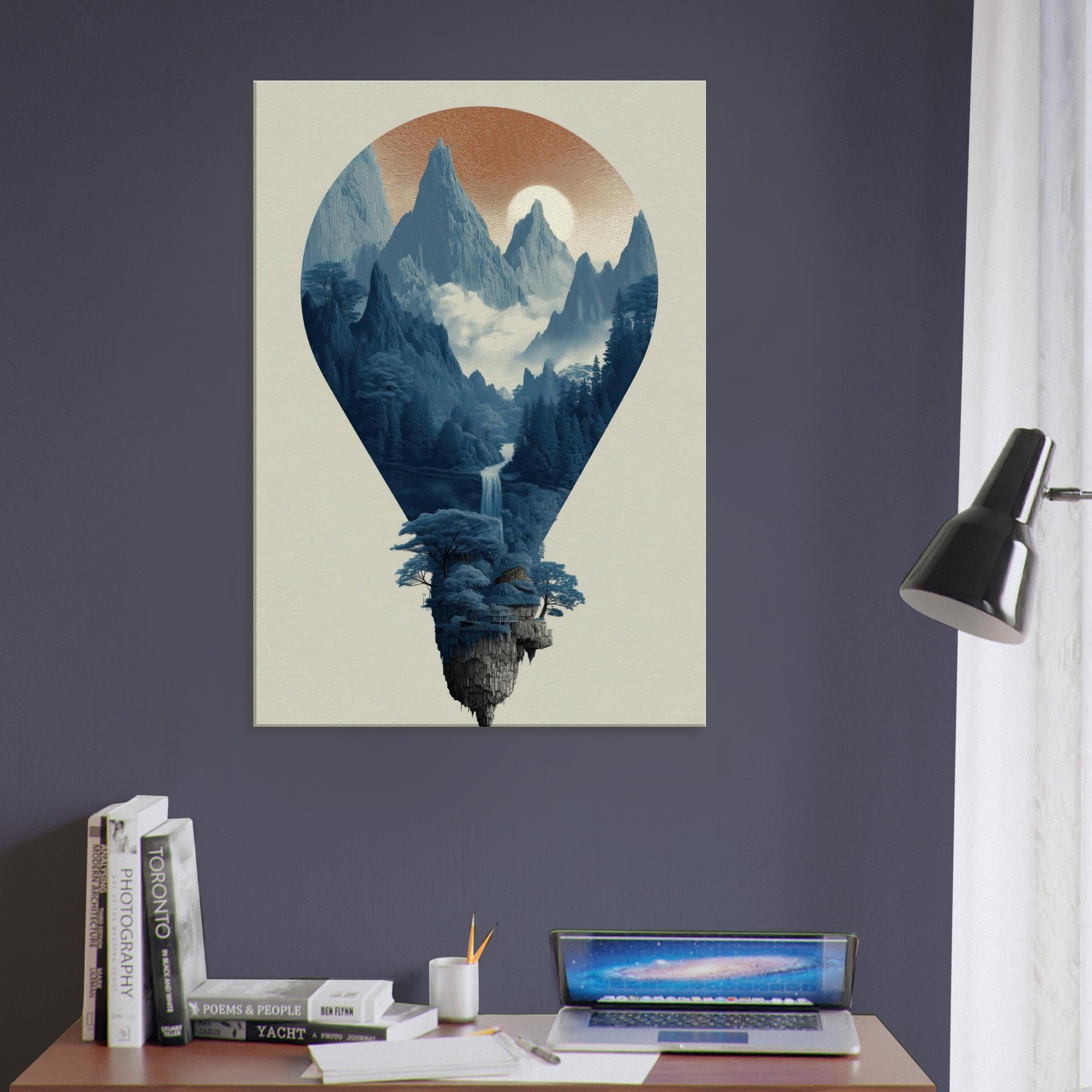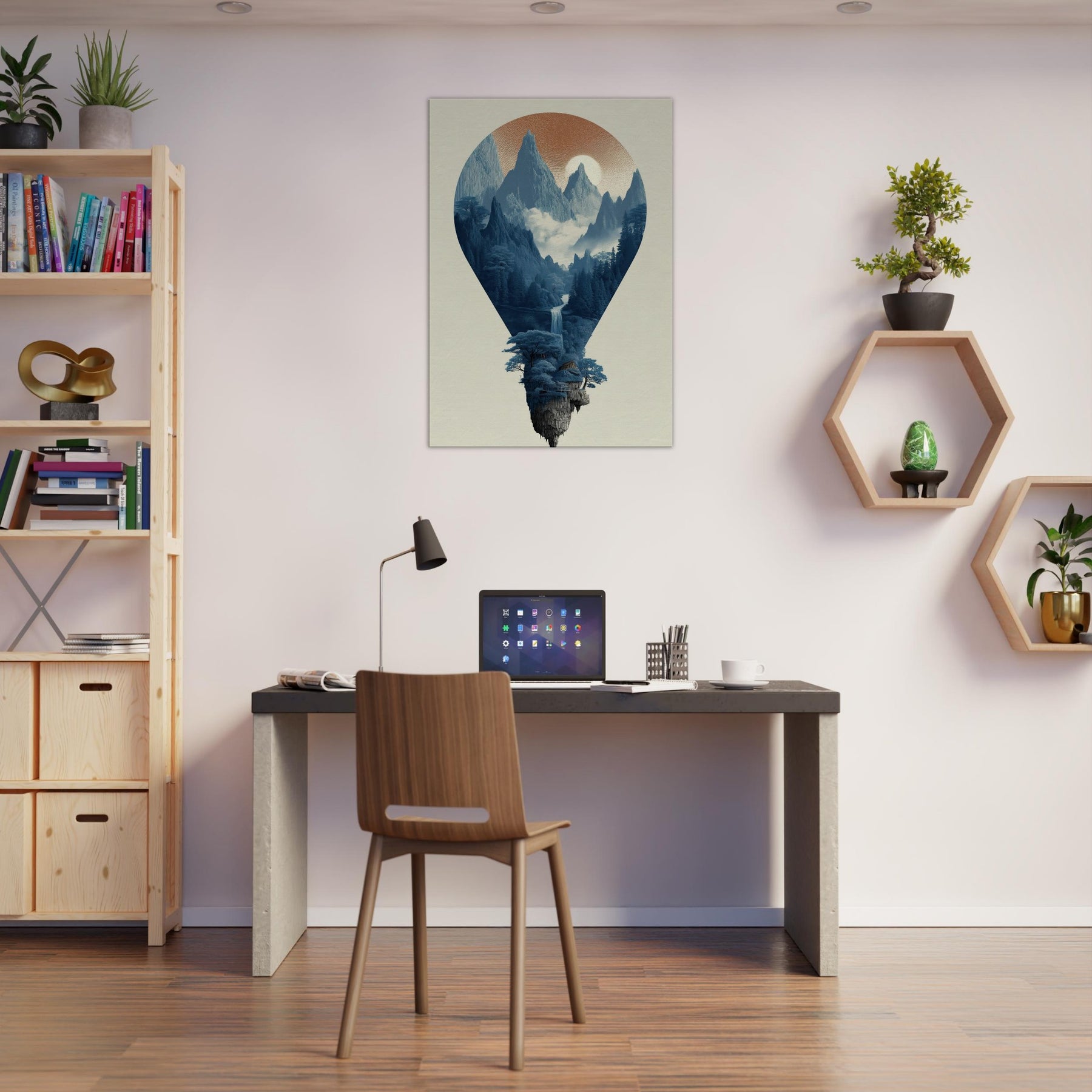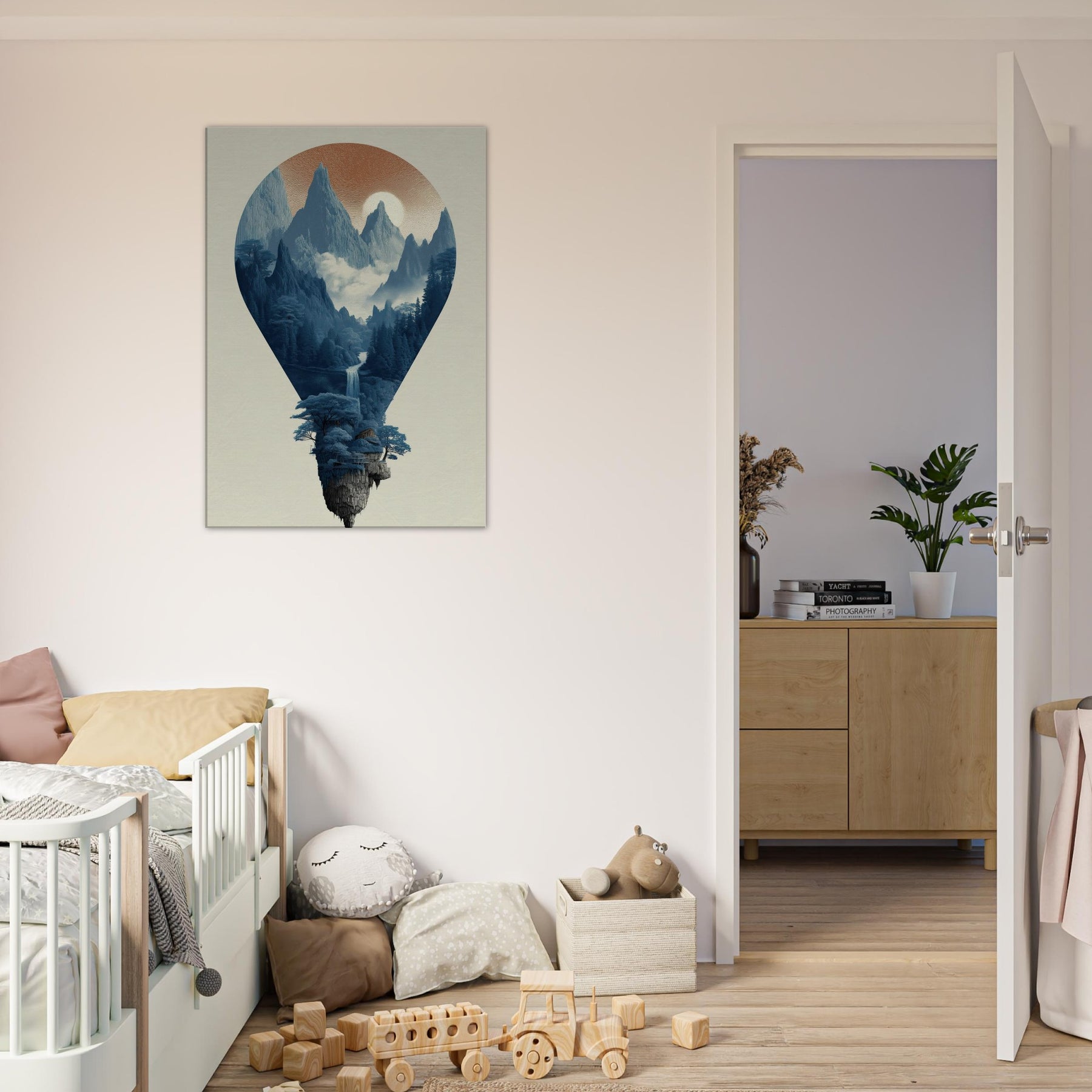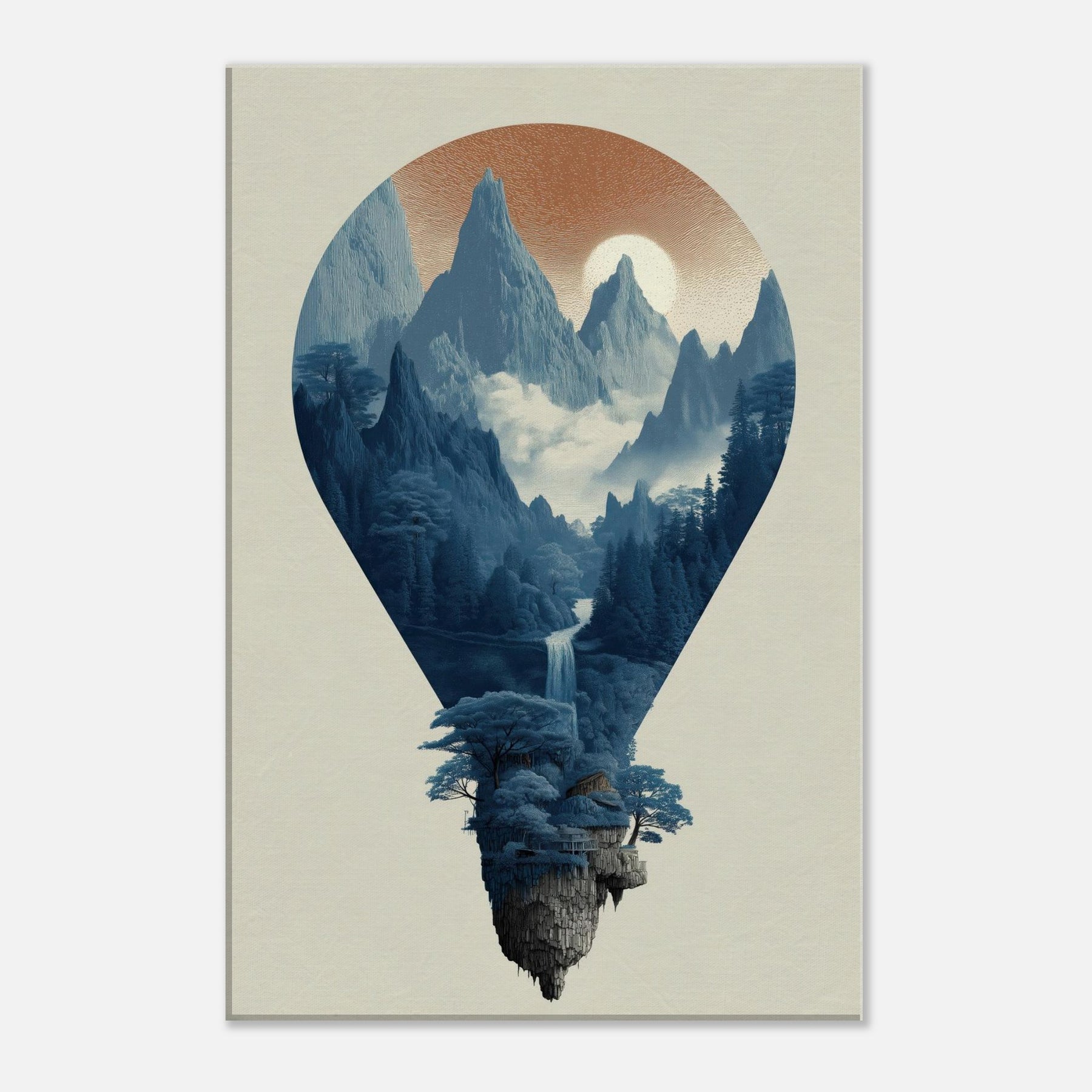 Hot Air Balloons drift through a surreal, sunlit mountain , captured within a luminous balloon shaped window. This nature infused scene invites a slow, contemplative mood cool blues, mist, and distant peaks that soften the room with quiet drama. In living spaces, it acts as a tranquil focal point, encouraging conversation and imagination. The artwork’s dreamlike composition pairs beautifully with modern interiors seeking texture, depth, and a sense of ascent.