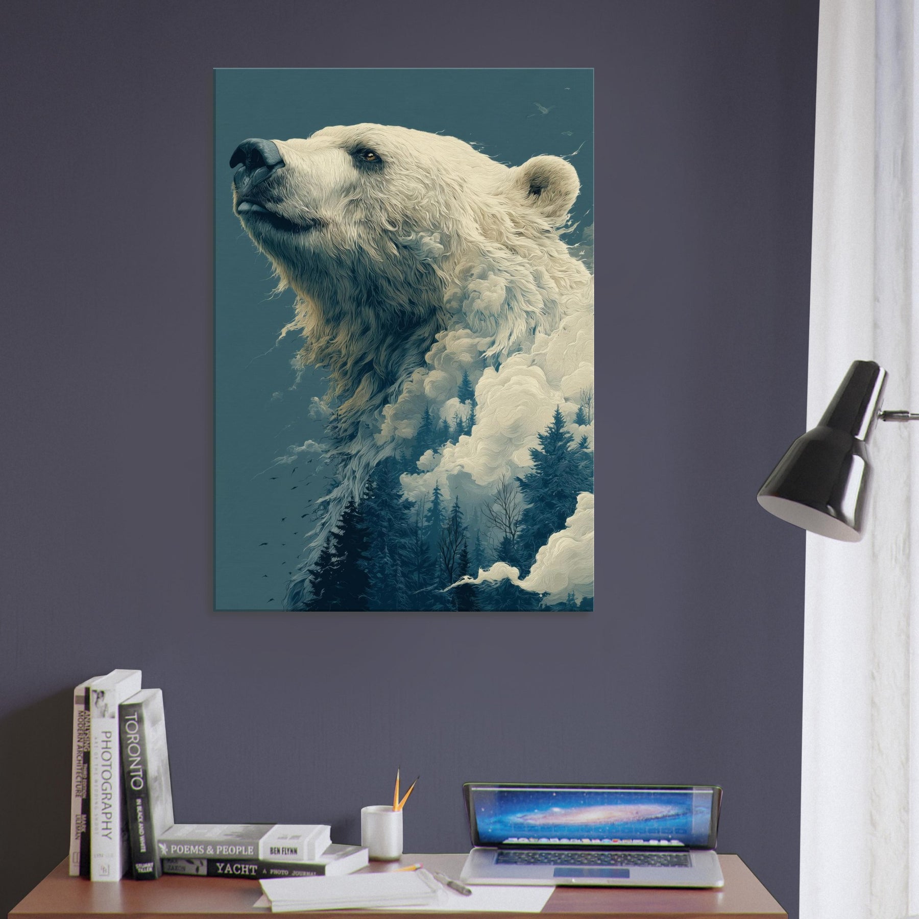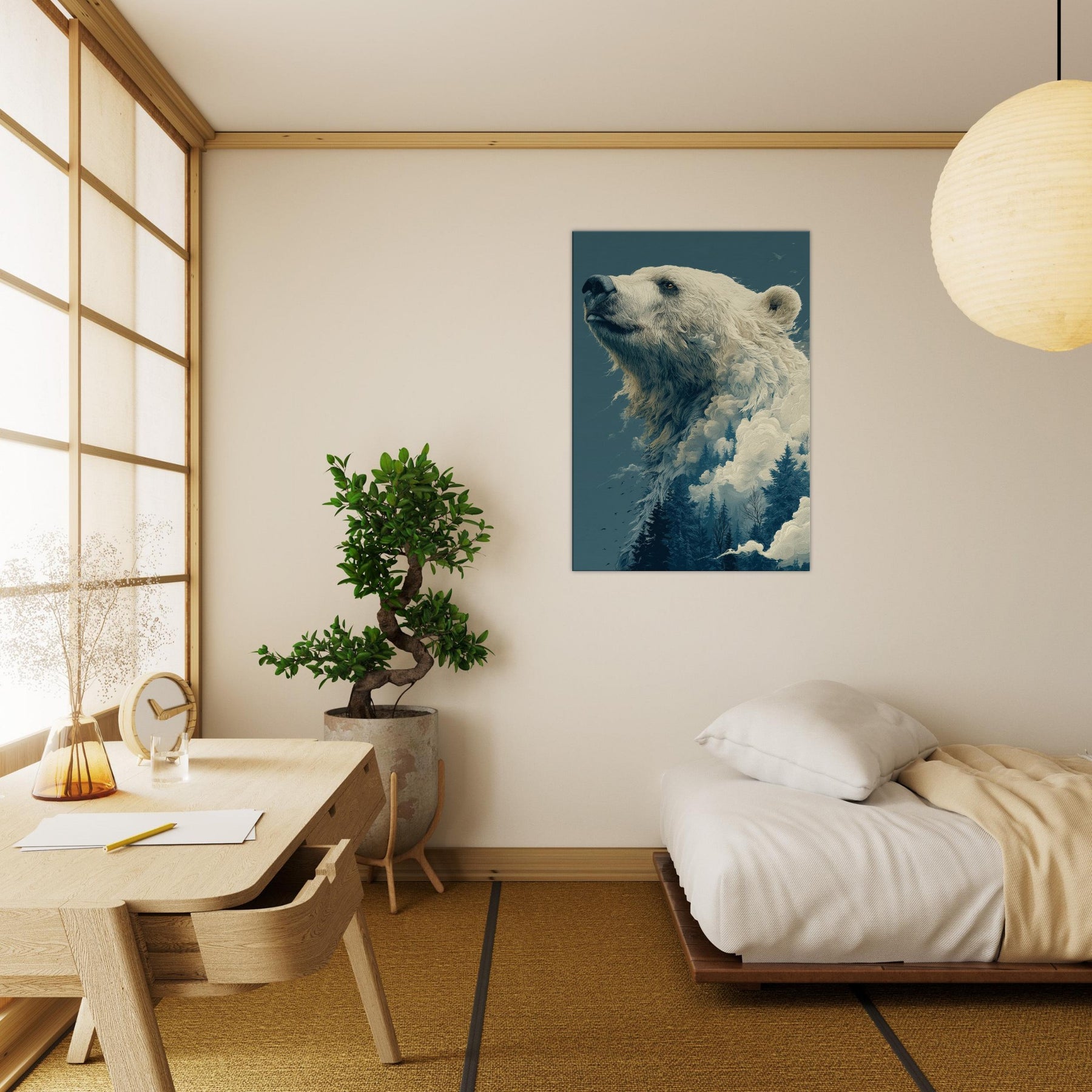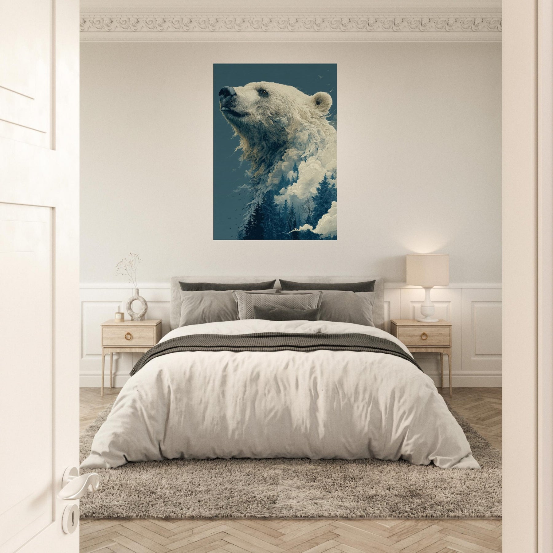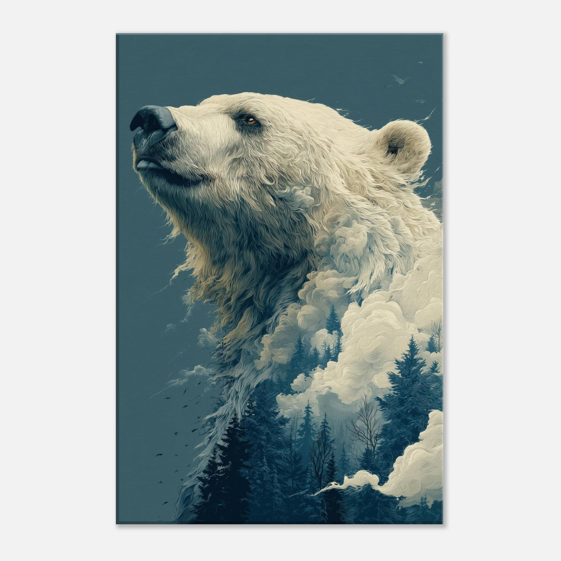 This surreal composition cradles the Bear in a liminal realm where ice, mist, and evergreen converge. The colossal bear's profile rises like a myth, its fur dissolving into billowing clouds and frosted pines. The atmosphere is hushed, contemplative, a room fill of breath and quiet wonder that makes the everyday feel epic. Perfect for a living room or study, it invites slow gaze, soft light, and a sense of scale that comforts and awakens.