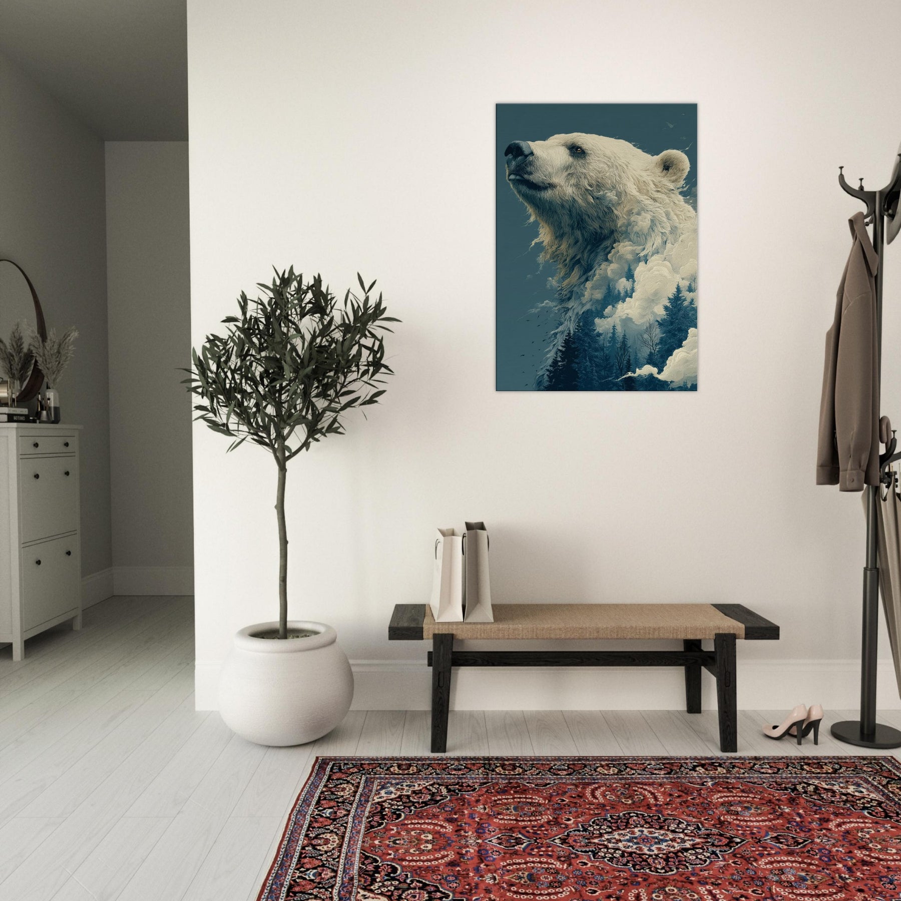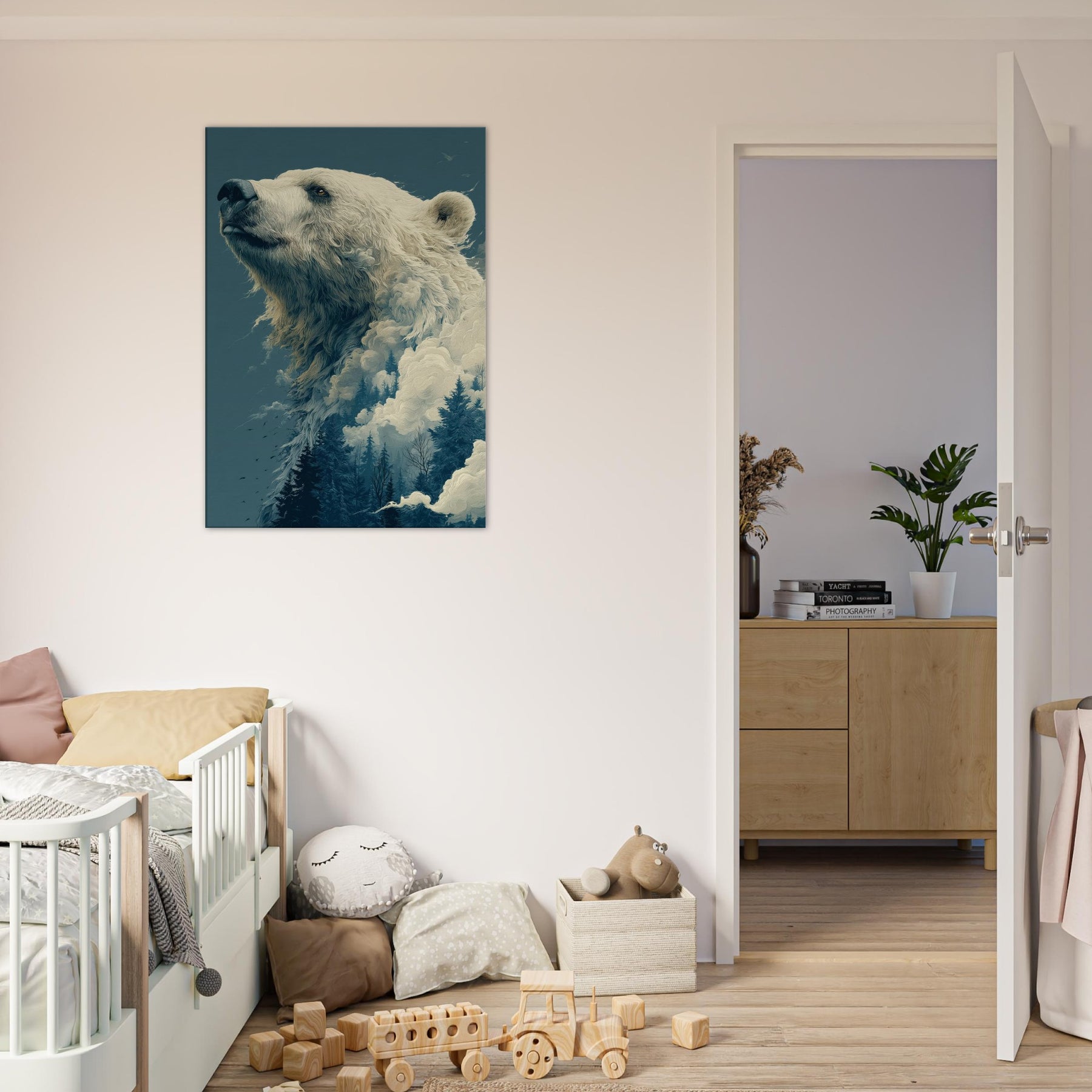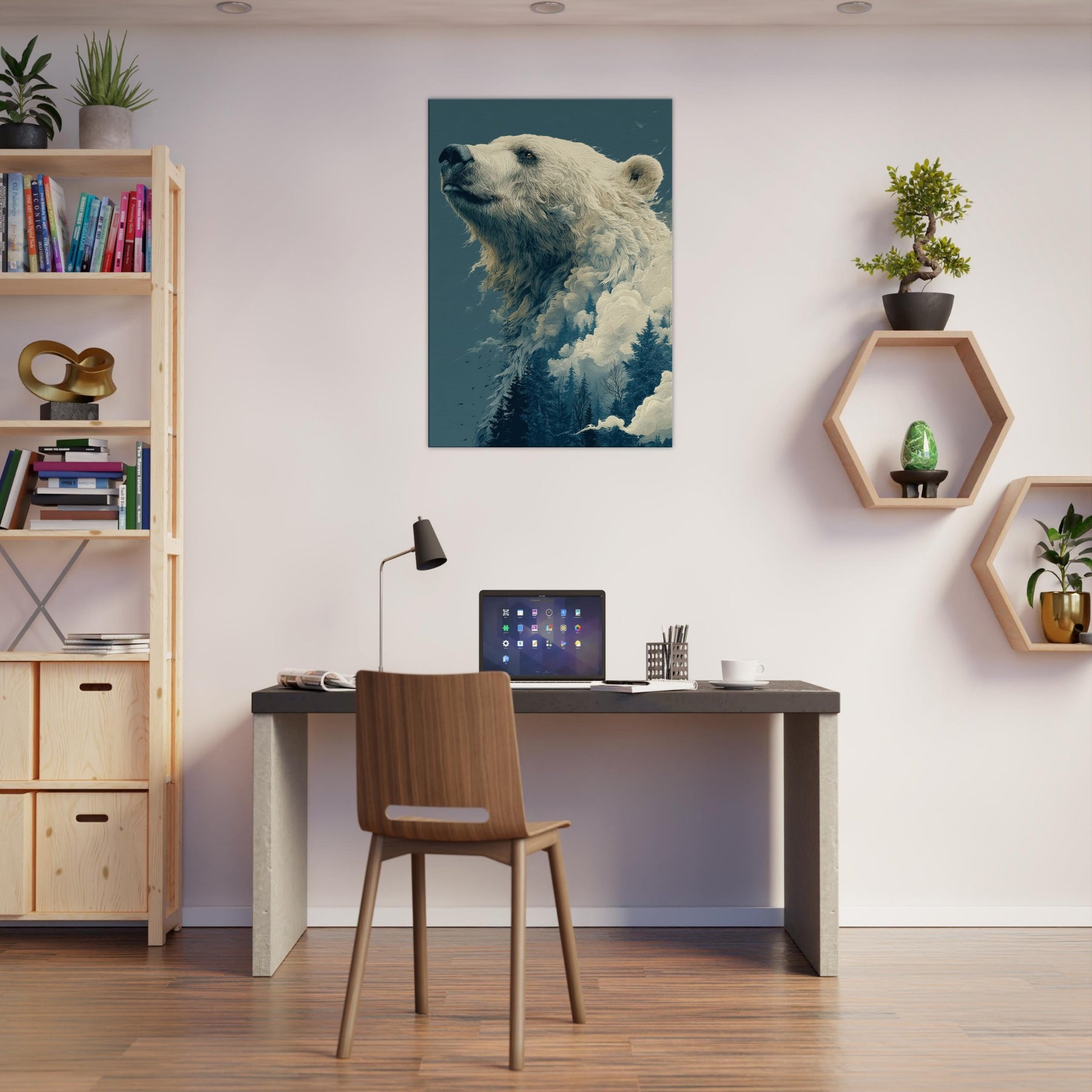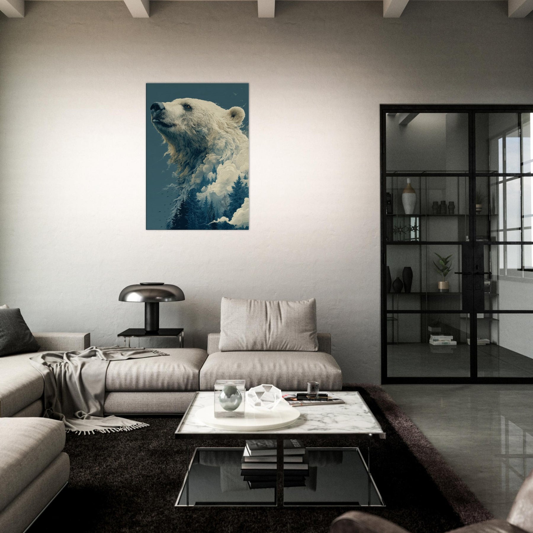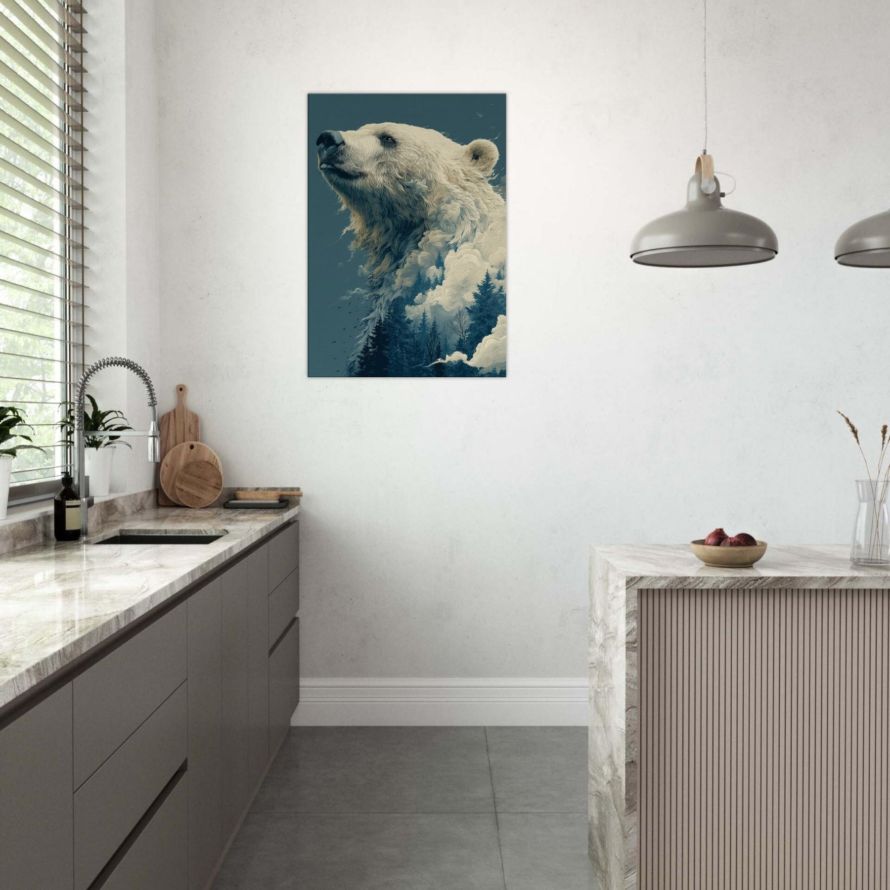 This surreal composition cradles the Bear in a liminal realm where ice, mist, and evergreen converge. The colossal bear's profile rises like a myth, its fur dissolving into billowing clouds and frosted pines. The atmosphere is hushed, contemplative, a room fill of breath and quiet wonder that makes the everyday feel epic. Perfect for a living room or study, it invites slow gaze, soft light, and a sense of scale that comforts and awakens.