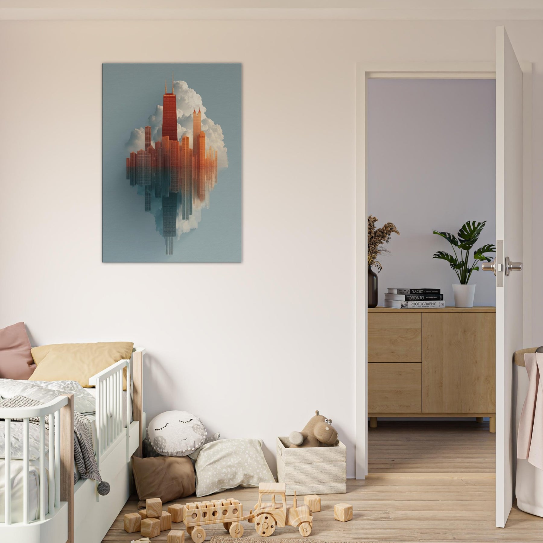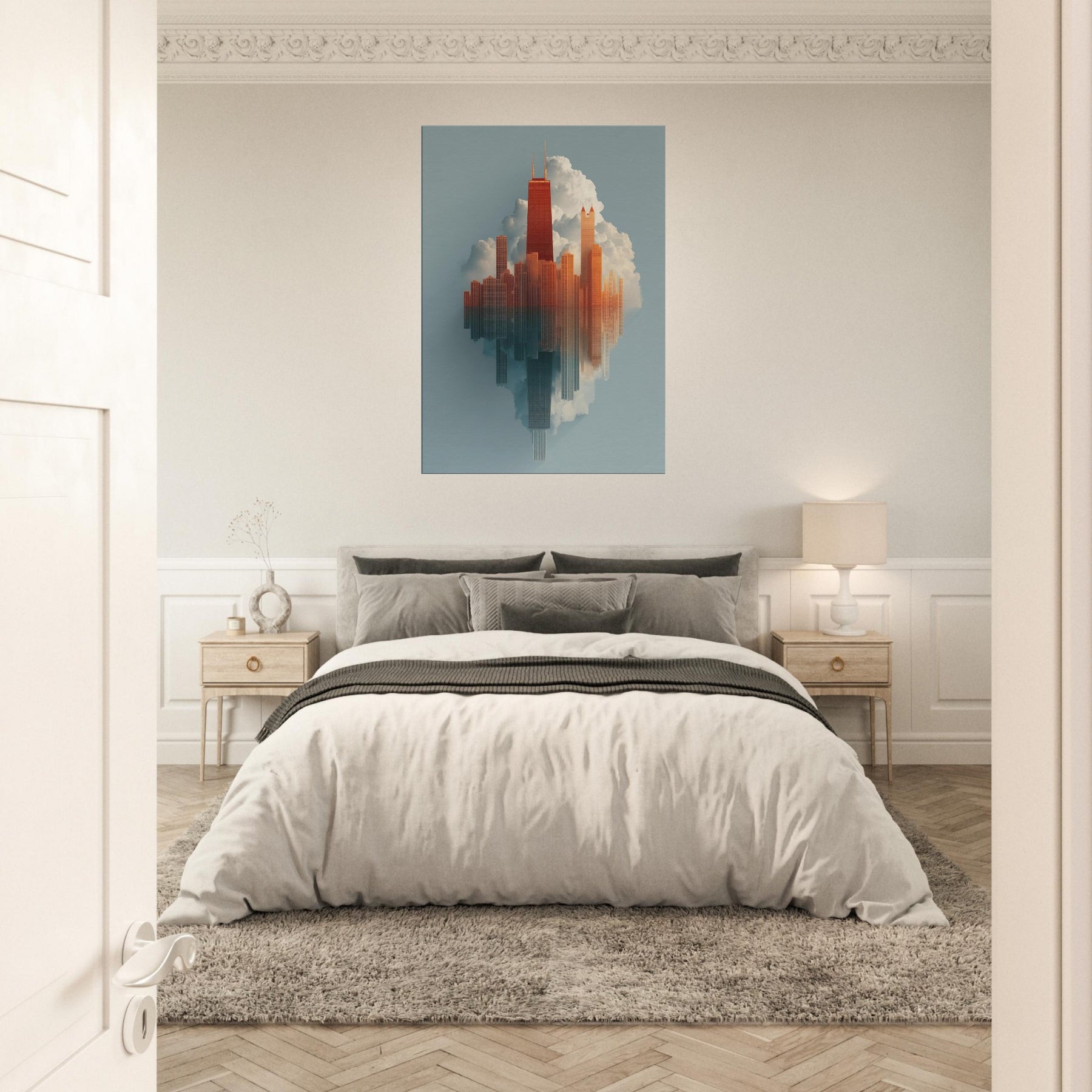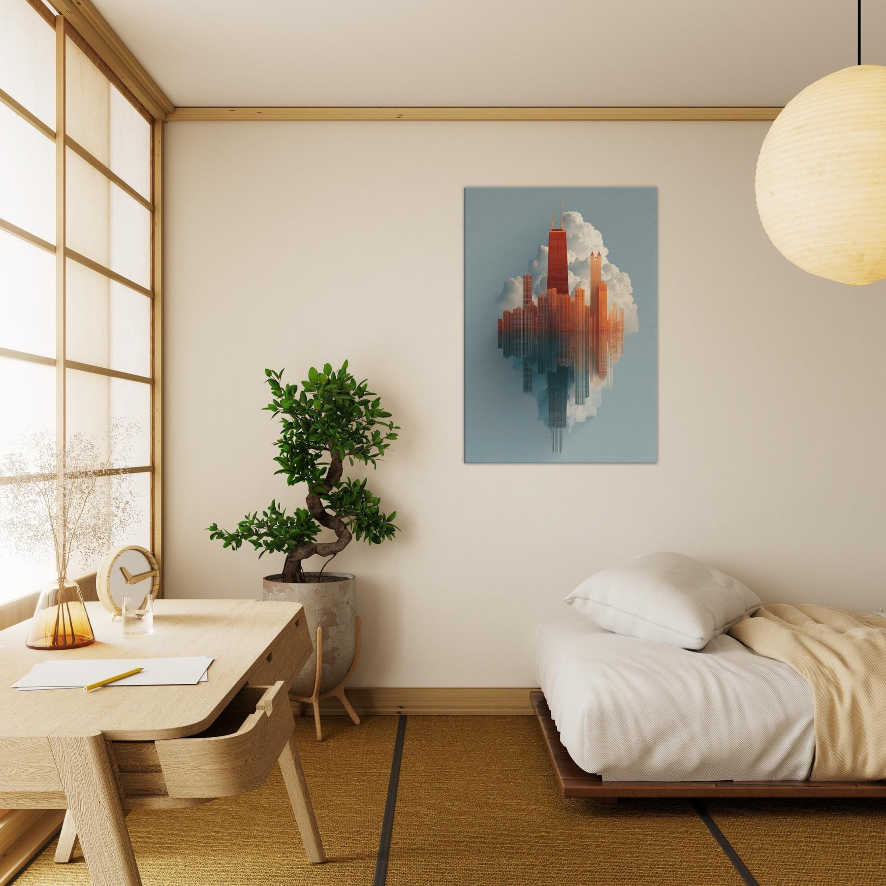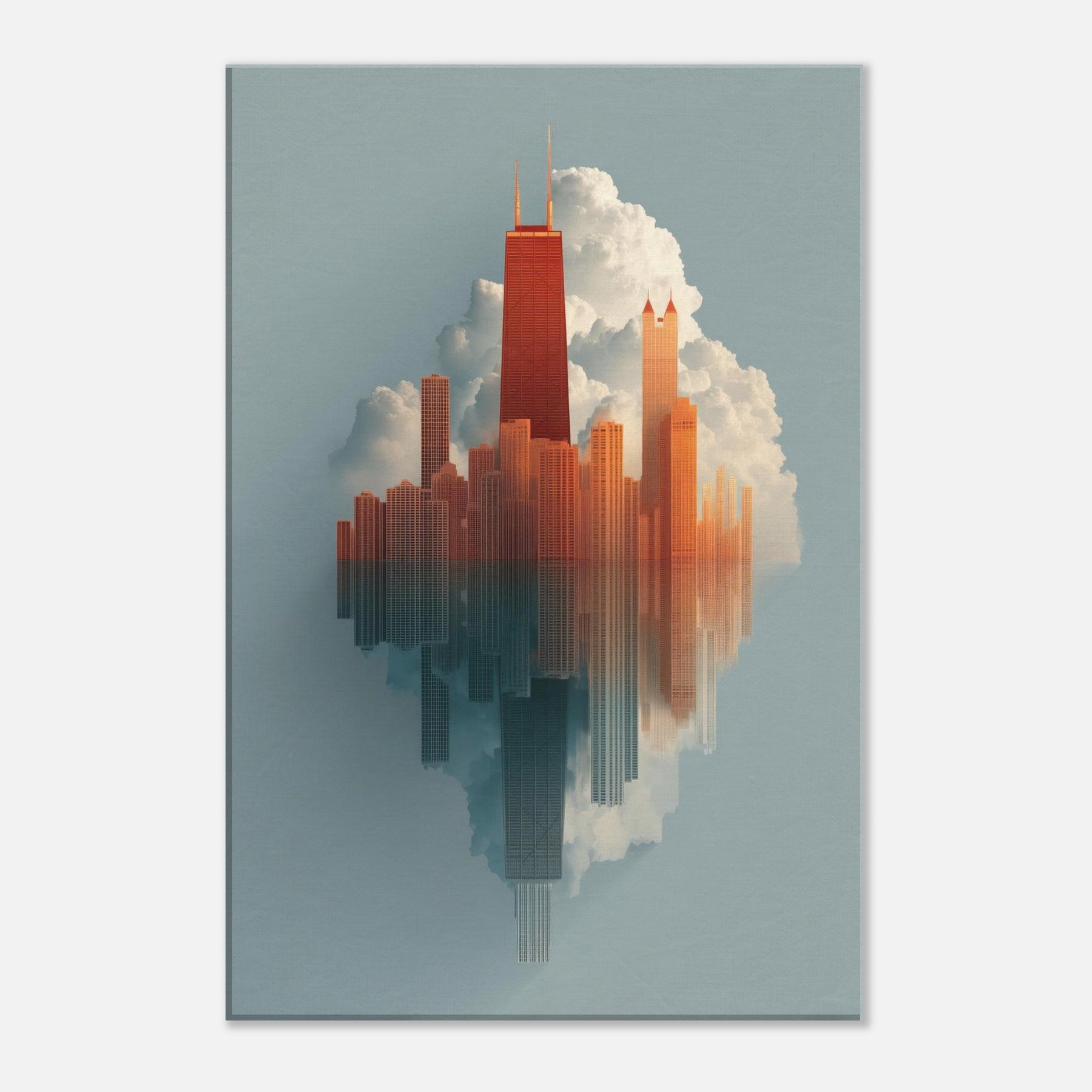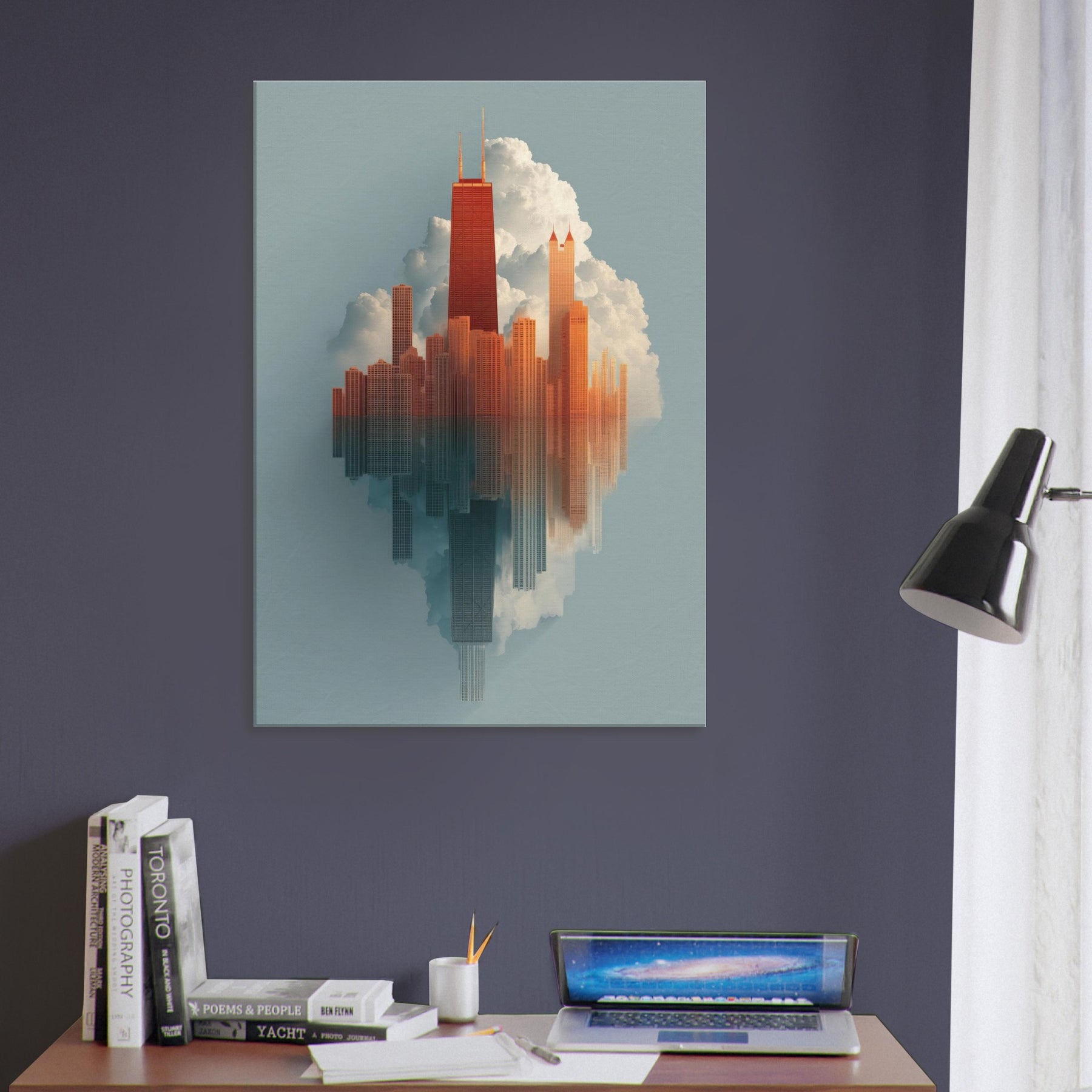 Let Chicago rise from a cloud scape where skyscrapers dissolve into soft light and memory. This surreal composition invites the eye to drift through citrus hued towers and glassy reflections, then sink into a cool, blue dusk below. The piece balances urban energy with dreamy quiet, turning the city into a suspended sculpture that enriches any living space with atmosphere bold enough for a focal wall, intimate enough for a contemplative corner. A conversation between metropolis and dream, crafted to linger.