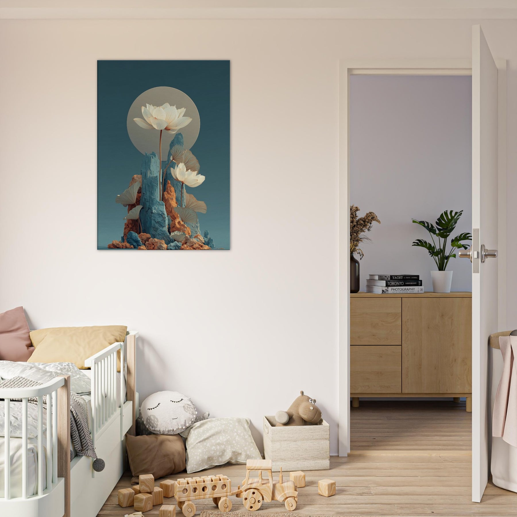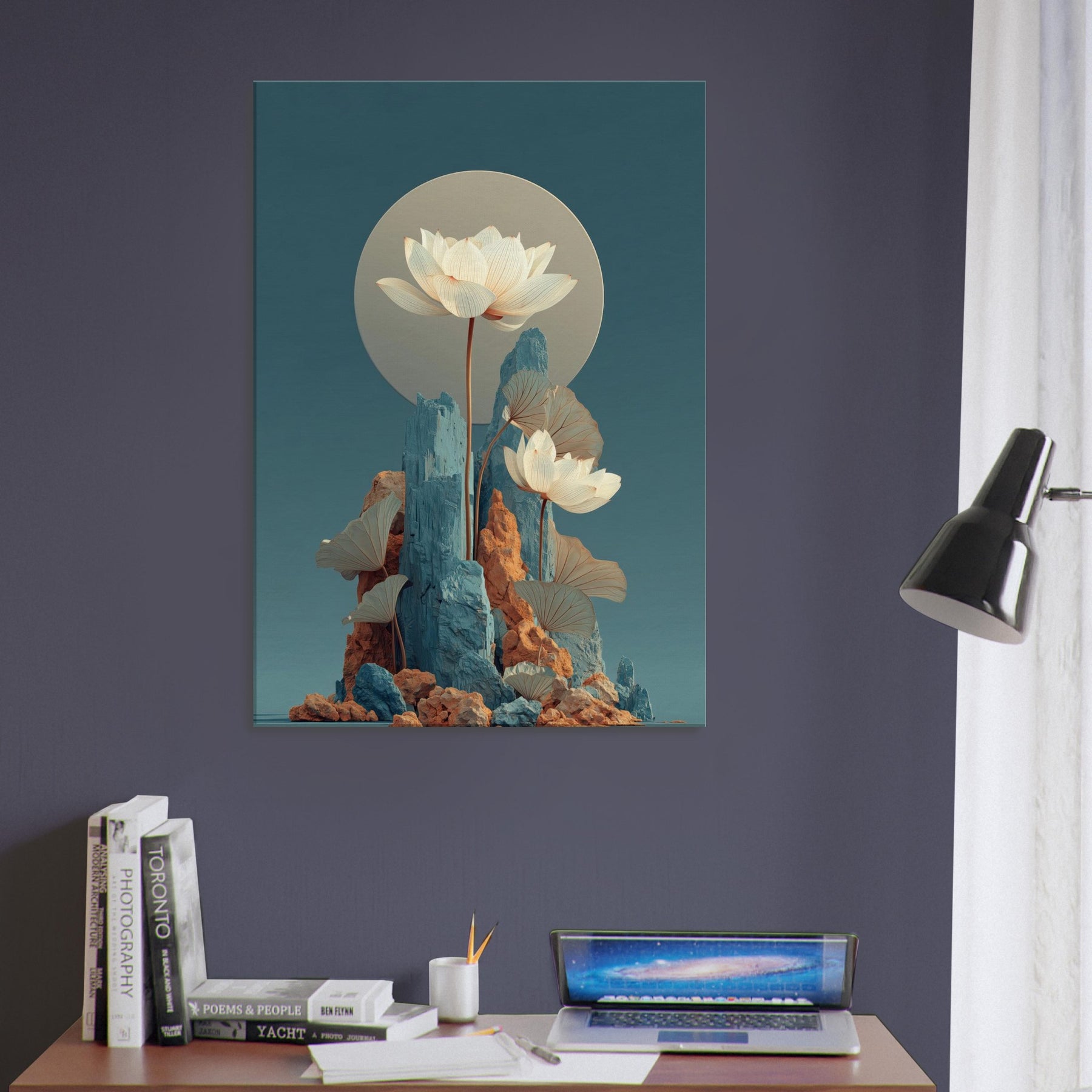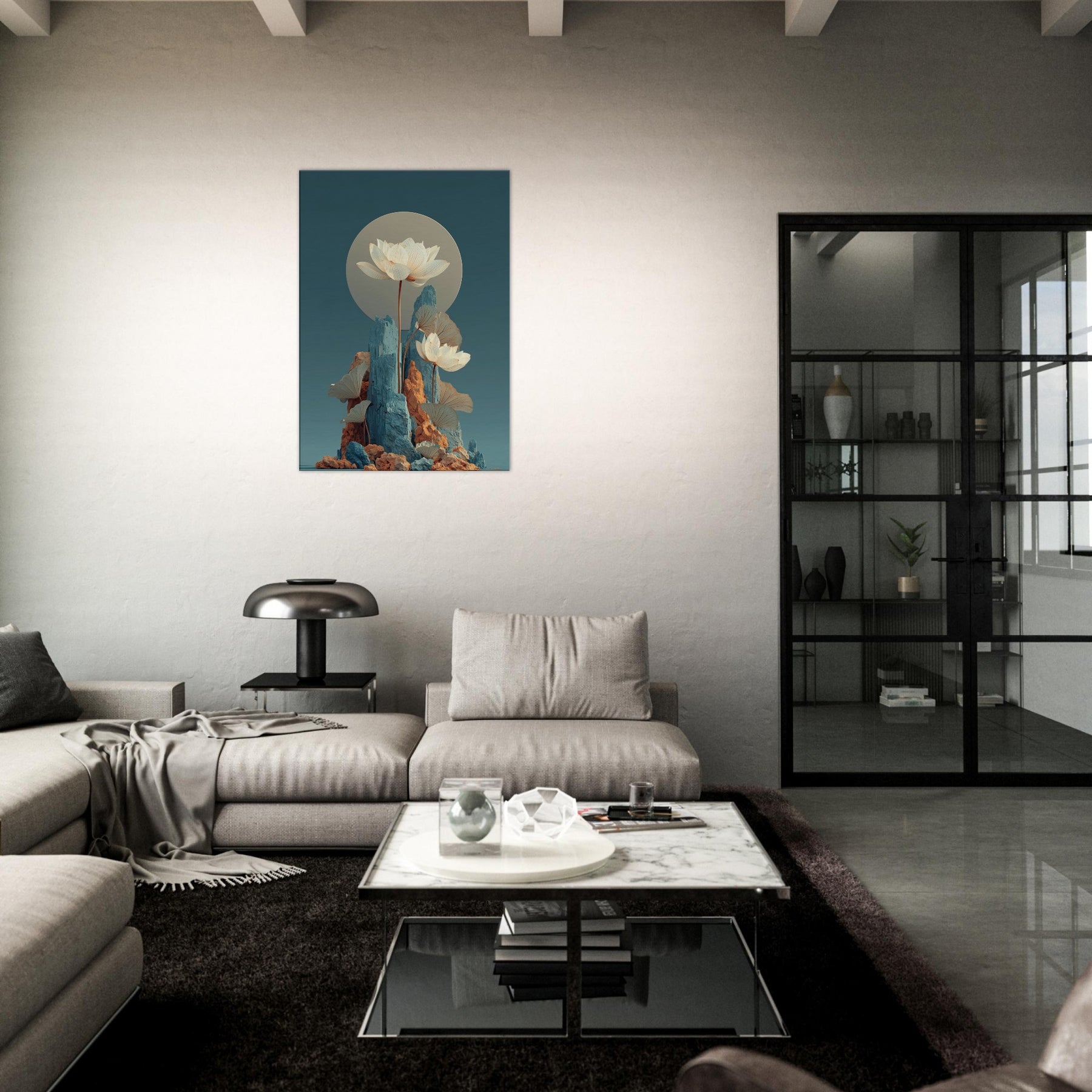 Against a tranquil horizon, the Lotus rises as the Primary Subject, unfurling its pale petals amid sculpted cliffs bathed in lunar light. Surreal rock spires loom in blue and coral, while a soft halo circles behind, casting a dreamlike glow over the scene. The Lotus exudes quiet grace, inviting stillness and reflection. This nature driven image brings a timeless, otherworldly atmosphere to a living room, enriching walls with fragrance of calm, balance, and imaginative depth.